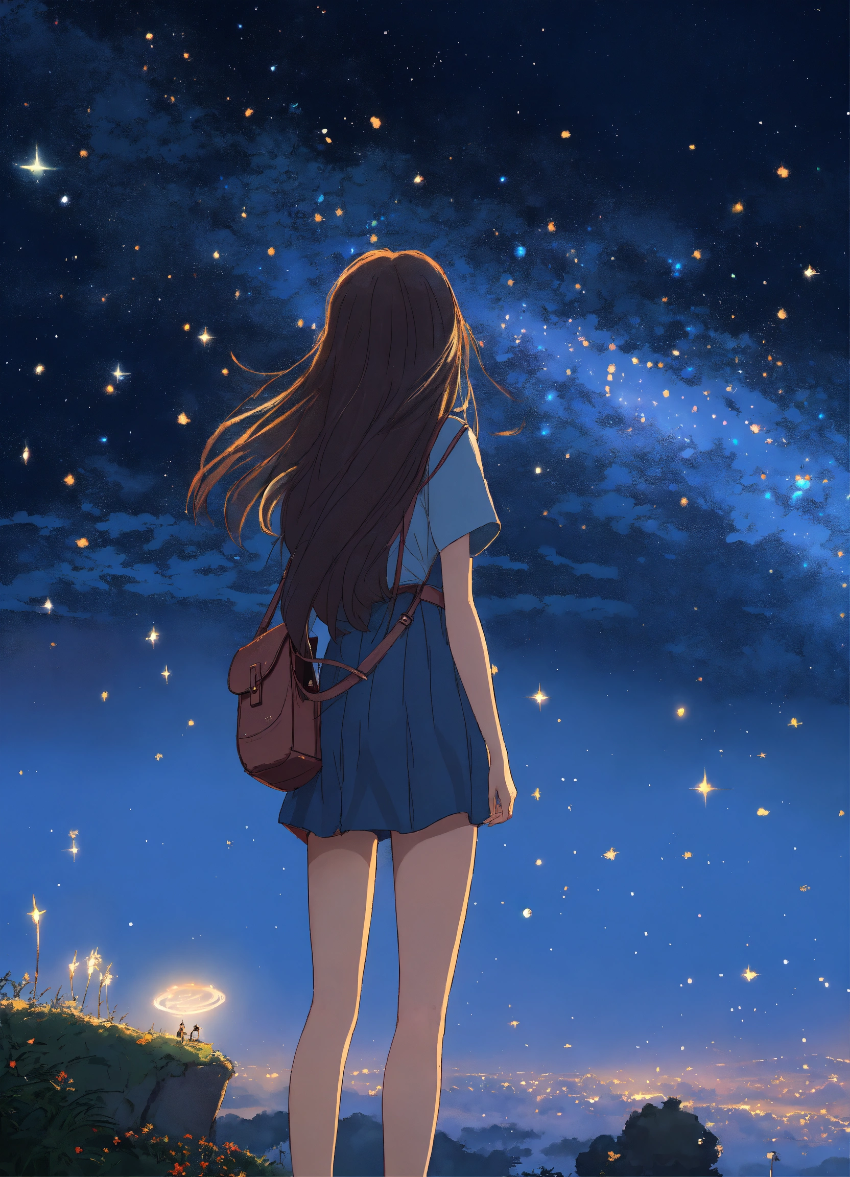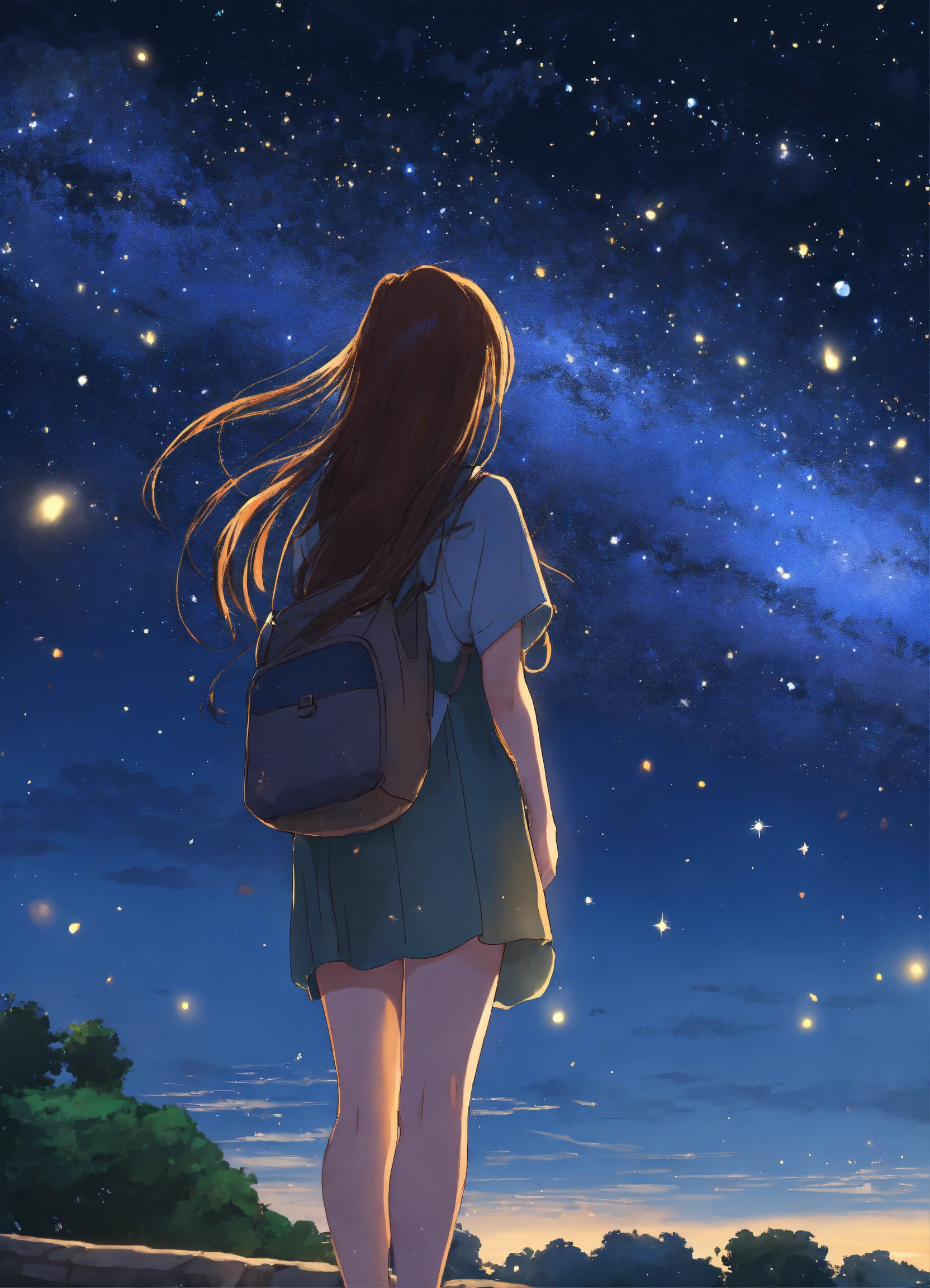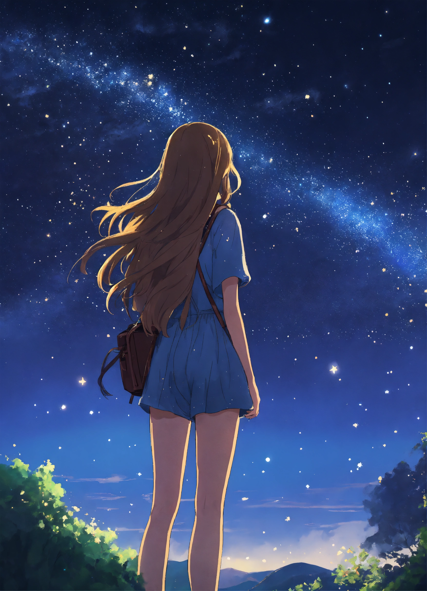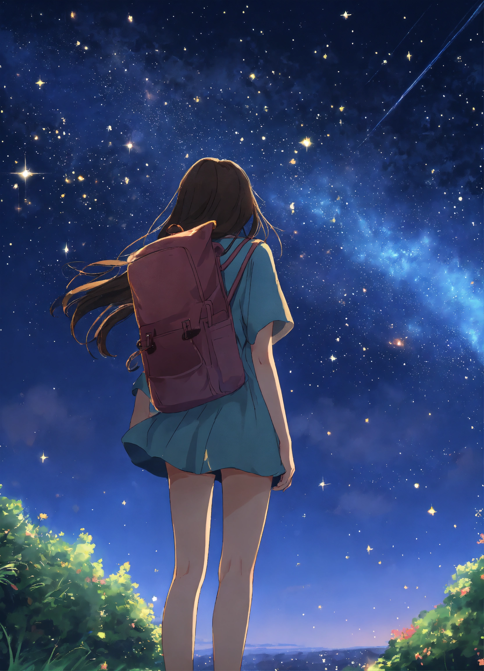 1 female, 20 years old, long hair, back view, looking at the night sky, comet, starry sky, studio ghibli style illustration, wide angle