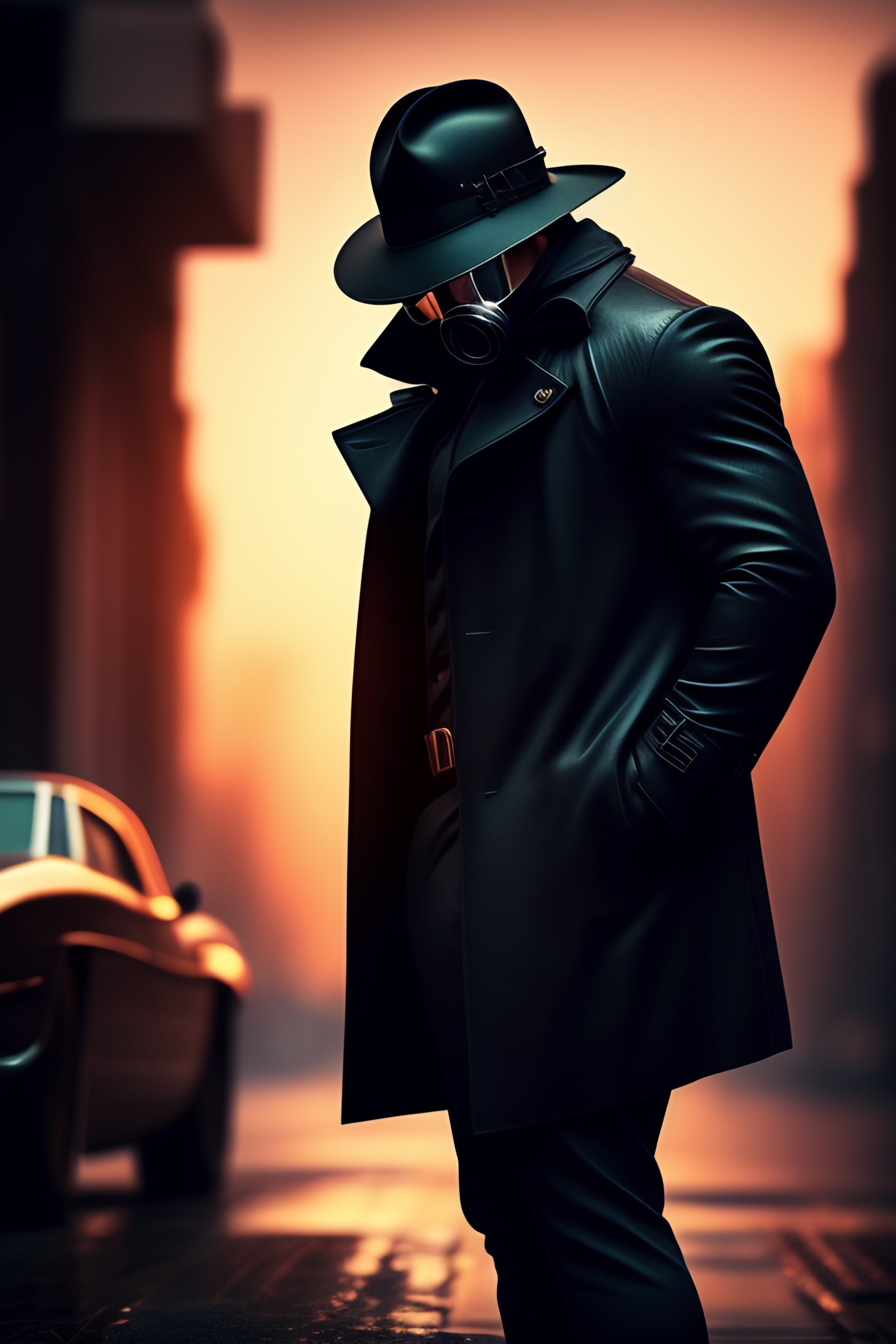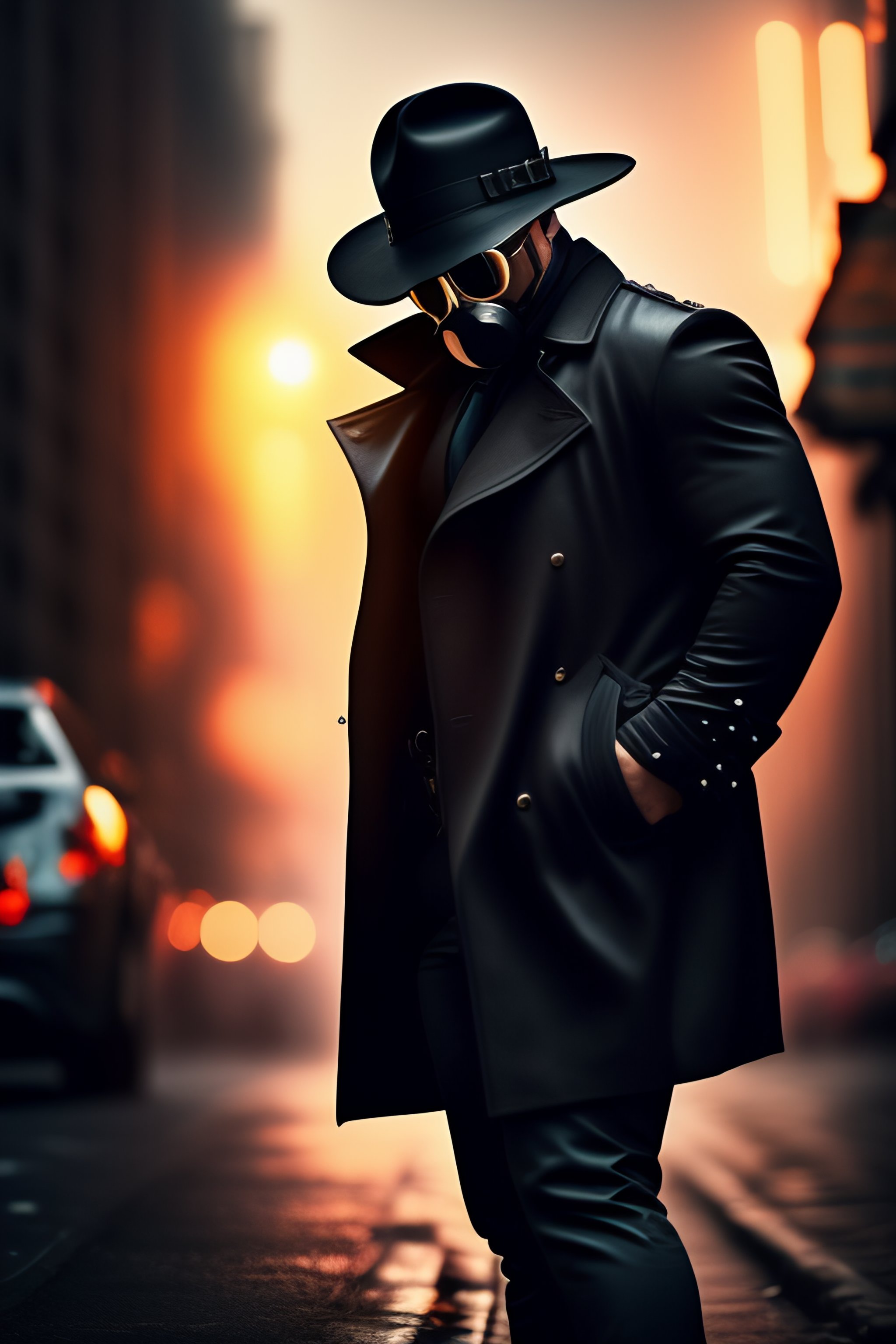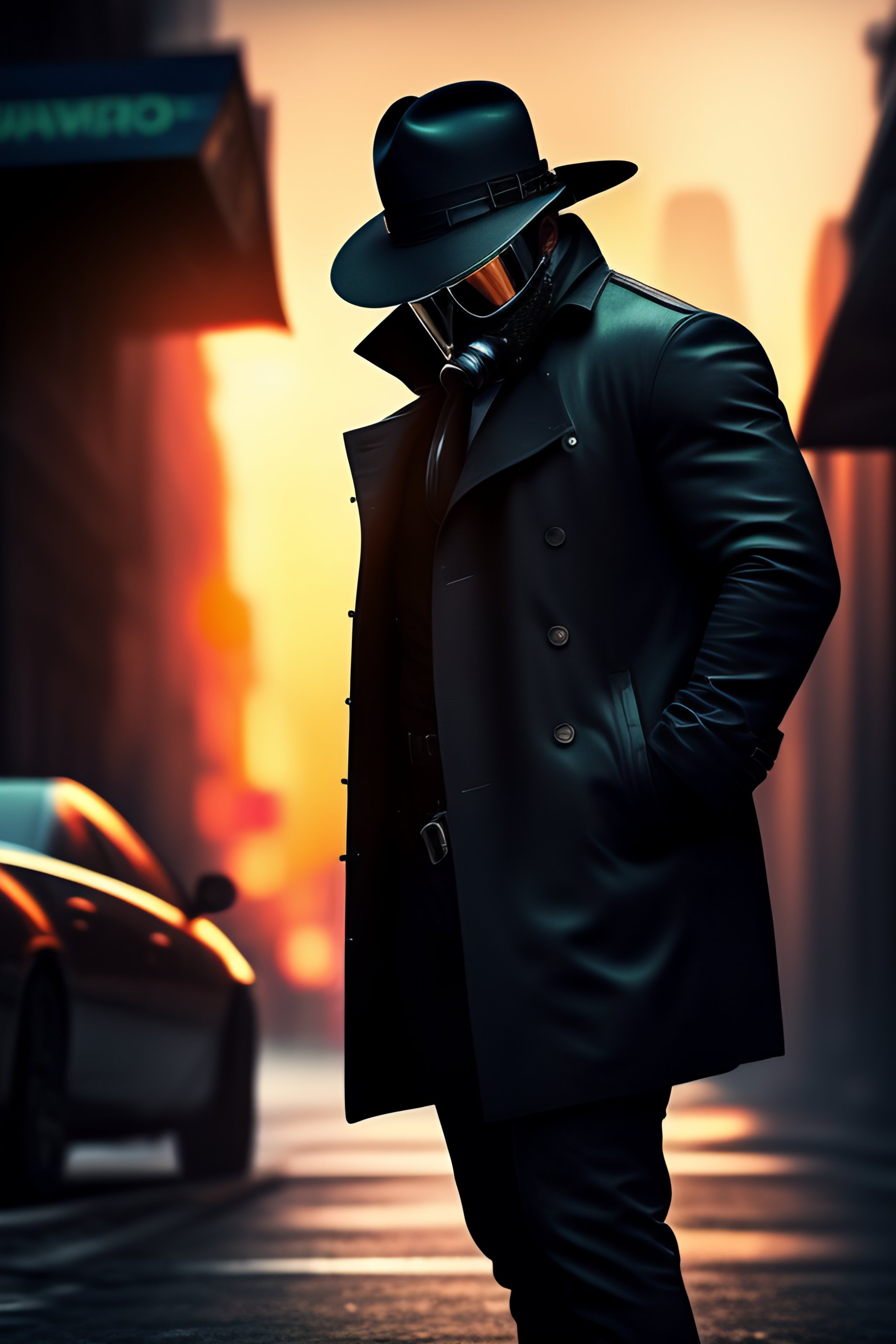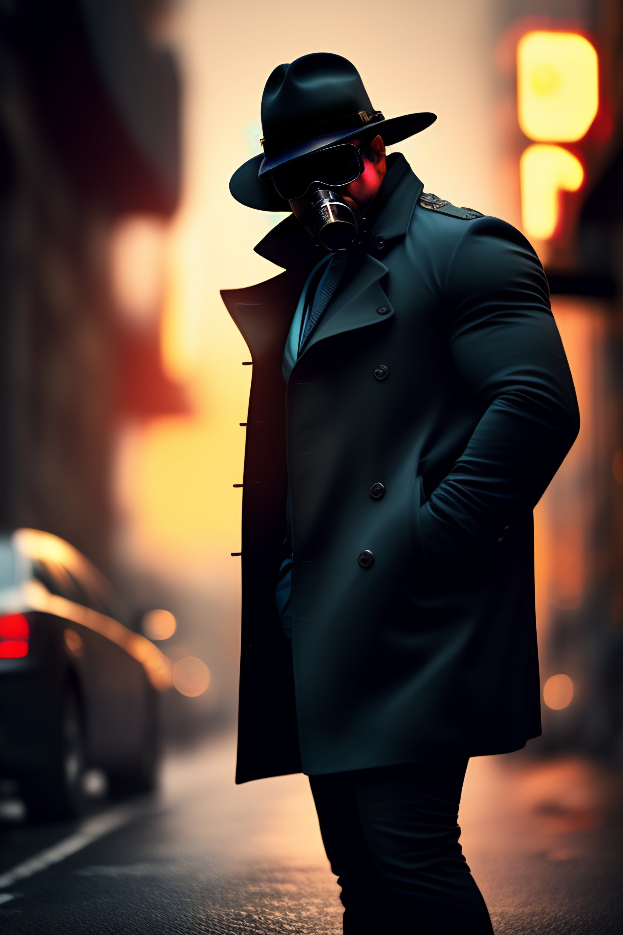 Detective, fedora hat, black trenchcoat, gasmask, sunglasses, city, technology, crime, seedy underbelly, cases, mysteries, hazardous situations, tough, mysterious, noir, intelligent, cunning, formidable, enigmatic, cyberpunk, walking