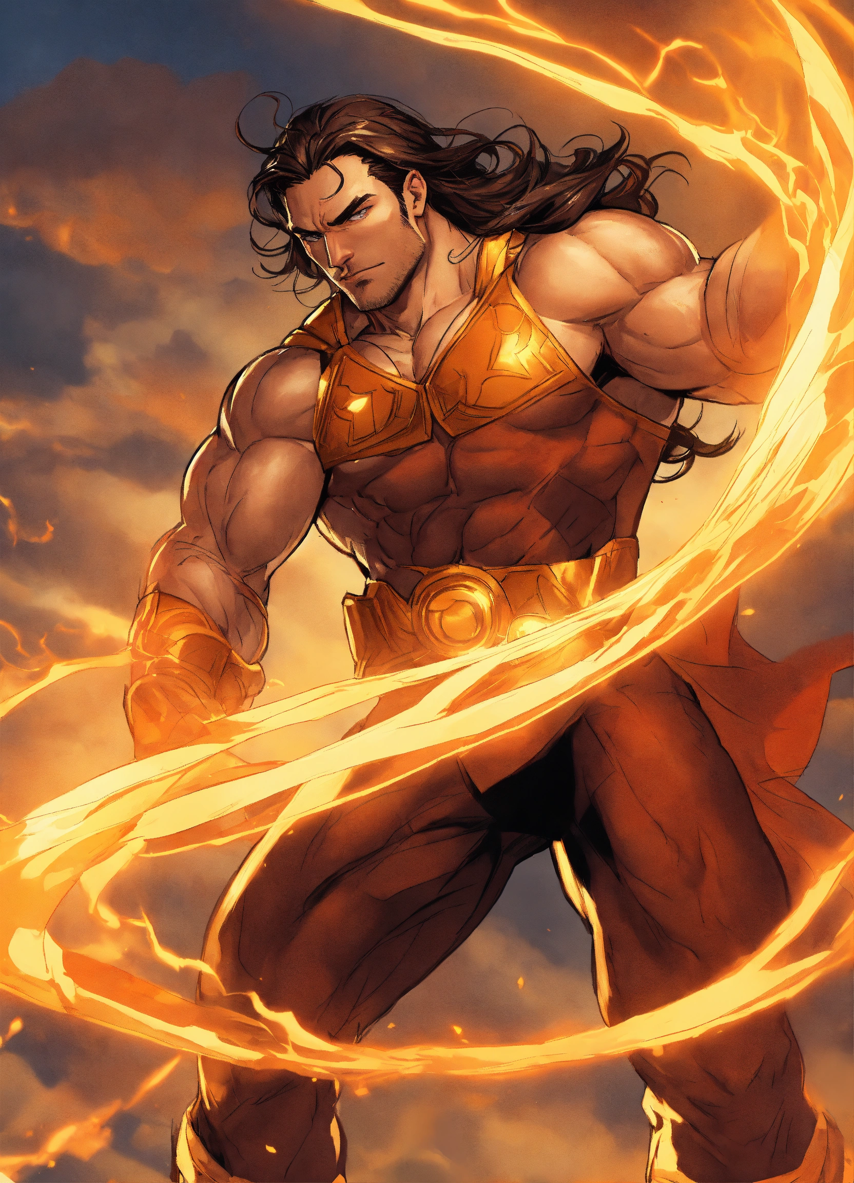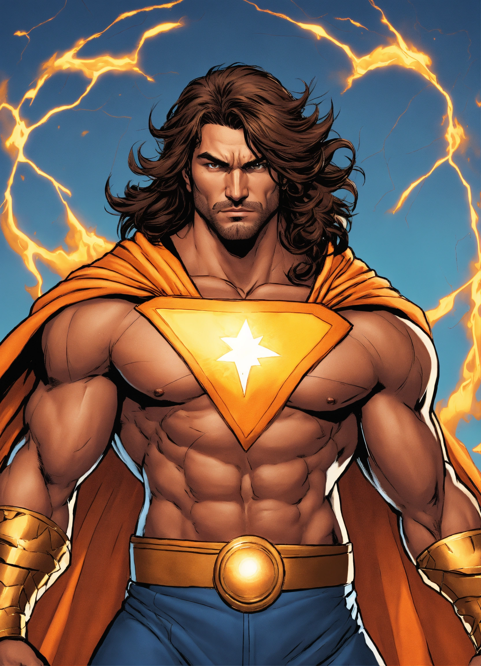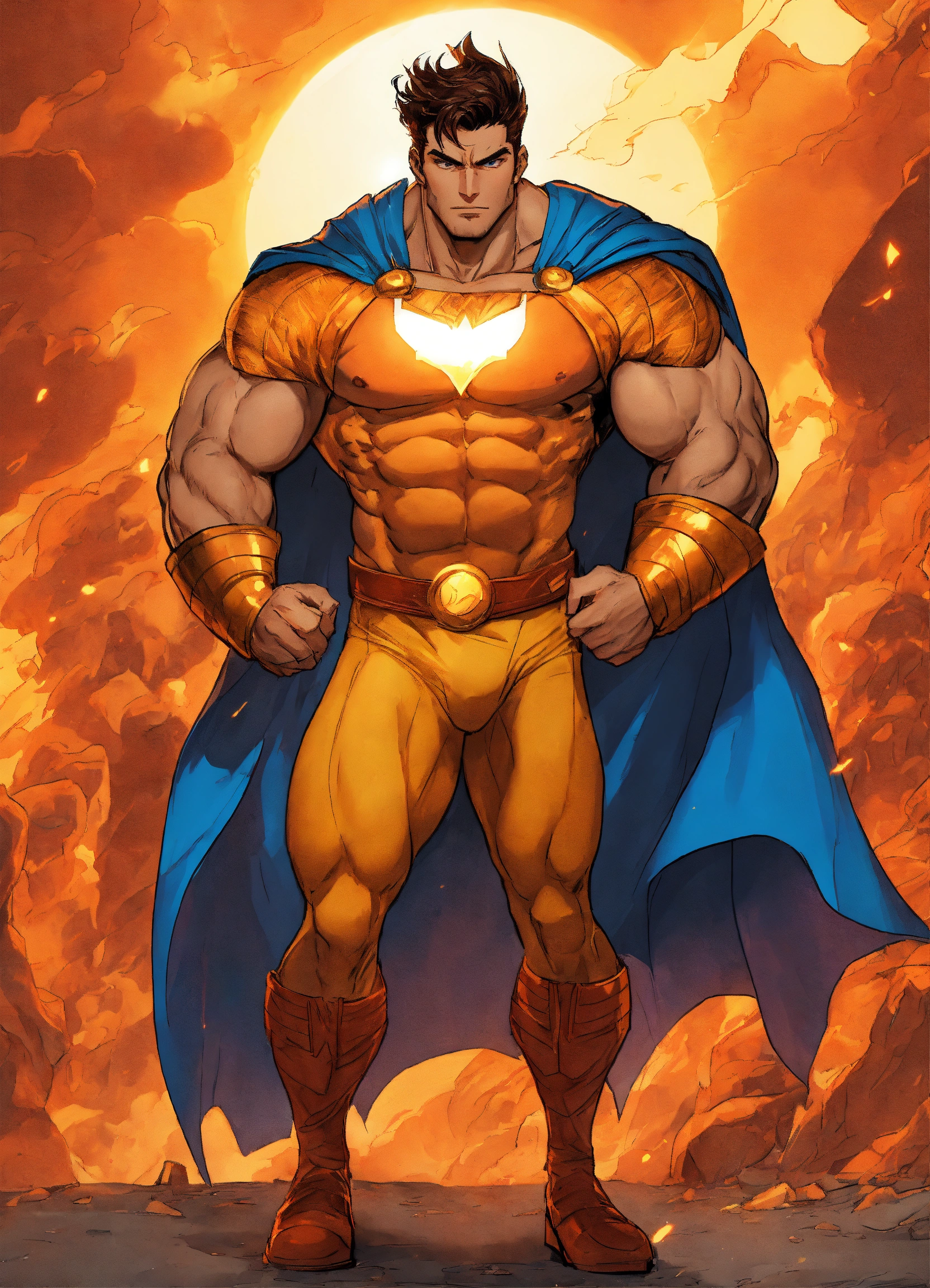 Generate an electrifying and detailed character description in the style of a comic book for a powerful male superhero of hispanic descent. this character embodies an extraordinary physical presence with huge muscles that convey unparalleled strength. he dons a mythic outfit reminiscent of hercules, complete with a long flowing blue cape that billows dramatically in the wind. his costume features a striking logo of the sun emblazoned on his chest, symbolizing his radiant power. his medium-length brown hair frames his chiseled features, and his eyes burn with a brilliant shade of orange, radiating intensity. the character exudes an air of invincibility and heroism, a beacon of hope for all. capture the essence of his immense power and courage while staying true to the vibrant and dynamic style of a comic book