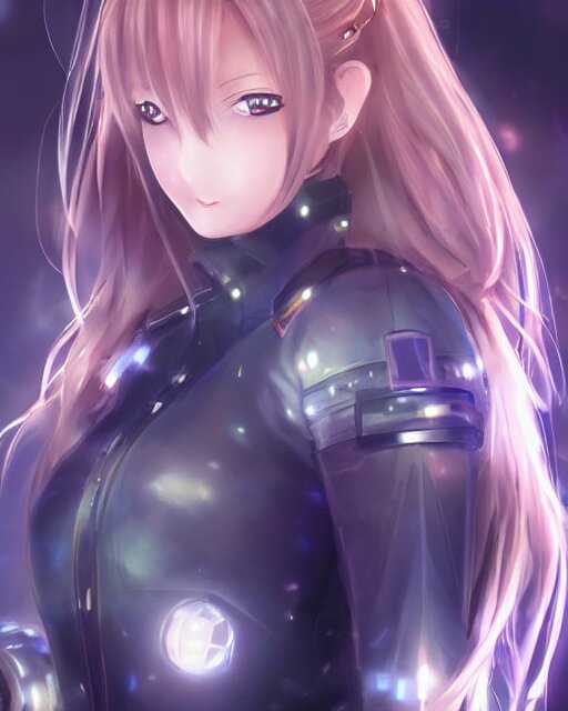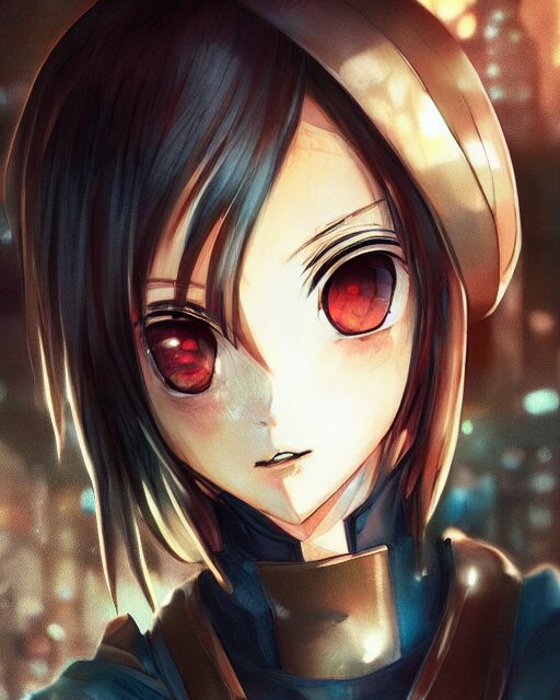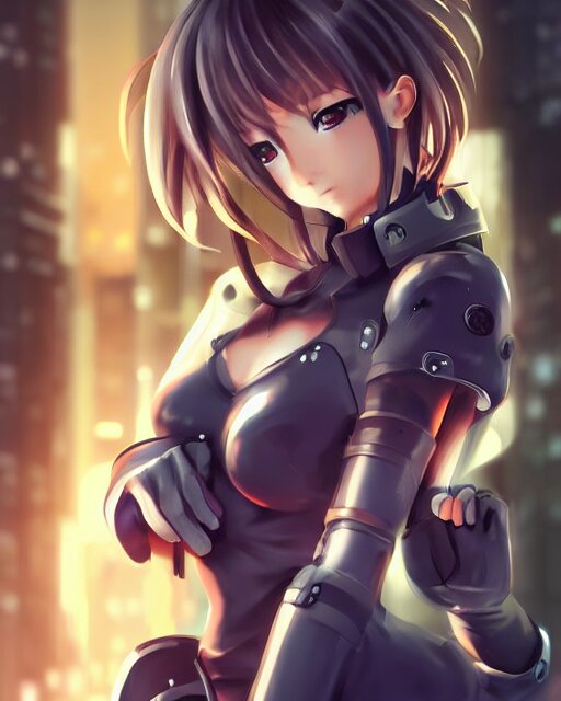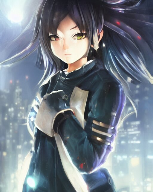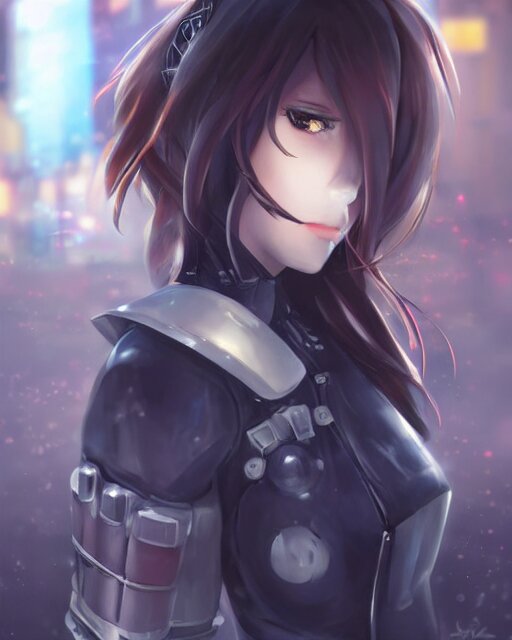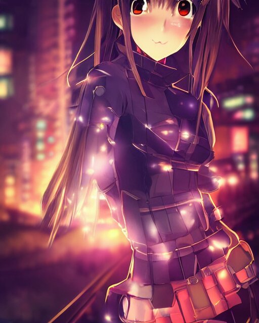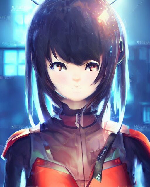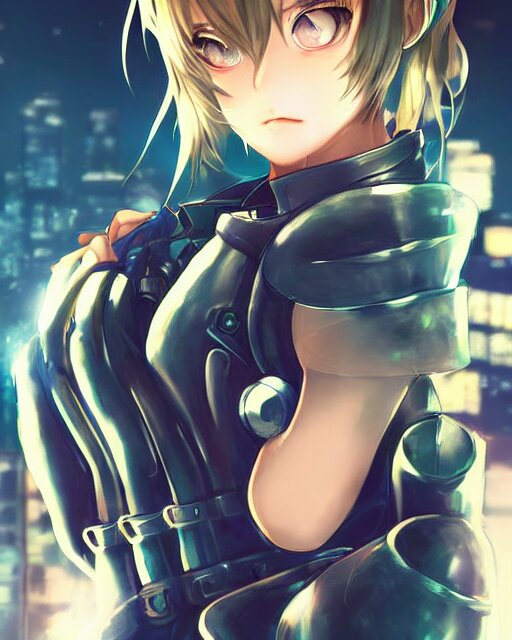 Portrait of anime girl in mechanic armor in night tokyo by makoto sinkai