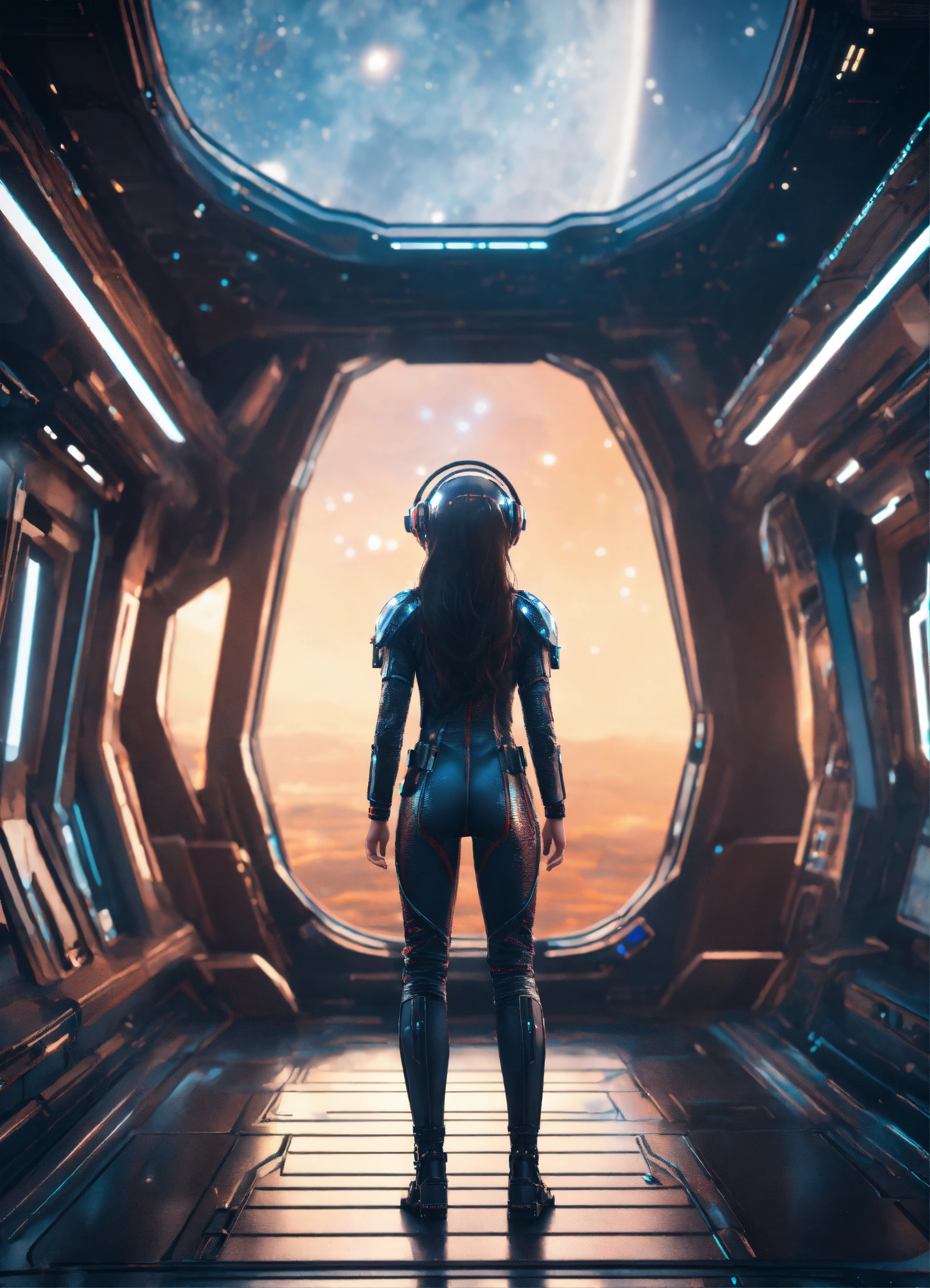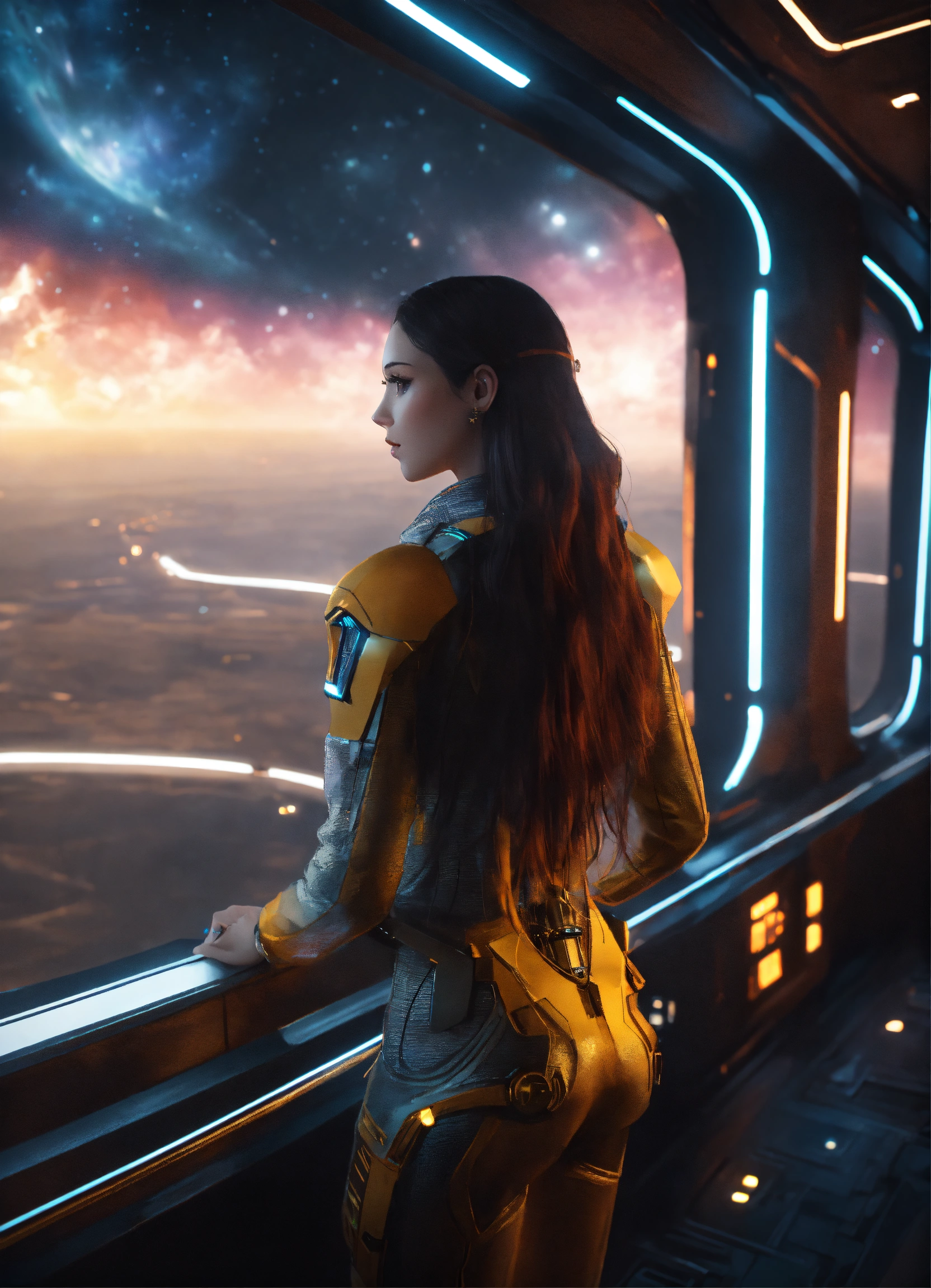 Full body of a beautiful long hair girl standing wearing detailed alien ear antennas with futuristic clothing, and looking out huge window at nebula on a star cruiser, futuristic, sci-fi, realistic, unreal engine, 8k