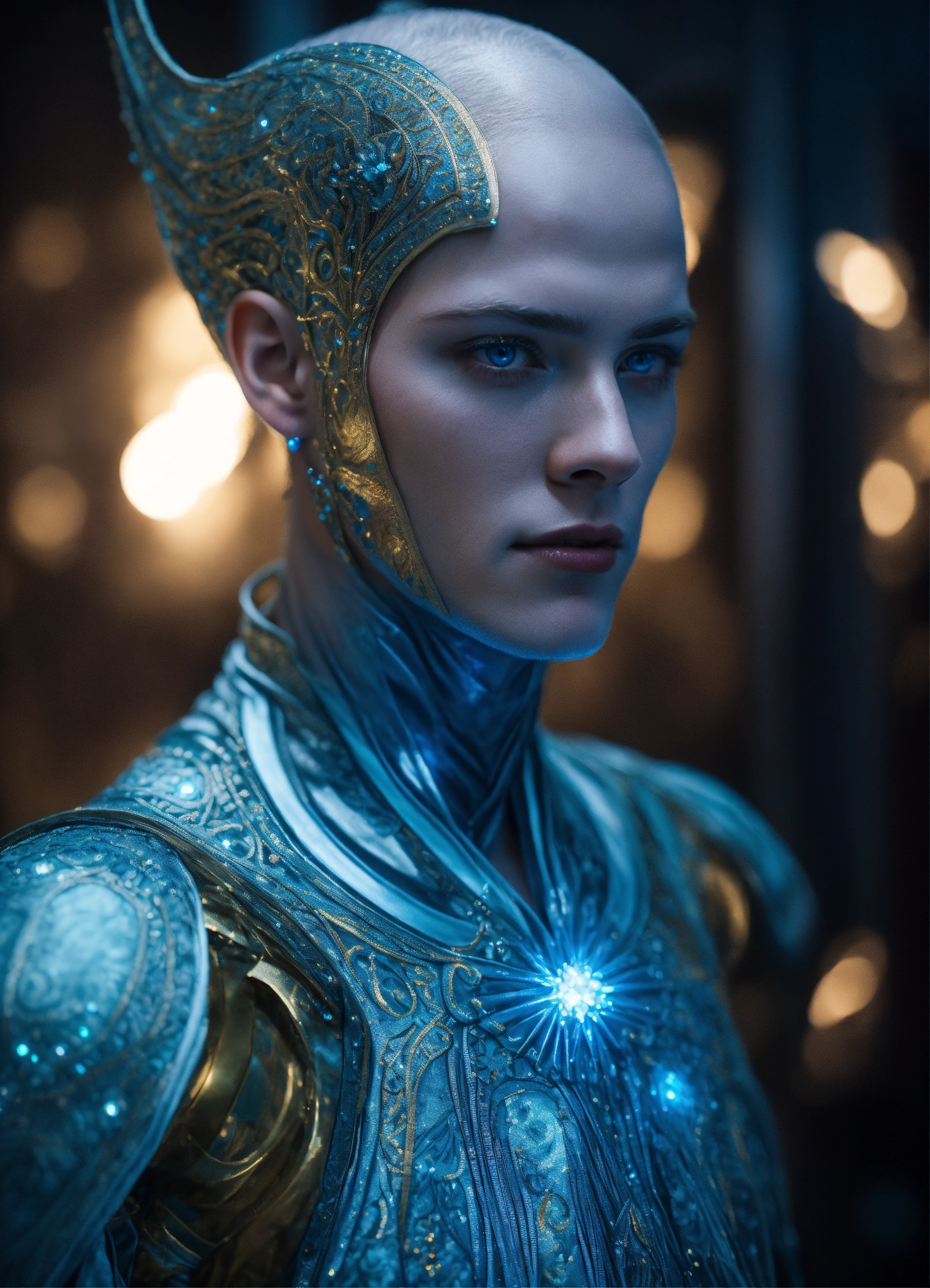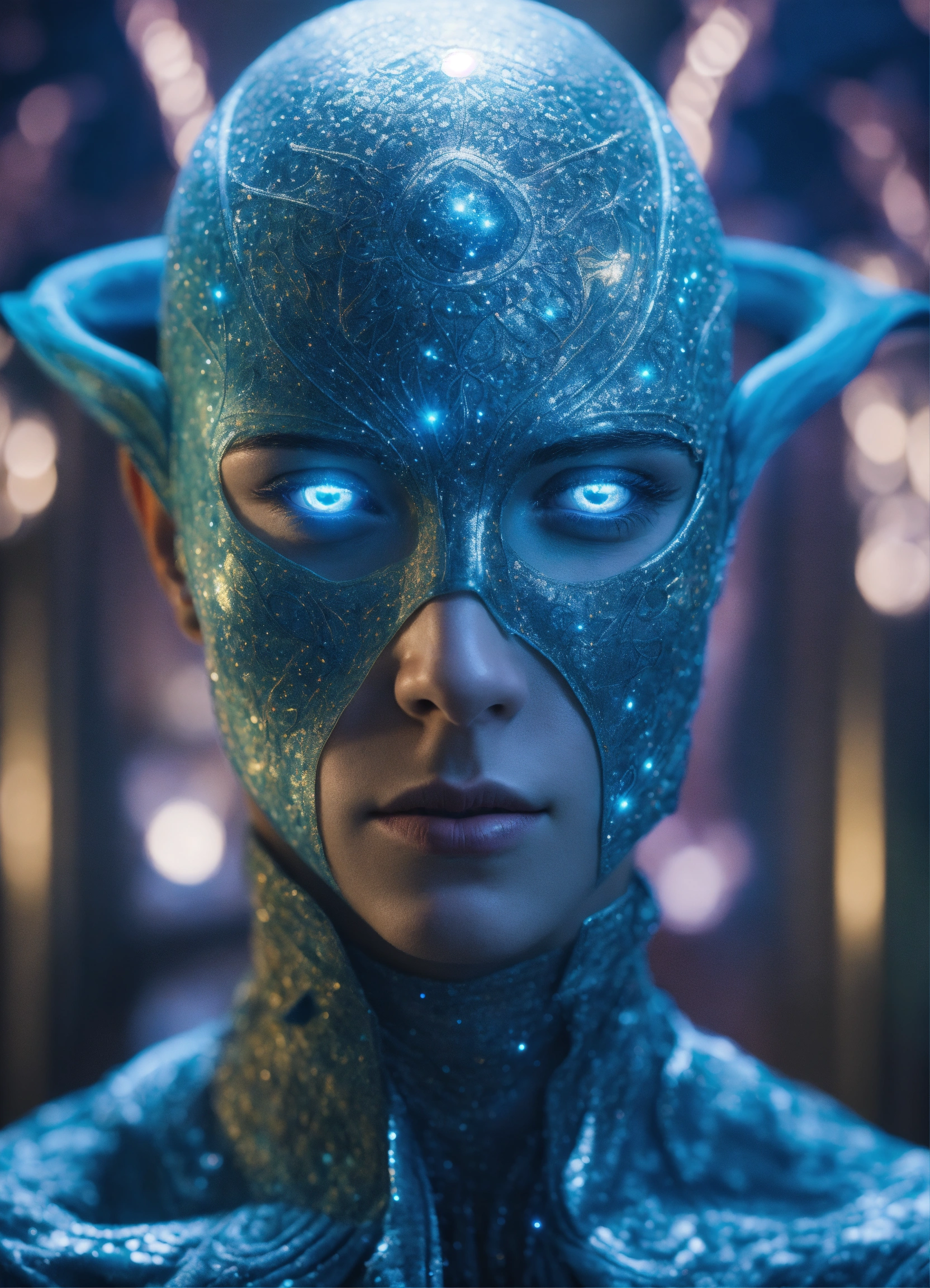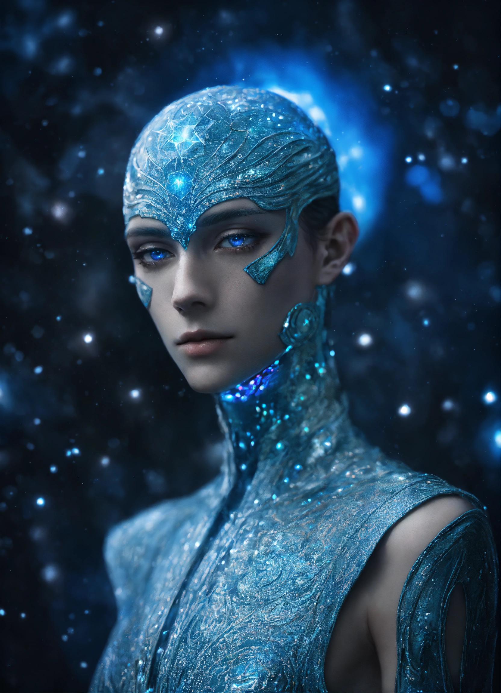 Photo-realistic portrait of a pleiadian alien, male man, characterized by its tall, slender build and striking blue eyes that seem to glow. the skin is a luminescent shade of pale blue, and the facial features are finely chiseled, almost ethereal. the pleiadian is adorned in intricate, silver-colored garments that shimmer in the soft, ambient lighting. the background is a celestial landscape, perhaps the pleiades star cluster, adding to the otherworldly atmosphere. captured using a nikon d850, 85mm f/1.4 lens, with a focus on the intricate details and textures of the subject's skin and attire.