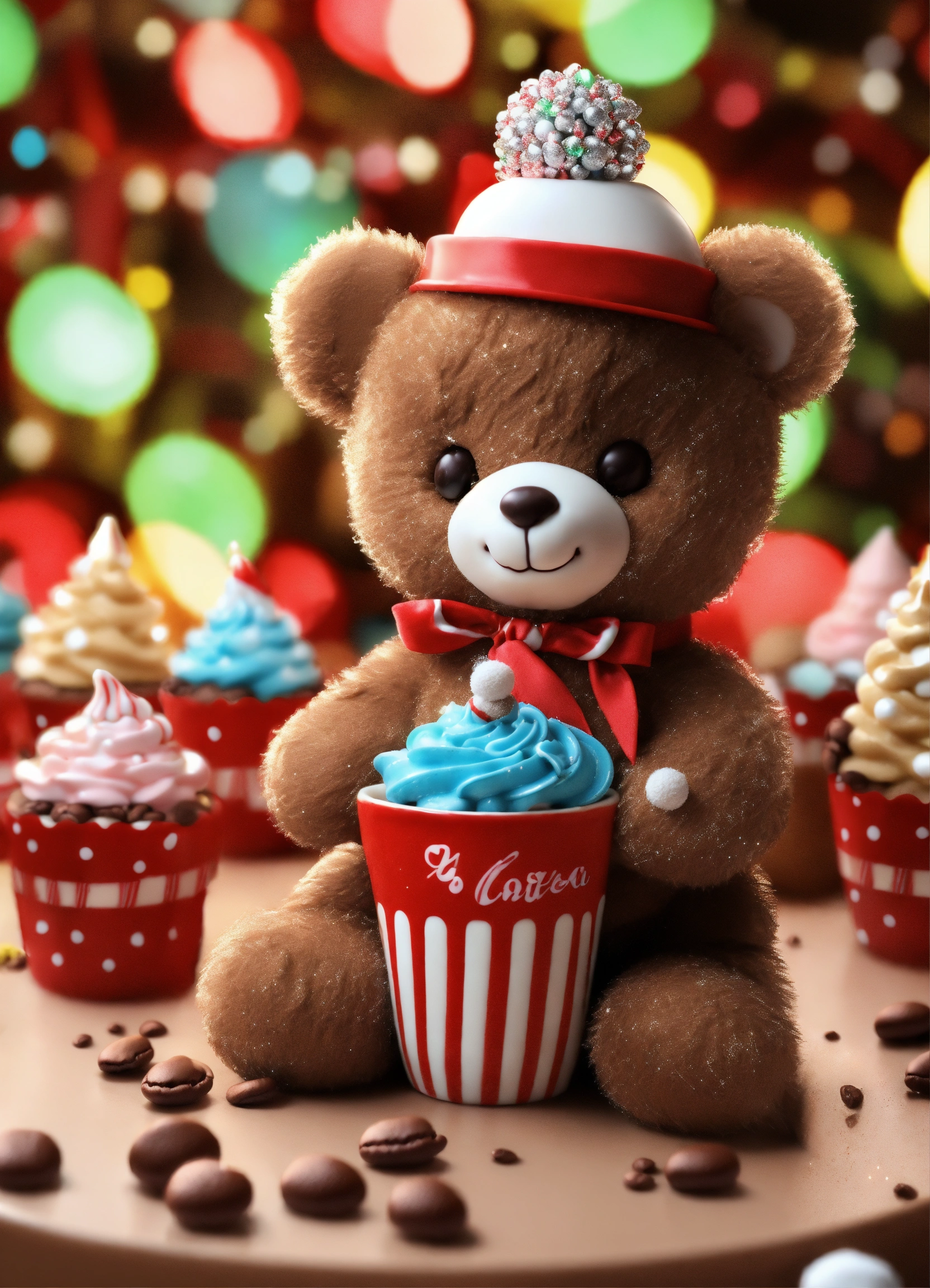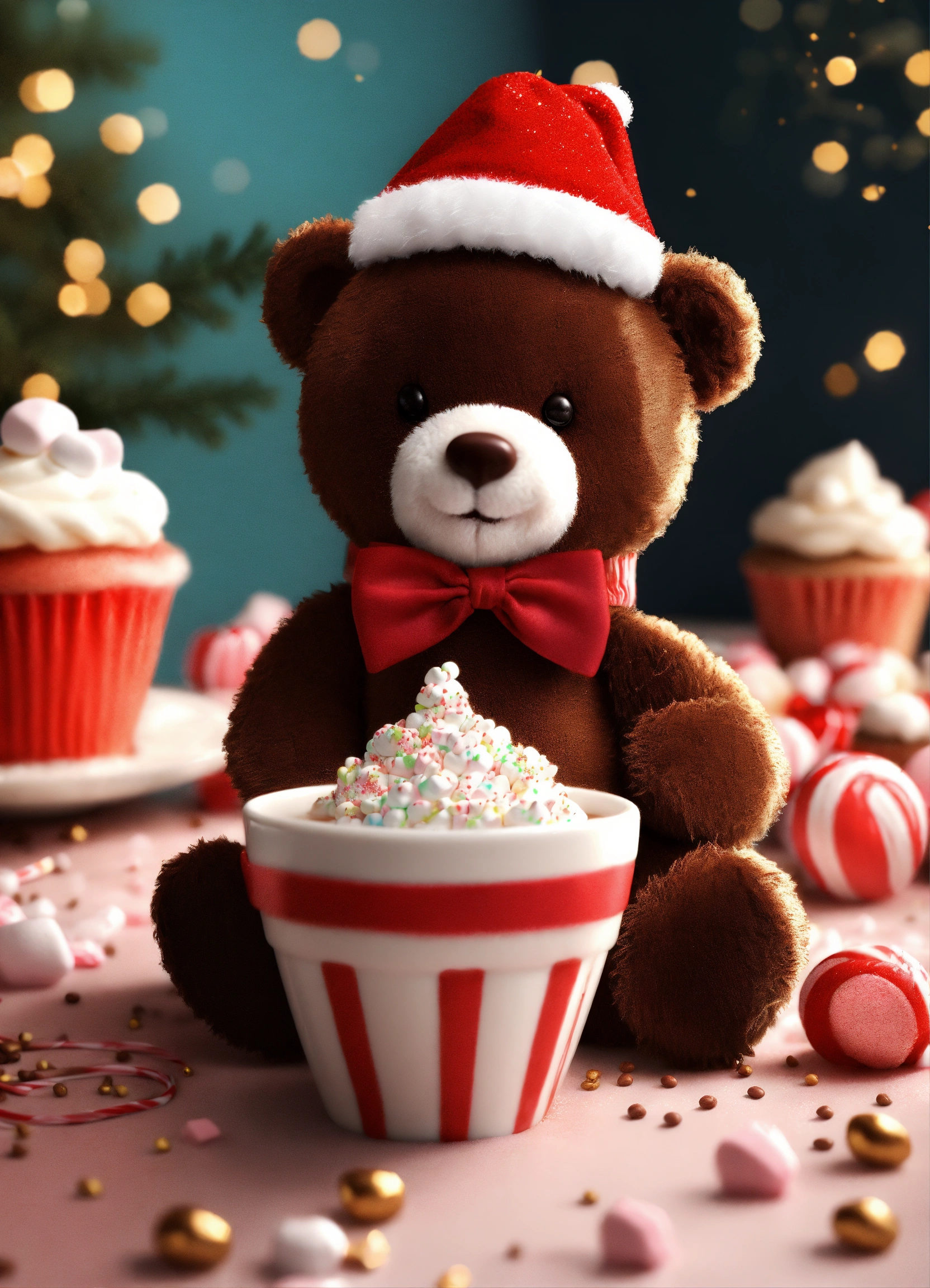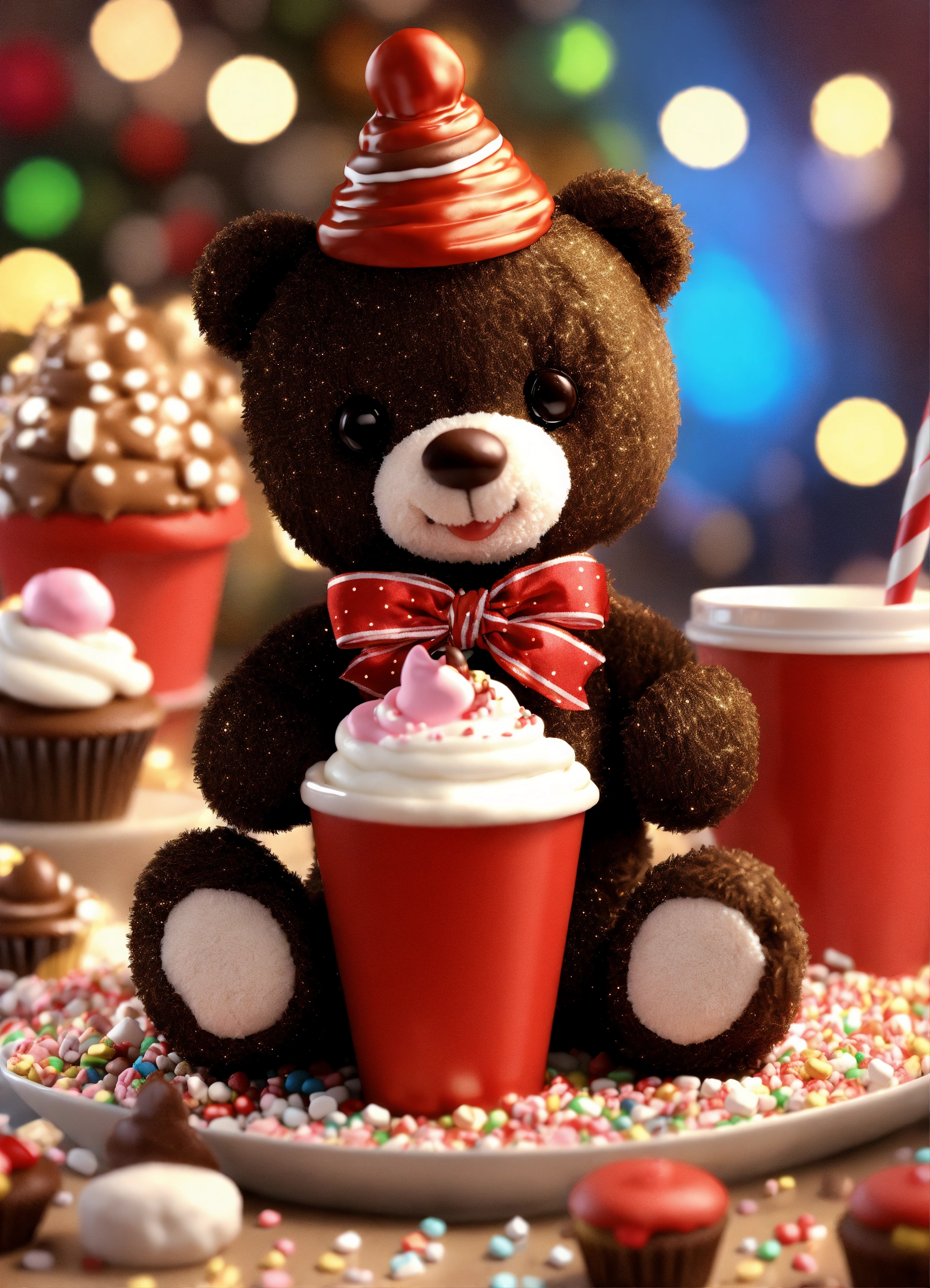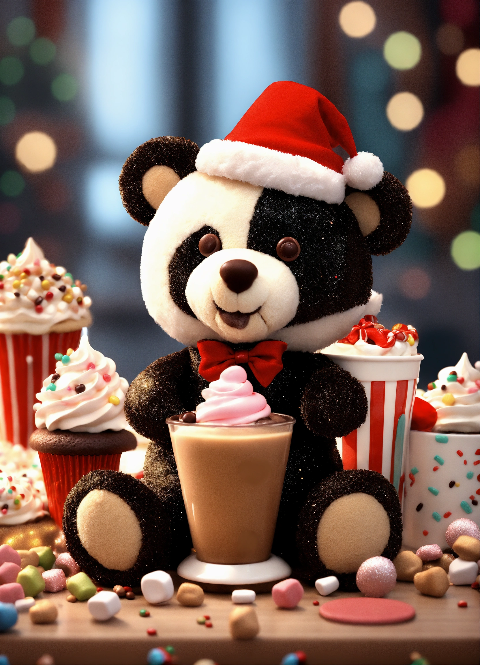 A cute and friendly cartoon baby tuxedo colored teddy bear, surrounded by cupcakes and coffee. sitting in a coffee mug filled with glitter, chocolate milk, and marshmallows. 3d candy canes and coffee beans in the background. baby teddy bear with christmas hat, cinematic, 3d render