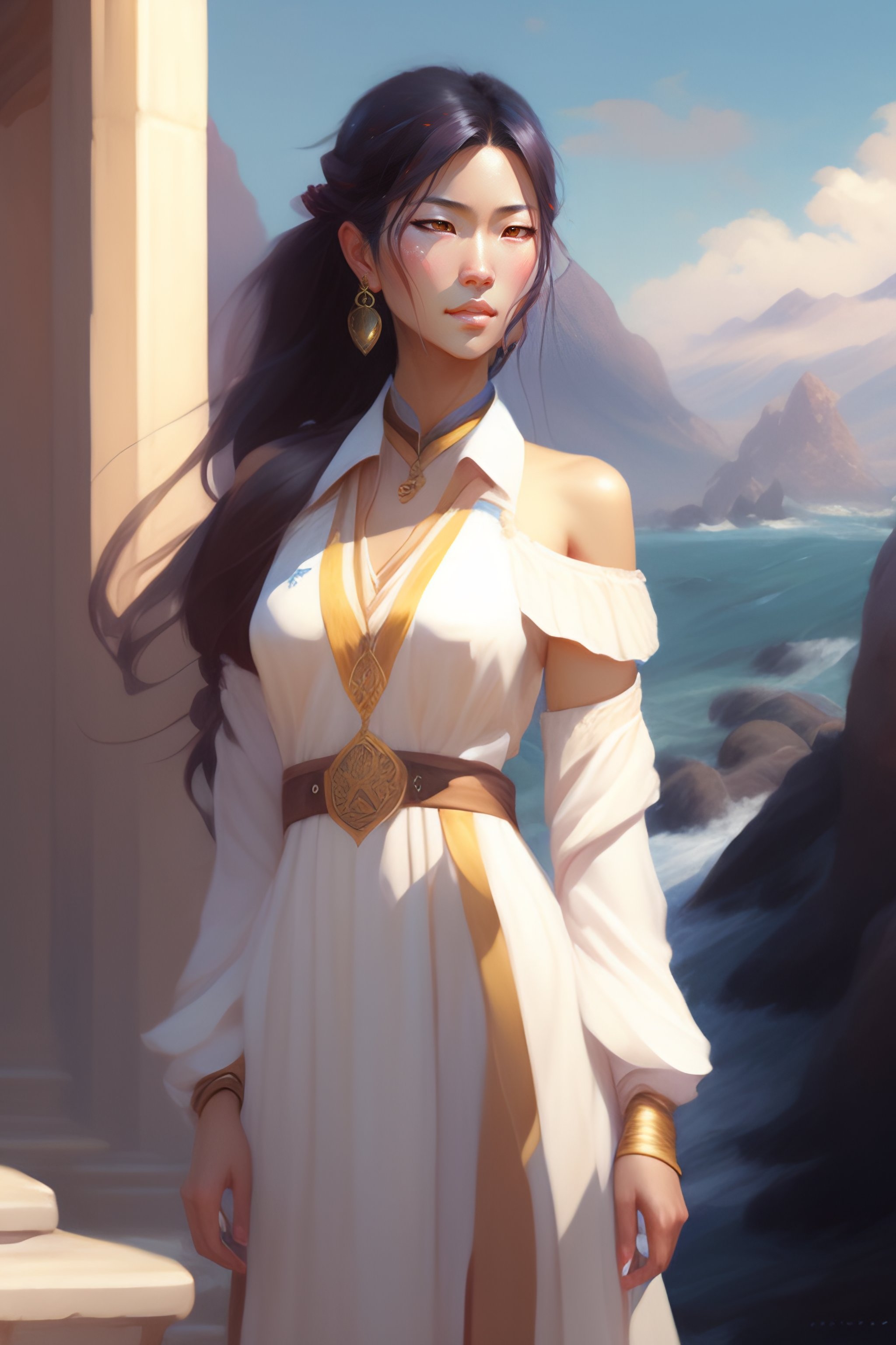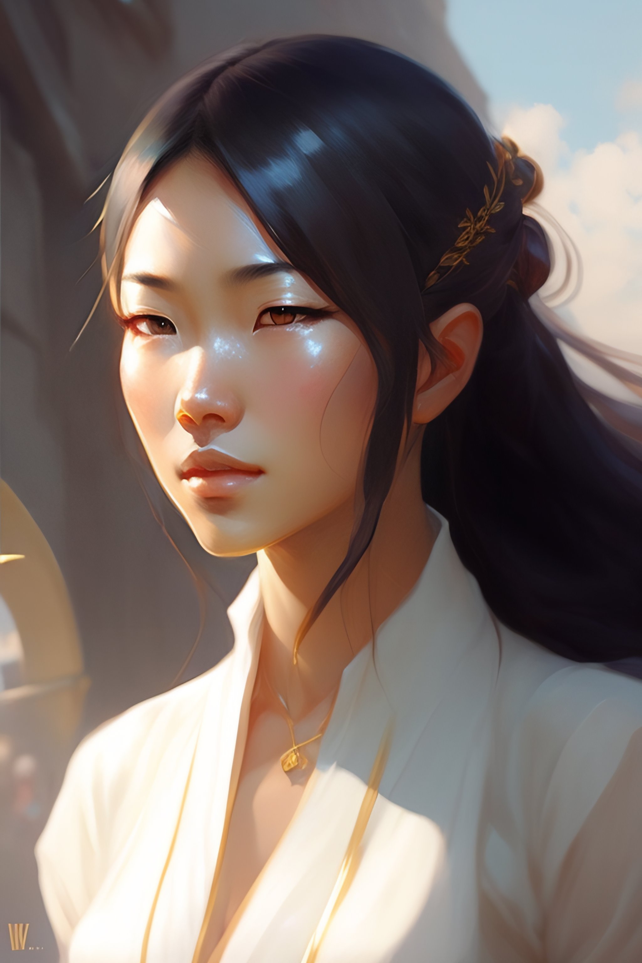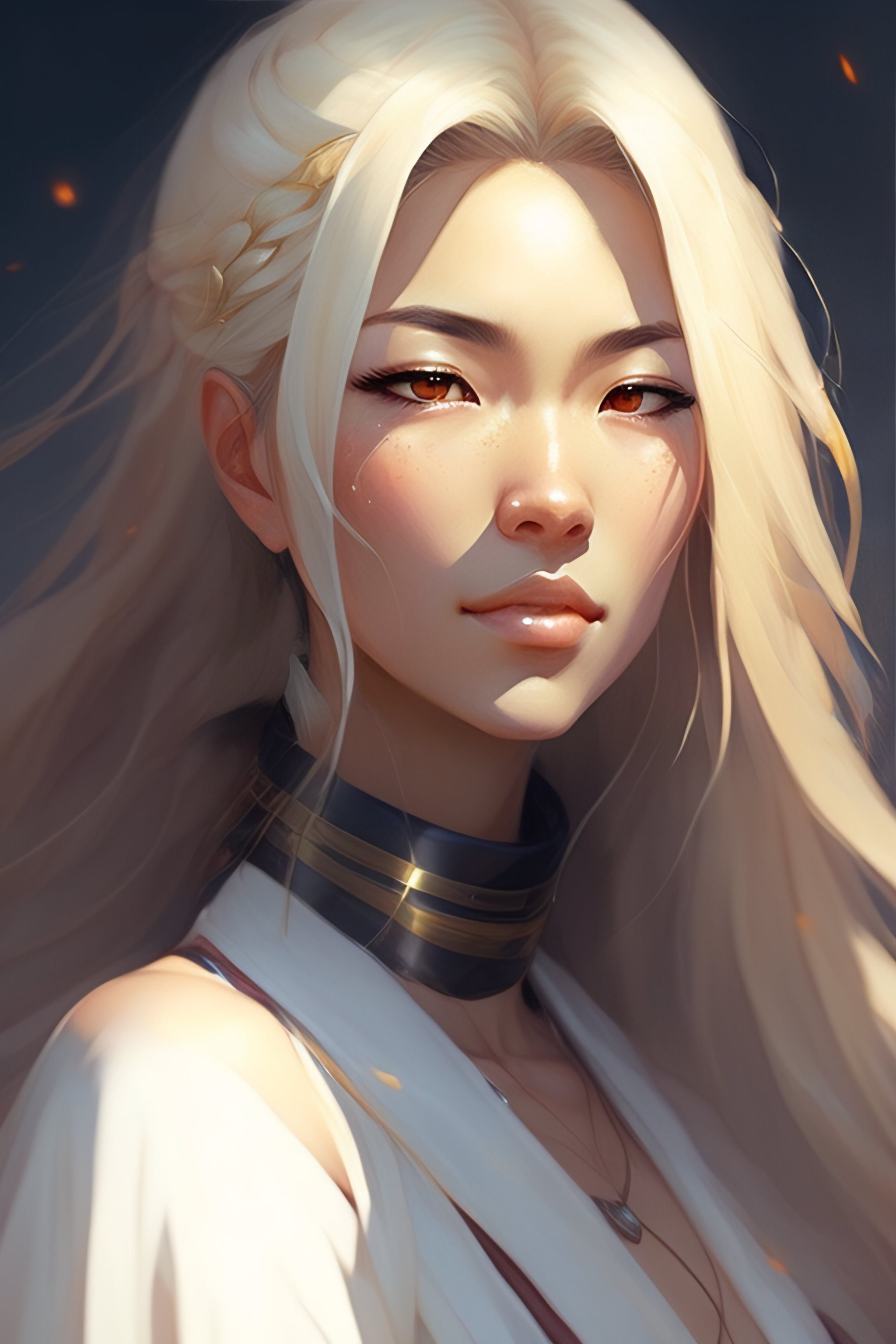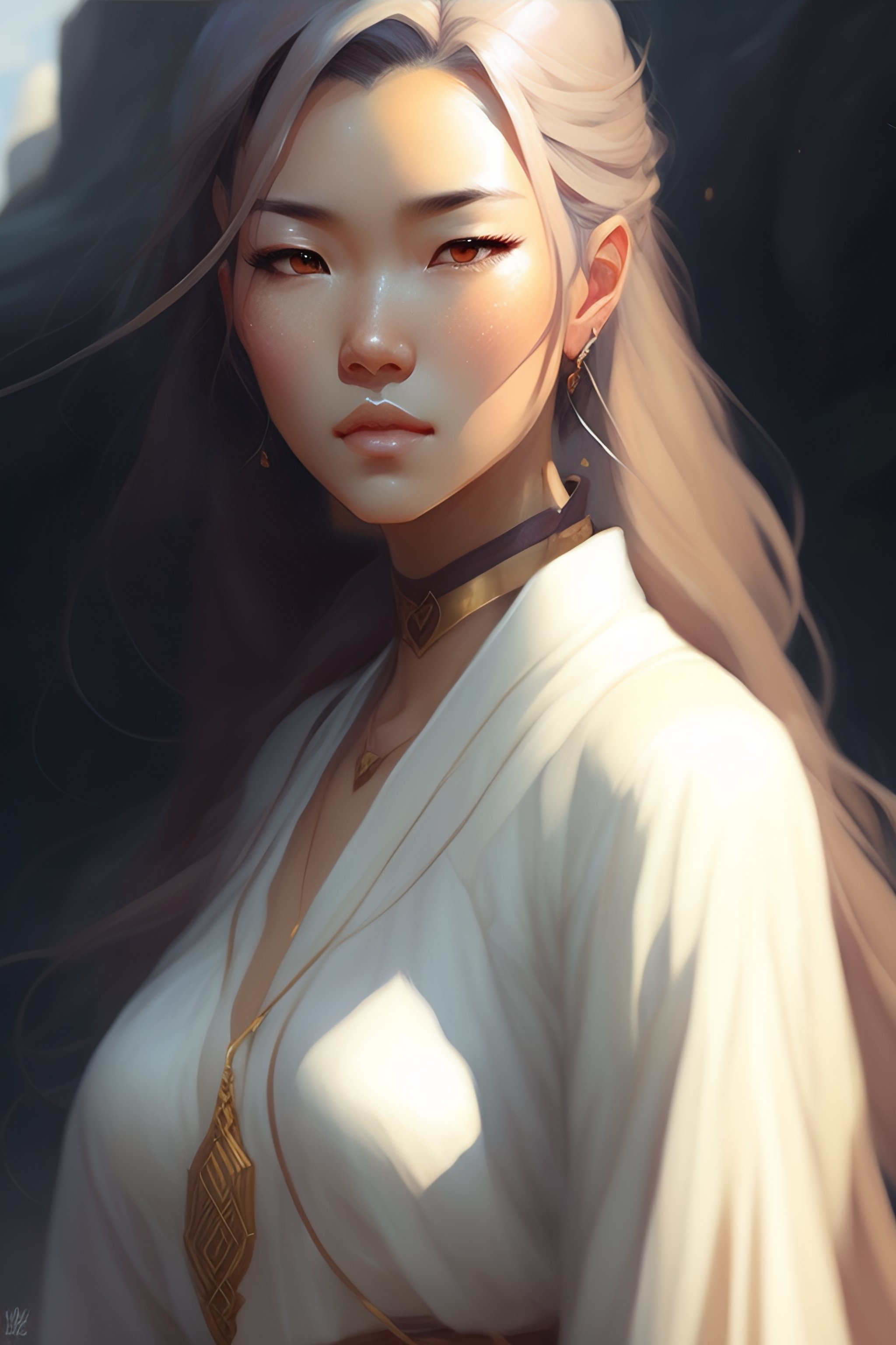 A mestizo woman, asian and european rase, (european eyes), white skin, (blind eyes), blonde hair, wavy hair, very long hair, loose hair, (very big eyes), gentle, white dress with sleek accents, silk clothes, golden elements in clothes, full body, not realistic, wendy, by wlop, ilya kuvshinov, krenz cushart, greg rutkowski, pixiv.