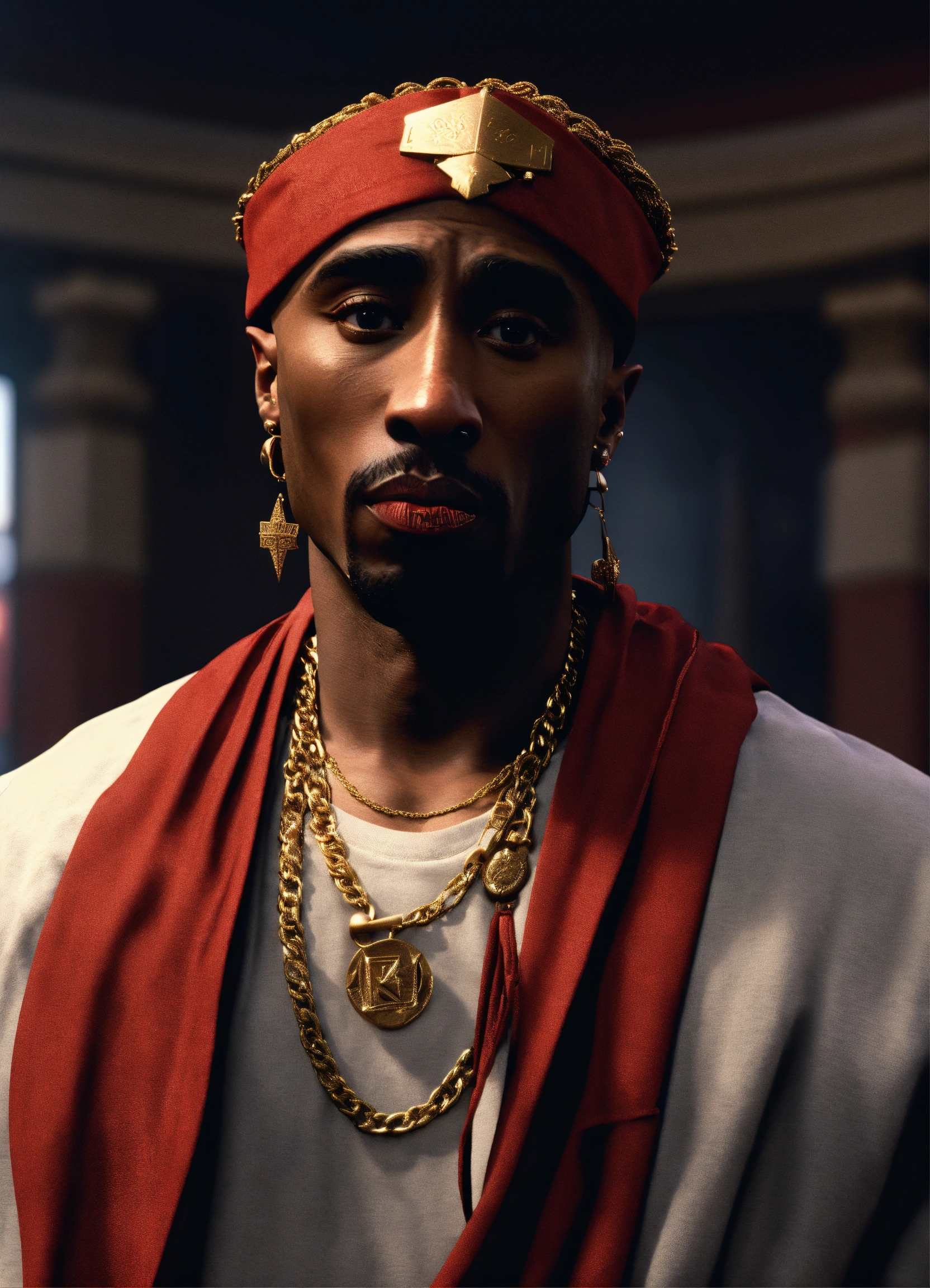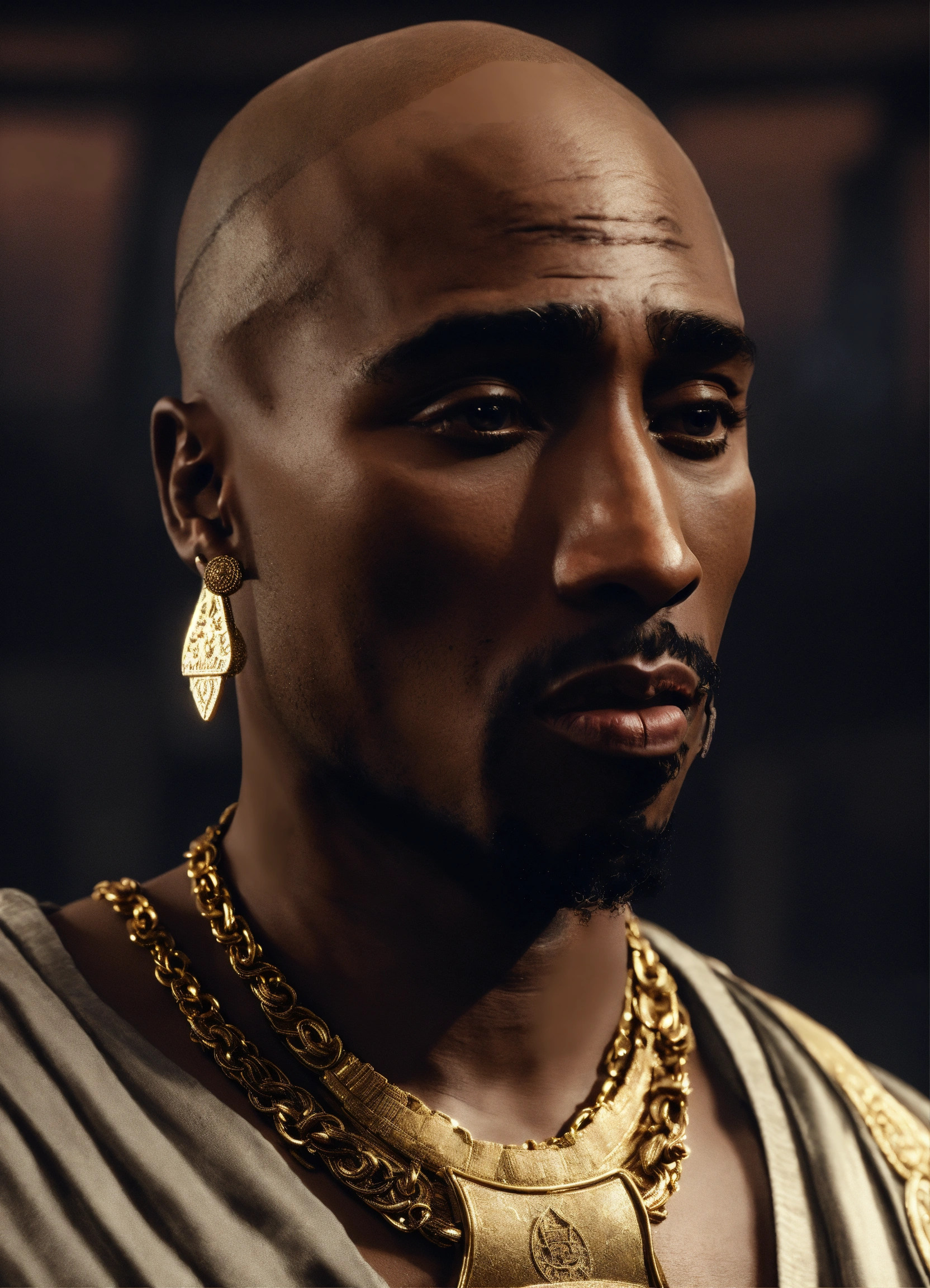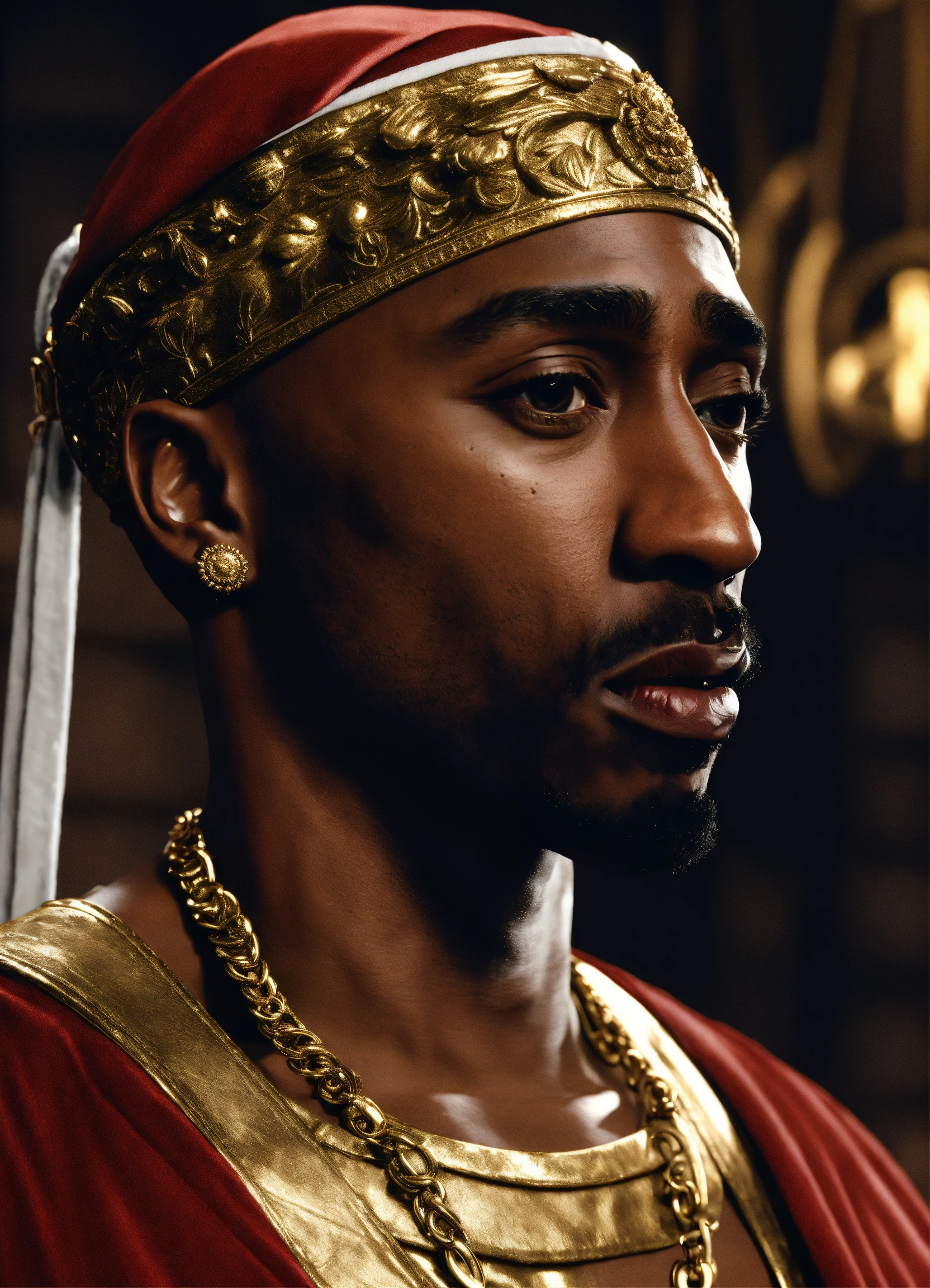 Tupac shakur as julius caesar 8k unreal engine render, photorealism, surreal, hip hop, hardcore, technology background