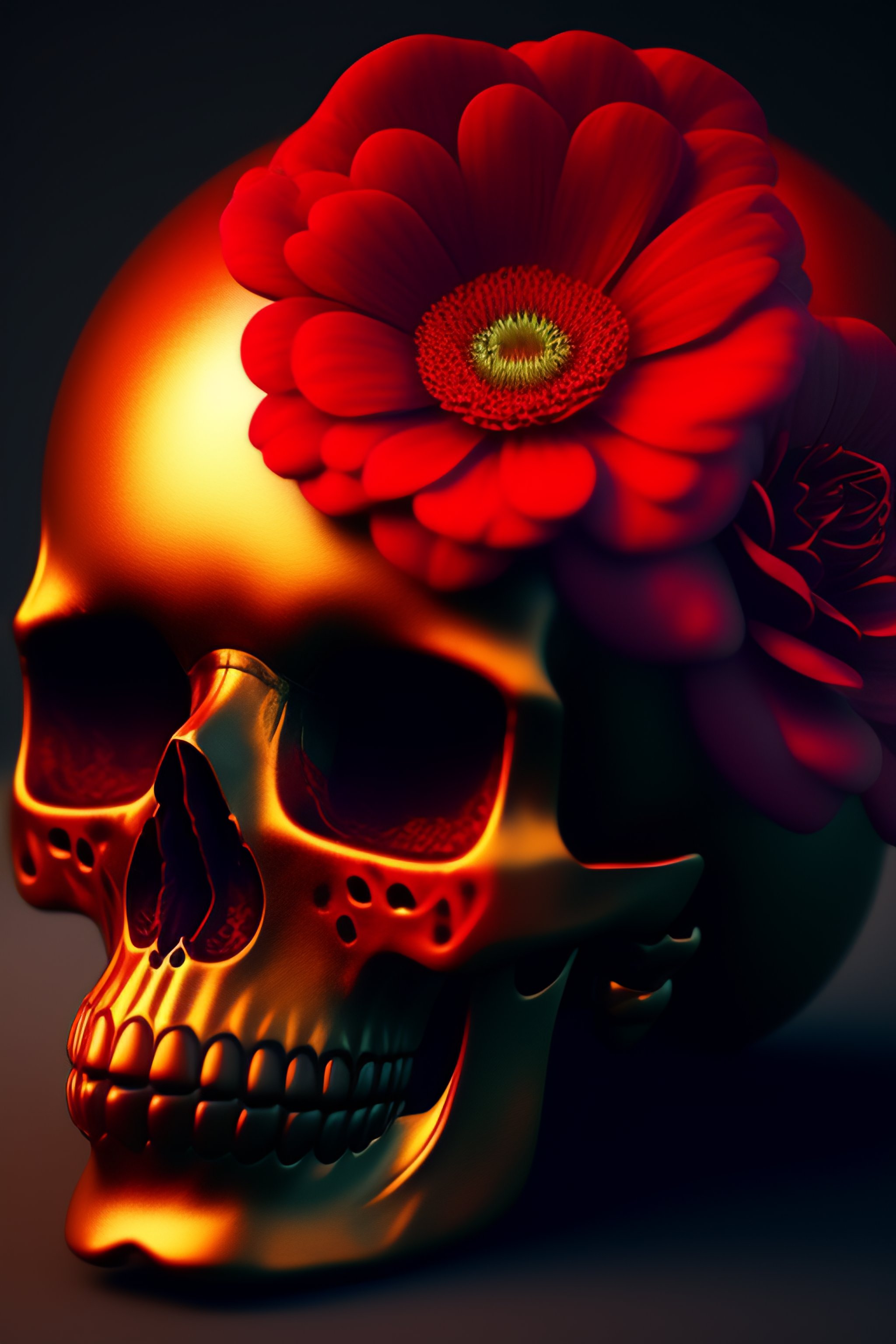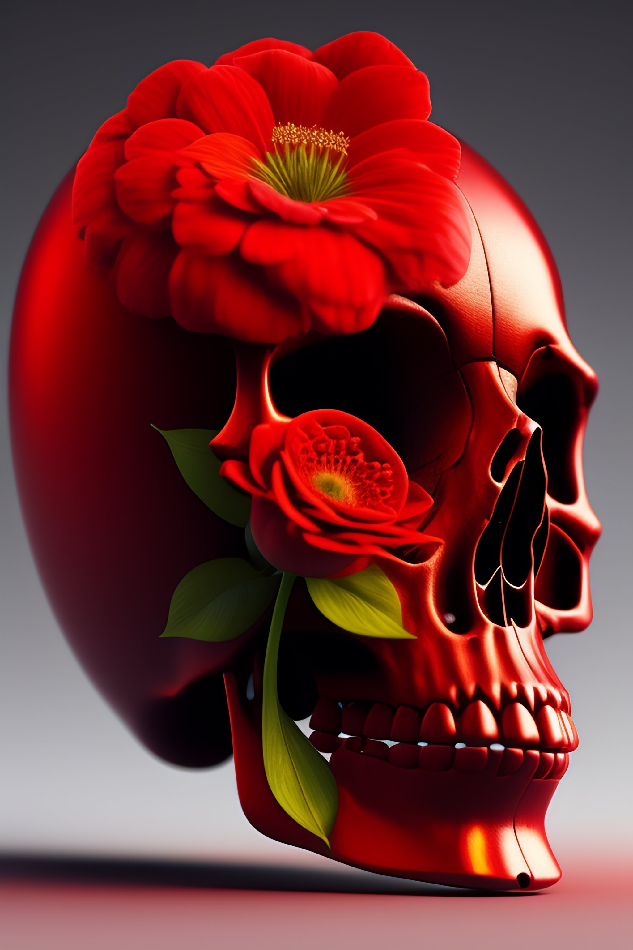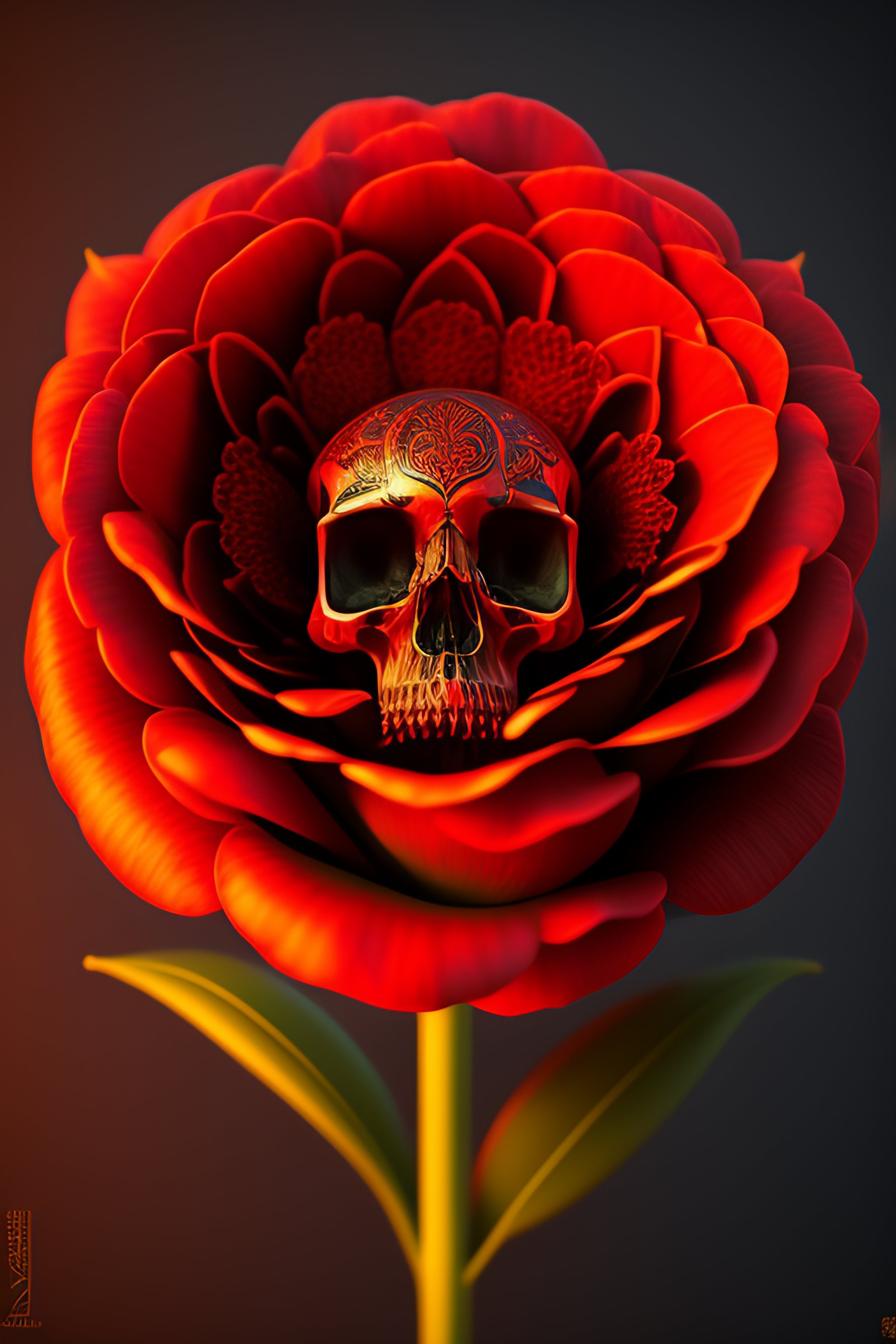 Small skull inside a large red flower, with vegetation around darkness, demonic, render, rembrandt, cgsociety, artstation trends, highly detailed