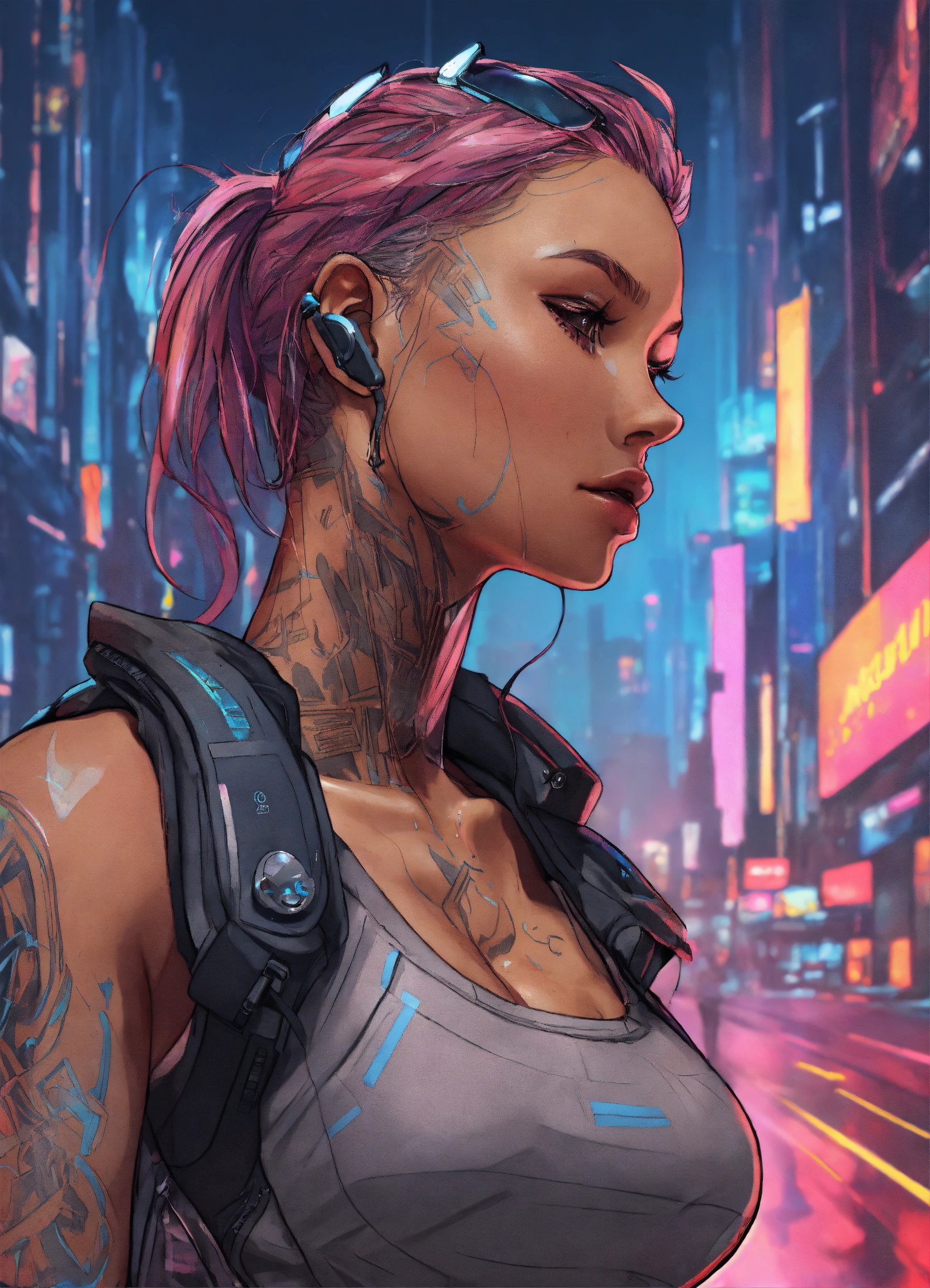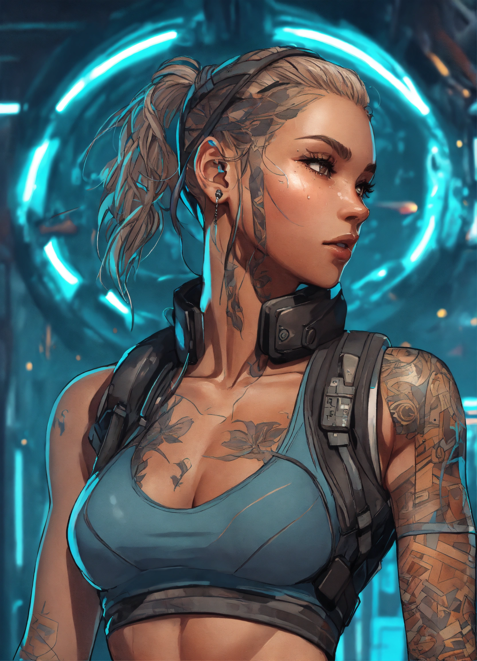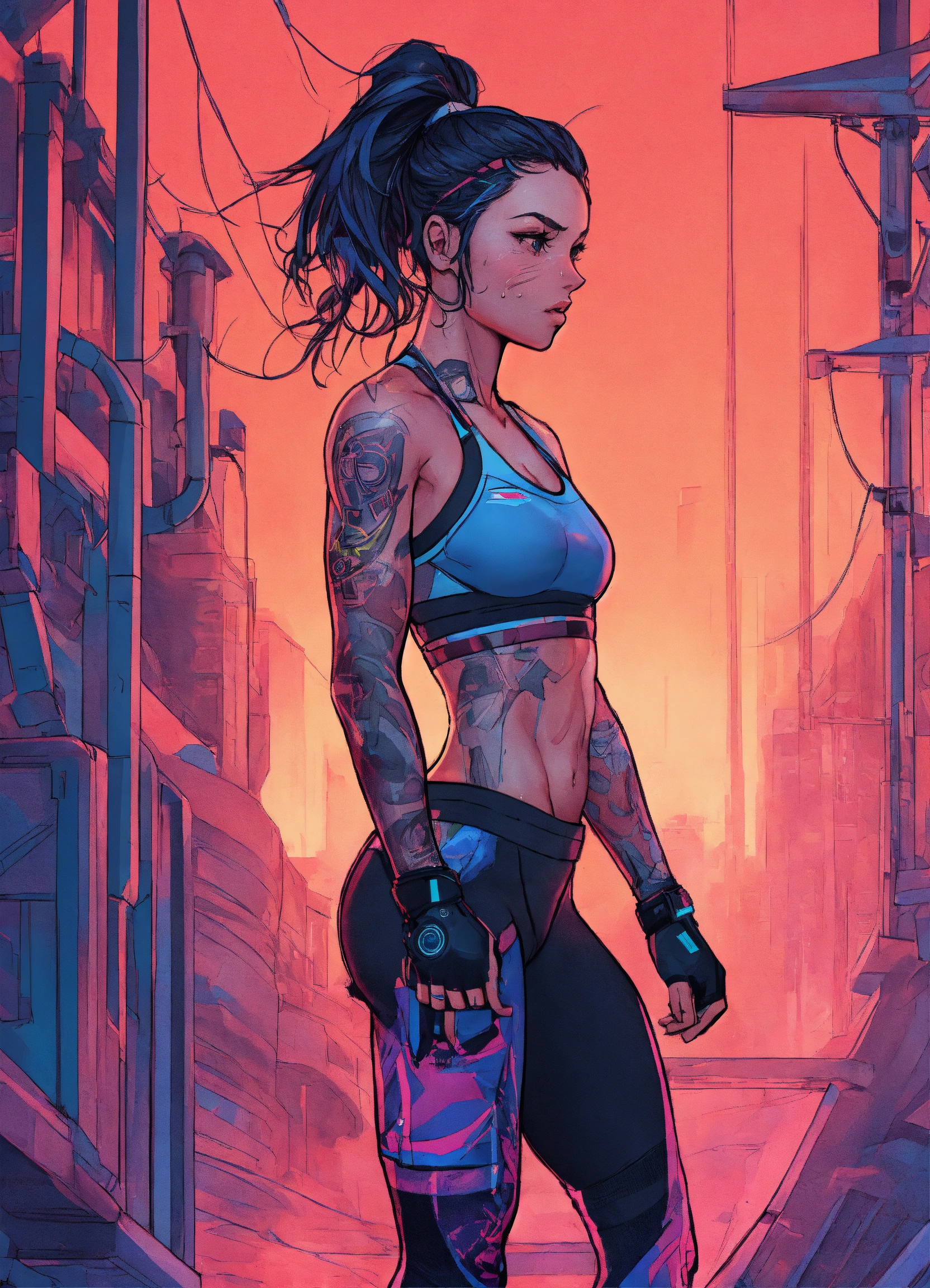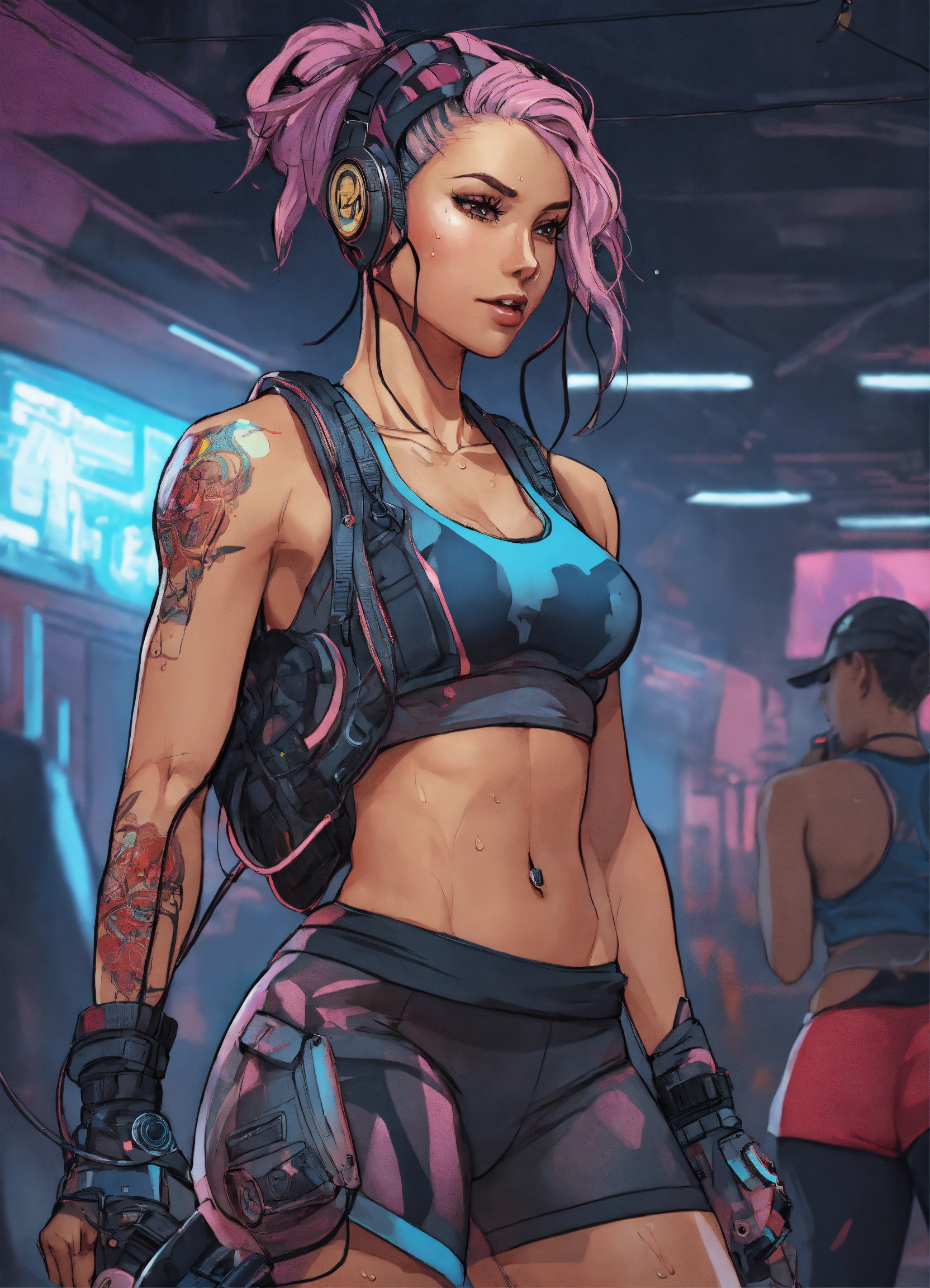 Cartoon, sporty, girl in fitness, fit, stacked, sweaty skin cyberpunk style, very intricate details, elegant