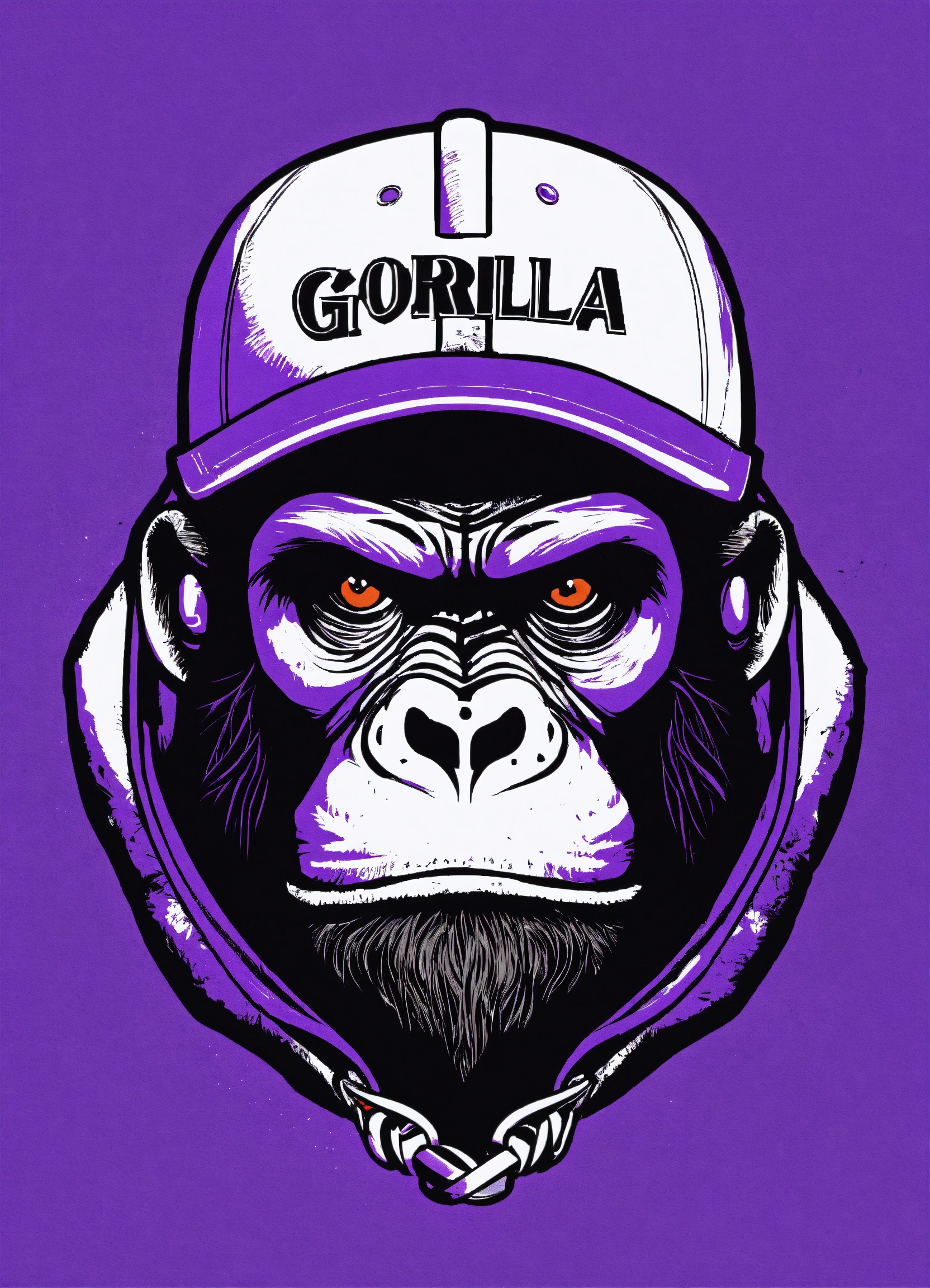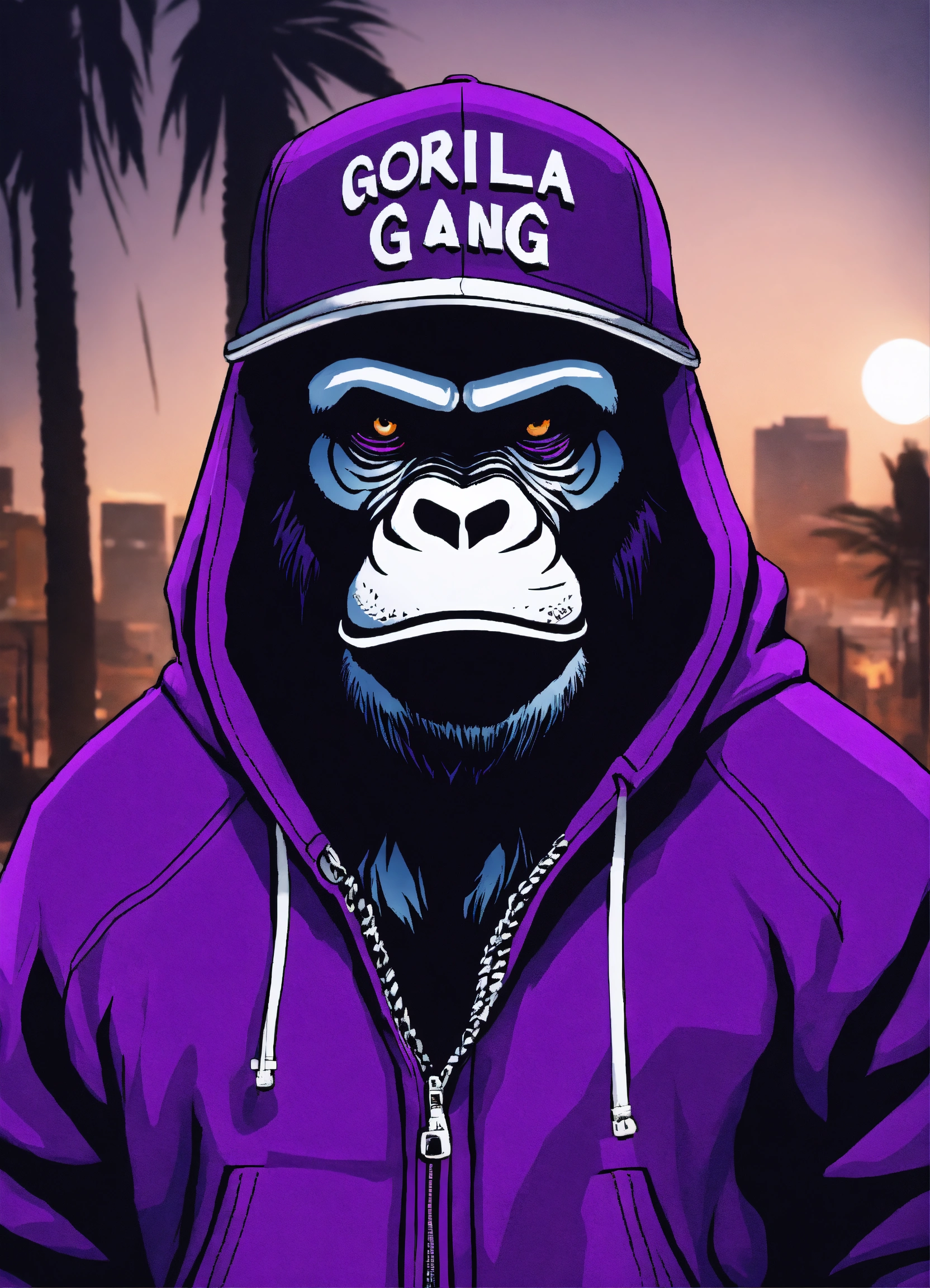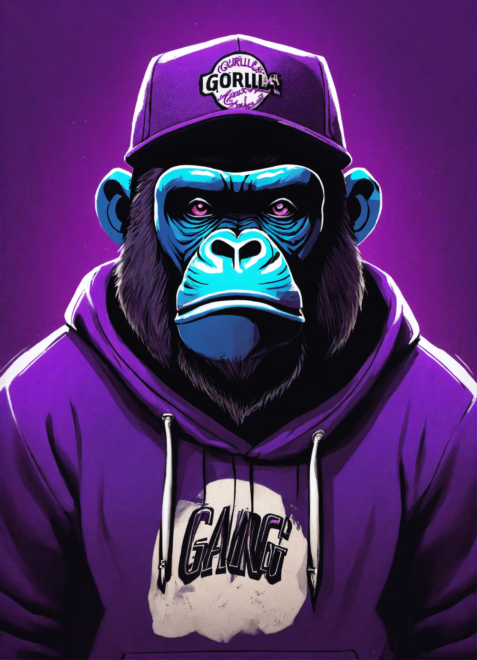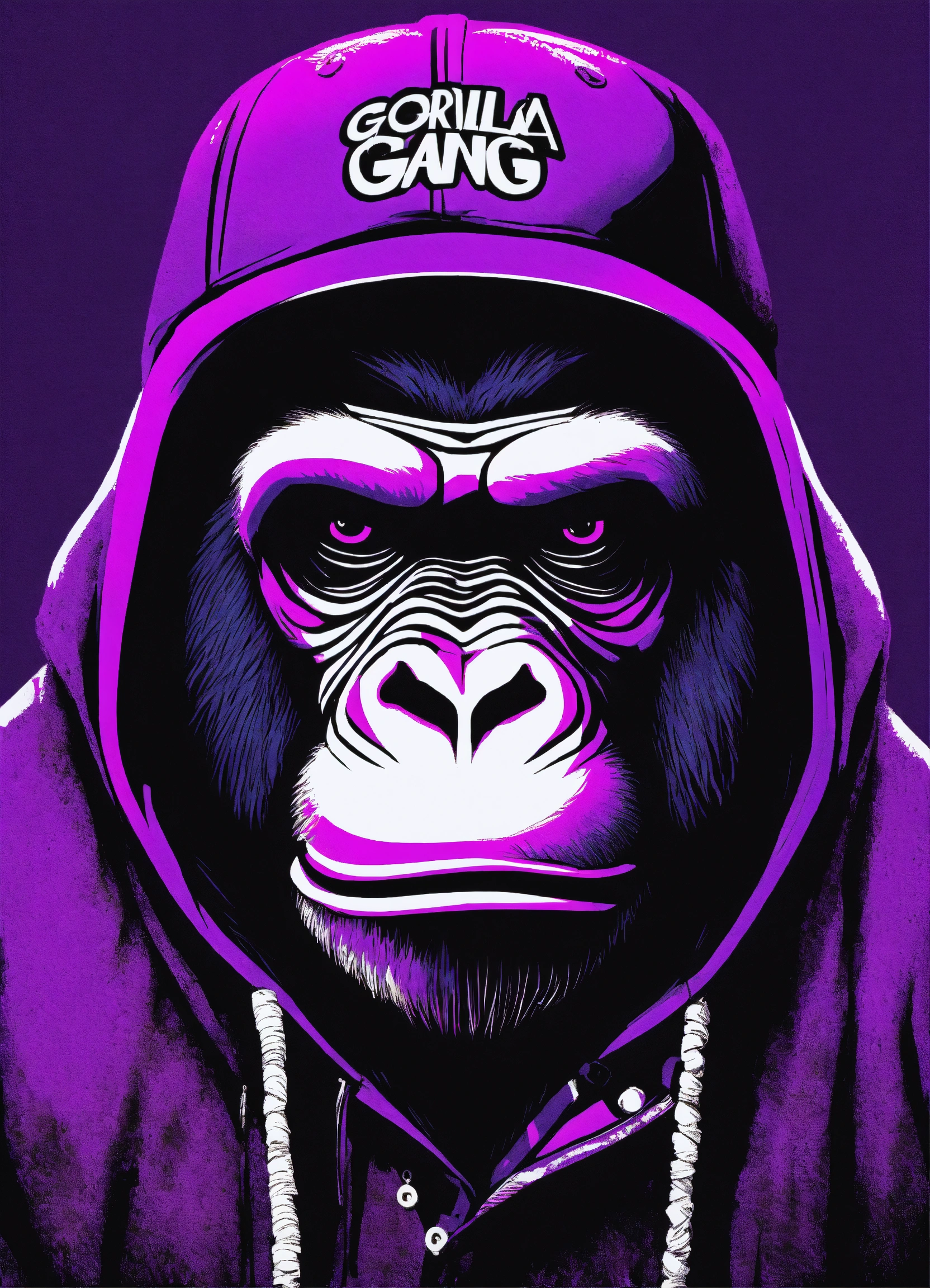 Gangster gorilla in hoodie and baseball cap with the words gorilla gang in purple