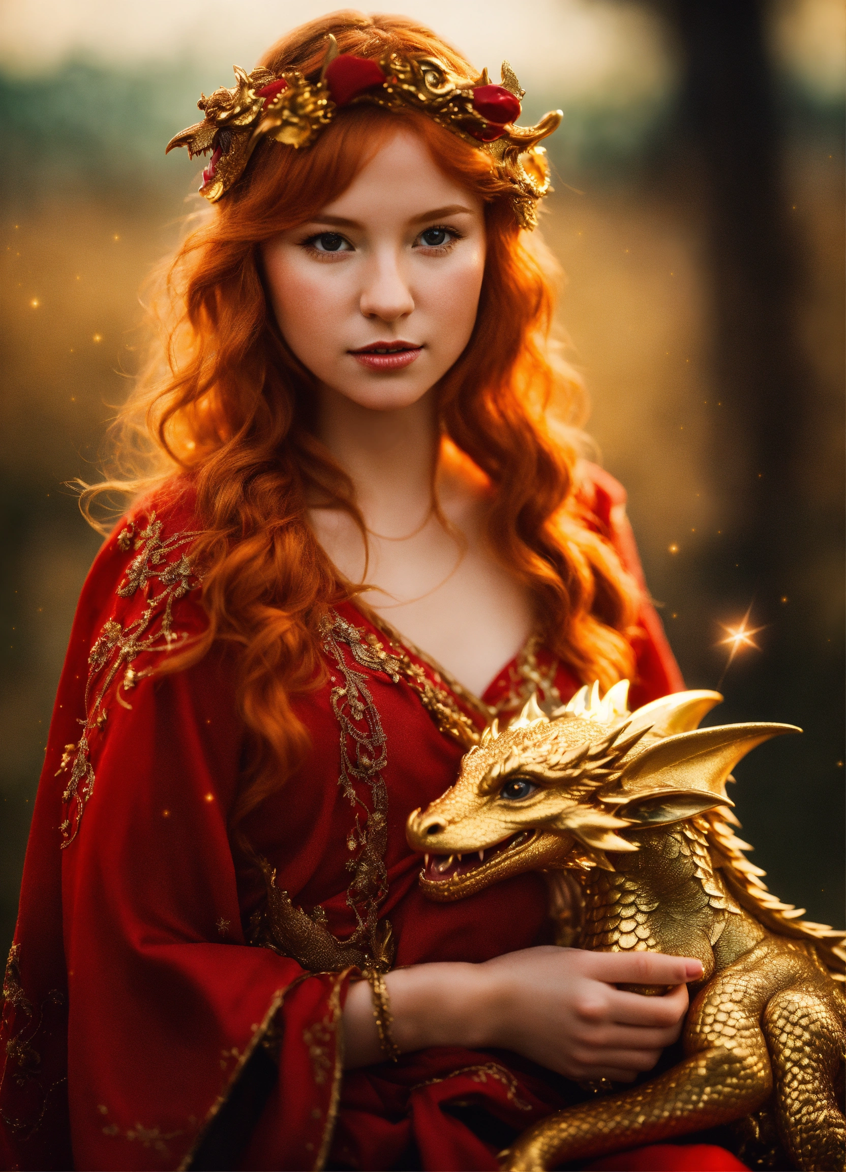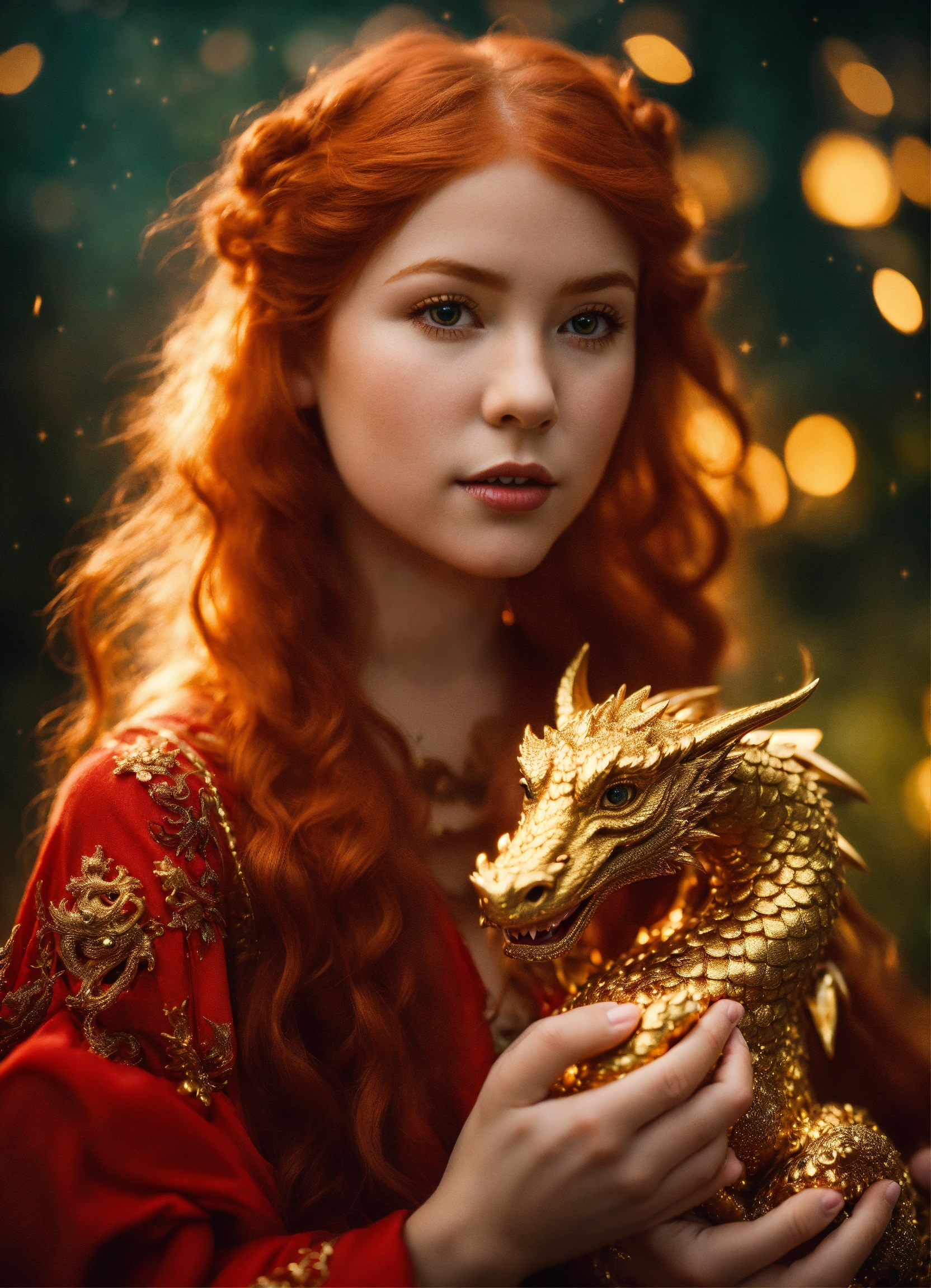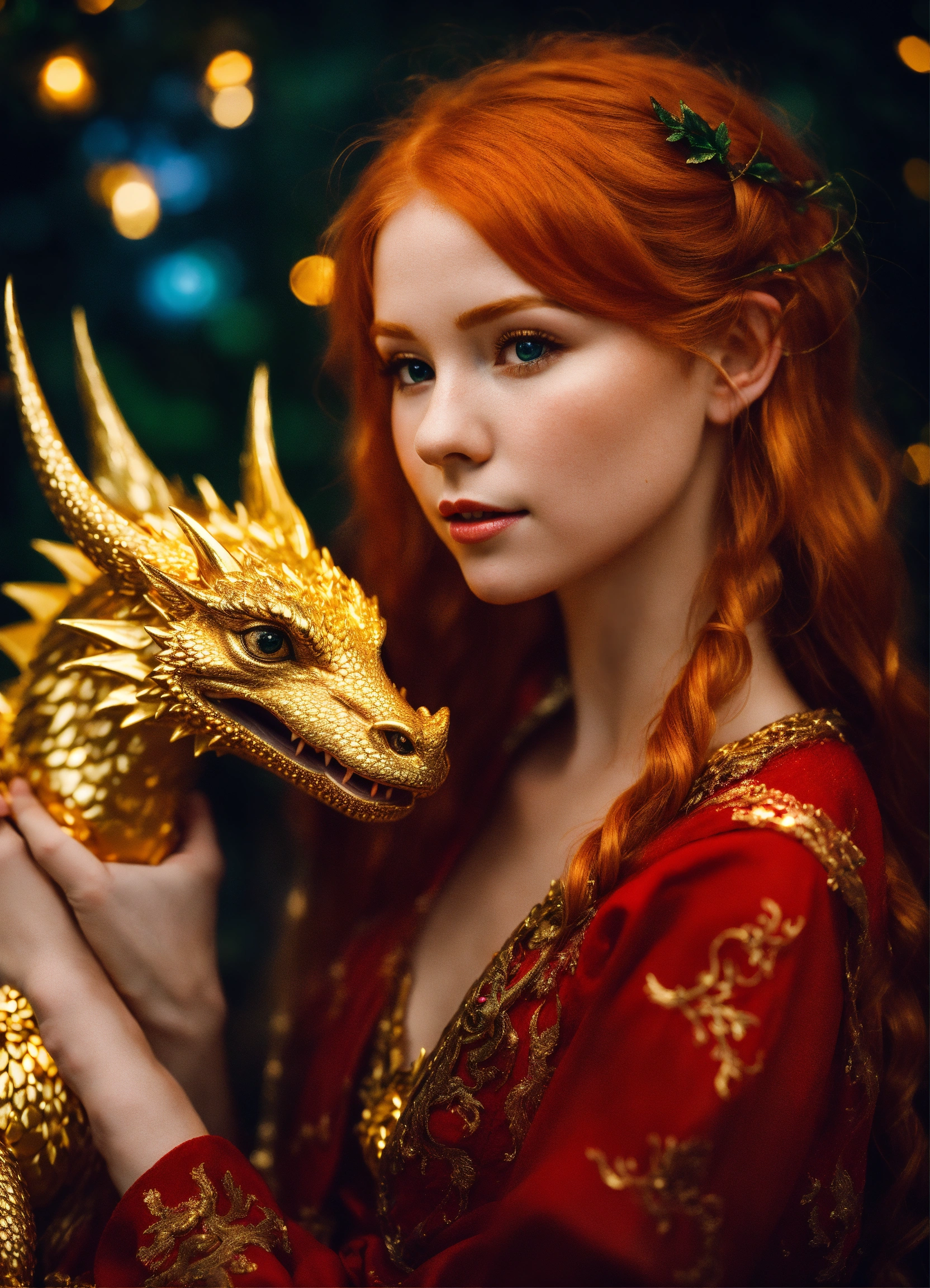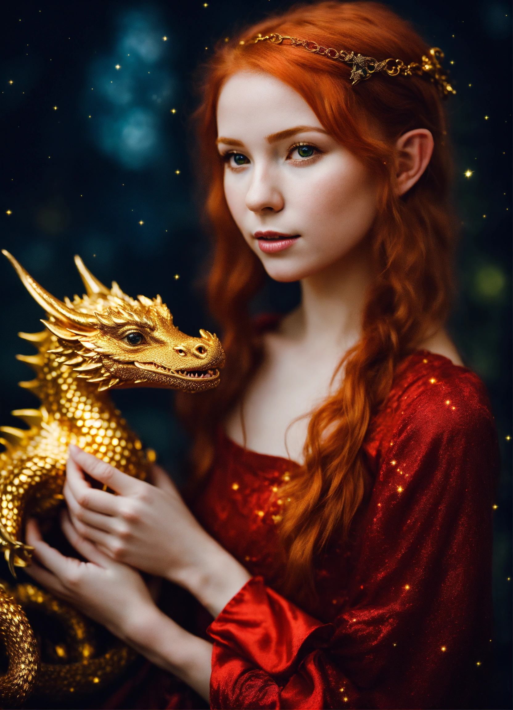 Cute young redhead irish elf girl dressed in a beautifull red clothes holding her golden baby dragon, fantasy, exquisite detail, 30 - catch light, low - contrast, high - sharpness, depth - of - field, golden - hour, ultra - detailed photography, shiny stars in the sky
