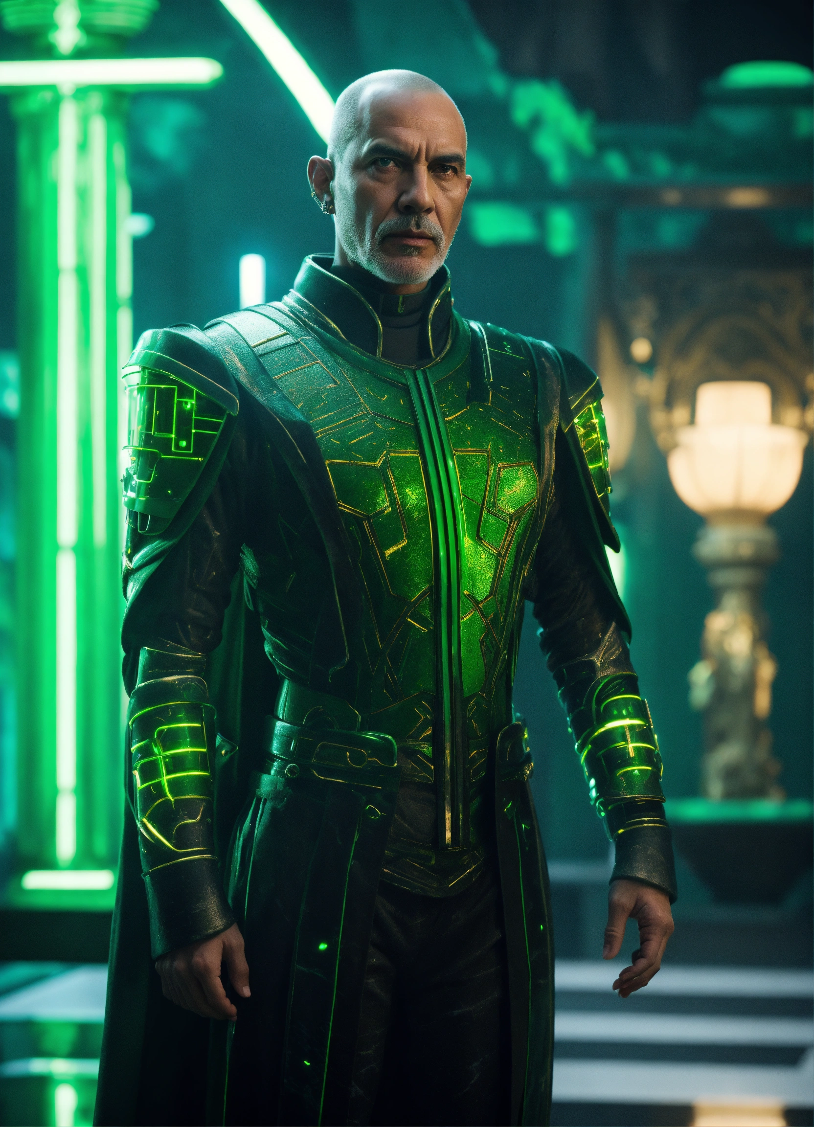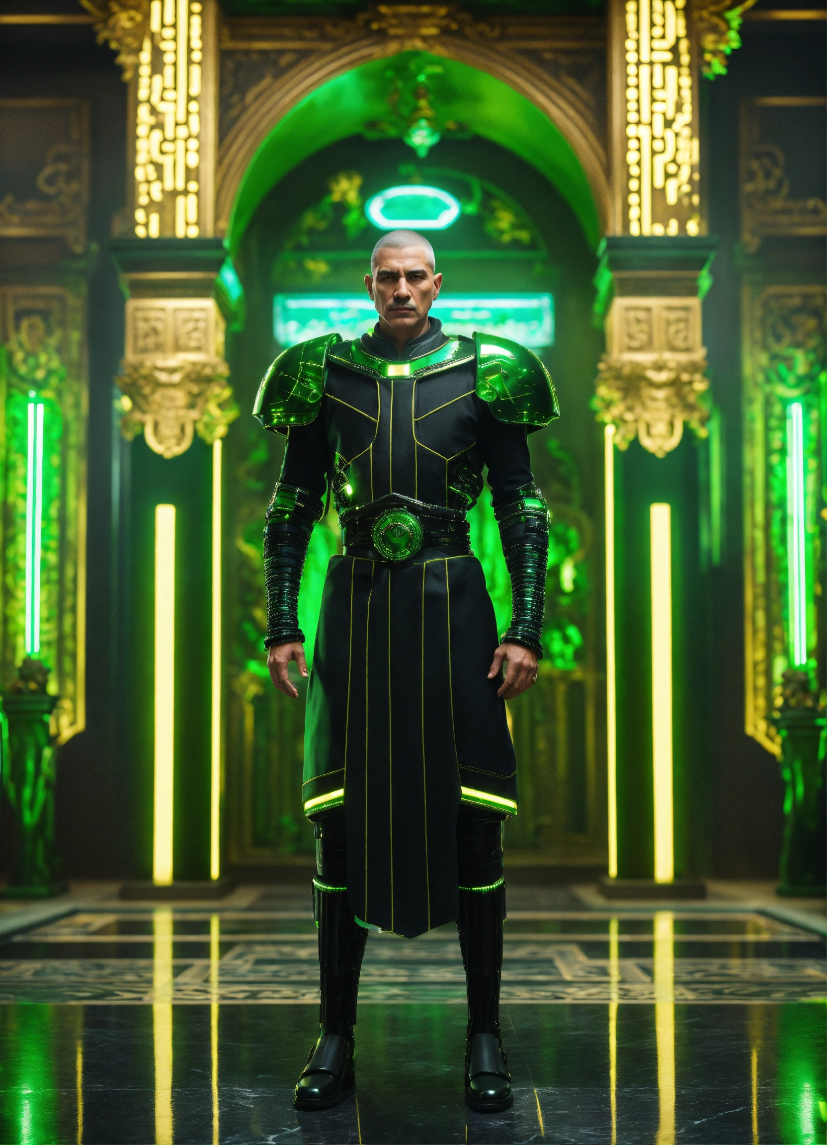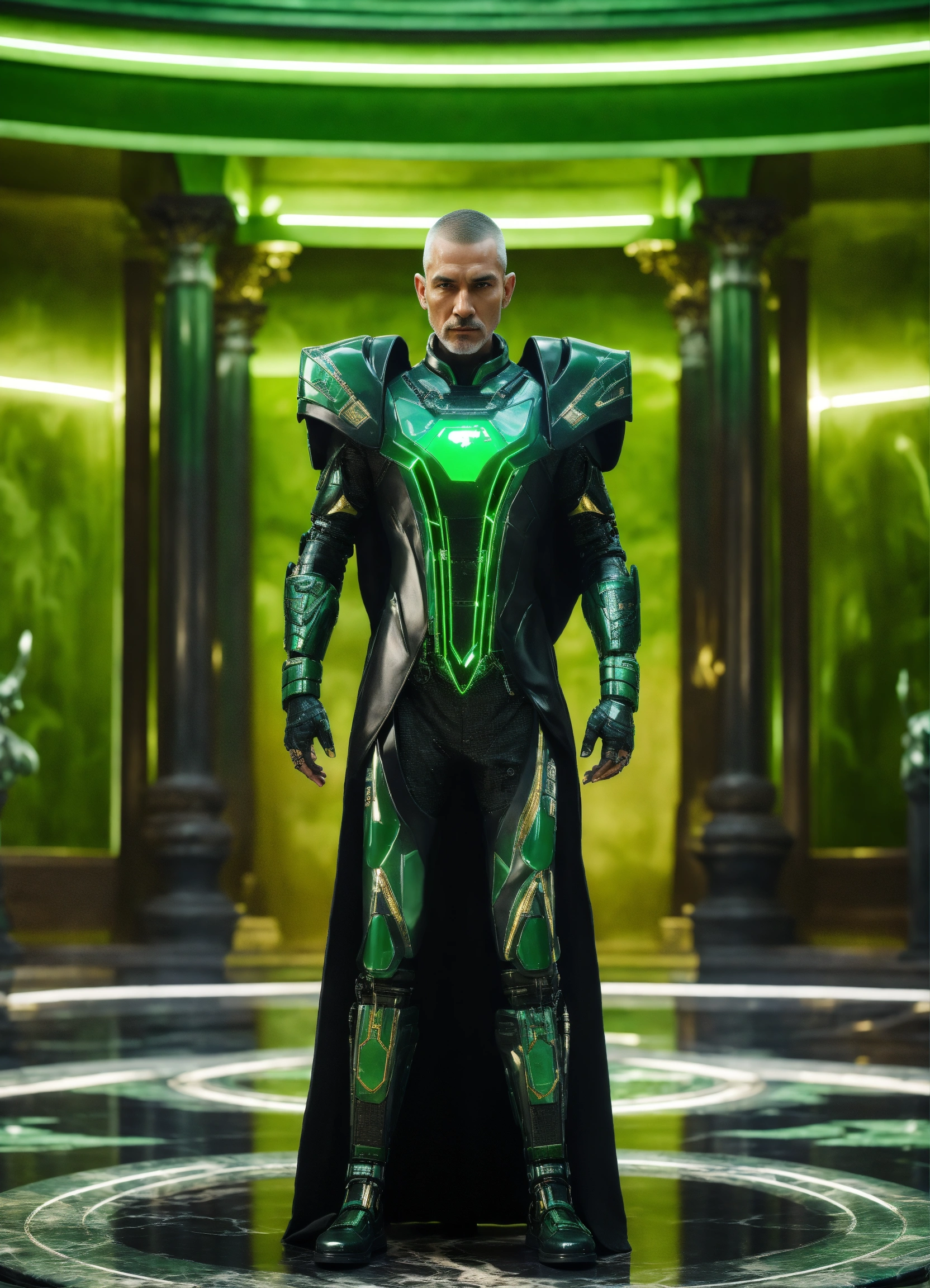 Full body image of a sci fi king wearing a black and green cybernetic uniform, sci fi, olive skinned, futuristic aristocrat standing in a black marble and jade temple room, 60 years old, stoic, buzz cut, royalty, green eyes, unreal engine, 8k