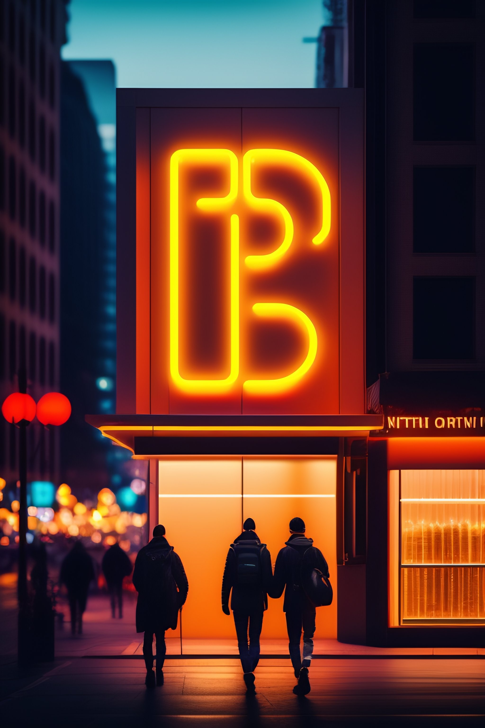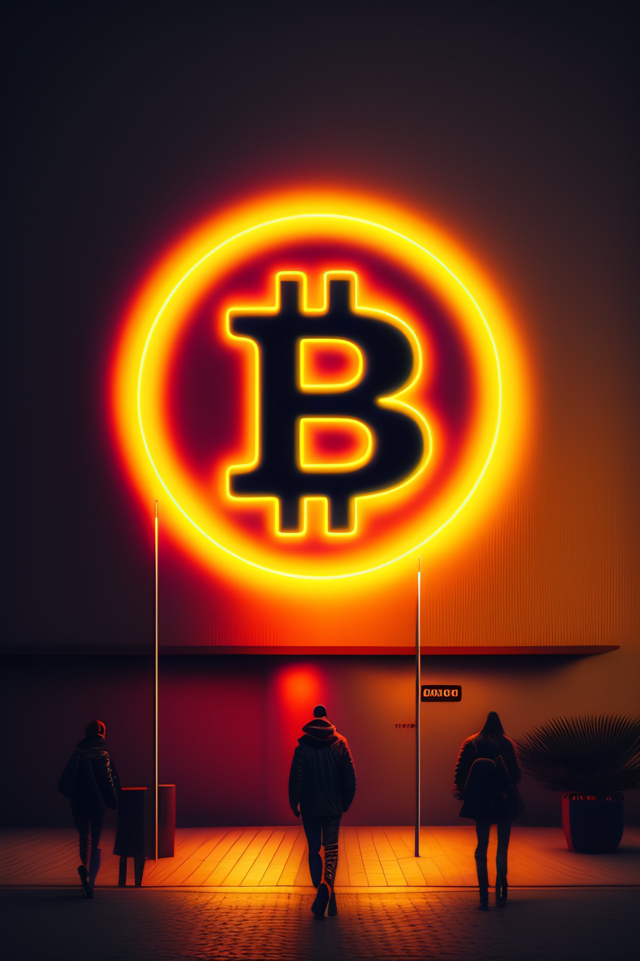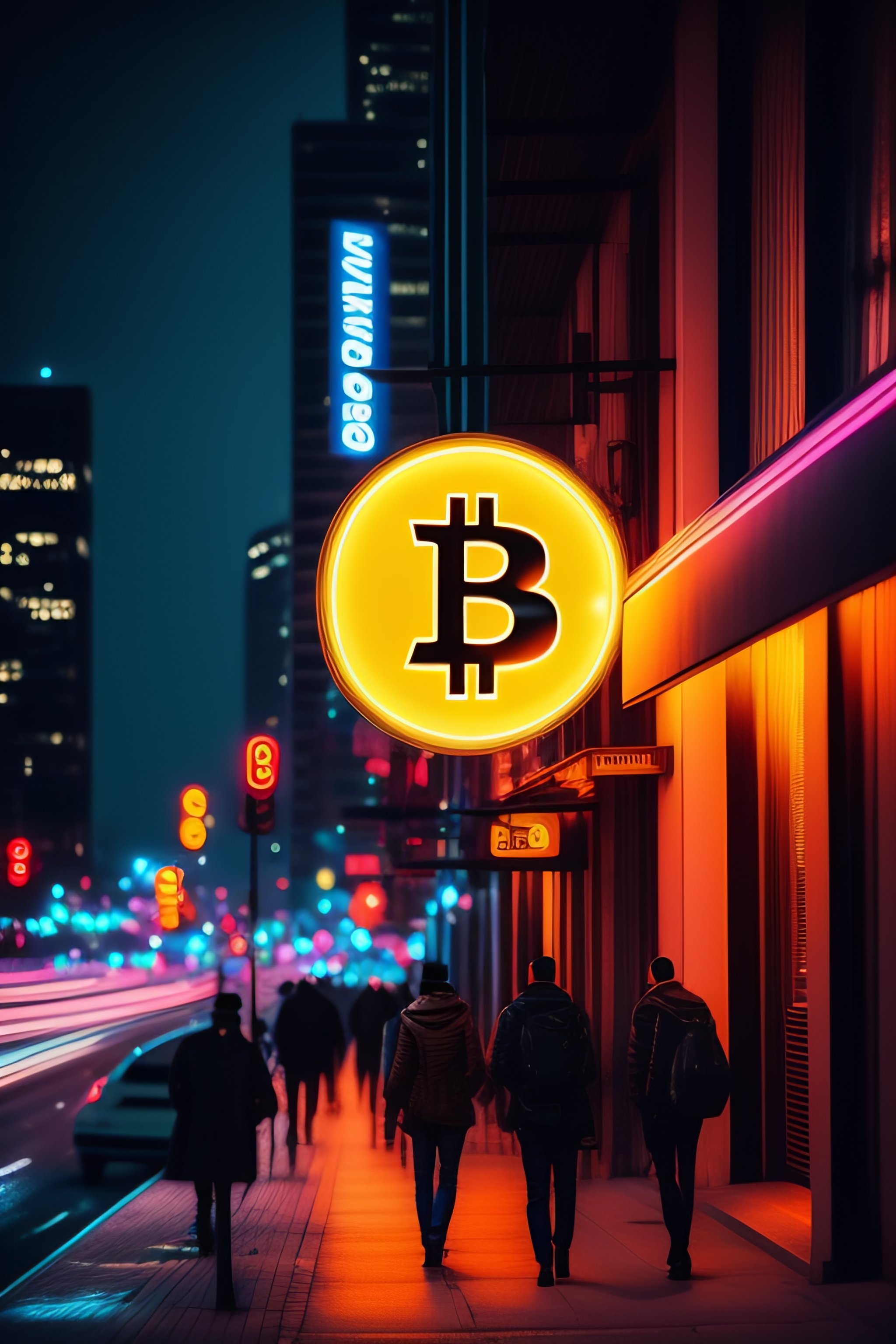 Bitcoin logo neon light downtown with people walking