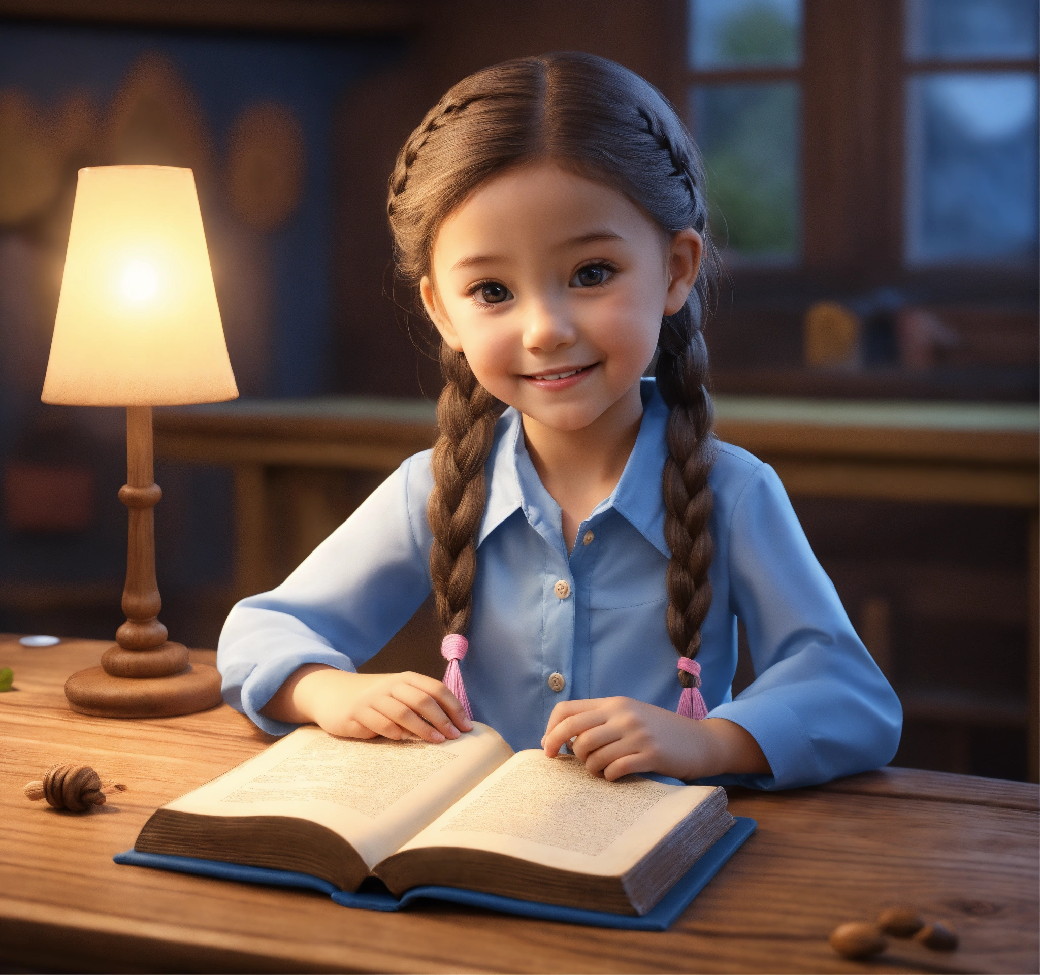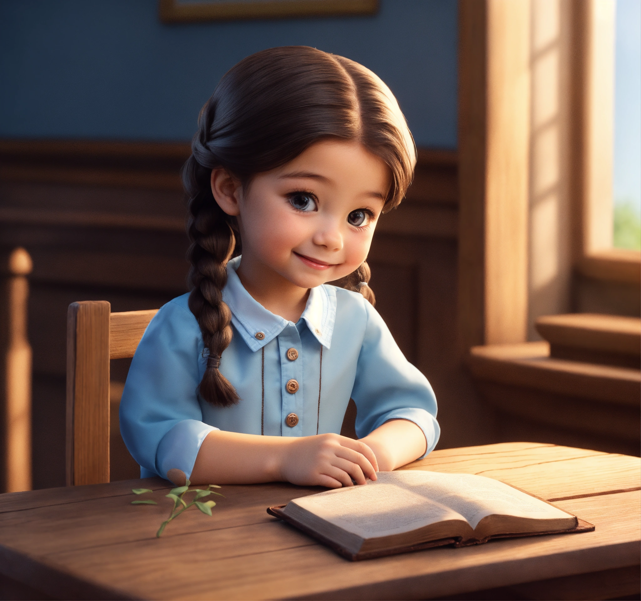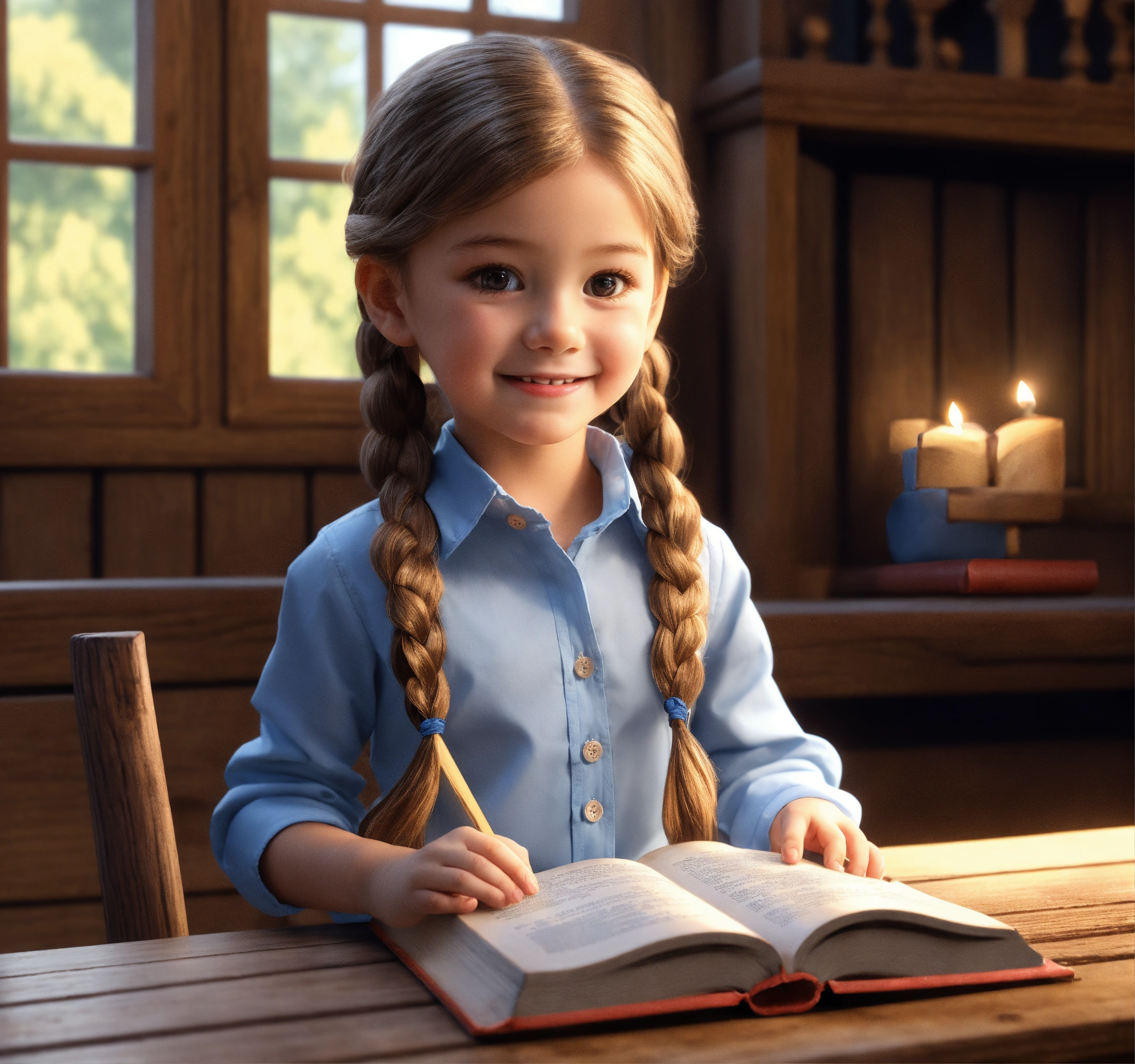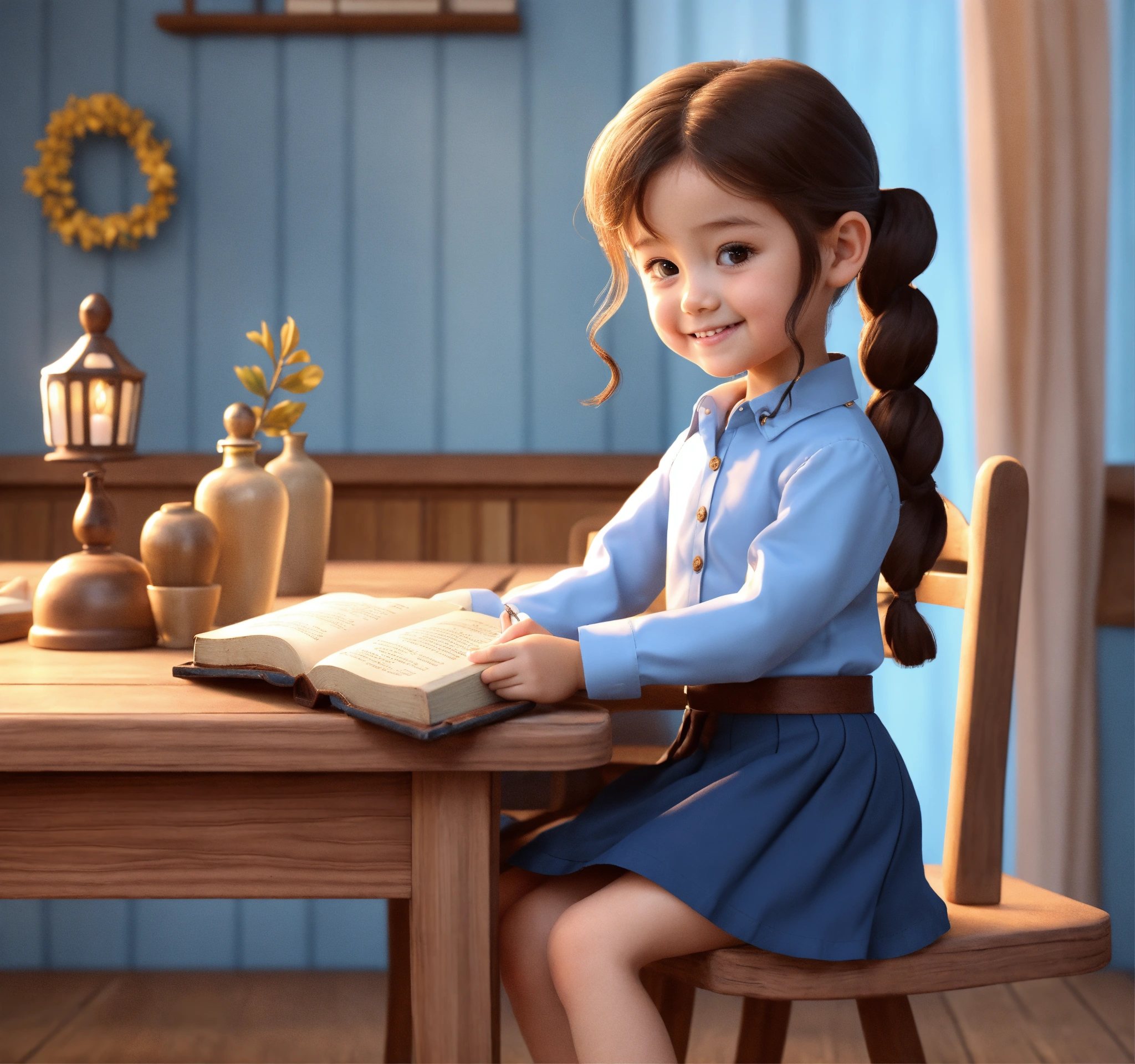 One sweet and happy 5-year-old girl, wearing a light blue long-sleeved button-down shirt with a closed collar, a dark blue skirt, hair in a braid. sitting at a wooden table, hugging a holy book. cute 3d realistic style