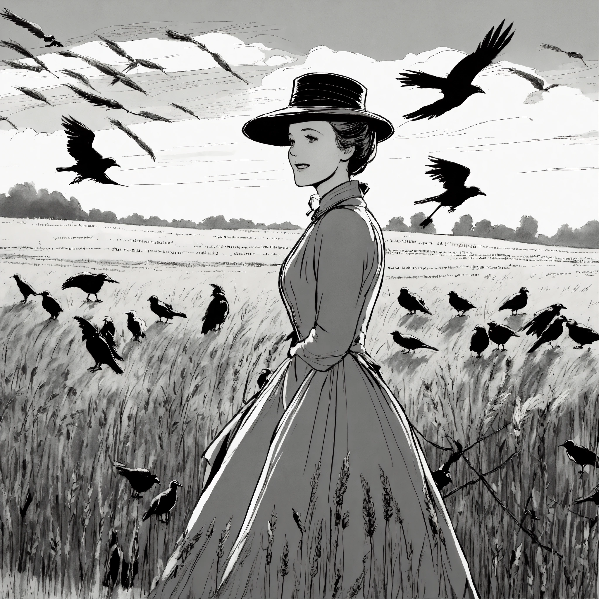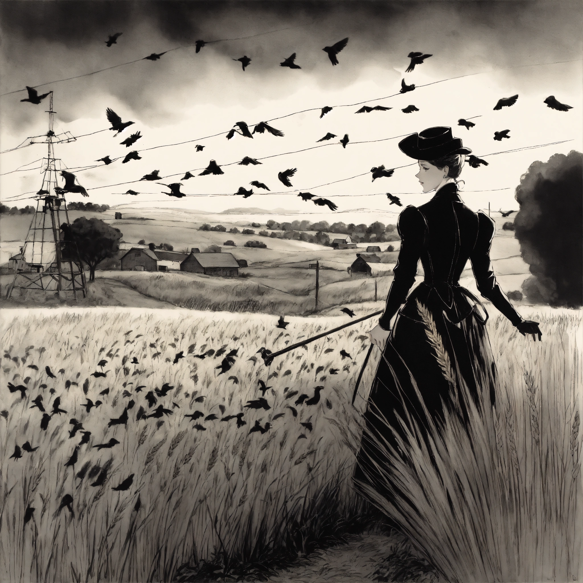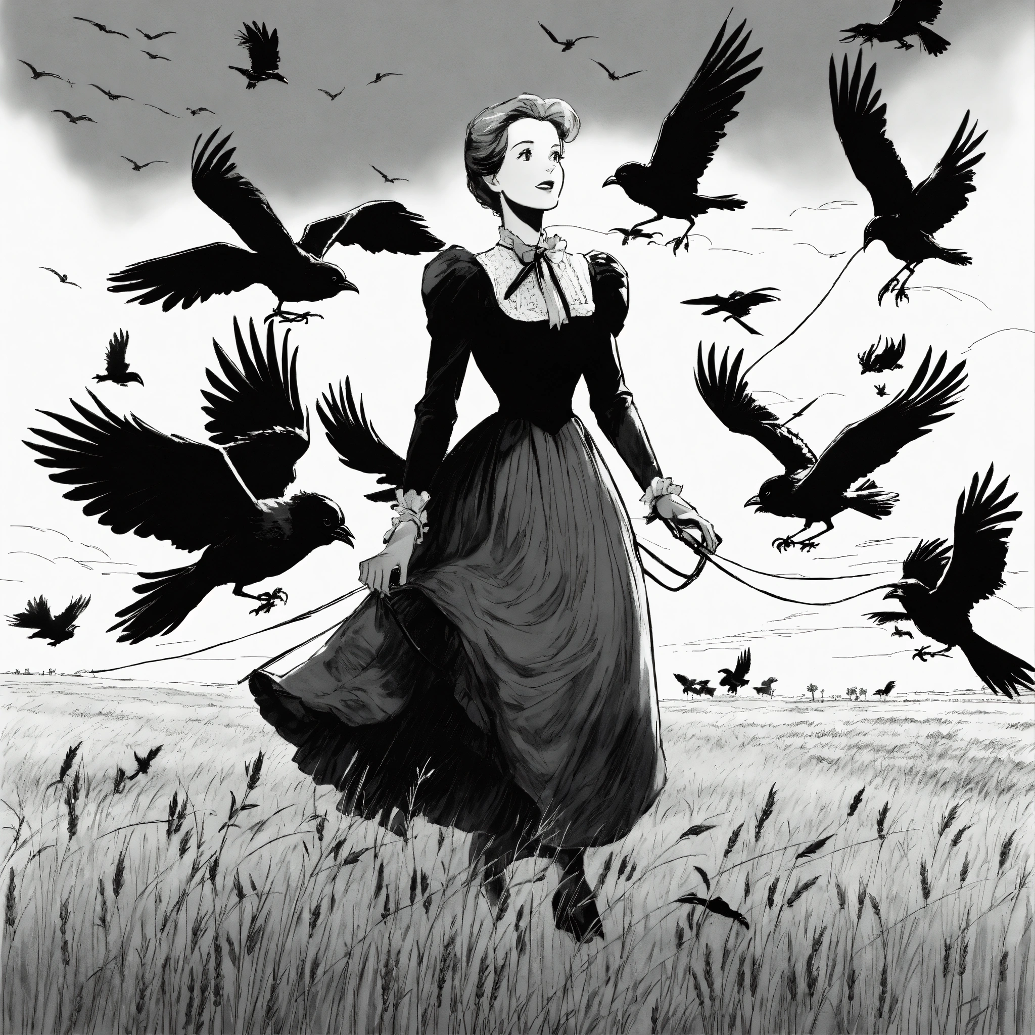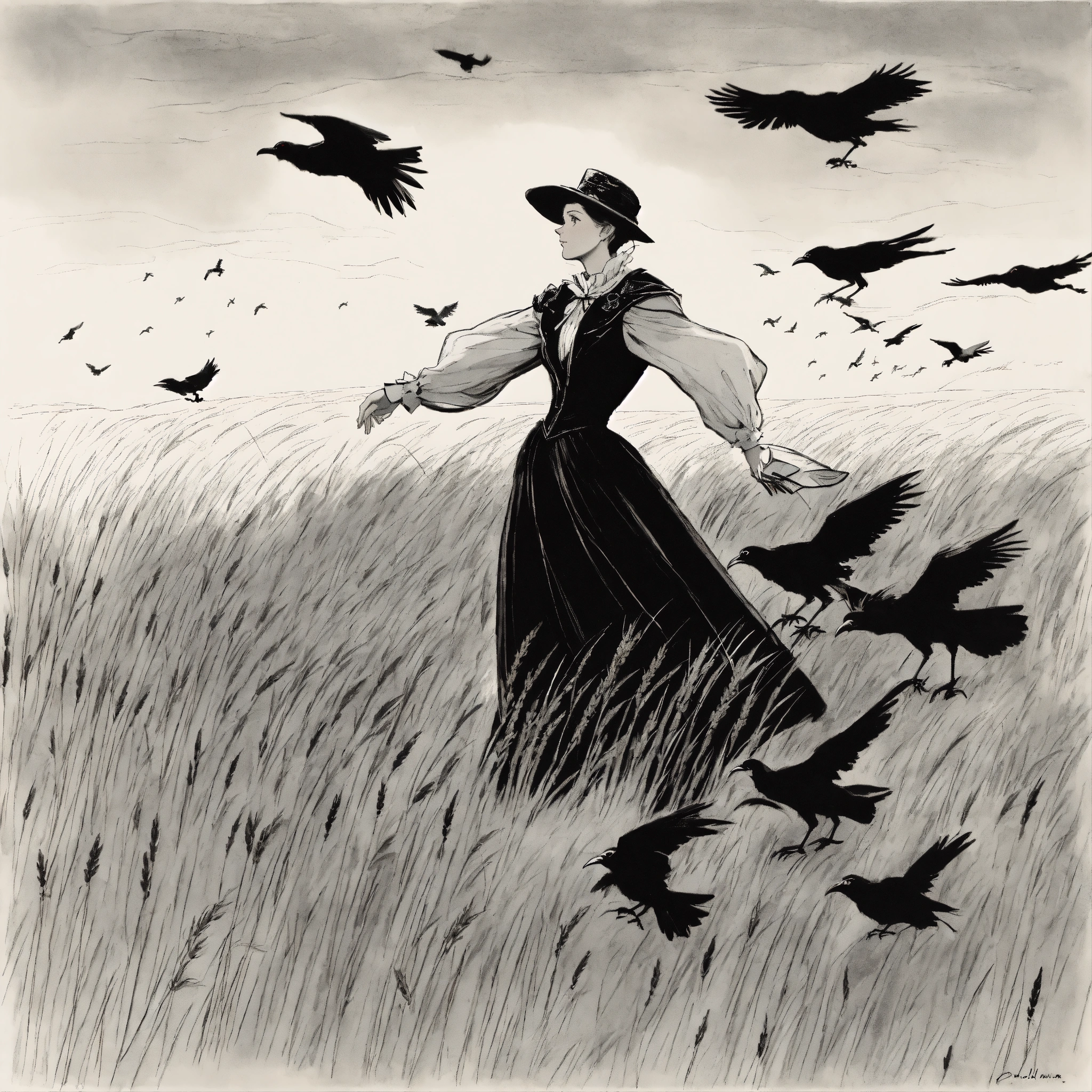 Julie andrews dressed in a victorian dress and mask lands on a telegraph cable next to a flock of crows, under a wheat field. black and white illustration by glen keane, disney 1990