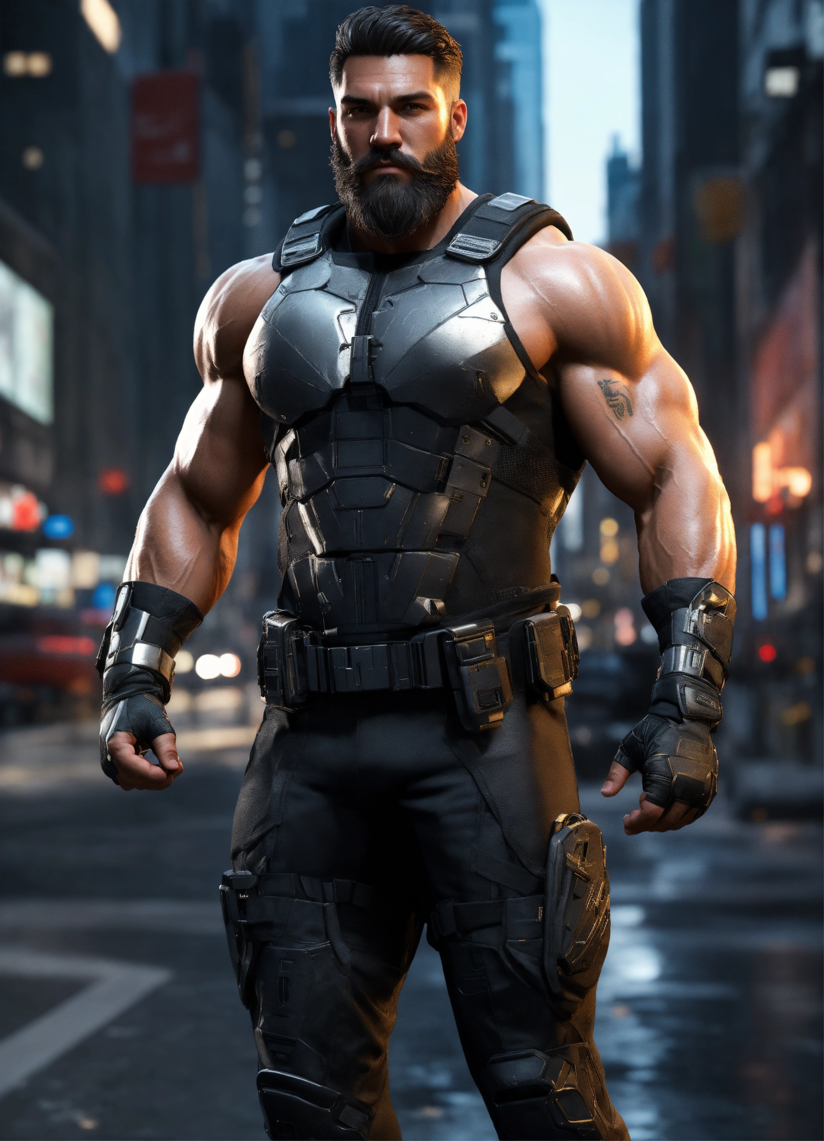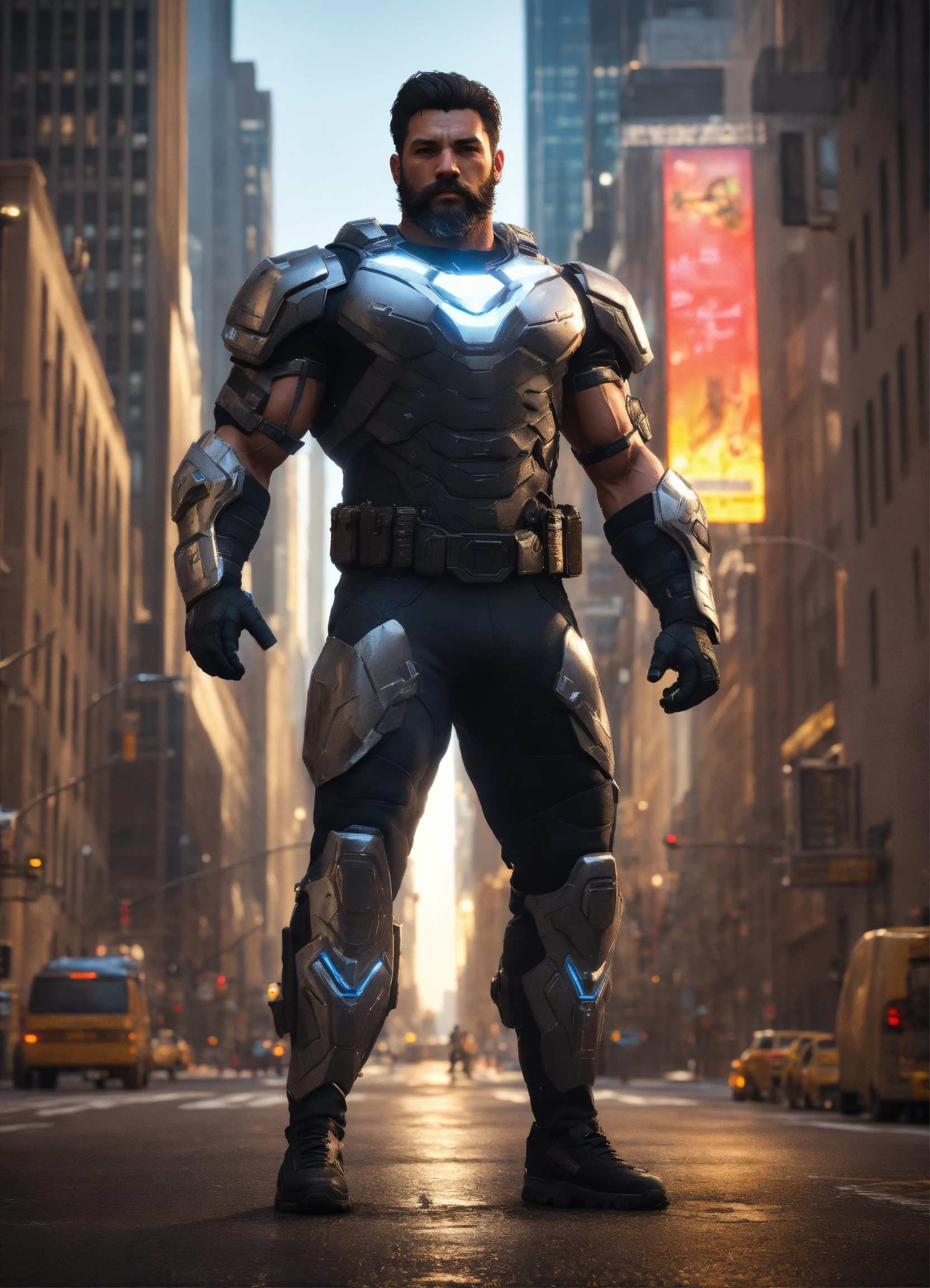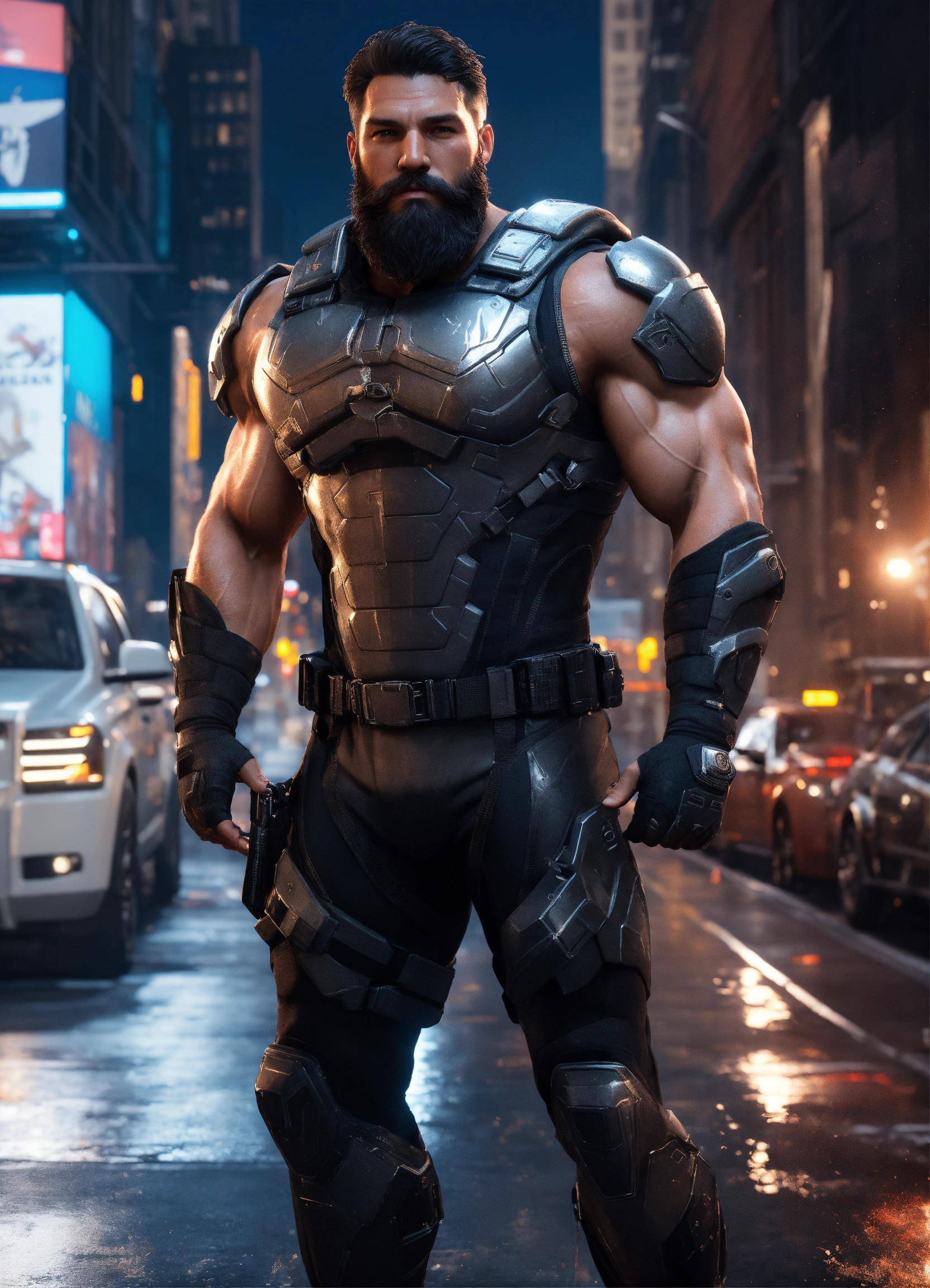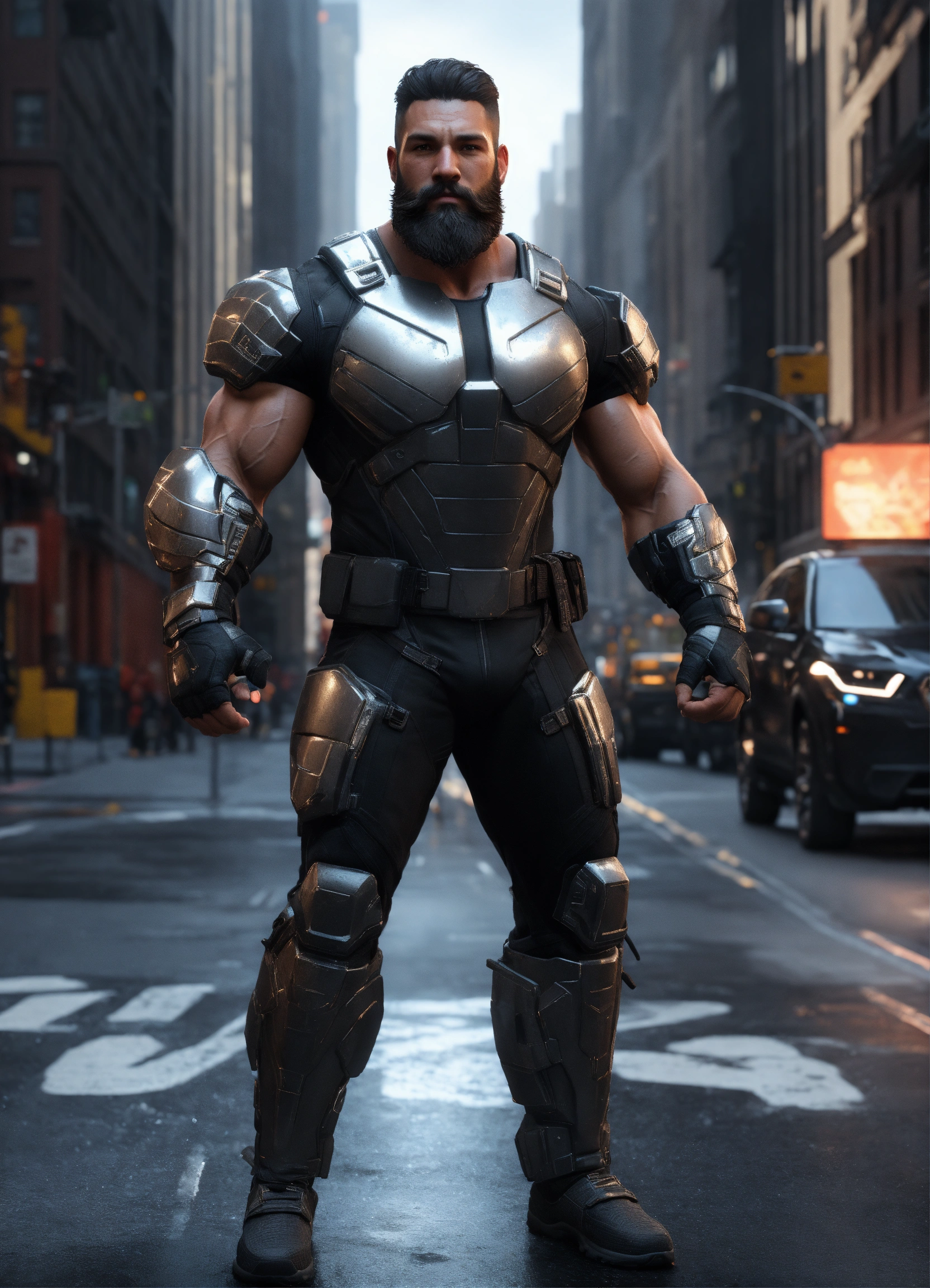 Full body of a handsome muscular white man with shoulder length dark hair and a cool beard, a huge muscular man, a modern hercules, strongest man alive, a very handsome athletic man, a hero wearing a black and silver super spy stealth suit, in new york city streets, full body, 8k resolution concept art portrait dynamic lighting hyperdetailed intricately detailed splash art trending on artstation unreal engine 5 volumetric lighting