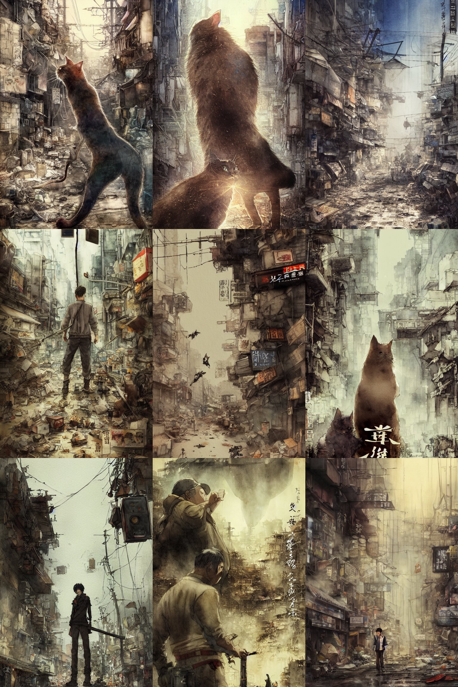 Incredible miyazaki, ruan jia movie poster, low angle, tatsuyuki tanaka, detailed watercolor, paper texture, movie scene, center frame backlit cat, catching mice in a deserted dusty shinjuku junk town, old pawn shop, bright sun bleached ground, spot light, pale beige sky, junk tv, texture, brown mud, dust, overhead wires, telephone pole, dusty, dry, pencil marks, hd, 4k, remaster, dynamic camera angle, deep 3 point perspective, fish eye, dynamic scene