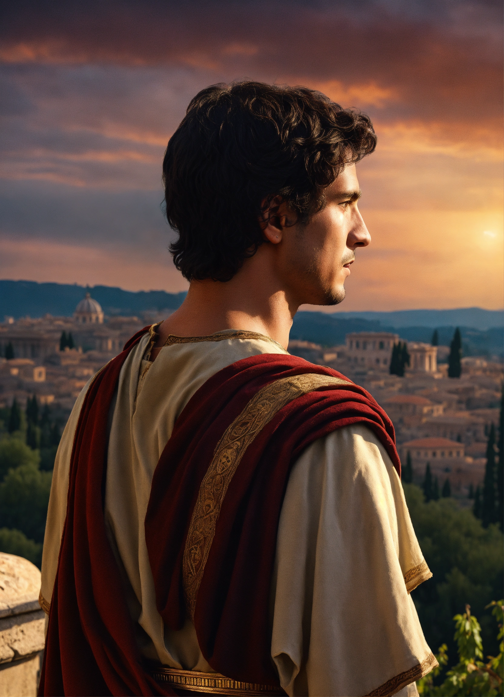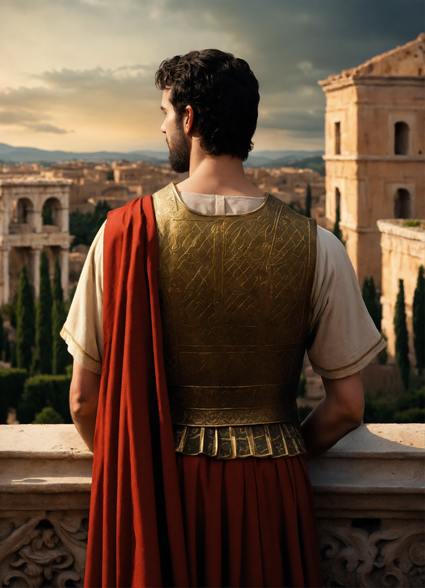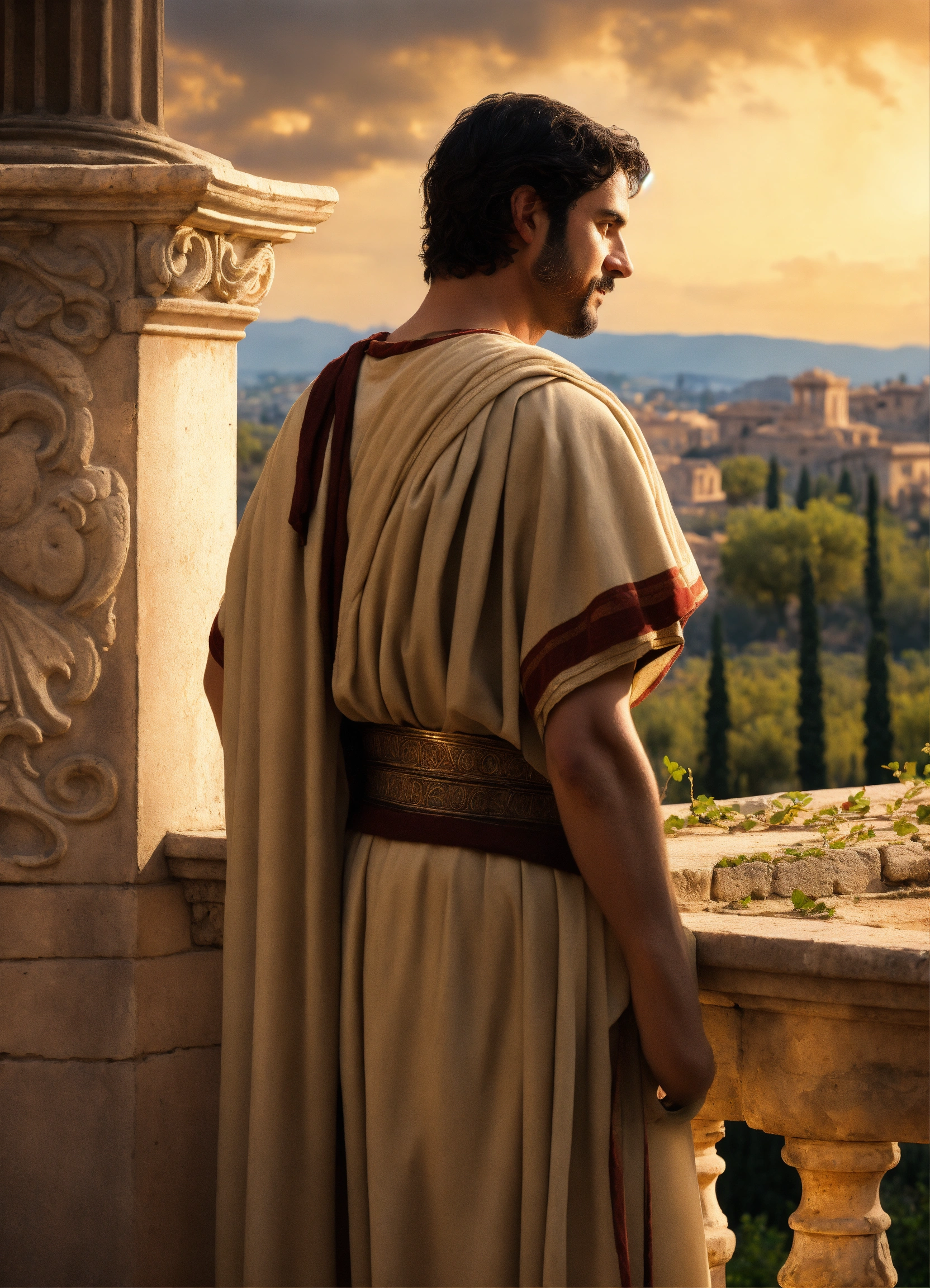 Close-up back view of a young, tall, noble, thin, slender, handsome, short hair, dark-haired roman tribune wearing simple historical roman clothes, light-colored light tunic, solemn, 50 years old, historically accurate, ancient rome, he is looking to the landscape of vineyards from the balcony of his rich and colored roman villa, detailed decor, photo realistic, hyper detailed, it is night. photo realistic, hyper detailed, and historically accurate to ancient rome. the sky is dark and cloudy. noble, calm, hedonist, amused. book cover.