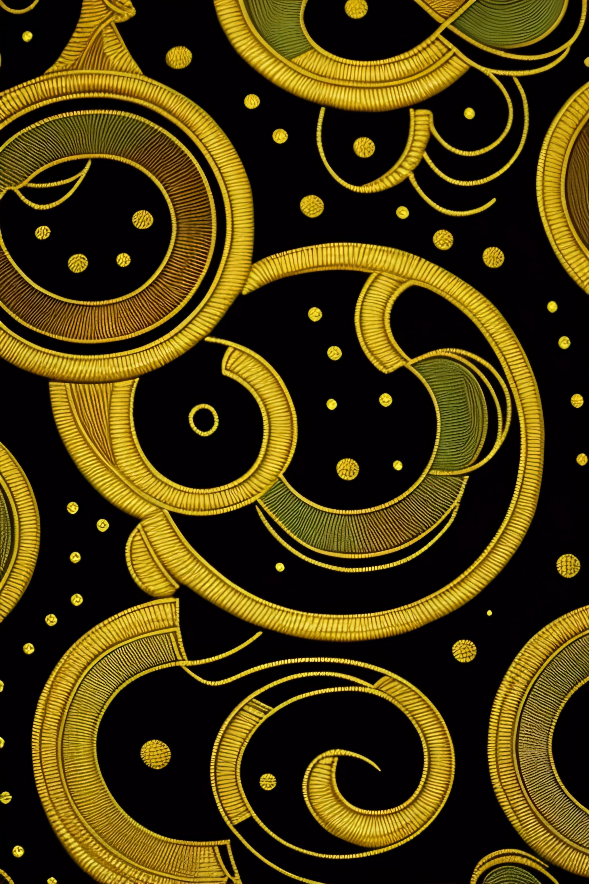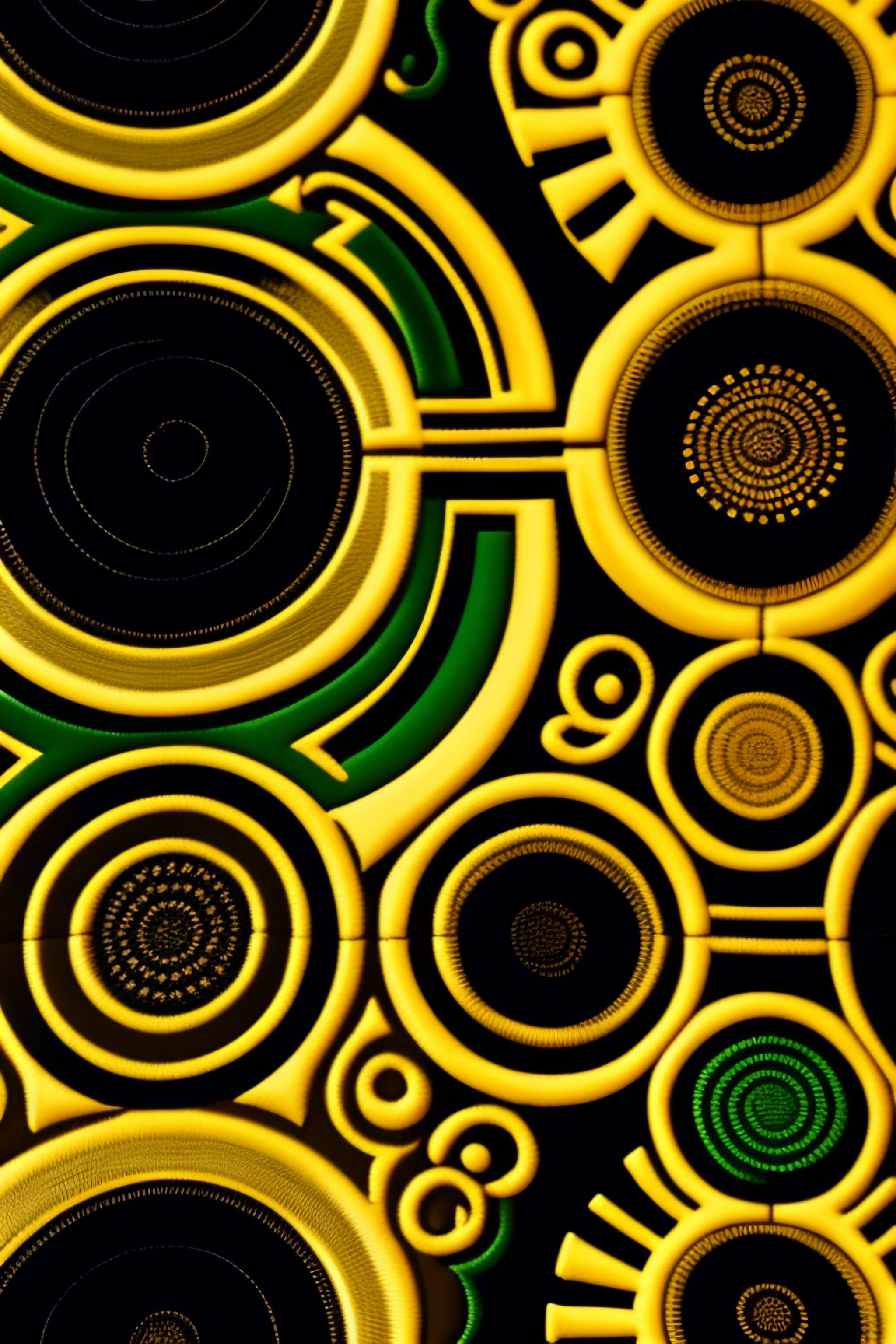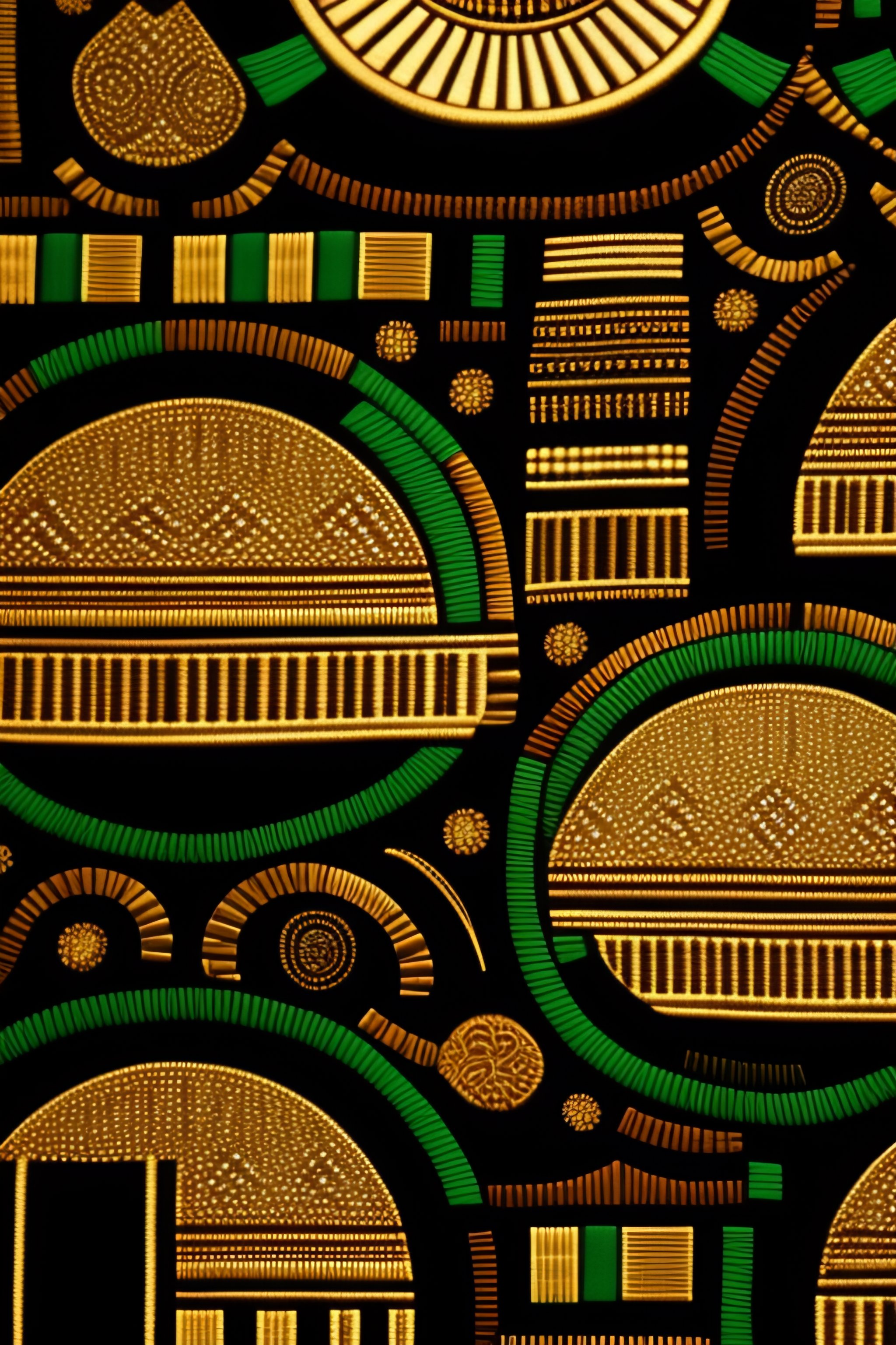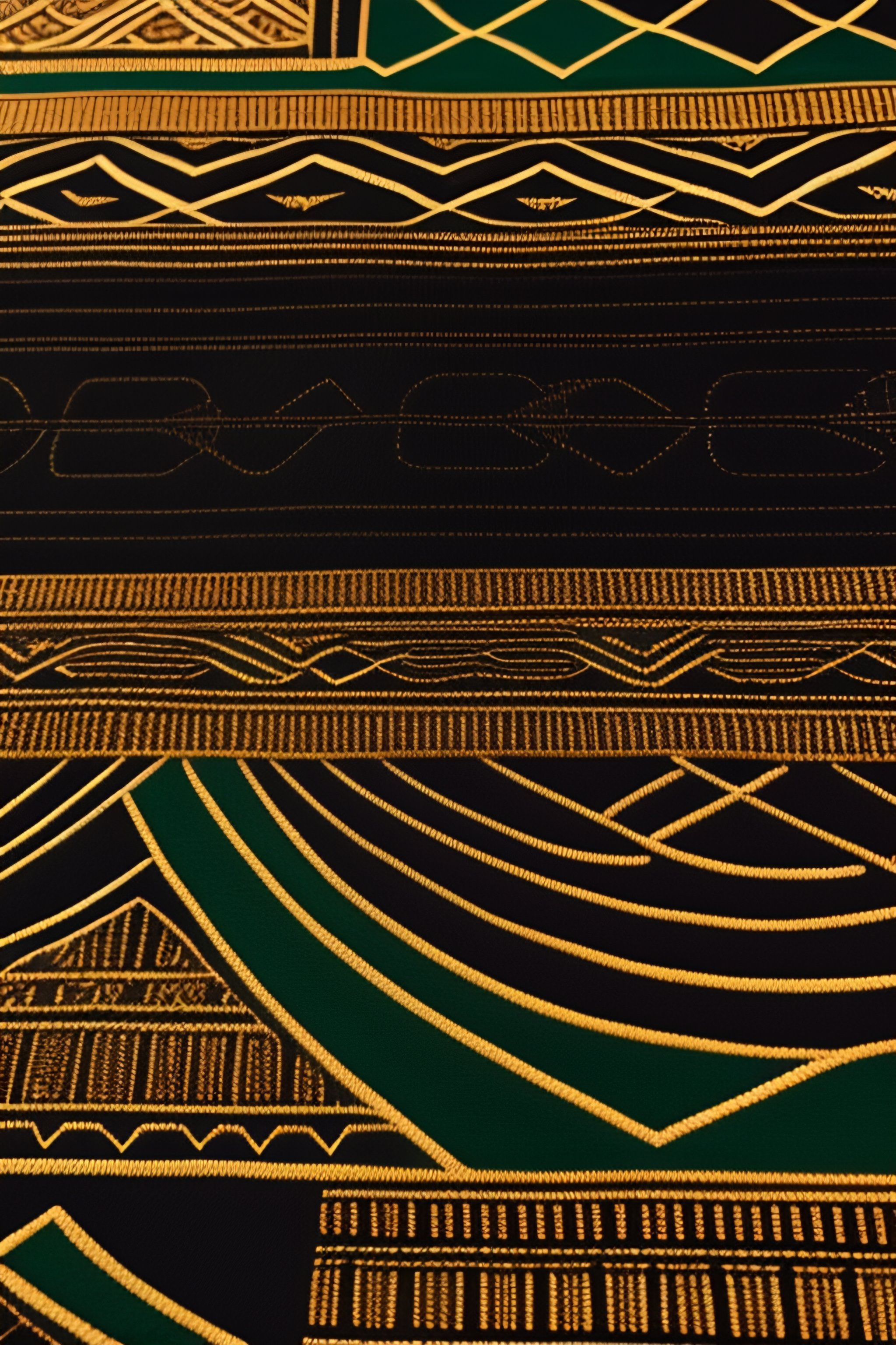 Image of african fabric with gold, black, green, ankara hieroglyphics print, astonishing detail, smooth lines