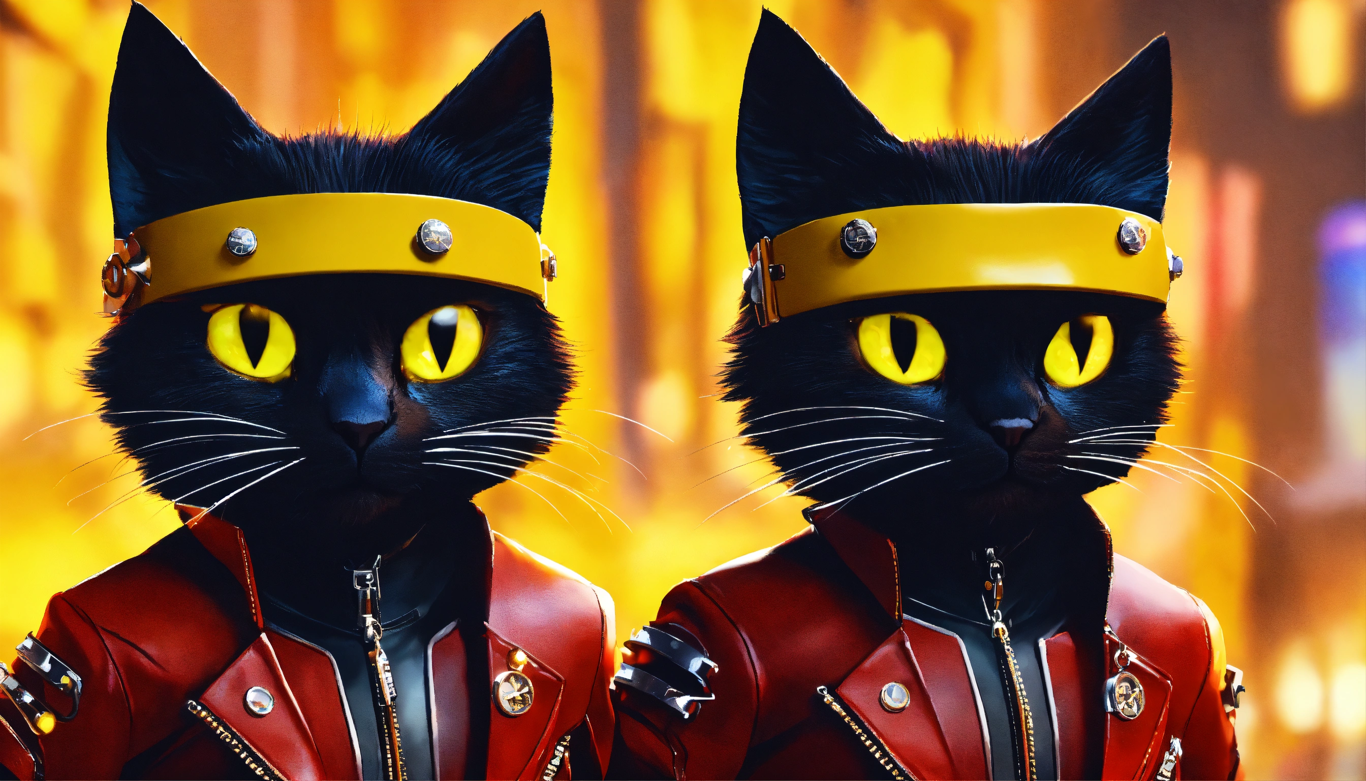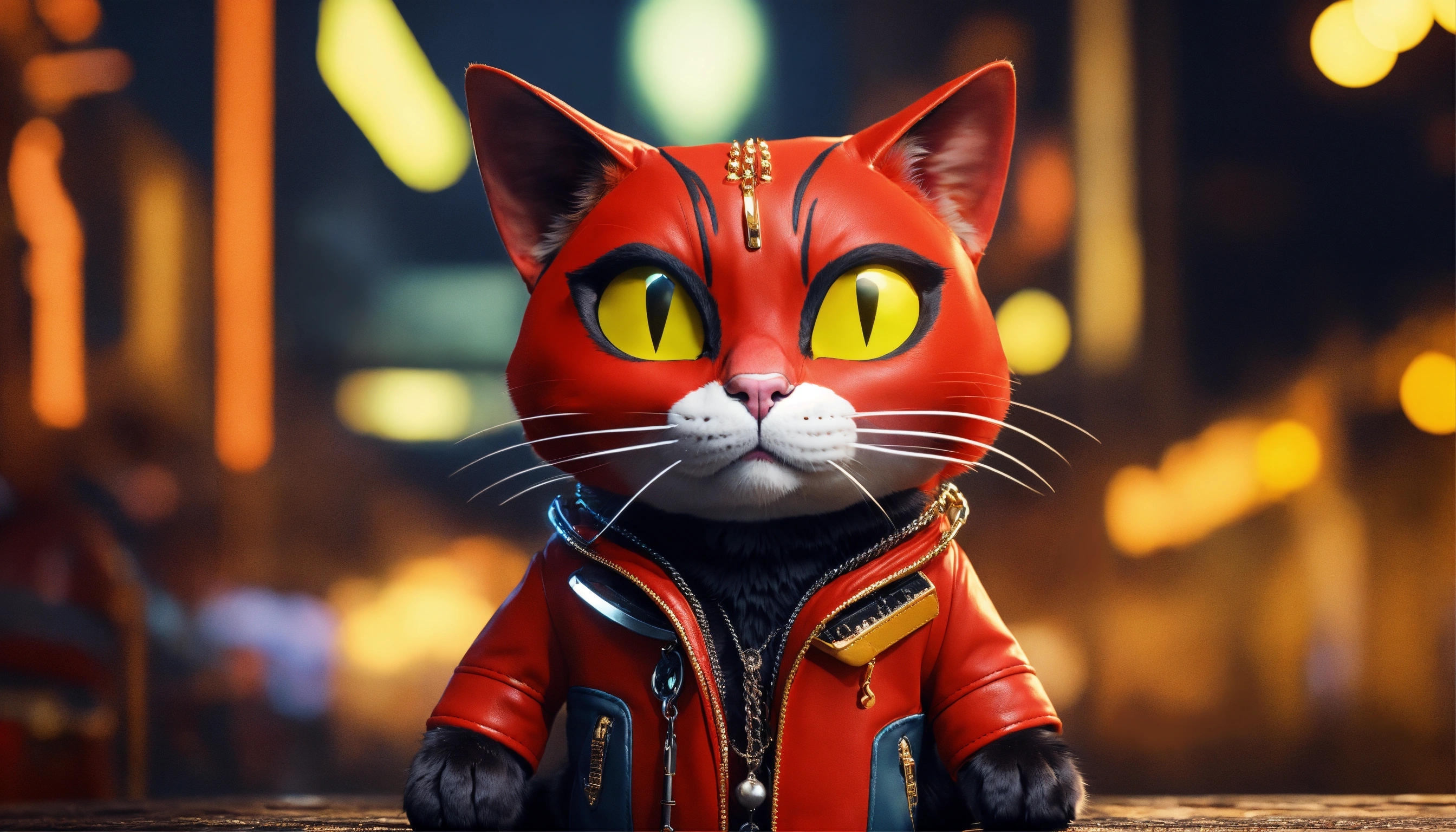 Create an image of a city-dwelling cat that roams the streets at night. this cat has sleek black fur with white stripes, piercing, glowing yellow eyes. it's dressed in a striking red leather jacket adorned with metal studs. the cat also wears chains around its neck, a luxurious wristwatch on its right forelimb, and sports an earring in one ear. this feline character is sly, mischievous, cunning, and irreverent. the image should be in 4k resolution, cinematic in style, with a minimalist, flat background. it should resemble a flat vector art illustration, with an unreal 4d motor, akin to a character from a counterfeit video game.