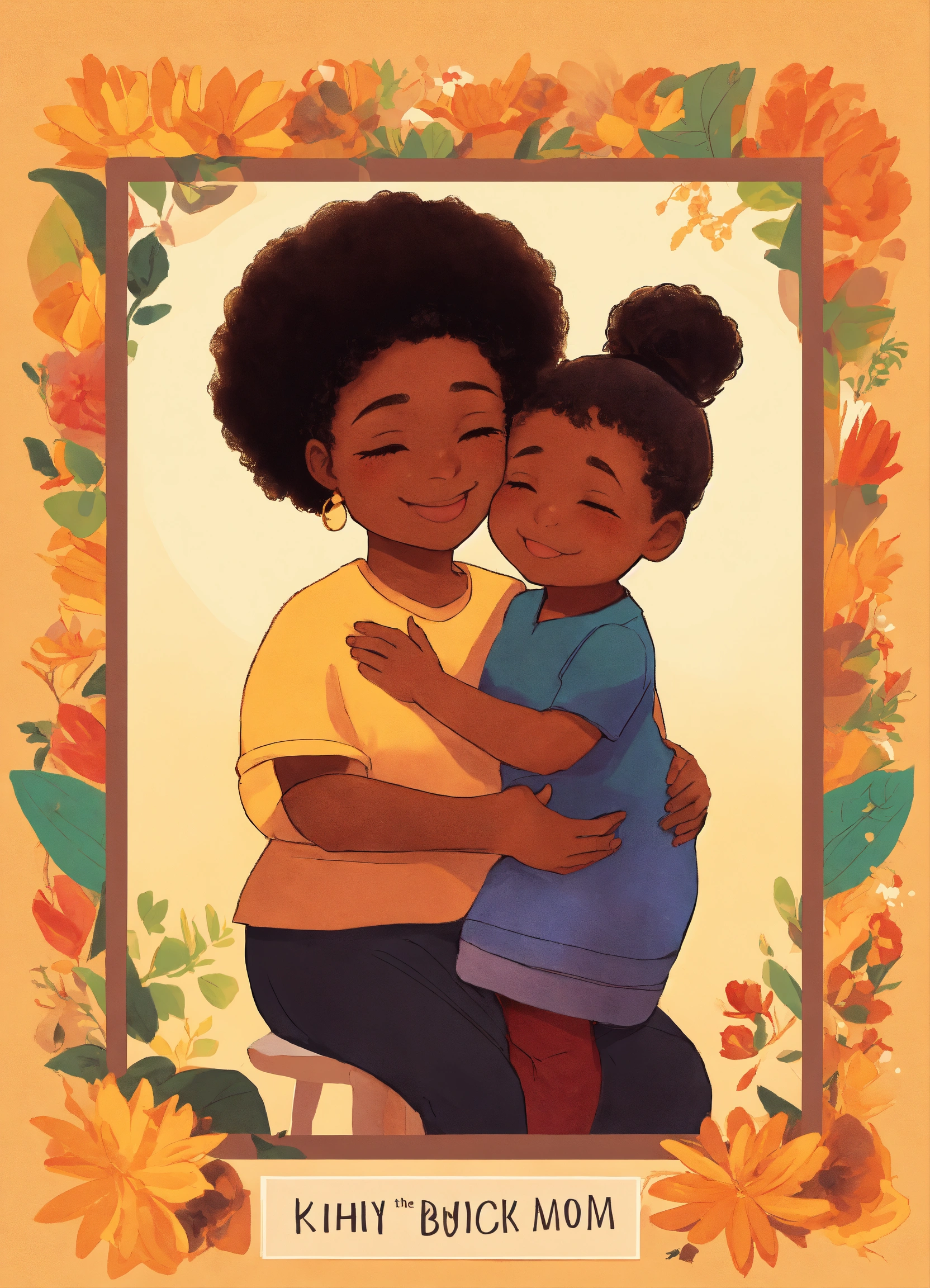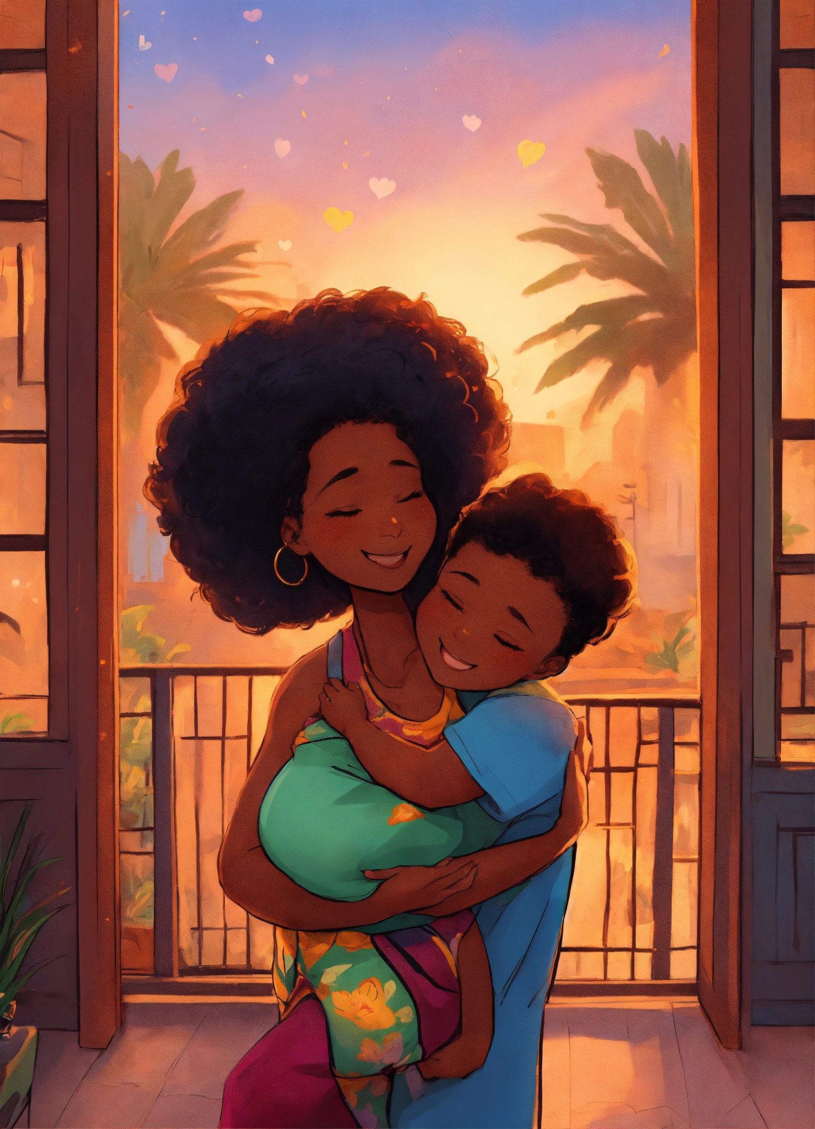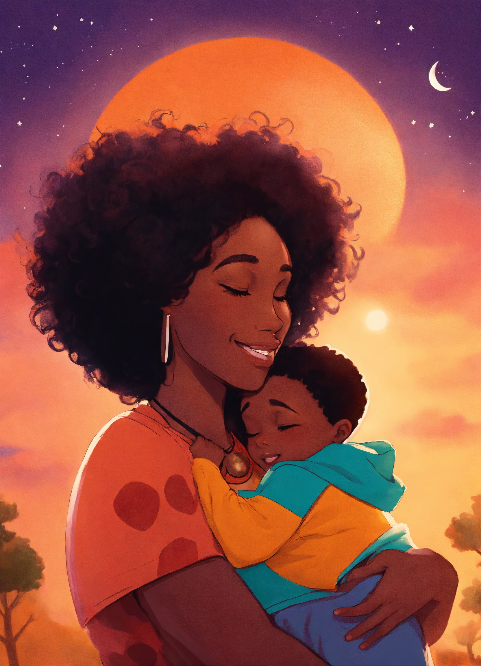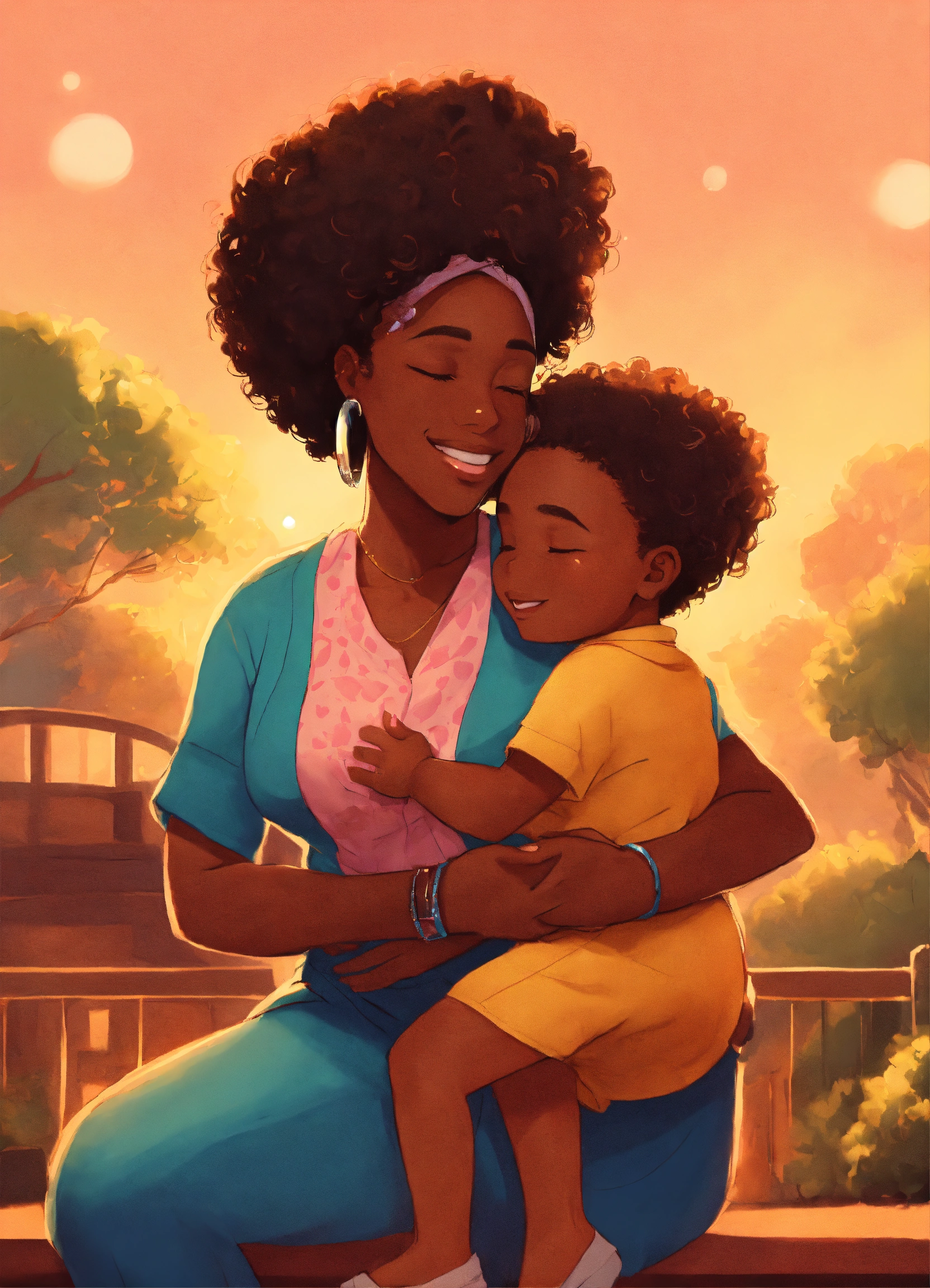 Cartoon, colorful, illustrate a black toddler boy and black mom, show khyaire and his mom sharing a heartfelt hug. emphasize the strength of their bond and love. create a heartwarming and dreamy atmosphere.