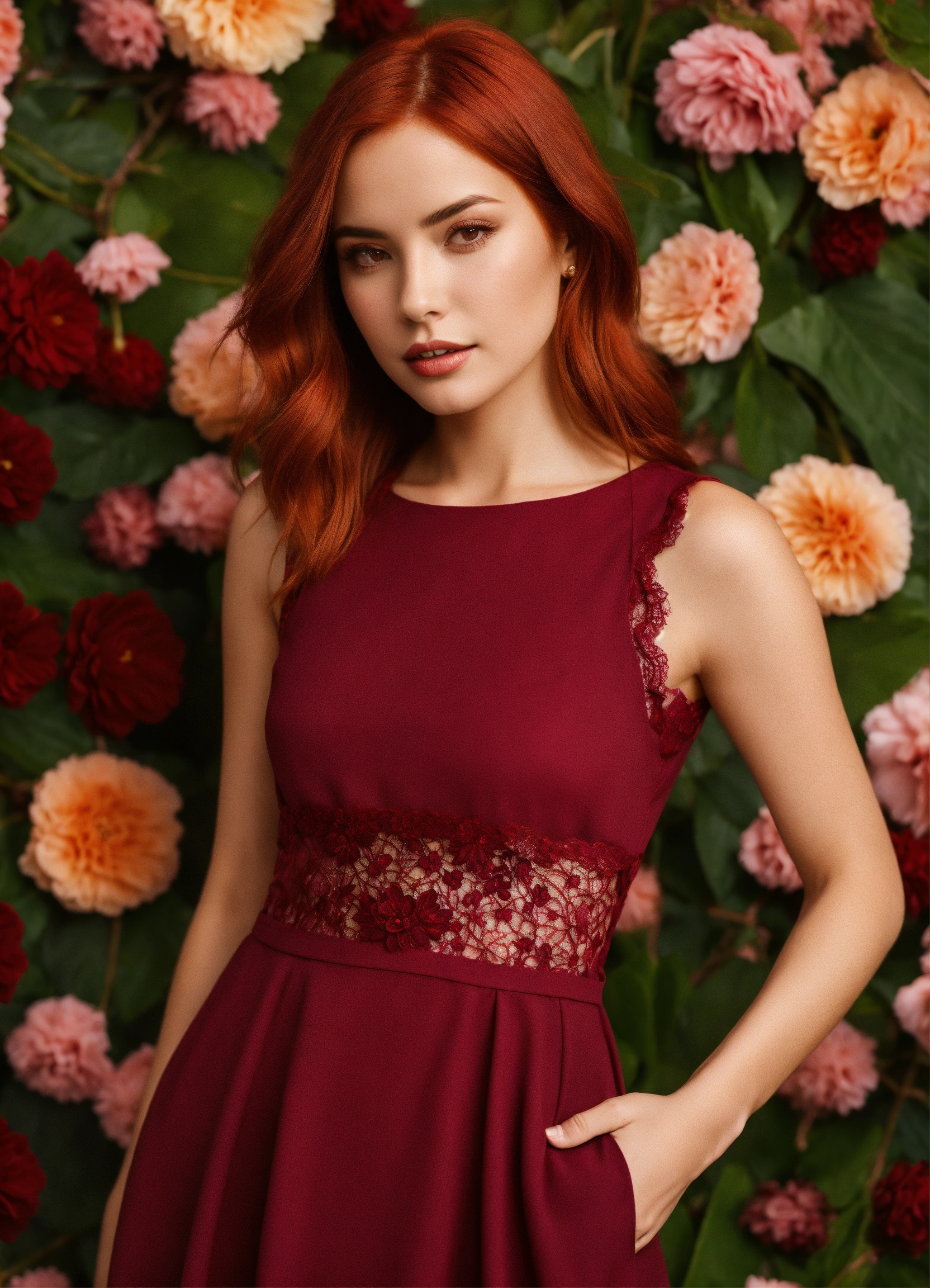 wearing burgundy dress and lace top