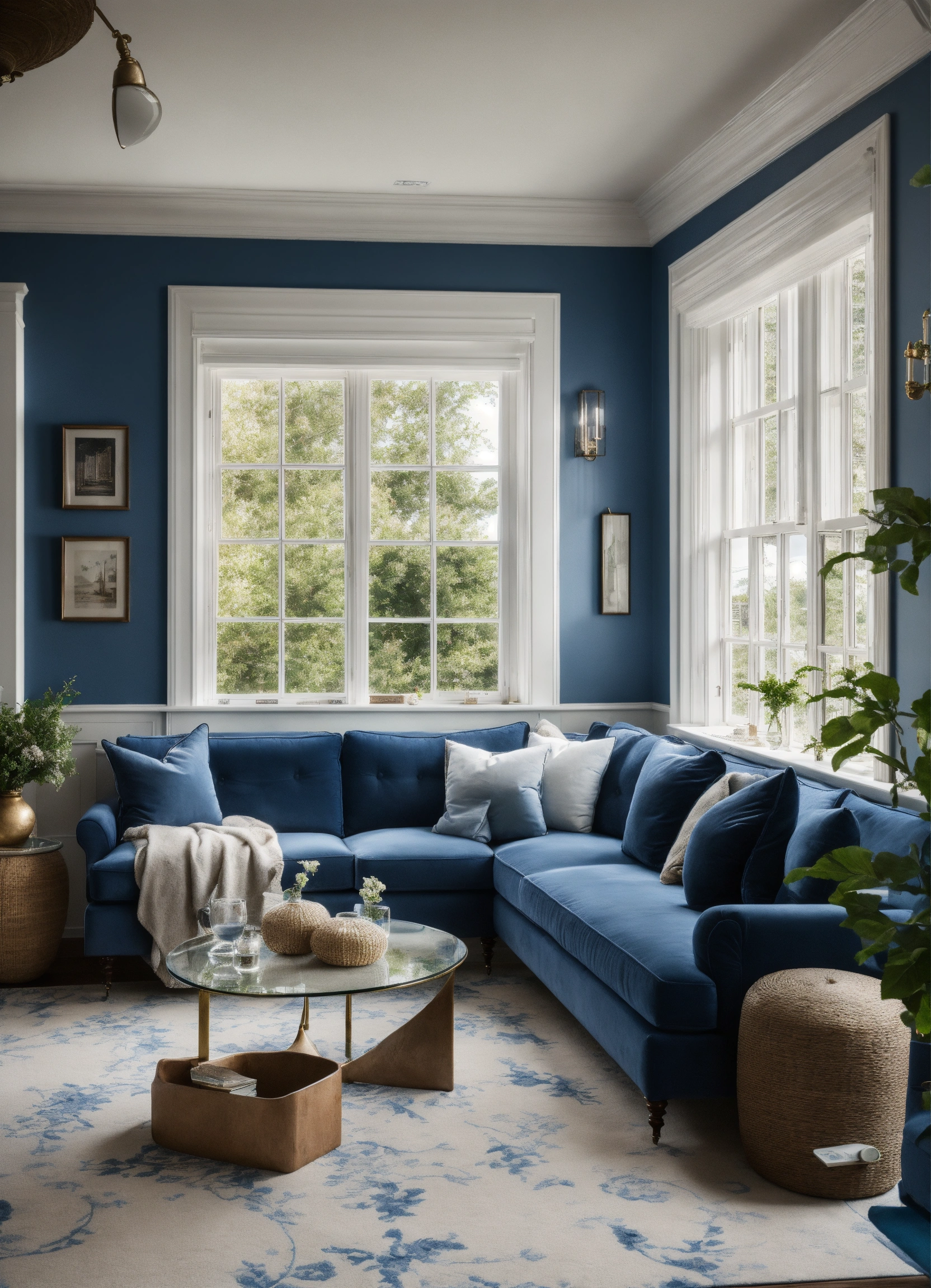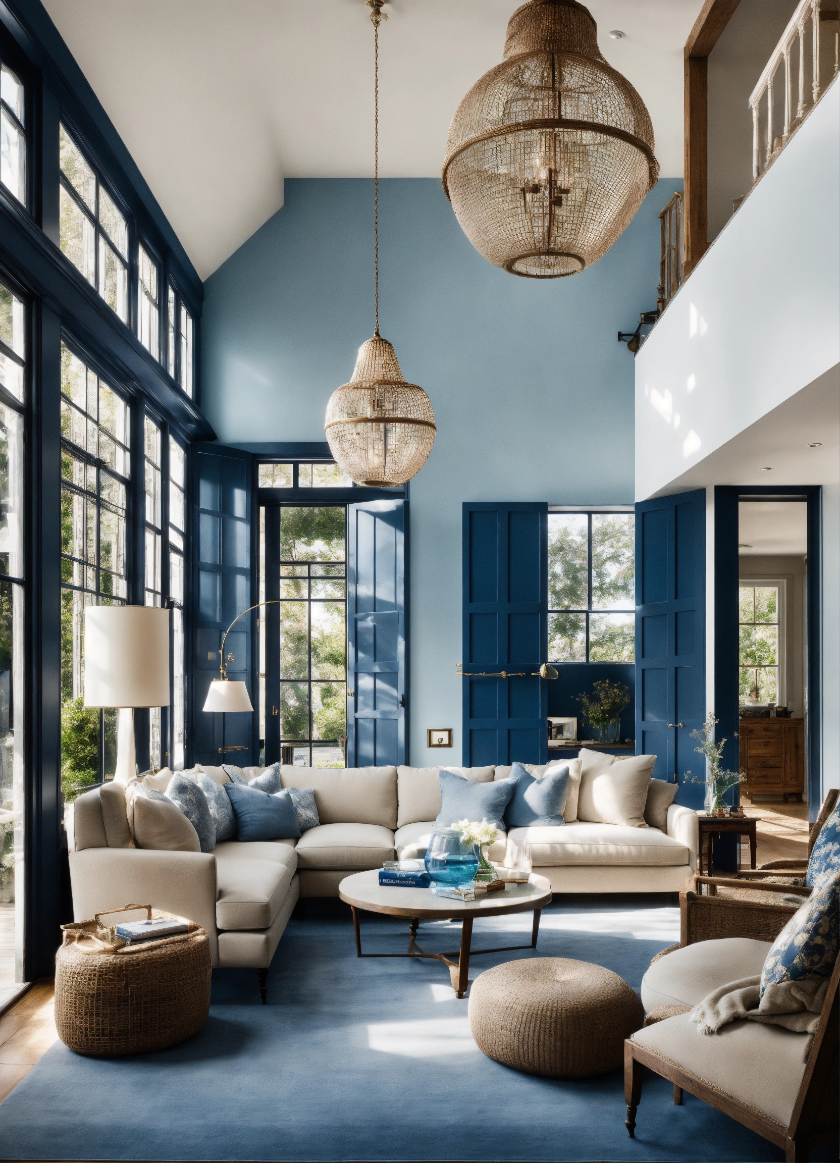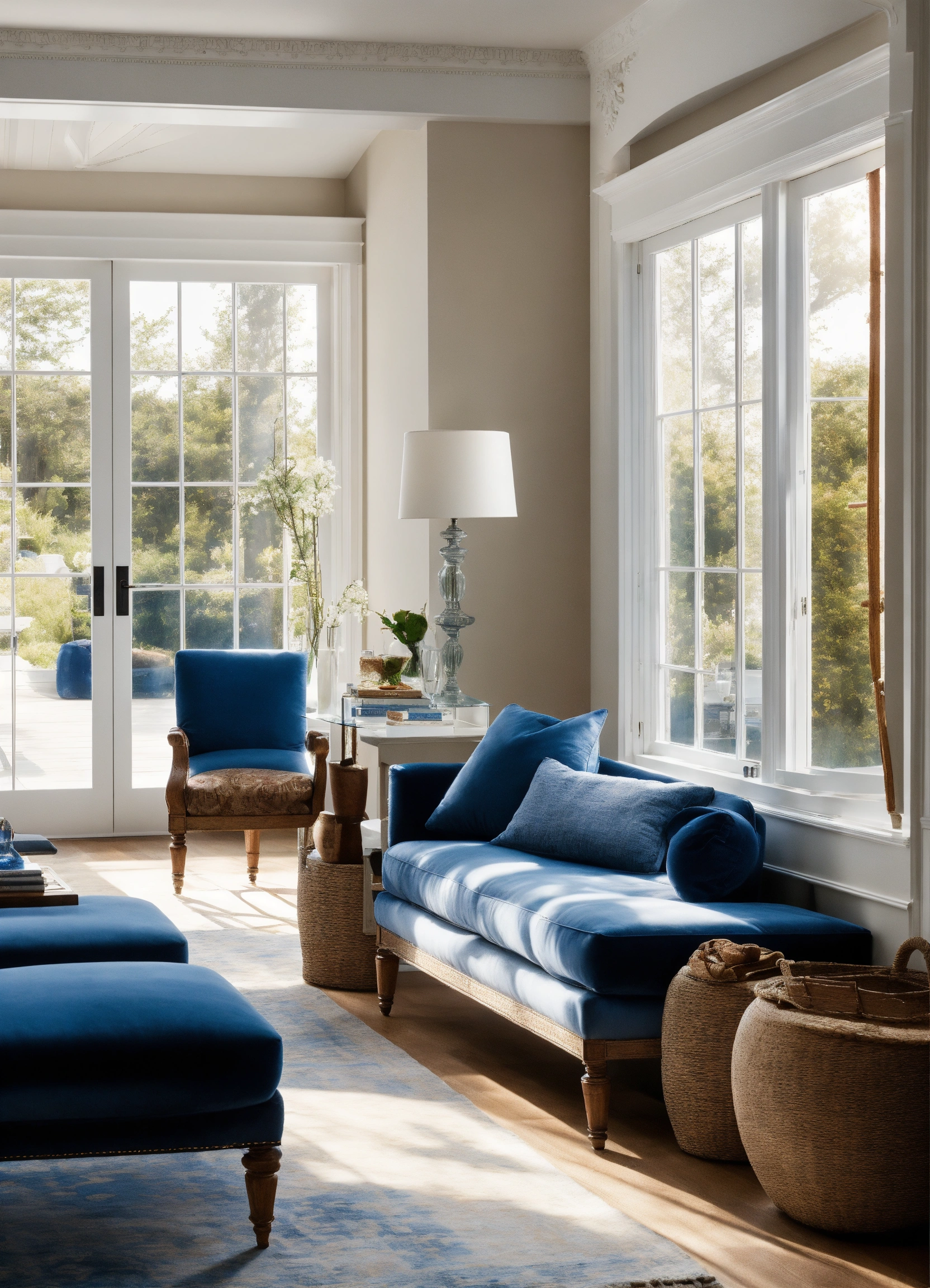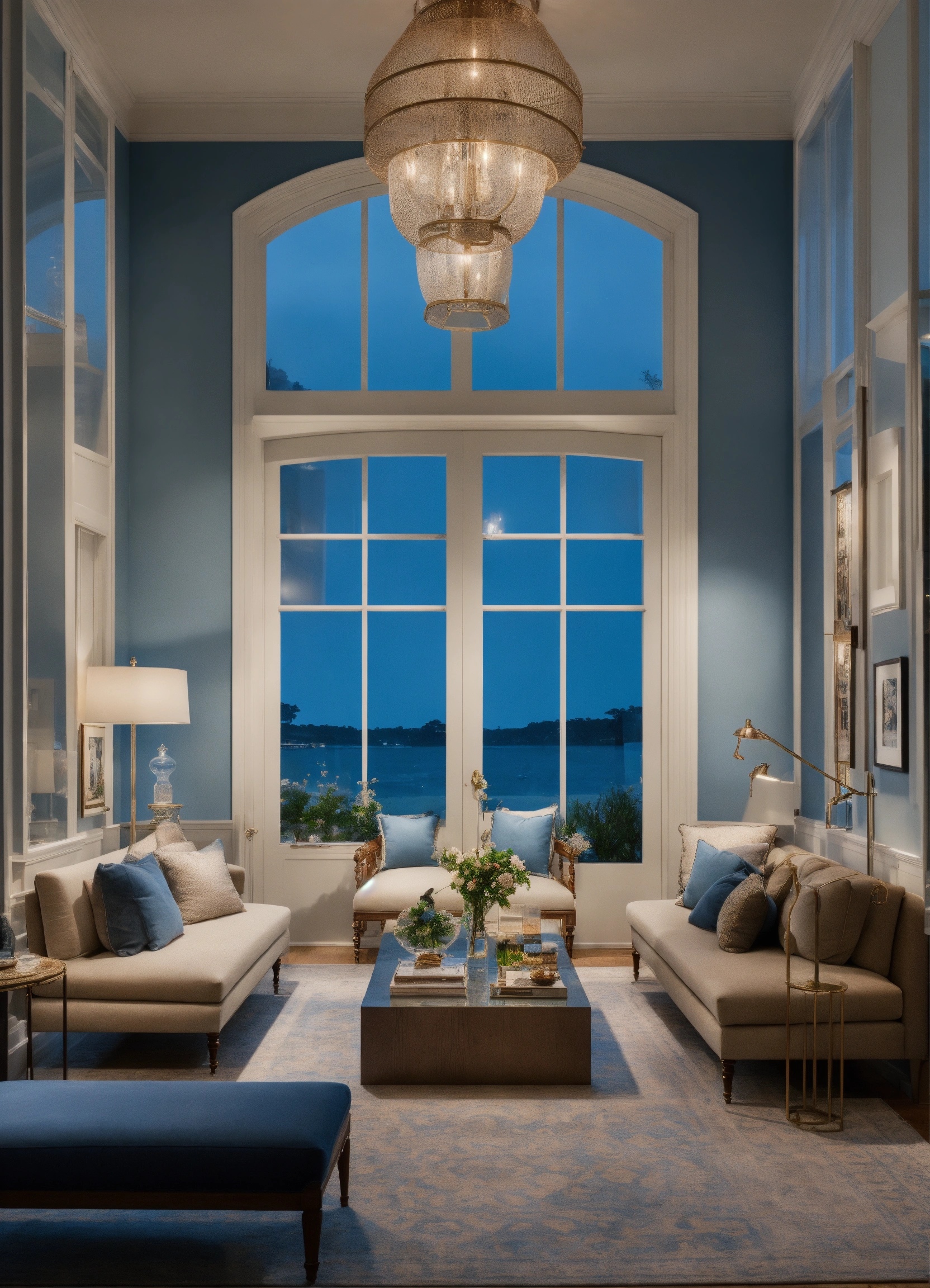 Interior architectural hi - res editorial award photo living room with a small glass wall, victorian coastal villa inspired by the old town, in hamptons, white and blue toned, warm lighting, detailed, high resolution, photorrealistic, shot with a sony alpha a7r iv with 35mm f/ 2. 8 gm lens
