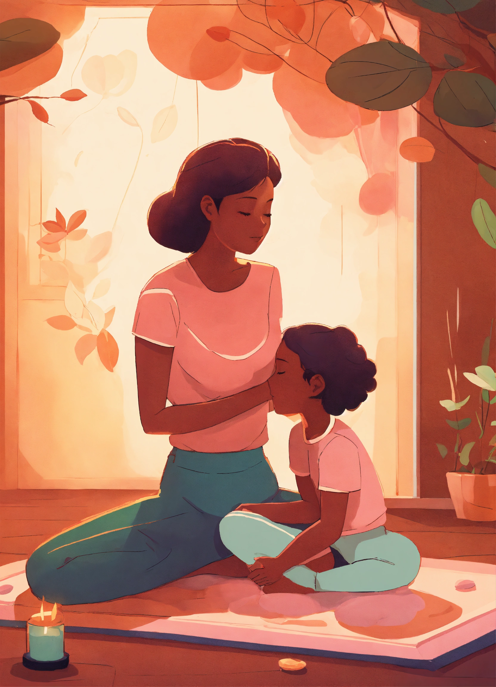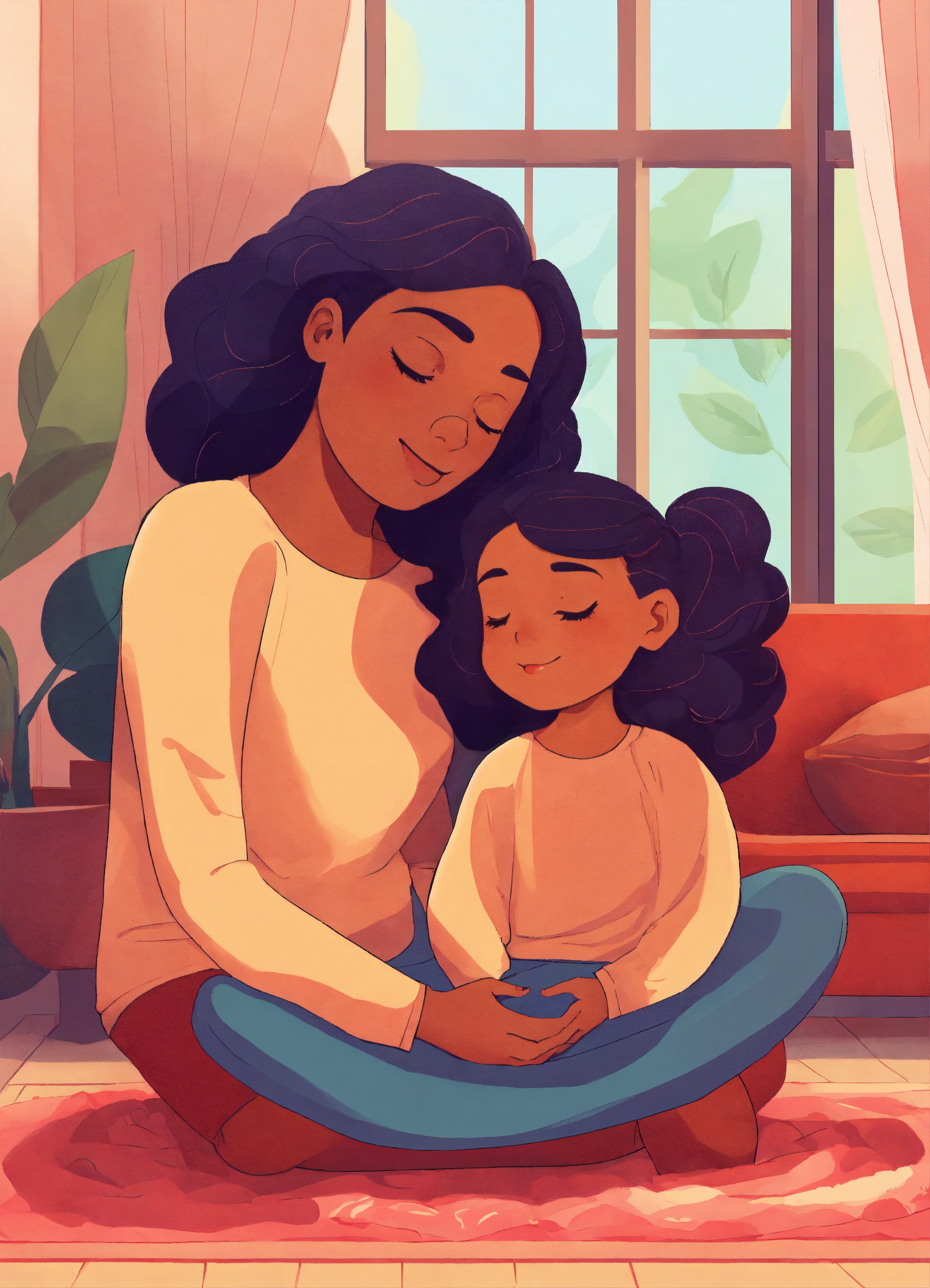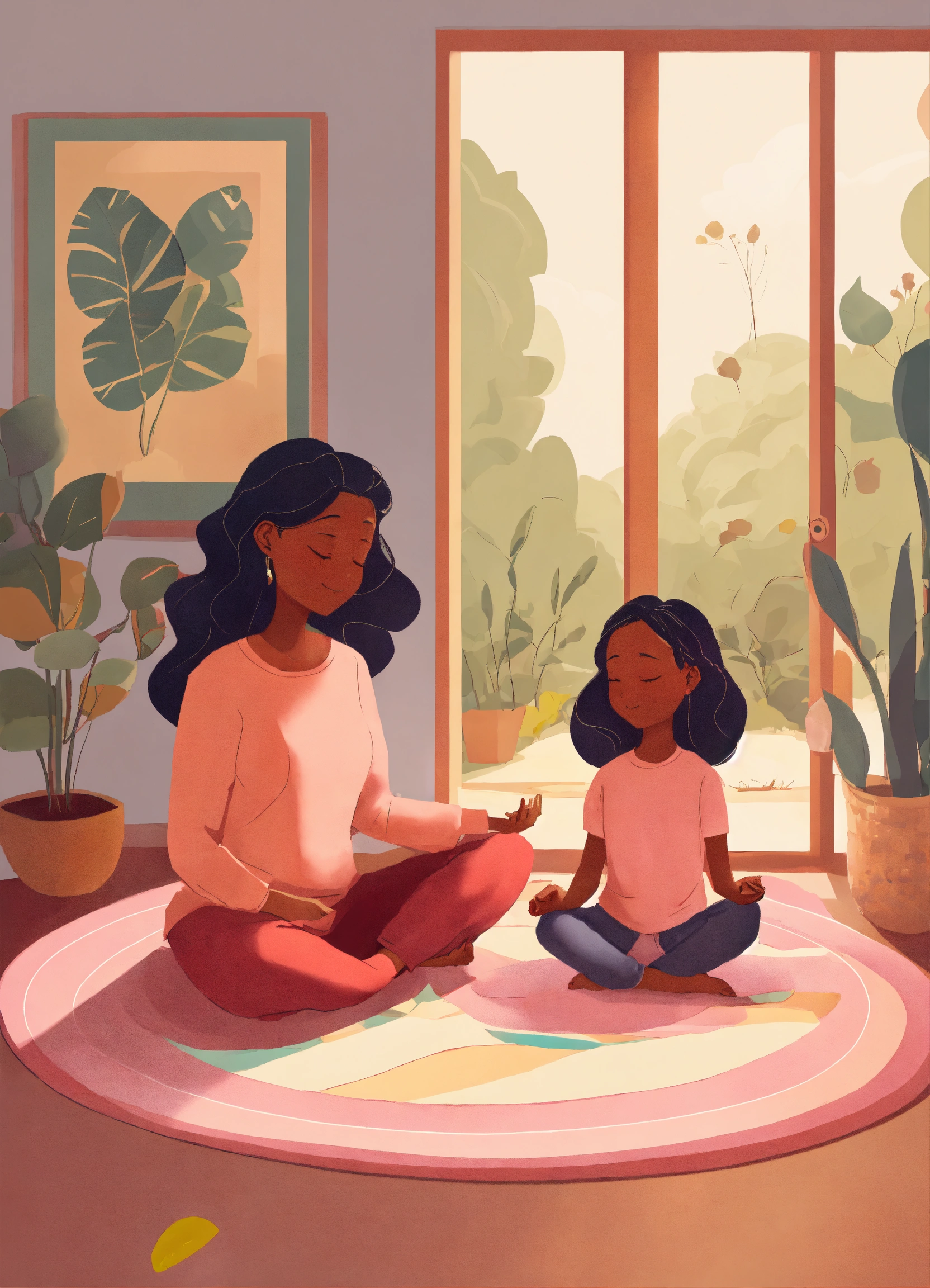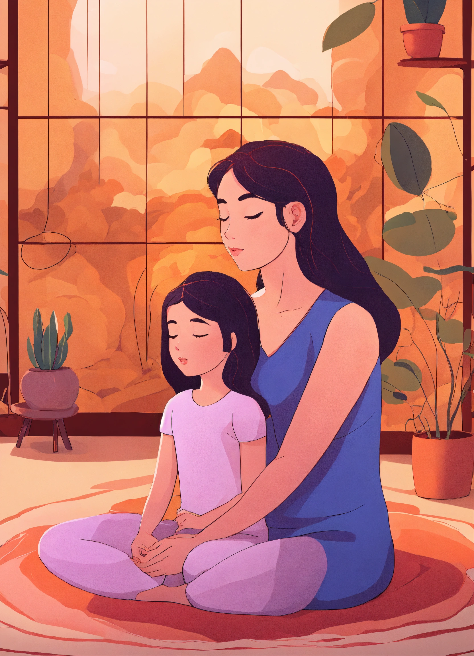 A cartoon image of a mother and daughter practicing mindfulness together to relax