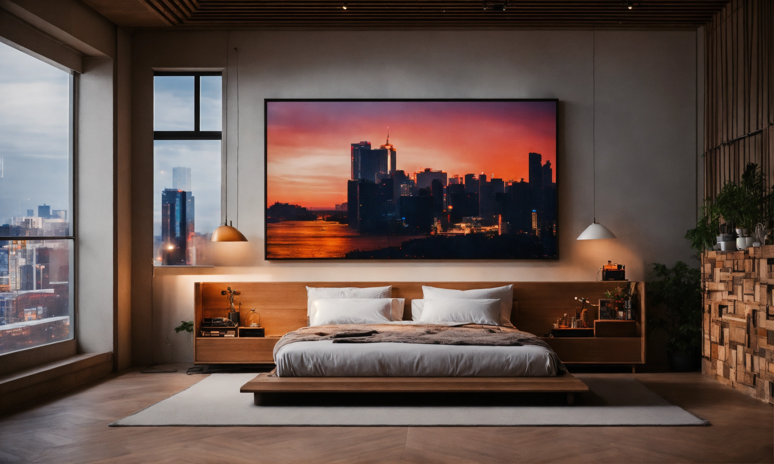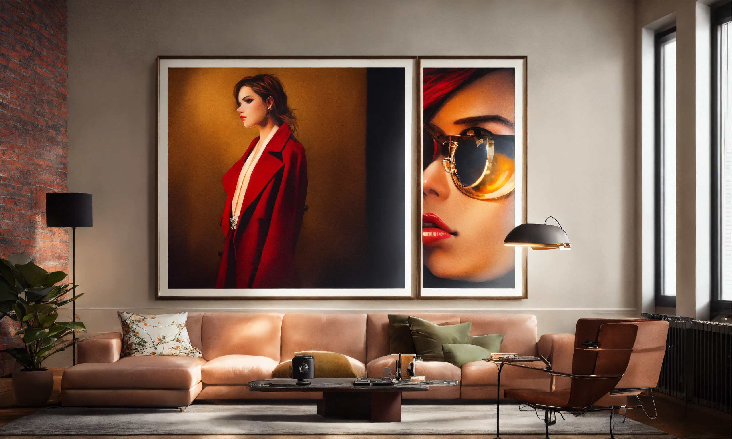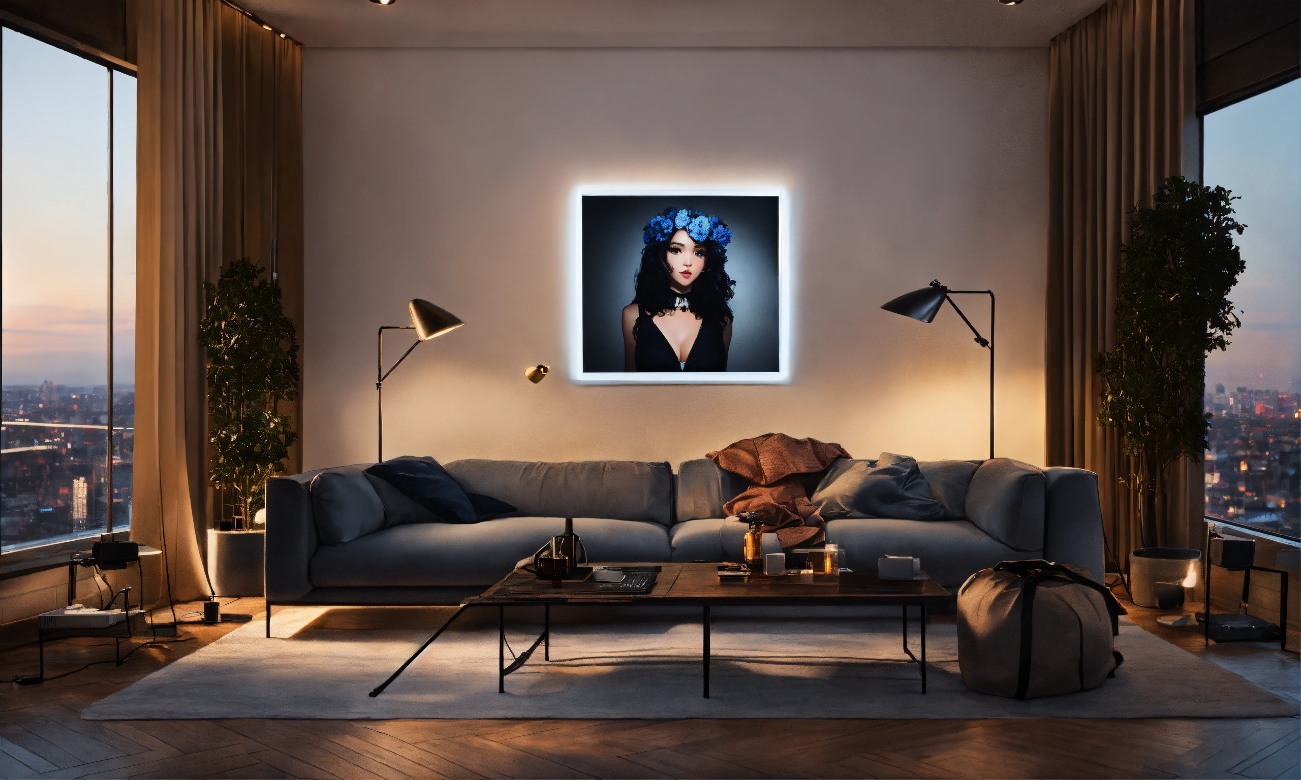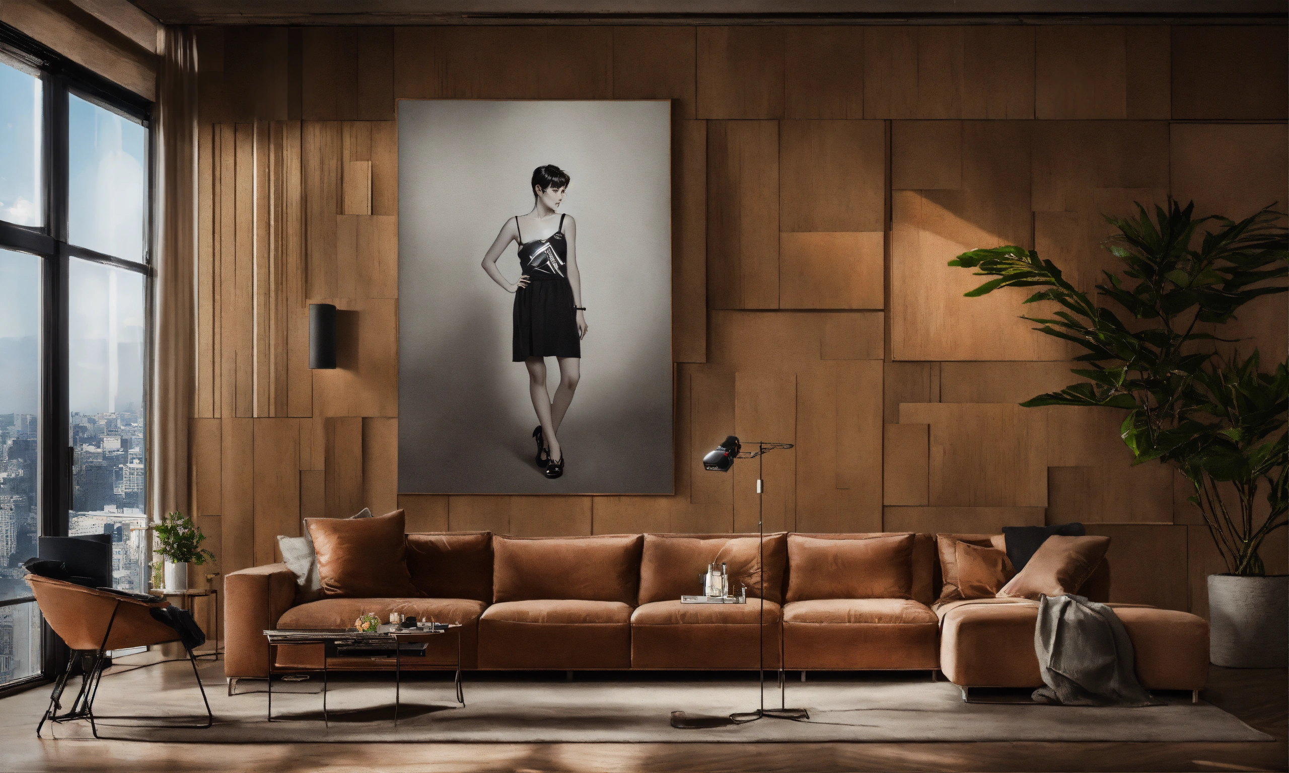 Create a wall art size guide photograph in a modern penthouse, shot on a leica m10, illuminated by fashion photography lighting, music recording studio, close-up