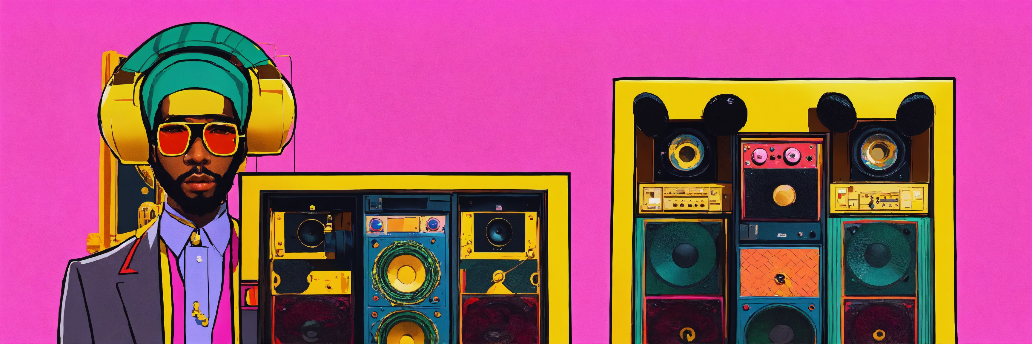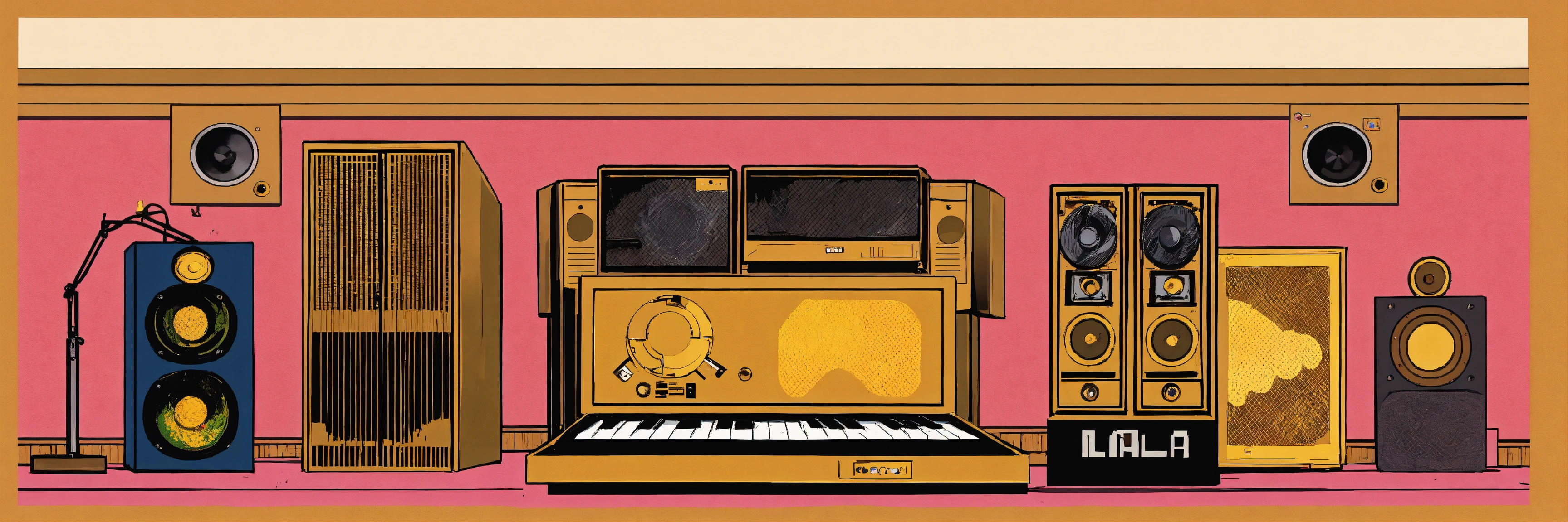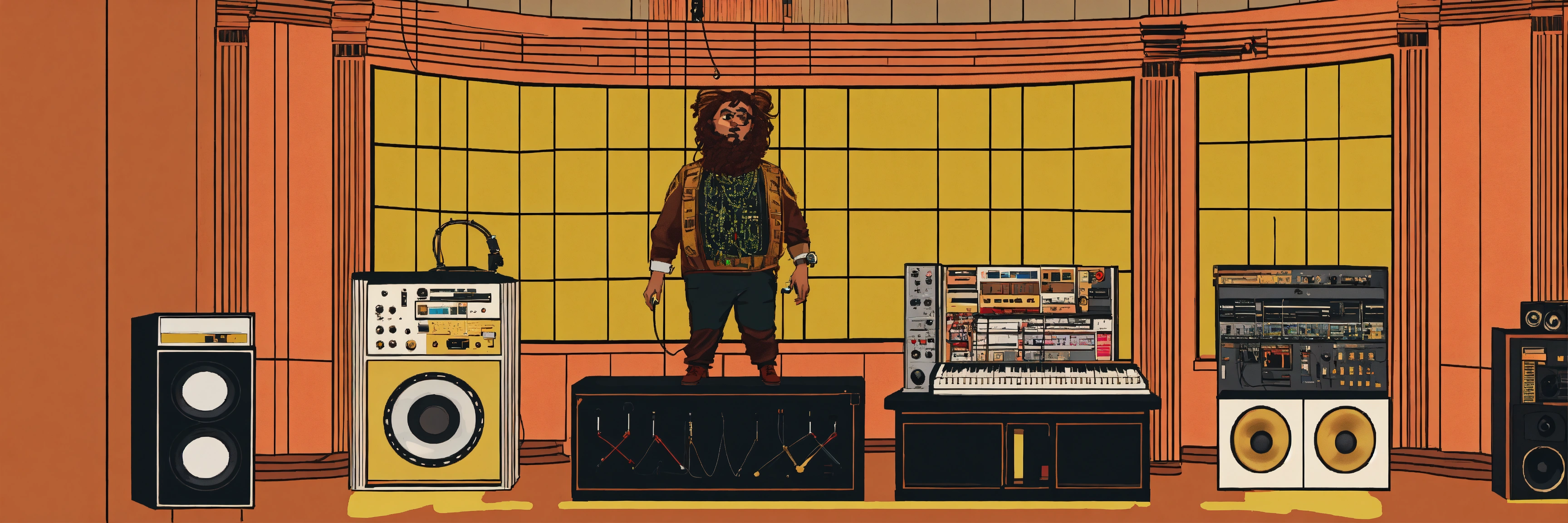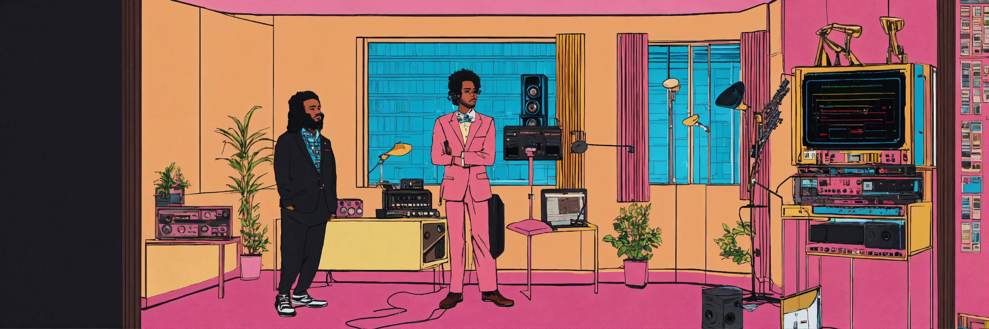Generate an image of wes anderson style artwork of a 2 music producer's one black with a computer and the other a columbian with a heavy body set with a saxophone creating music with large speakers in a room with the words mac & los