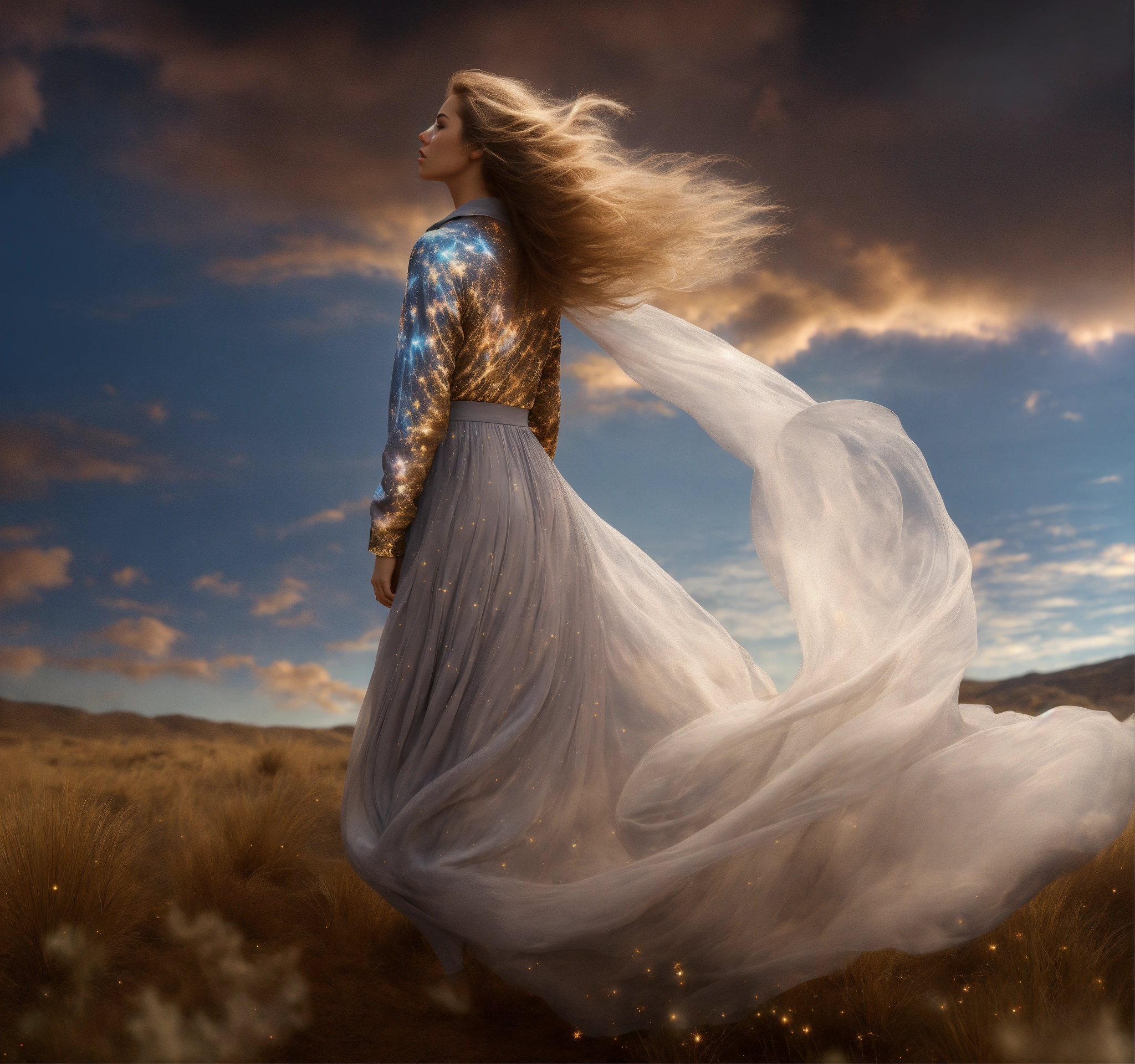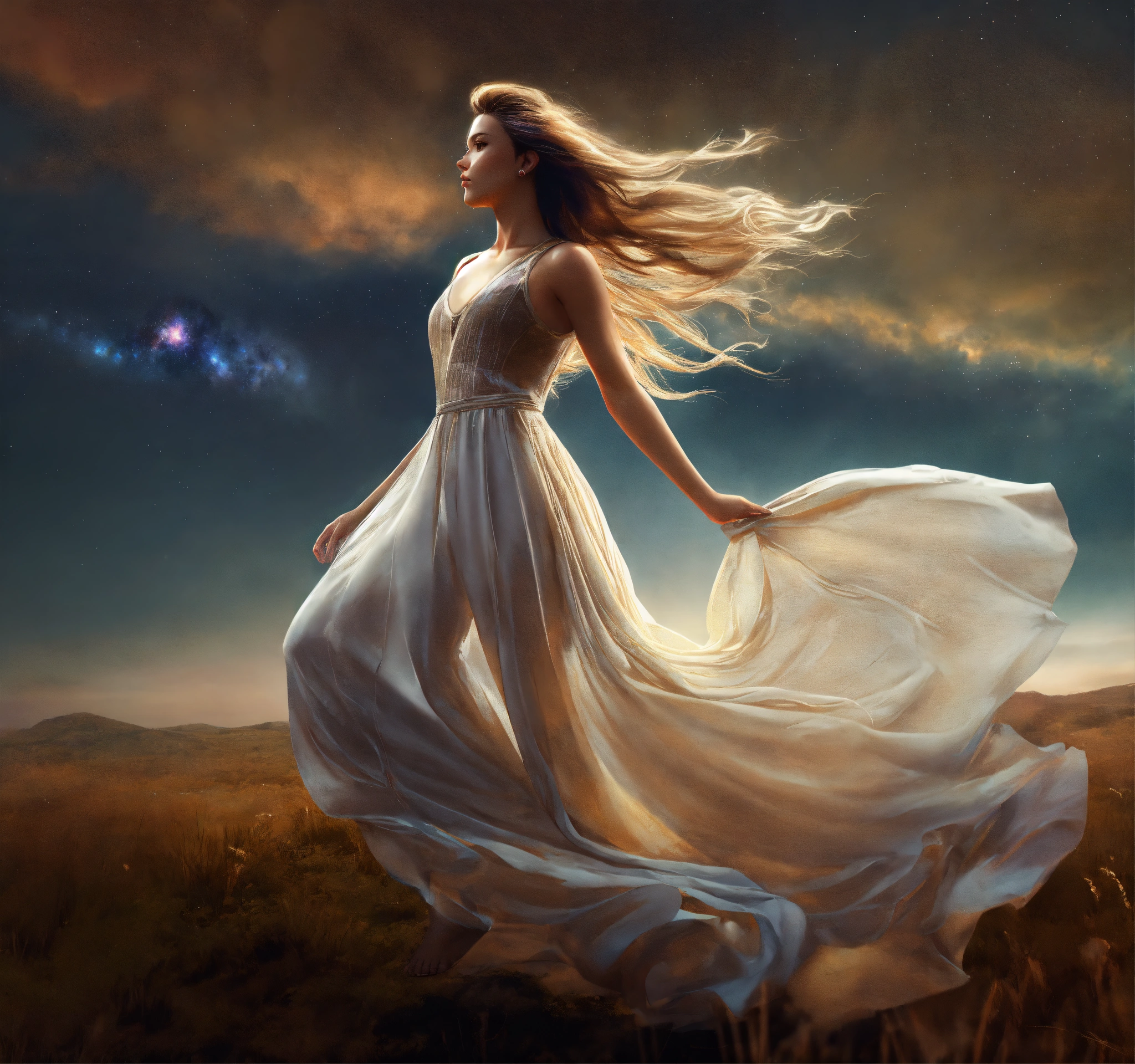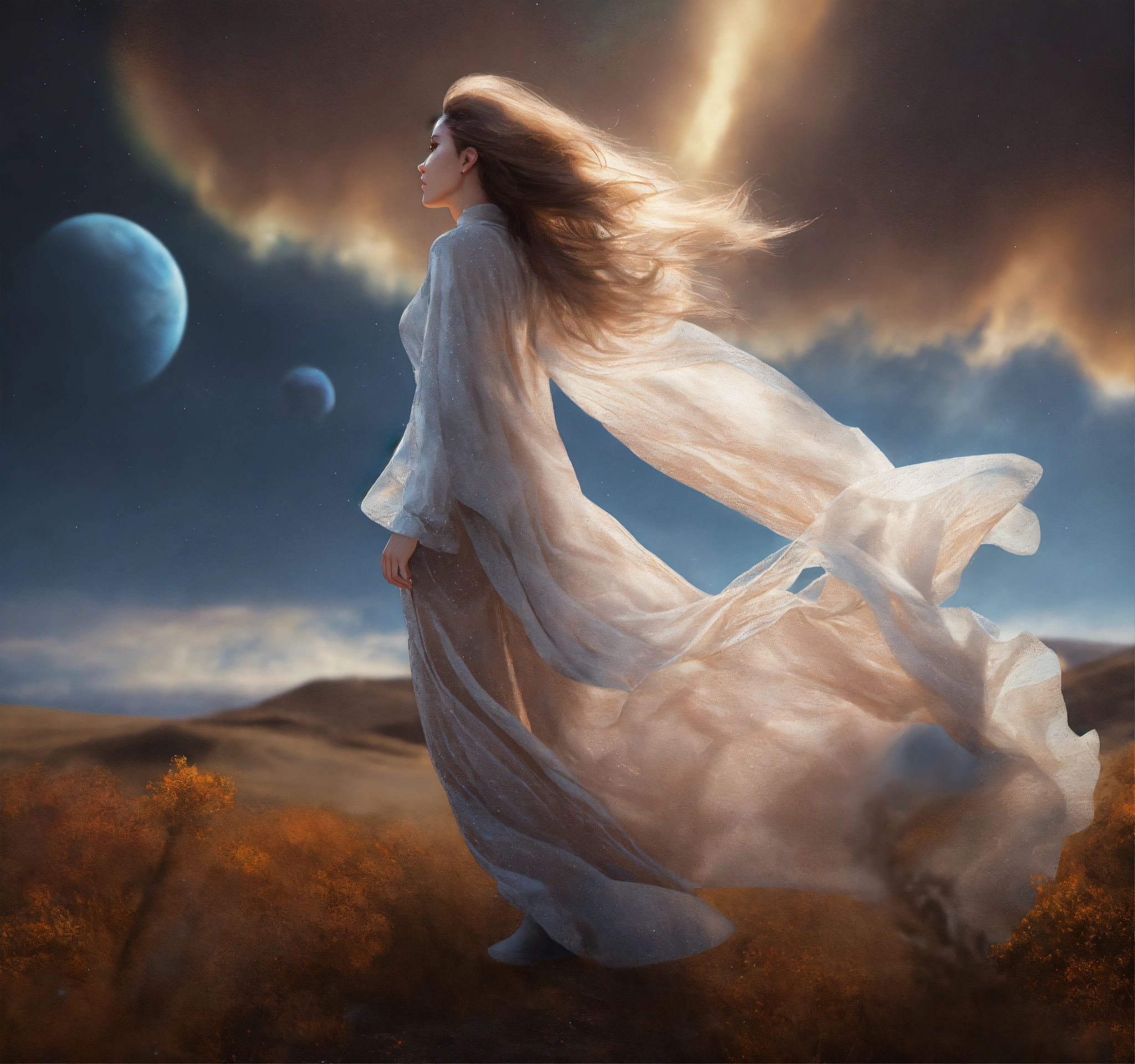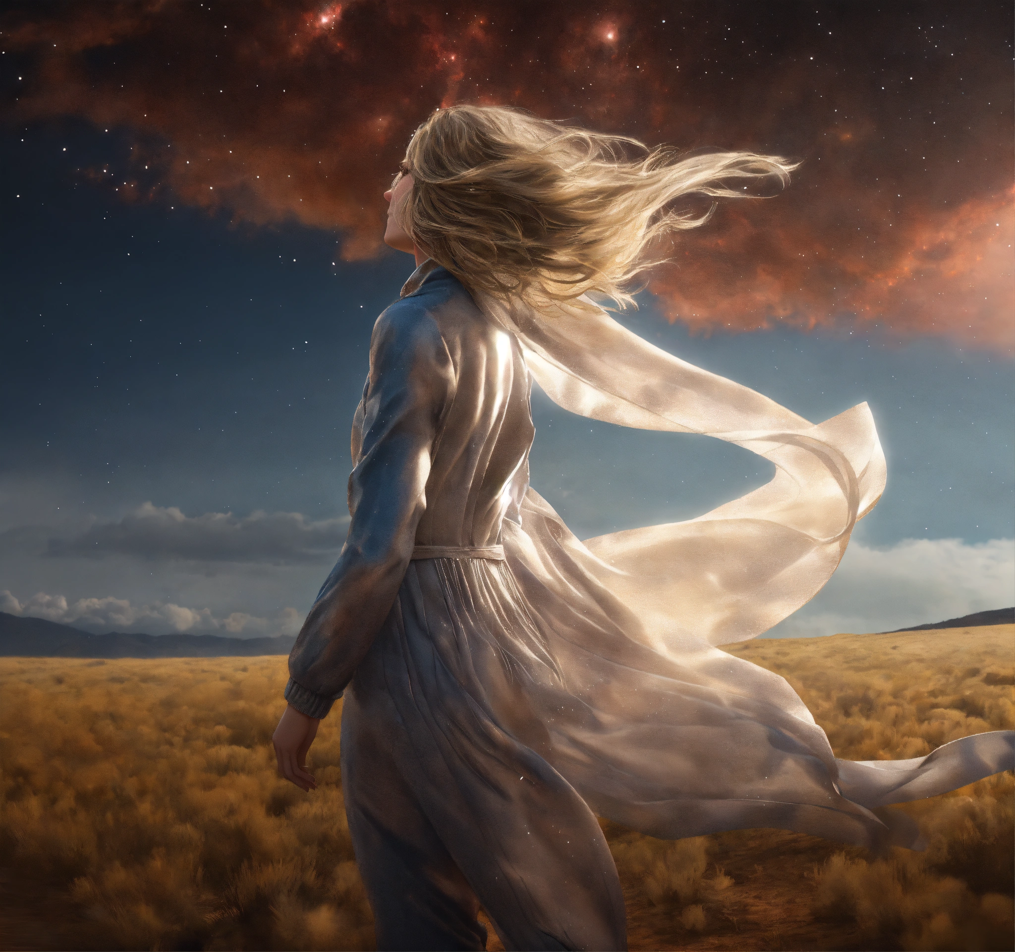 Headless, hair in the wind, full body, hyper realism, poetic, romantic, sport suit, realistic shading, realistic render, detailed textures, photorealistic, wide shot, nebula landscape