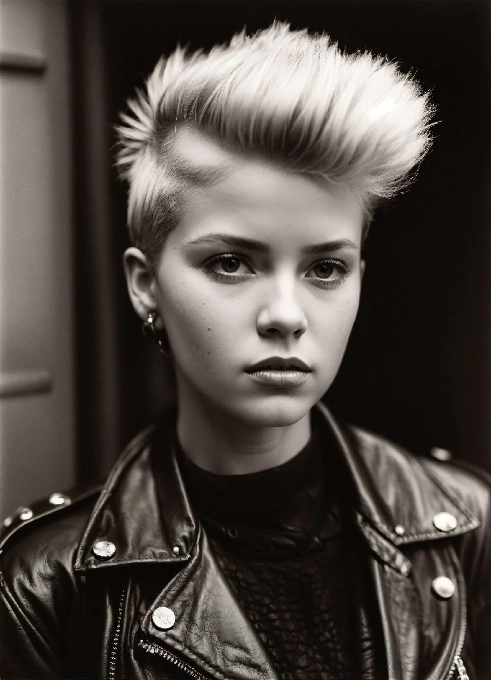 A mysterious photo of a blond girl in a leather jacket, very short mohawk extremely detailed image, by diane arbus.