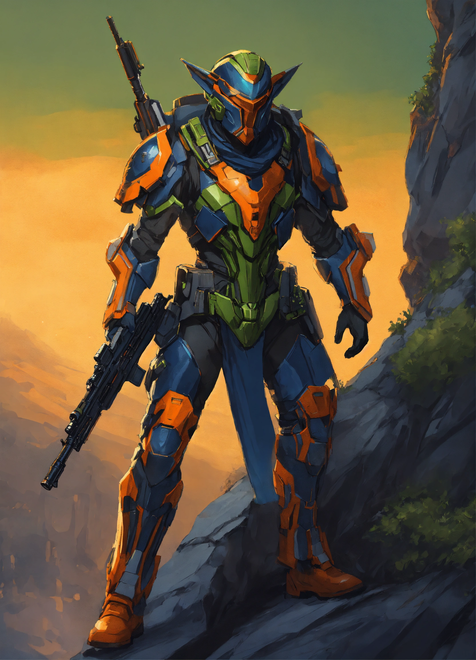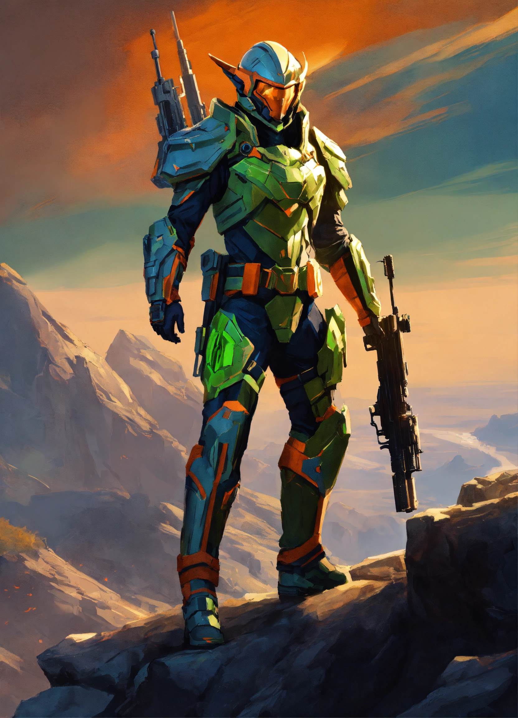Epic drawing of a full body of a high elf sci fi soldier wearing sci fi armor, volt green and navy blue and orange sci fi armor, boots, male, holding a machine gun with both hands, right hand on the handle and left hand holding the handguard of the gun, standing on a cliffside