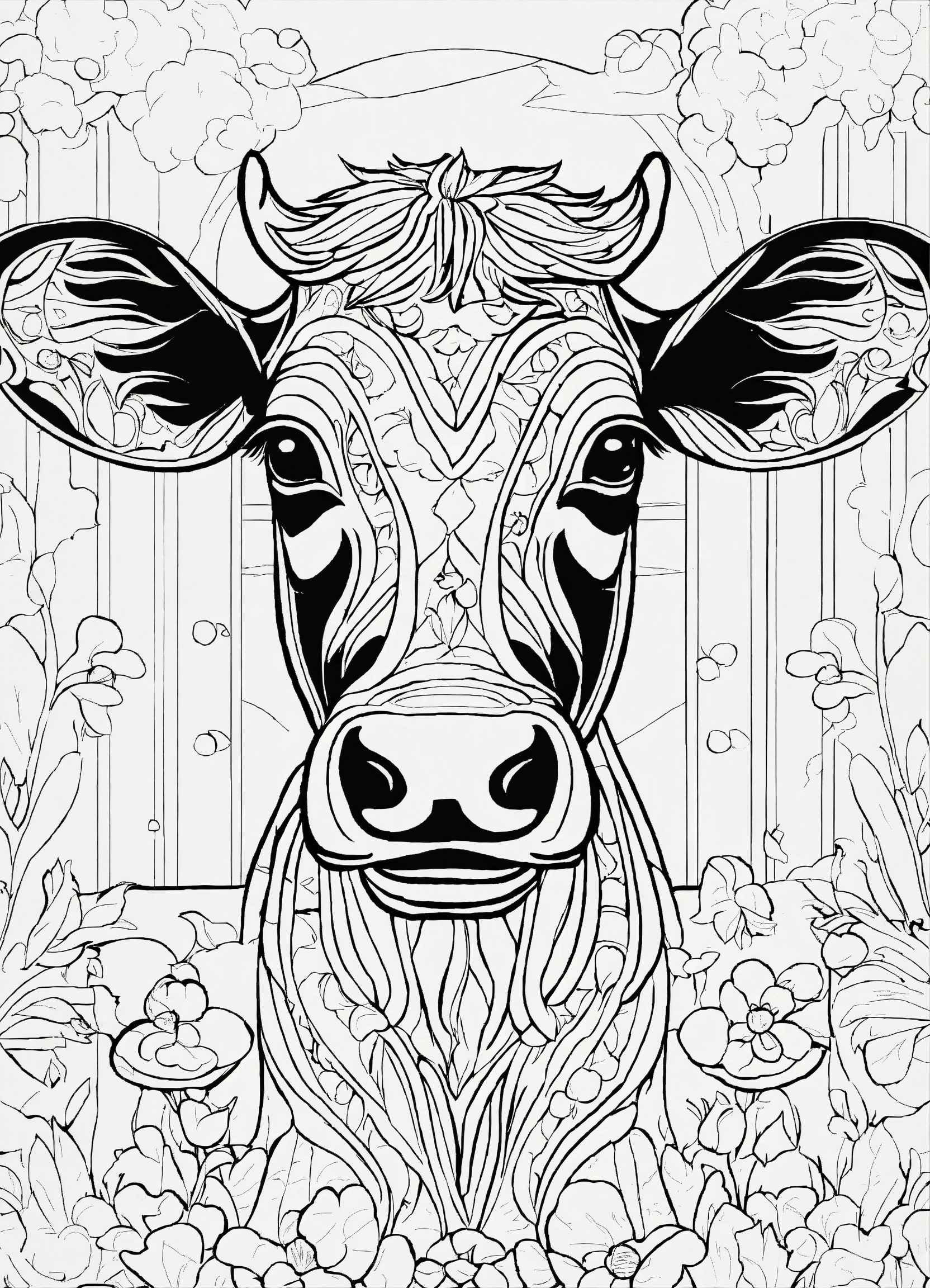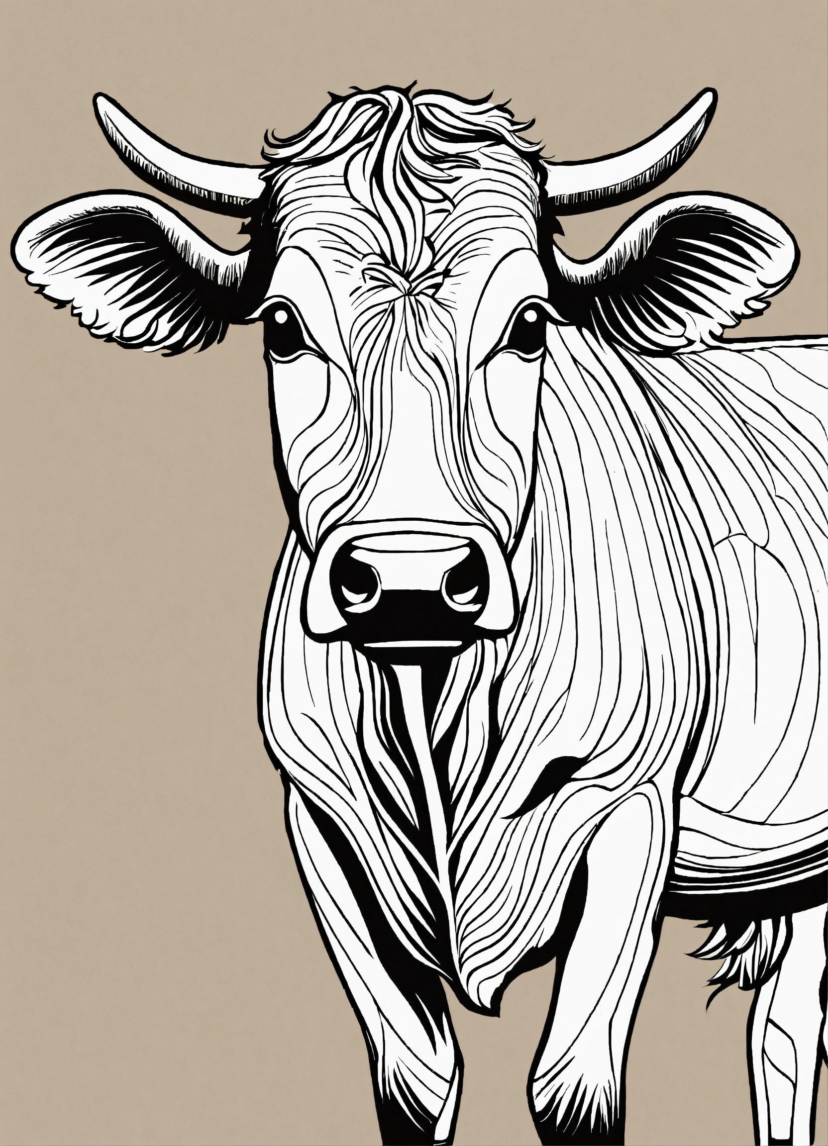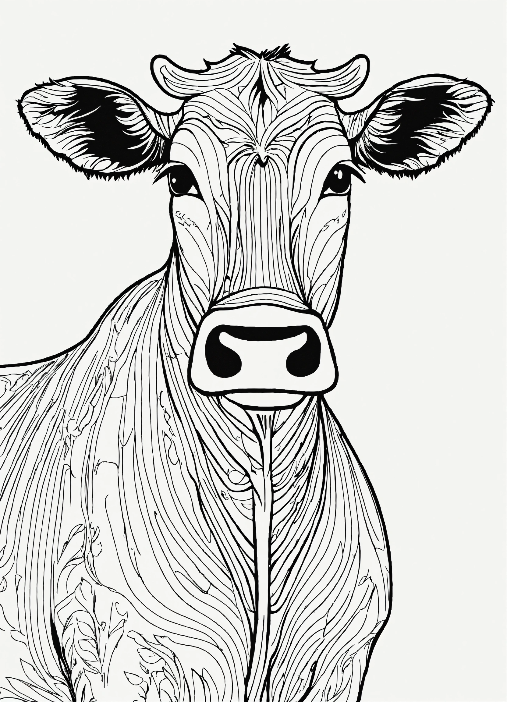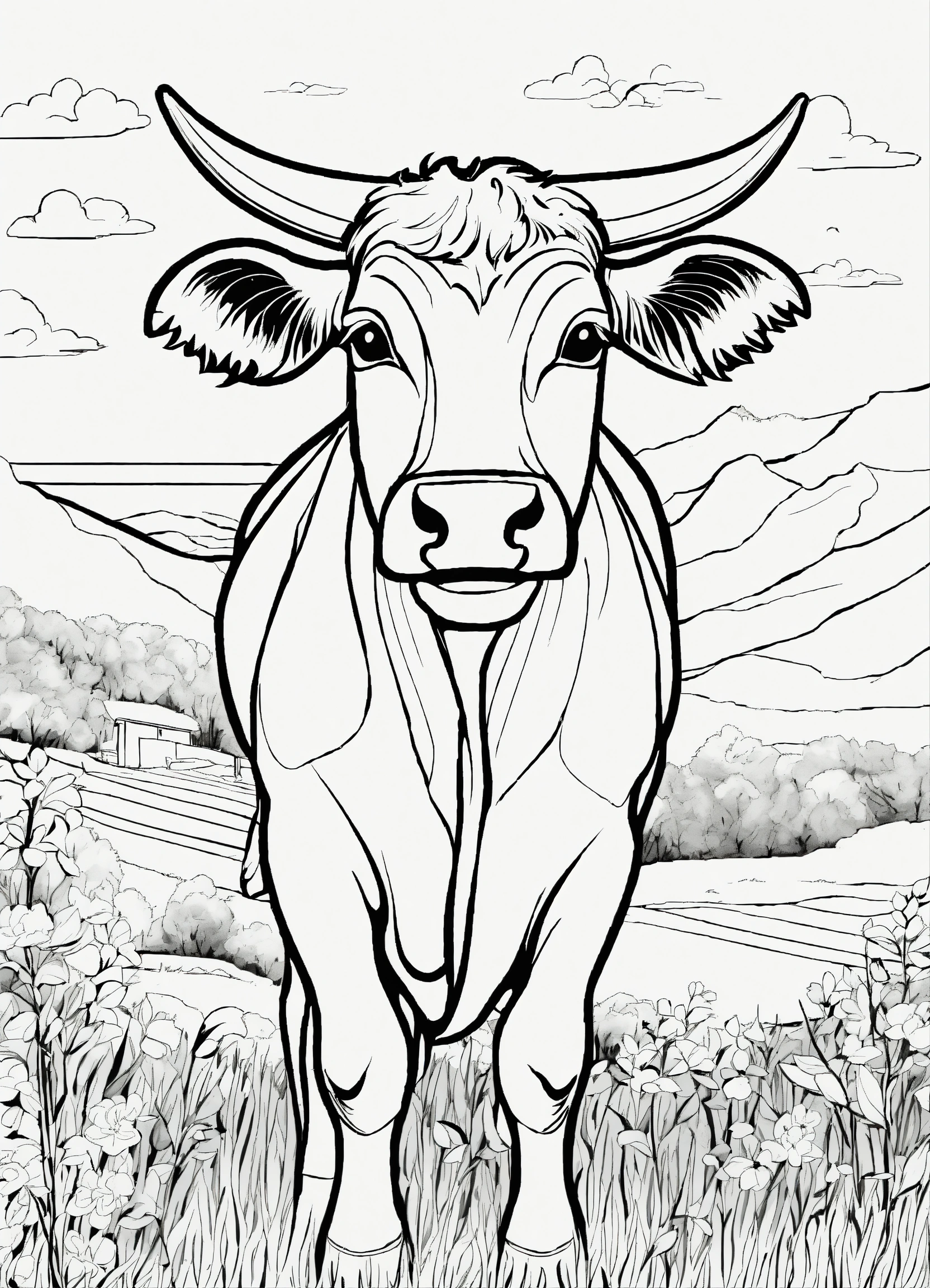 A black and white drawing of a cow, thik lines, coloring pages, coloring book outline, outline drawing, clean coloring book page, clean lineart, cutest, black and white vector art, cute single animal, black and white coloring, colouring pages, vector drawing, cartoon style
