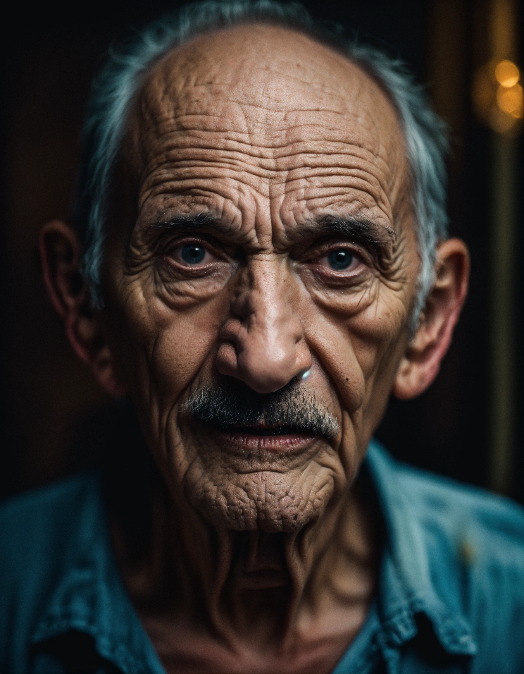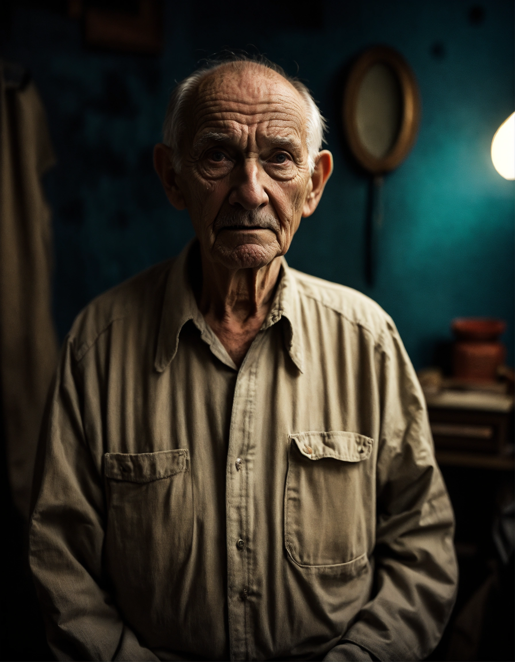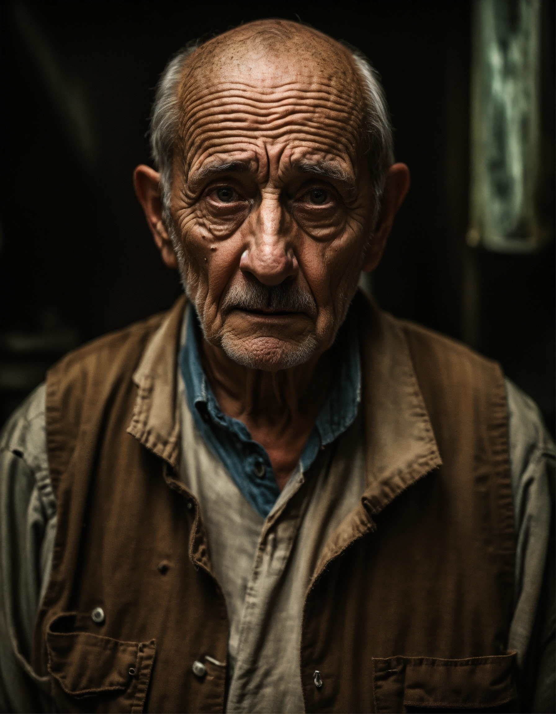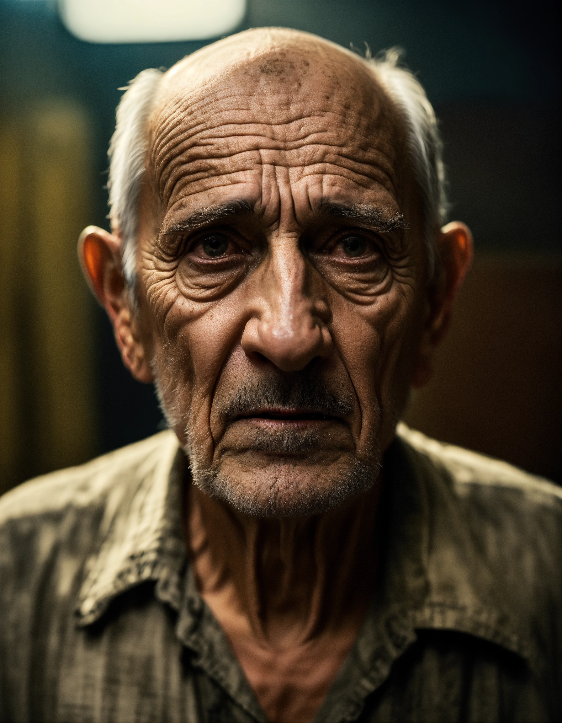 Full standing picture old very scary american man, thinning hair, small little eyes, with wrinkles and dark circles telling a story, dark room background