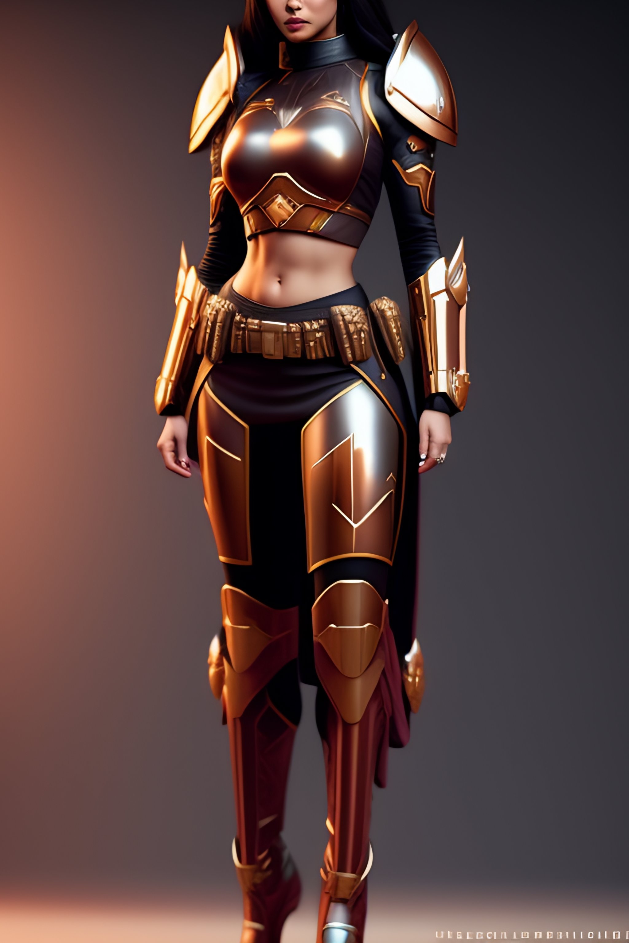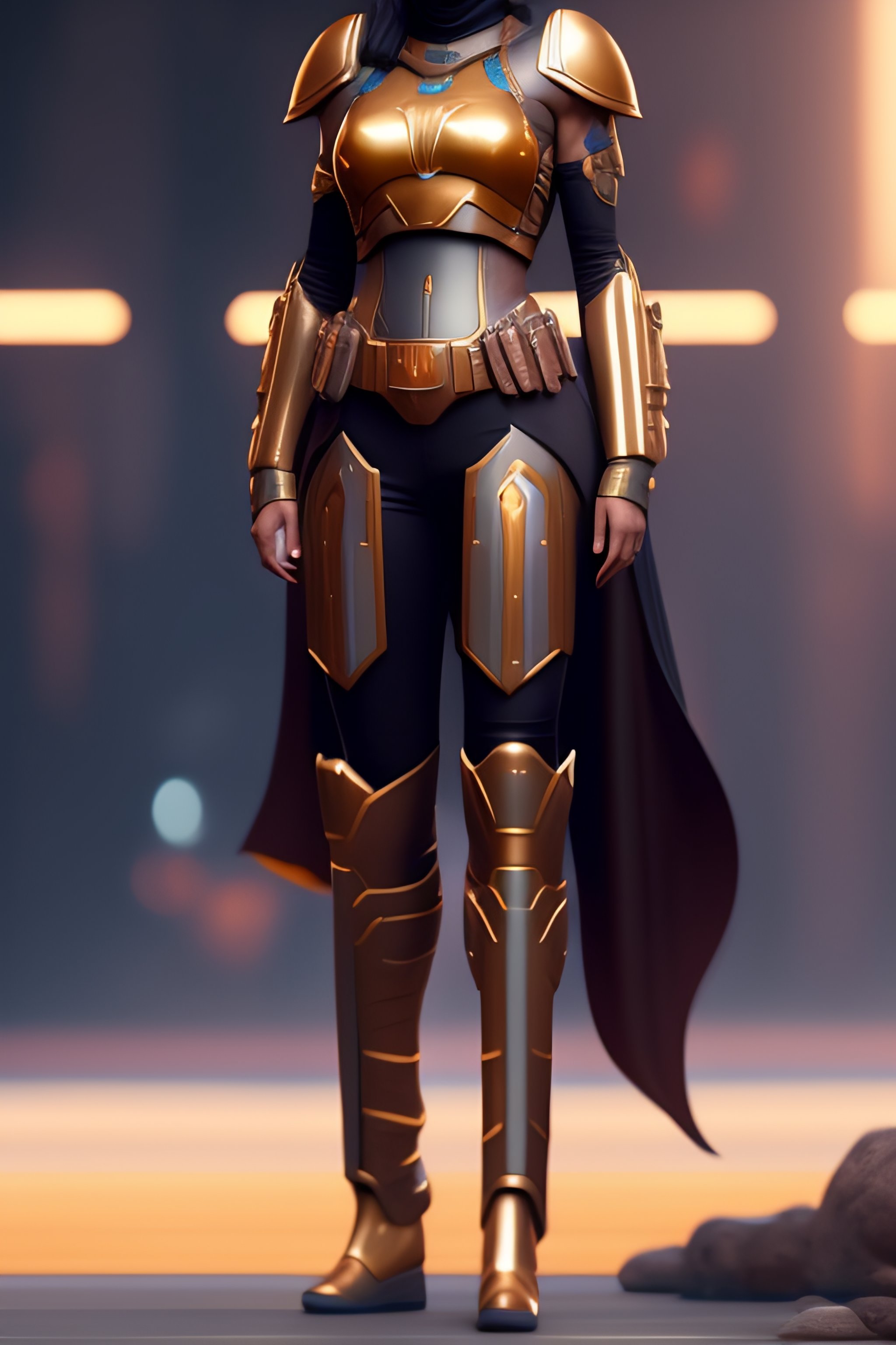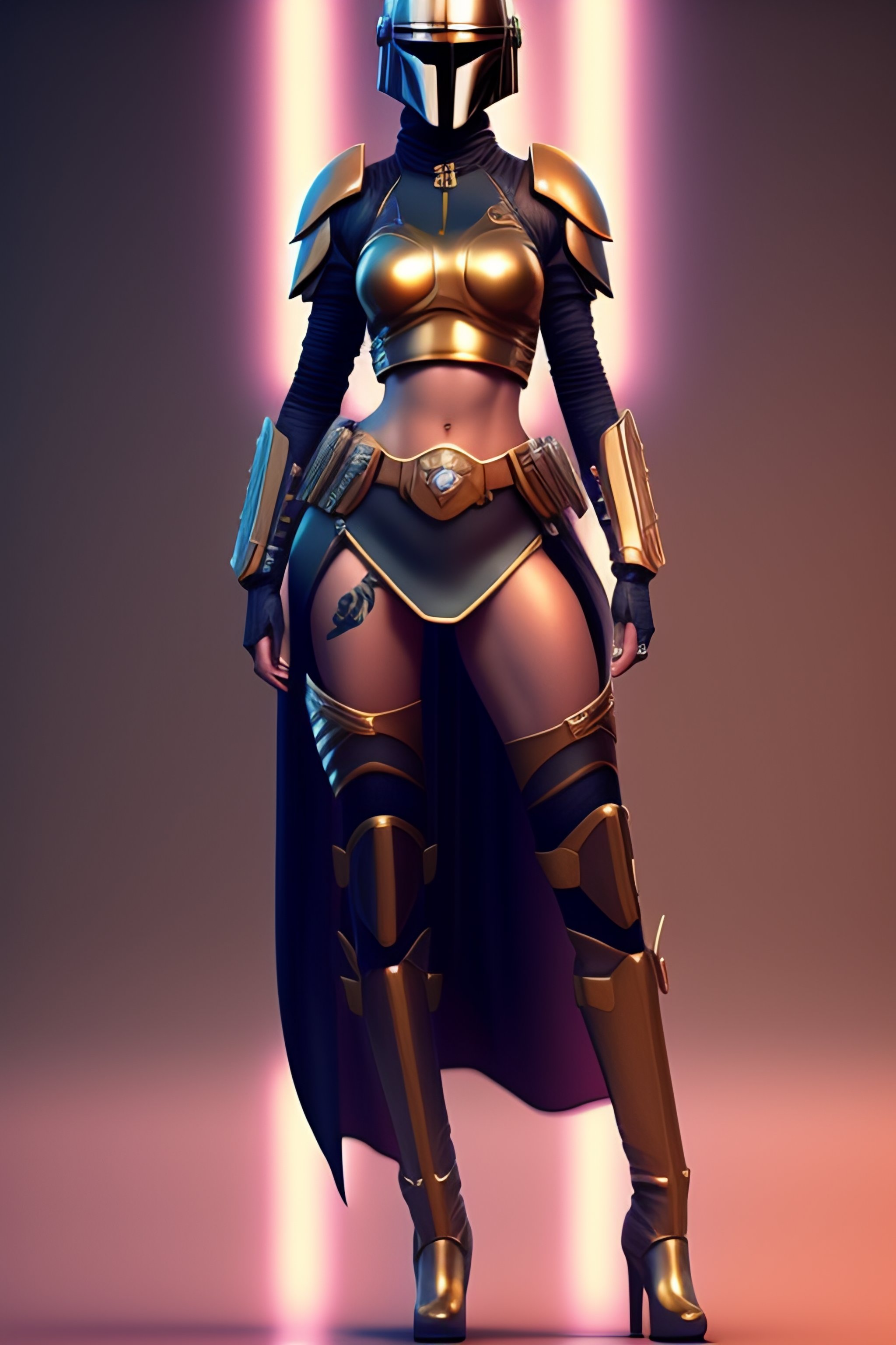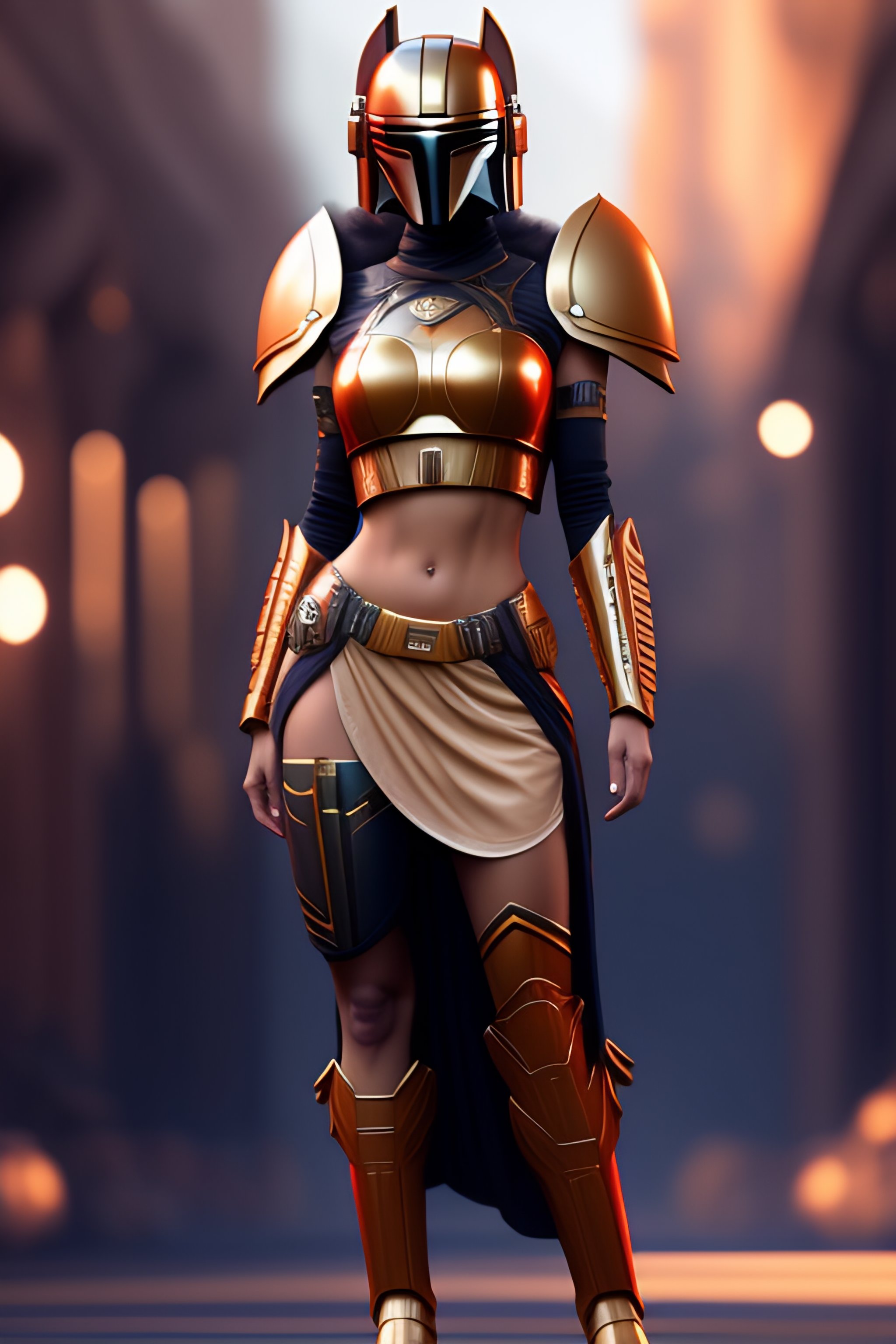 A feminine female version of mandalorian with midriff in full body view, dream-like art, smooth lighting, artgerm, artstation, full body shot, 8k, cinematic lighting, photoreal, full body view, octane render, ultra-resolution, full body view