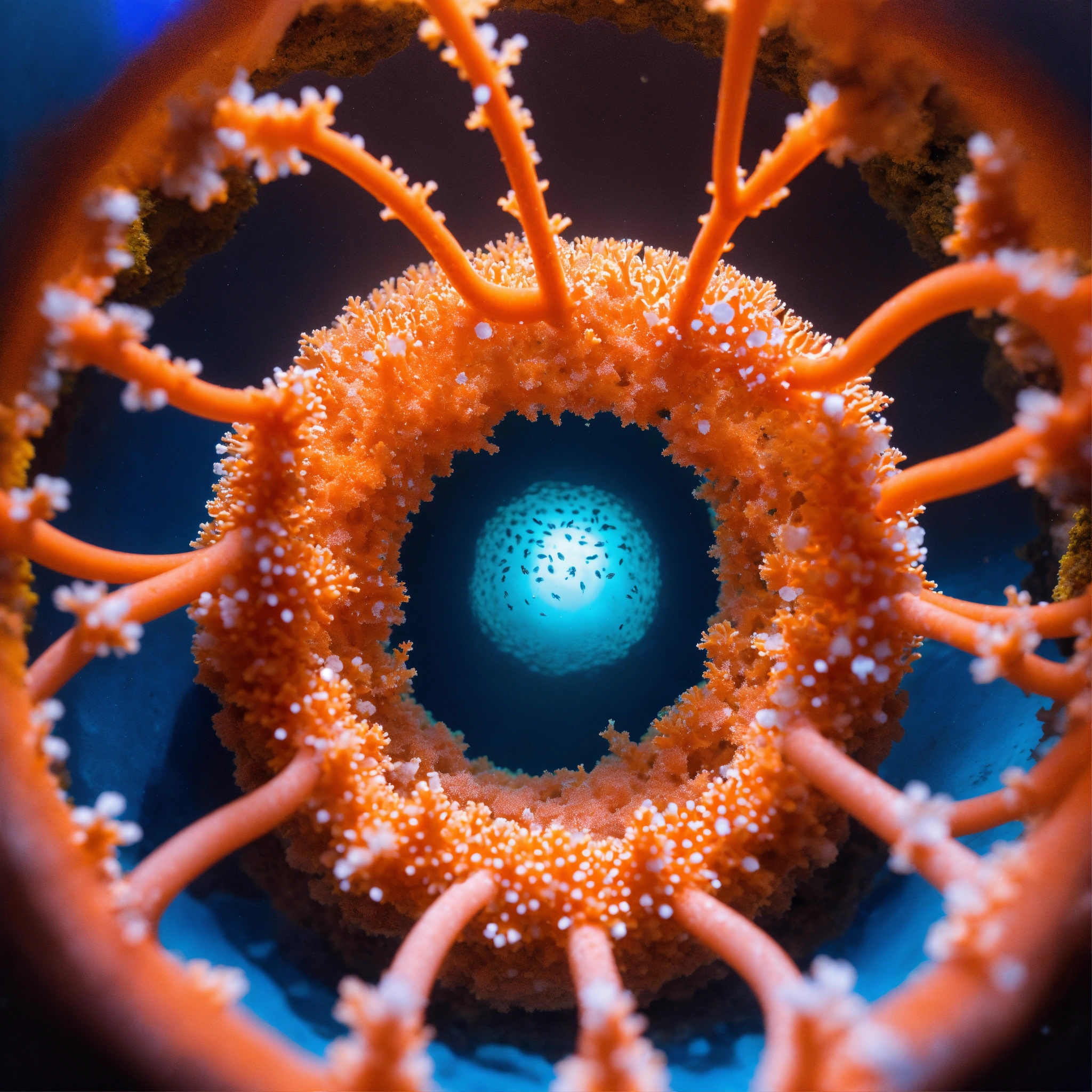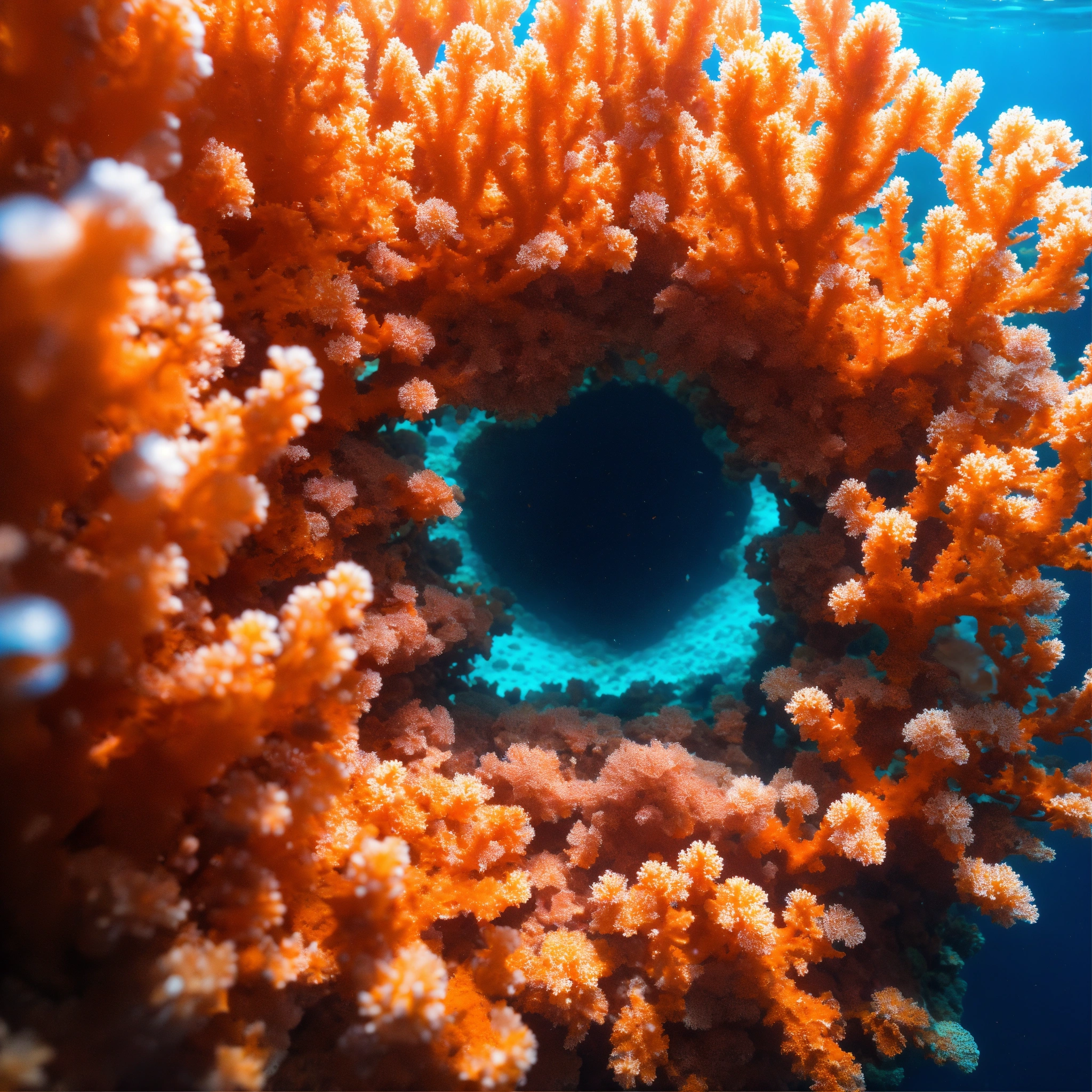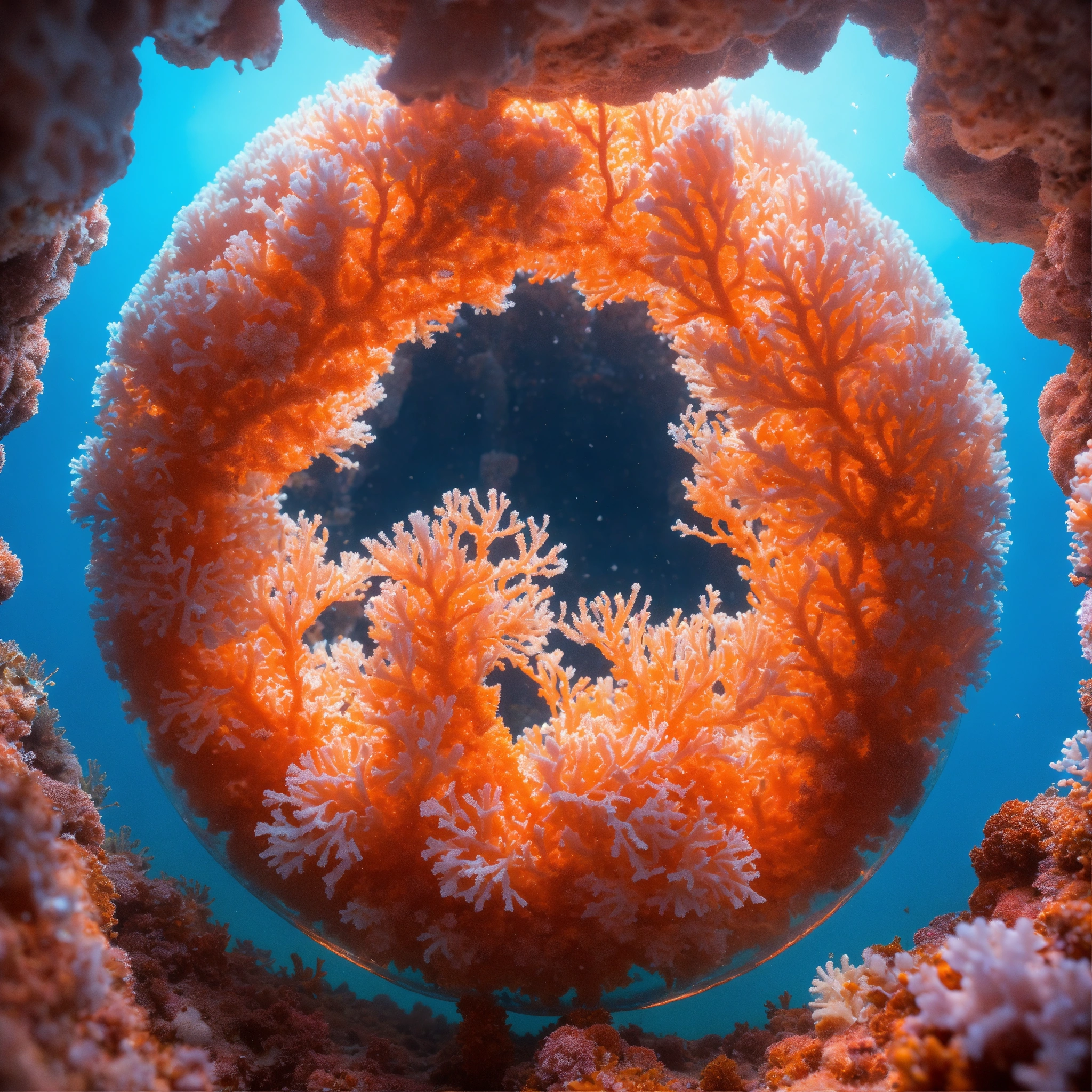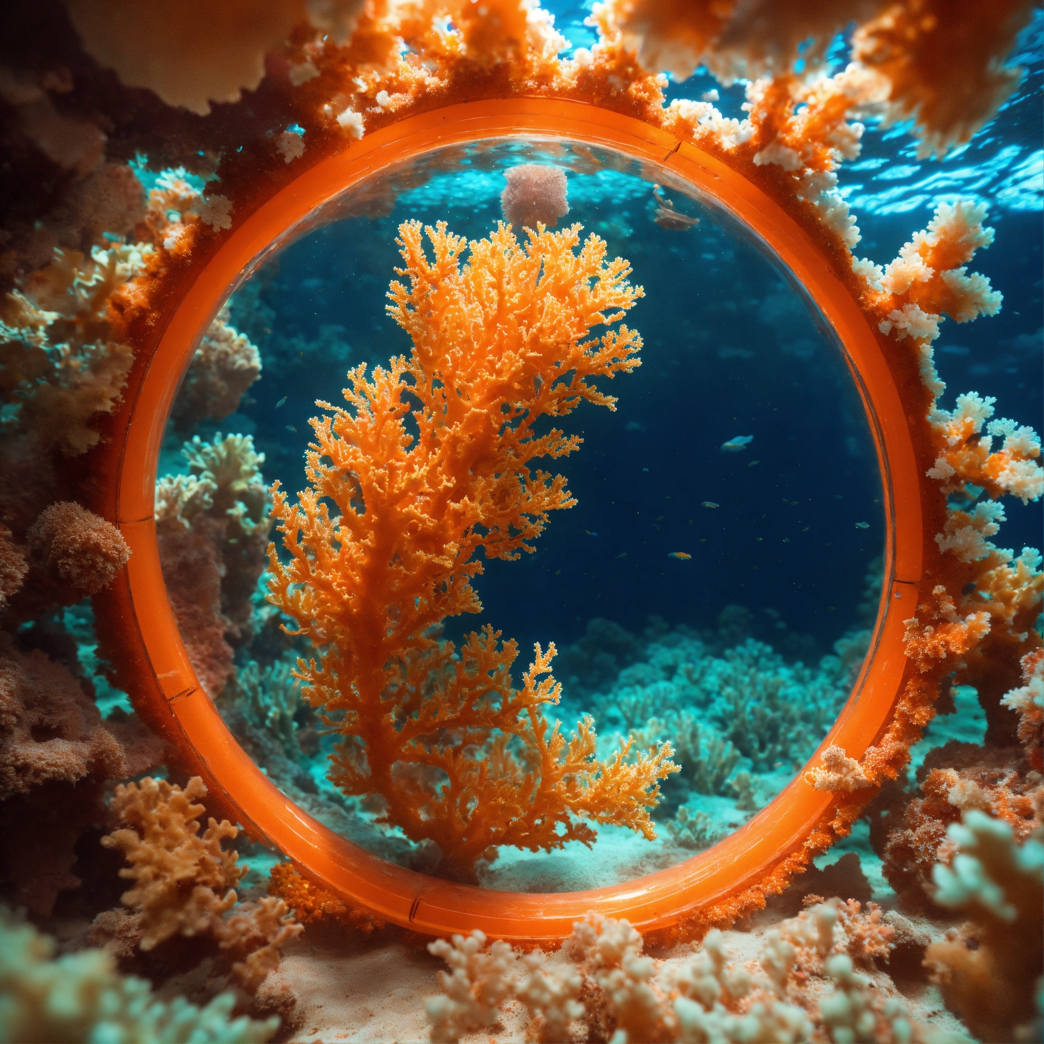 A glowing orange coral inside a sci-fi tube with clear blue ocean water, top-down regular tube shape, ground inside the tube is of clear white crystals, tube is on the center, camera focus on the tube