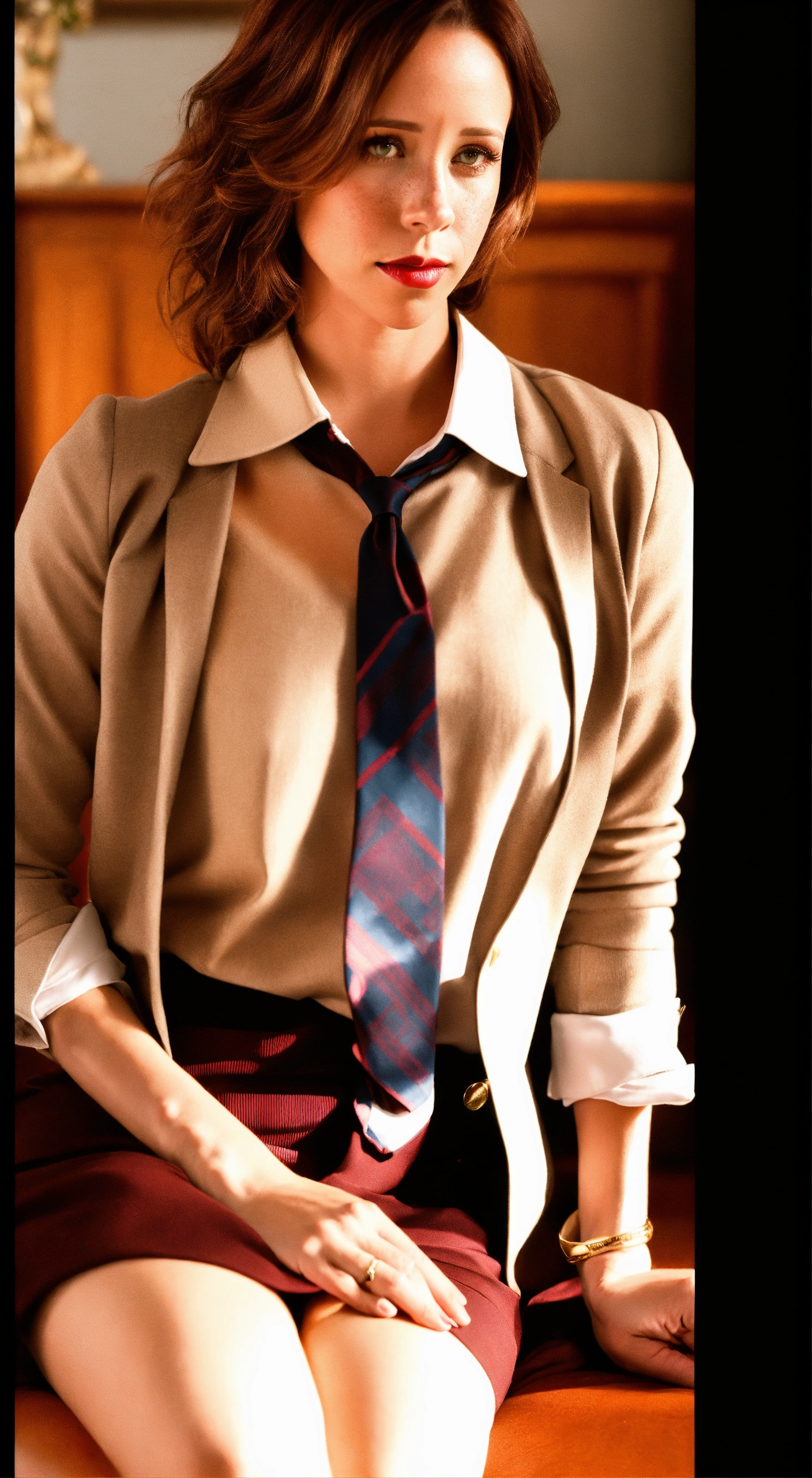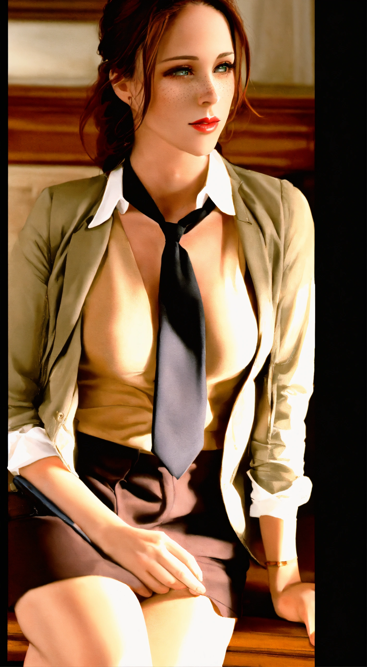 A jennifer love hewitt photographic portrait of a 25 year old beautiful woman with neck lengthened, untied dark red hair, greater bust, tight shirt, wide bust, she has green eyes, freckles on her face and red lipstick, form-fitting, curve-hugging, snug, tailored, close-cut, sculpted, defined, pronounced curves, shapely, casual, relaxed, laid-back, undone, informal, nonchalant, easygoing, disheveled, carefree, unbuttoned, unstructured, effortless, she wears a black suit jacket with a white shirt and black tie. her head is triangle shaped, preppy, elite, well-dressed, polished, sophisticated, form-fitting shirt, stylish, prestigious, private school attire, layered, hosiery, affluent, knee-high socks, upscale, traditional