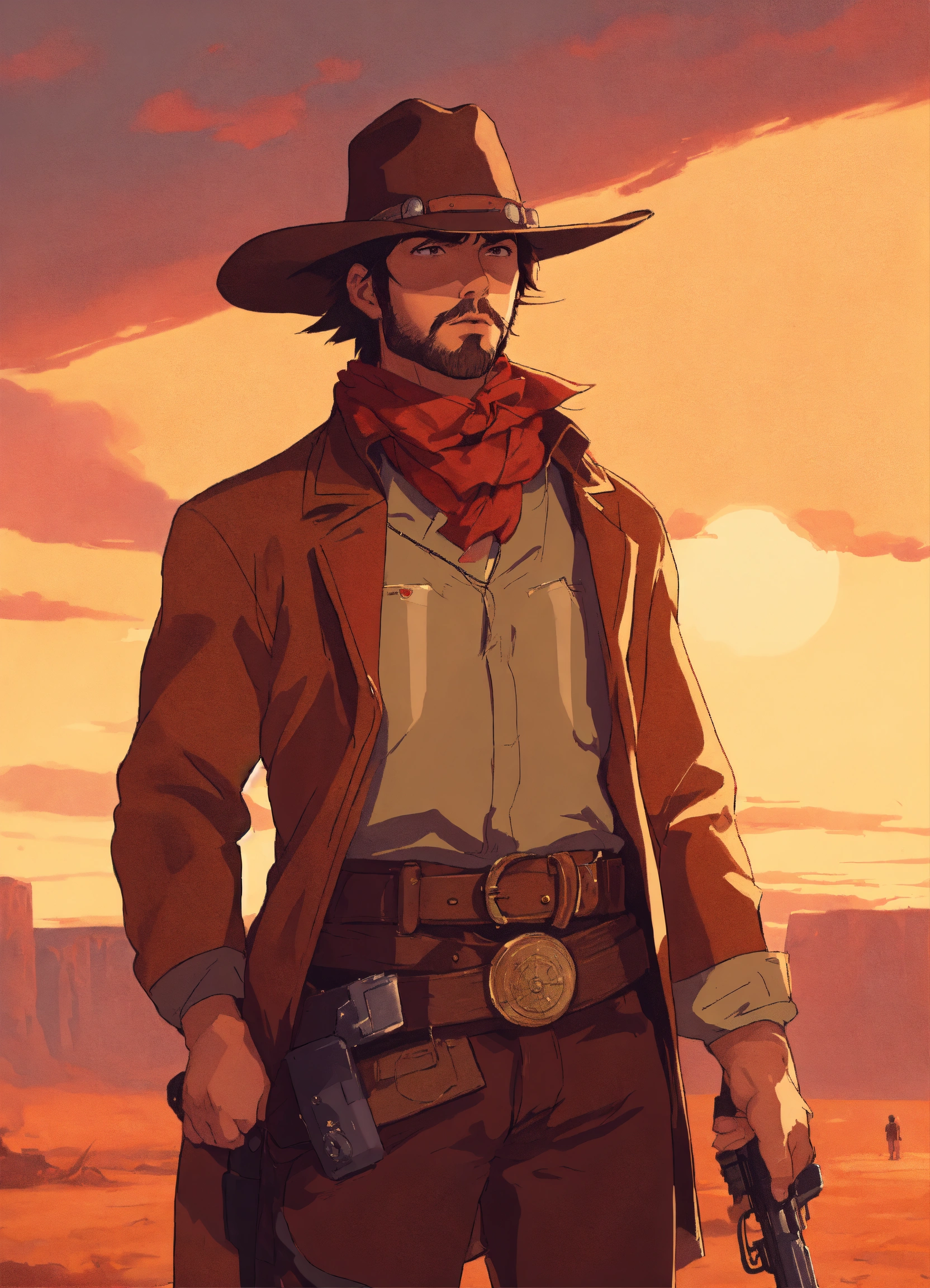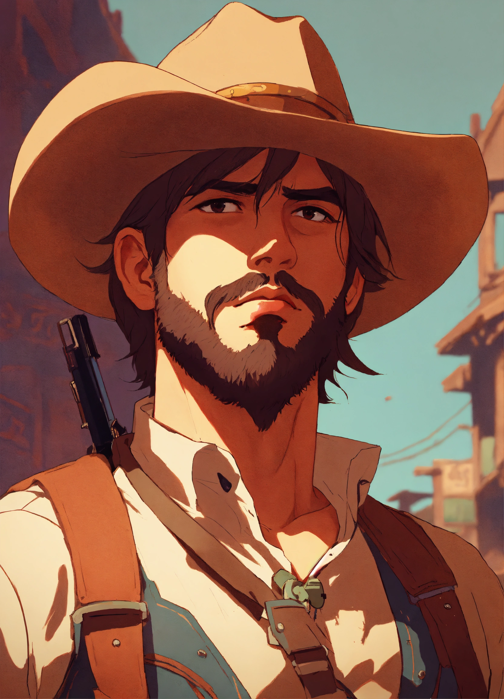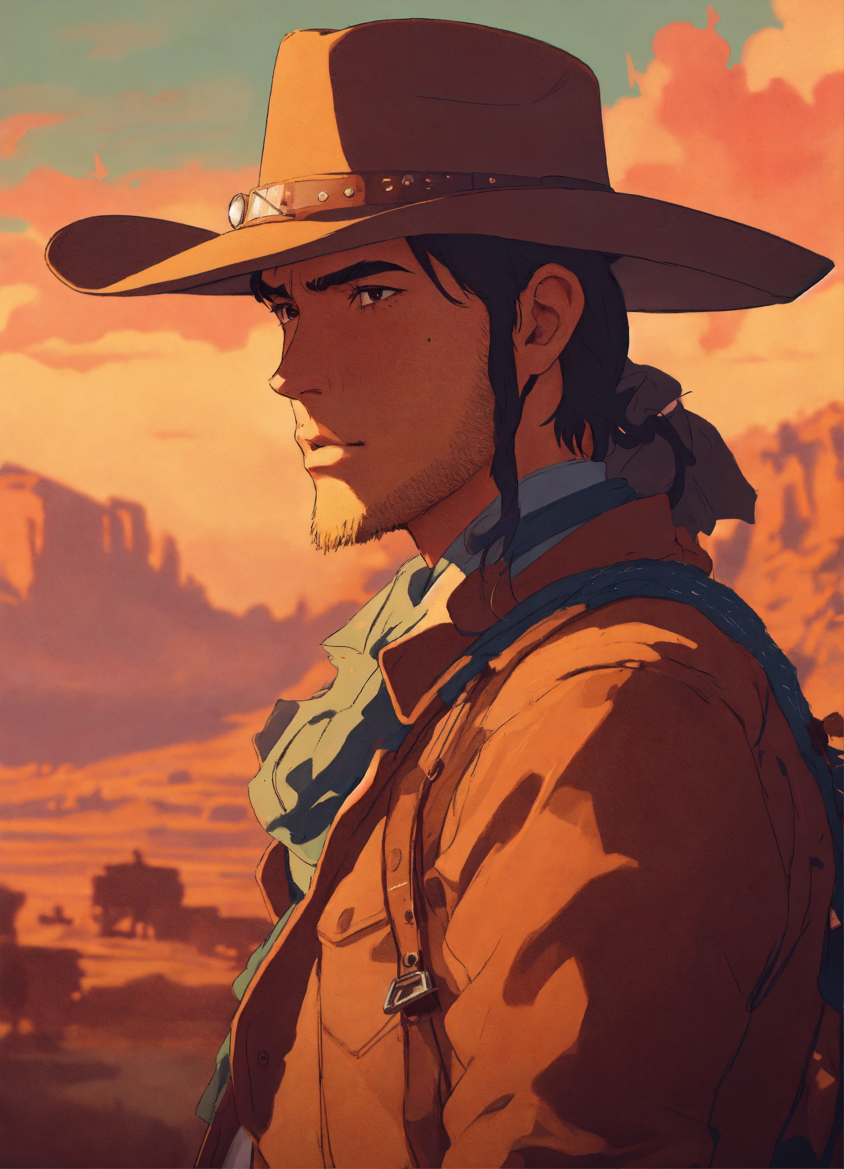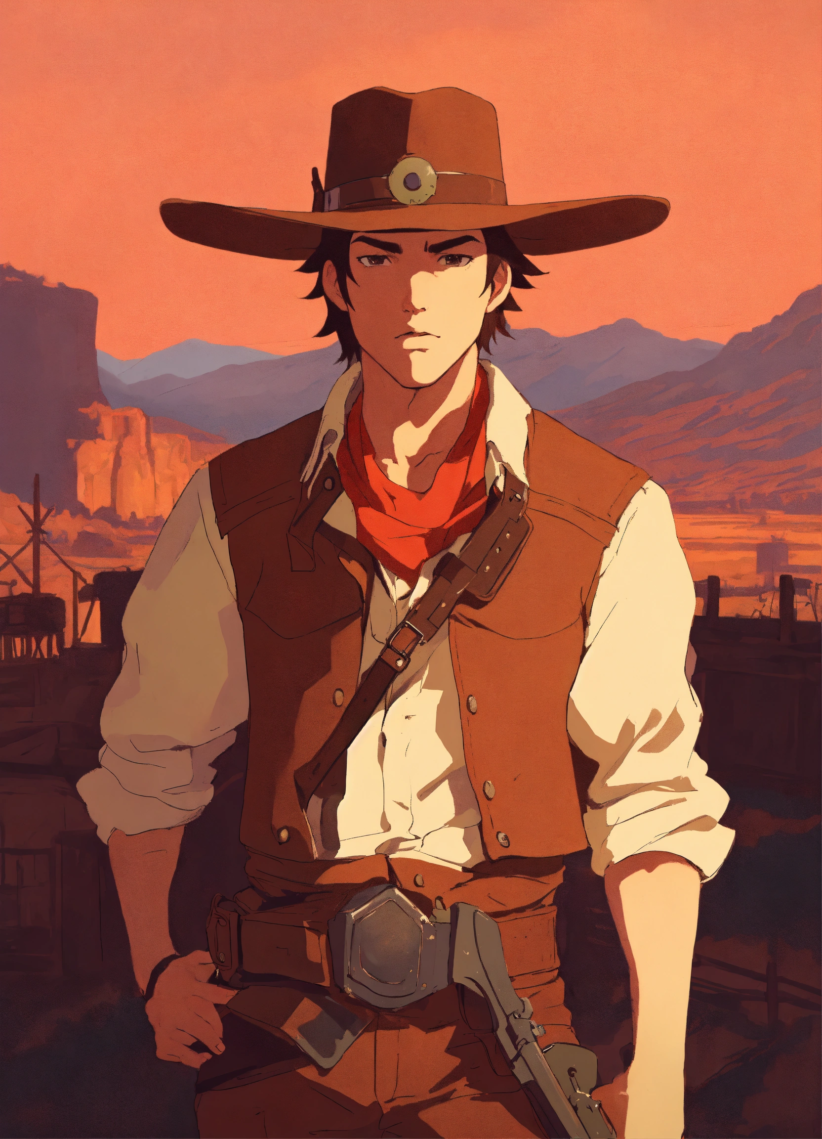 Wild west gunslinger, male, wild west outlaw, portrait, studio ghibli, akira toriyama, james gilleard, trending pixiv fanboxe, 4k, the style of 90's vintage anime, brown hair