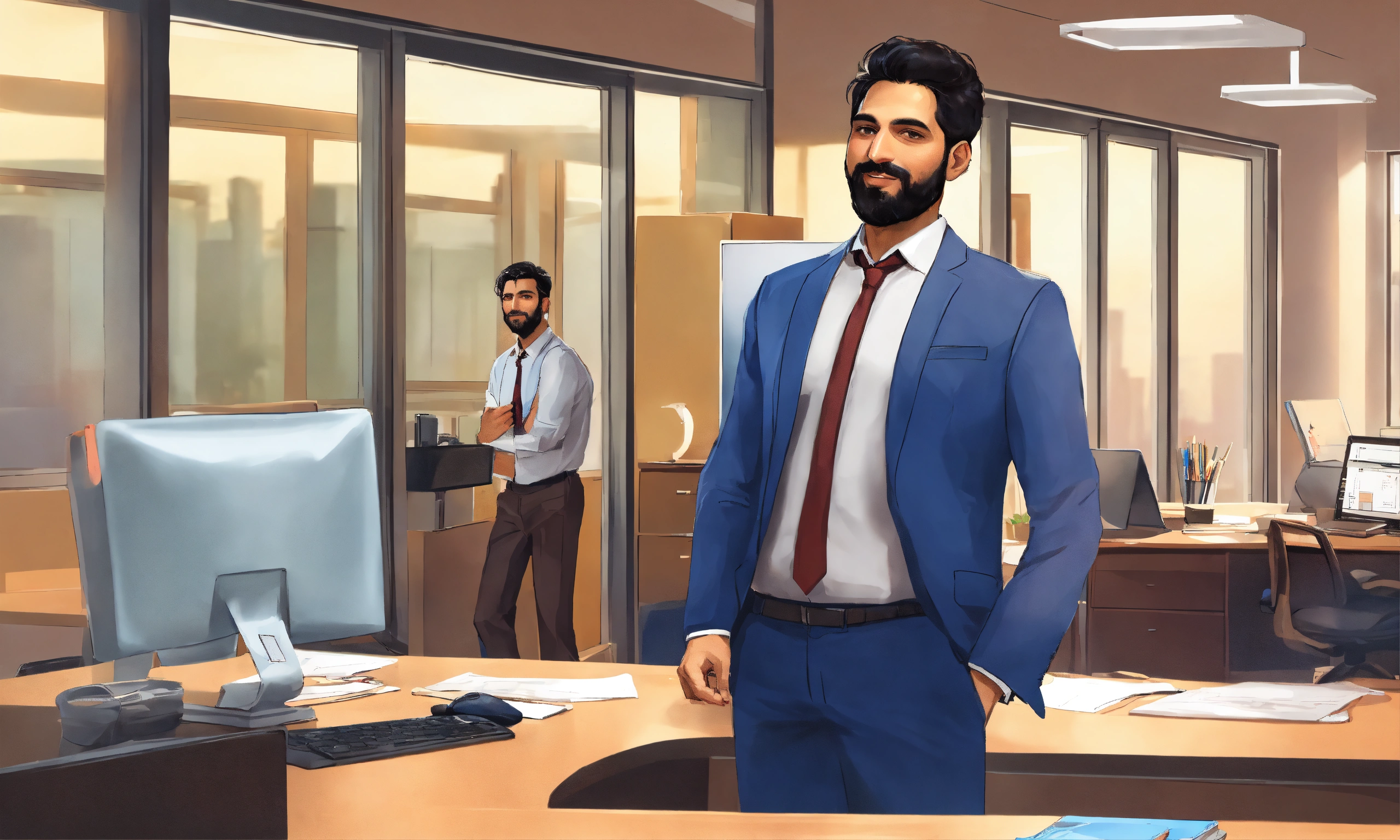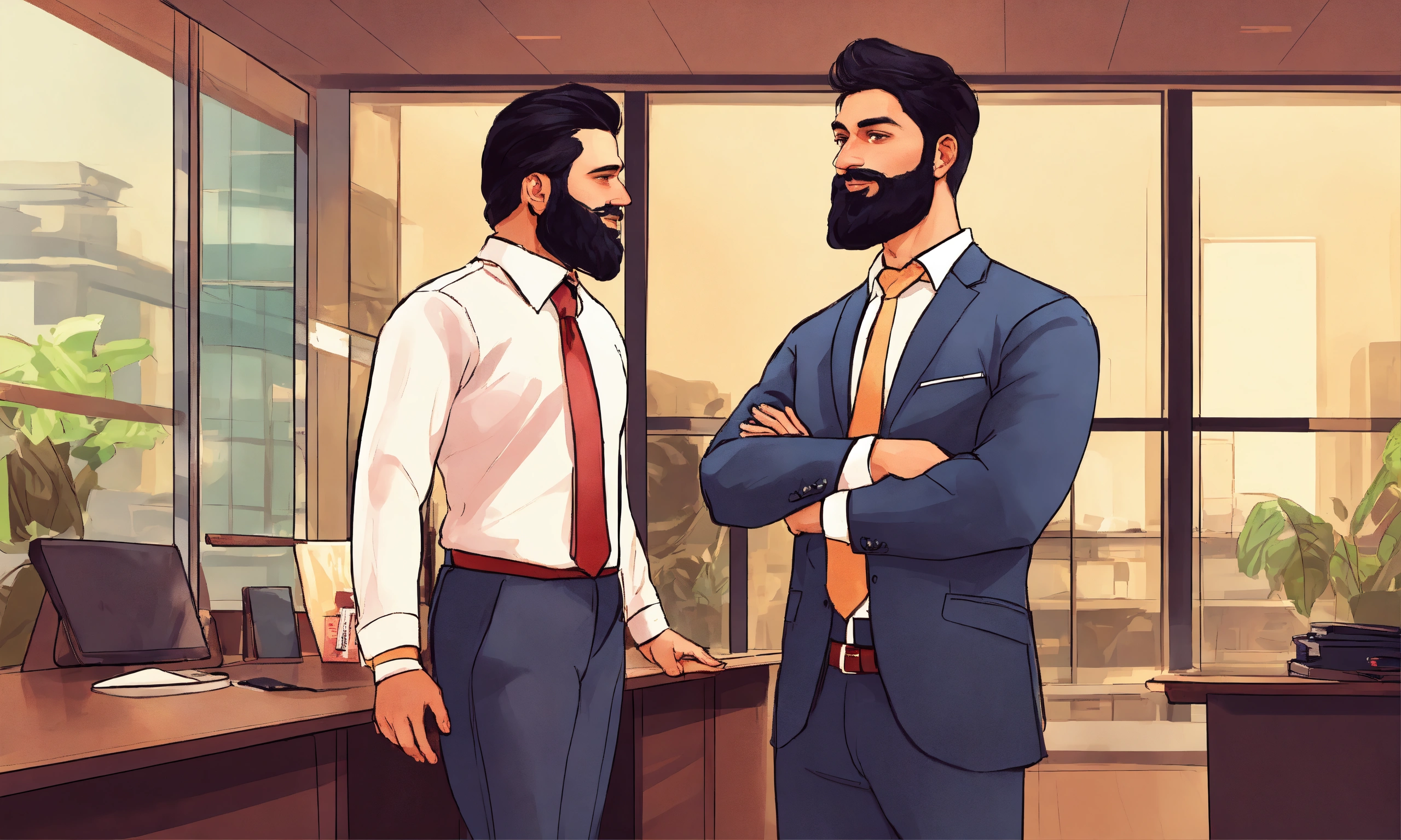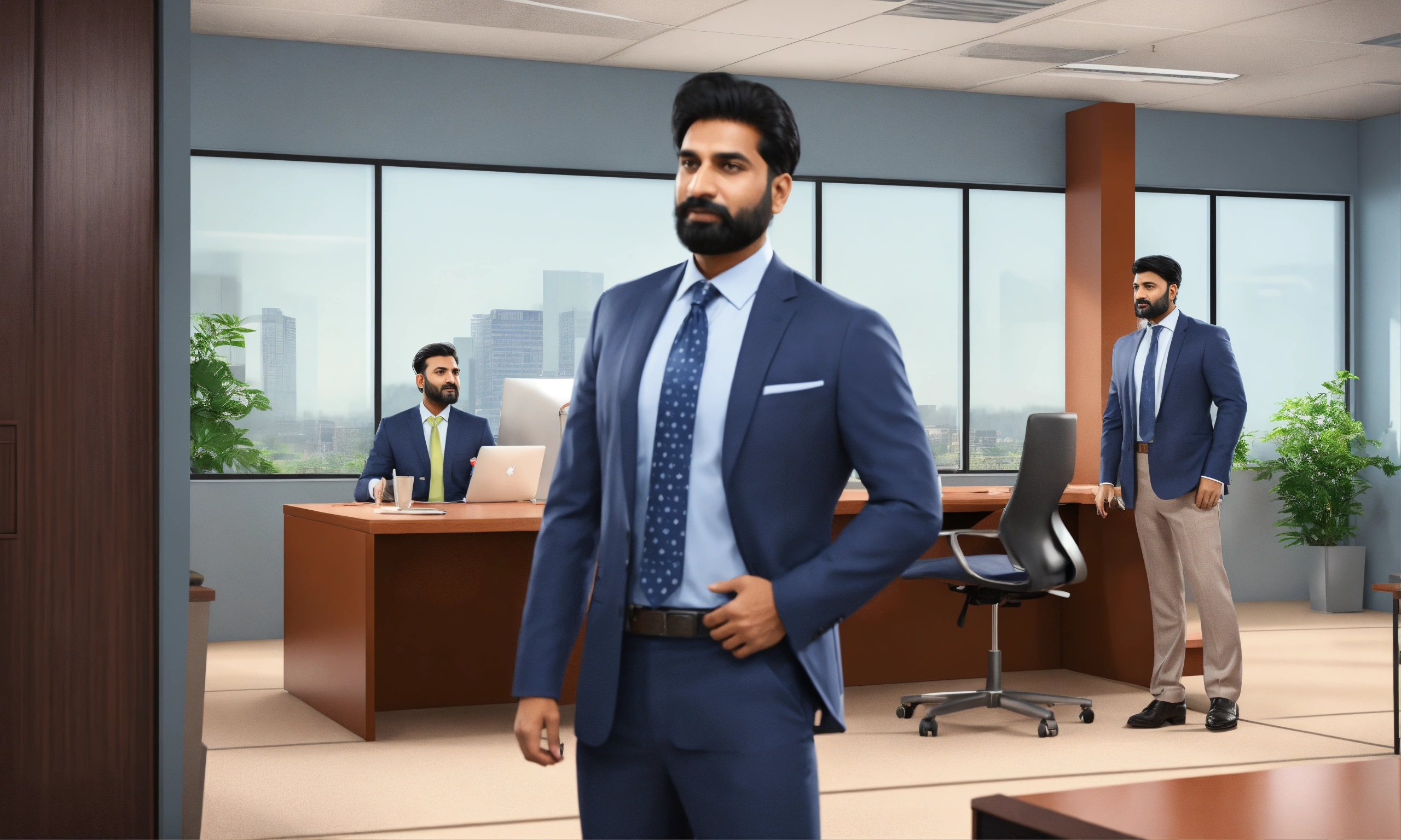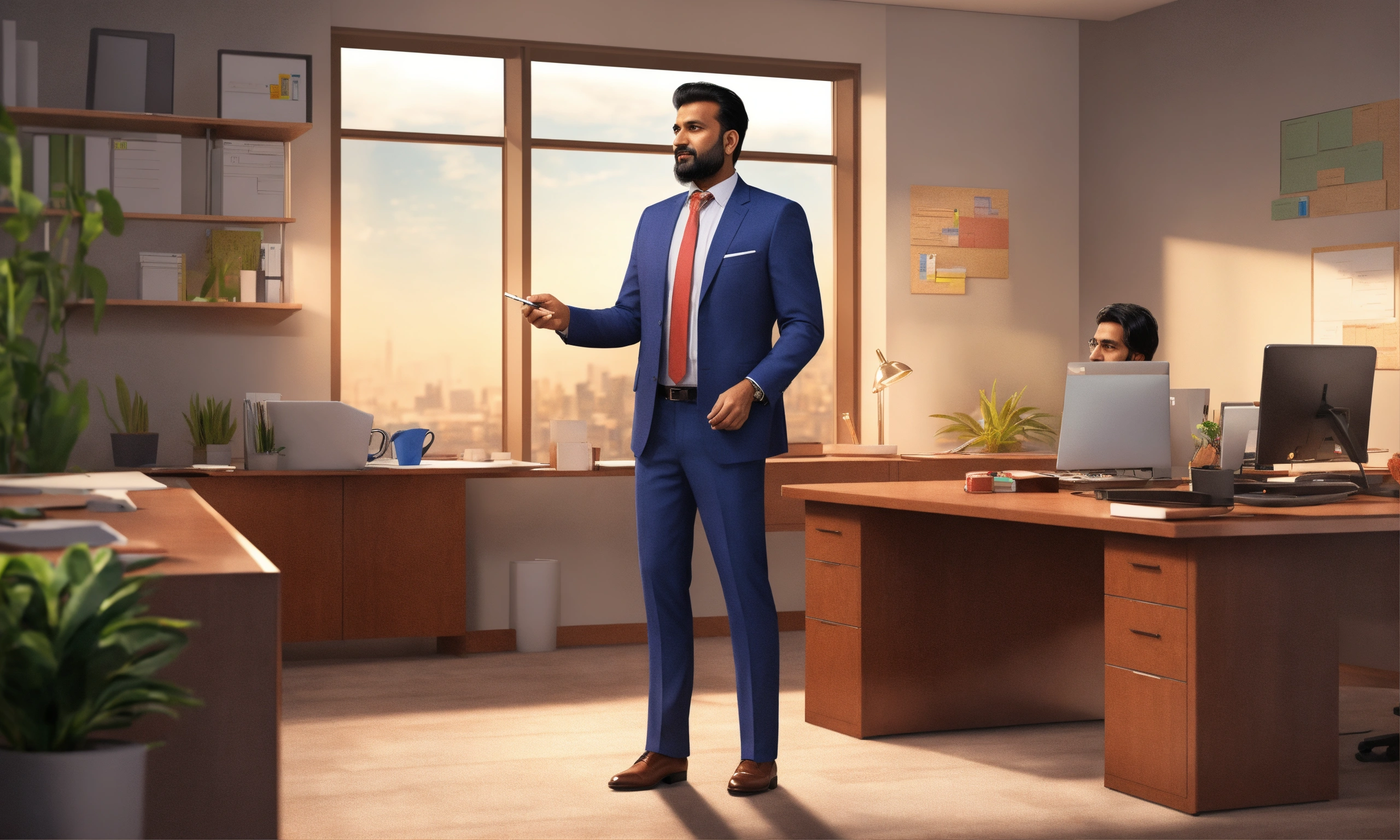 Create an realistic illustration of punjabi man age 40, stading in office talking to employee, dressed in formals, in multiple poses, looking confident