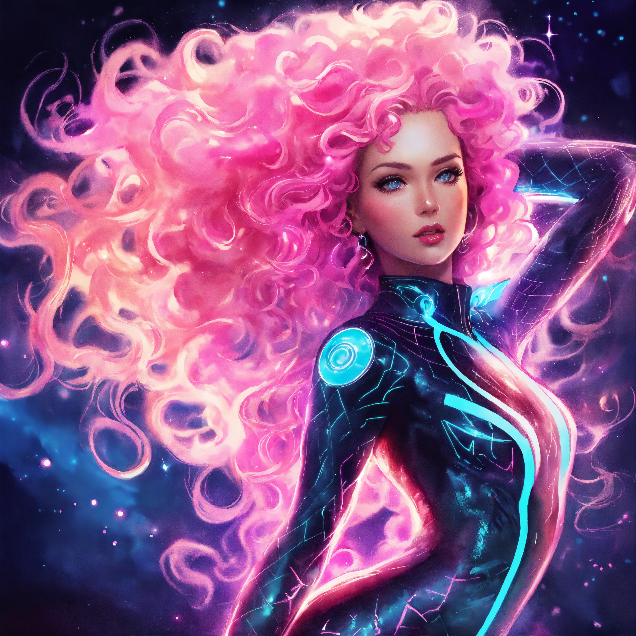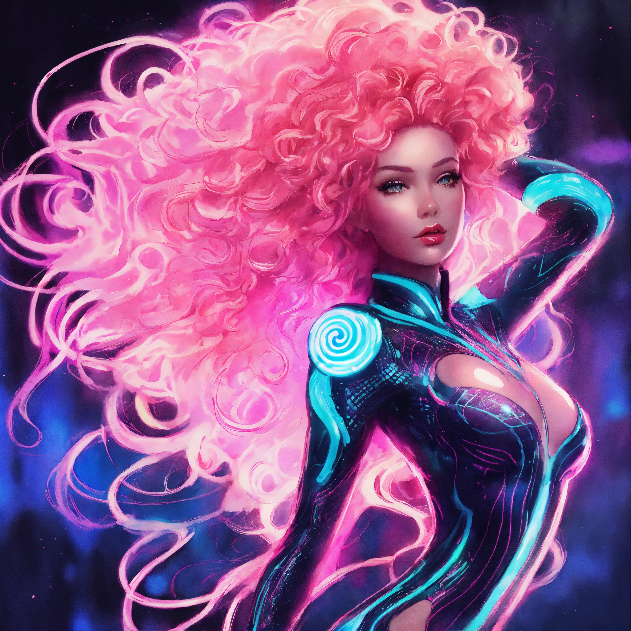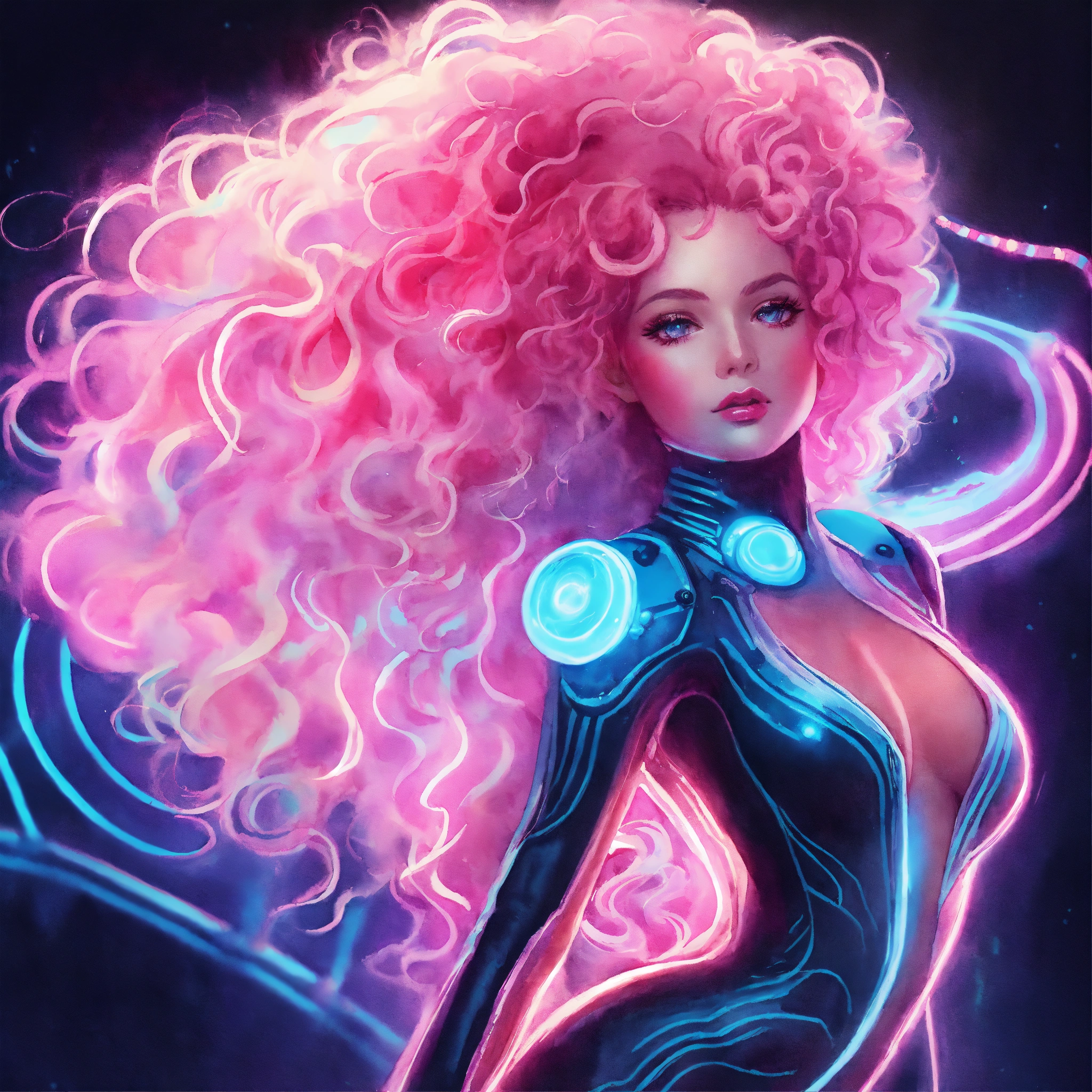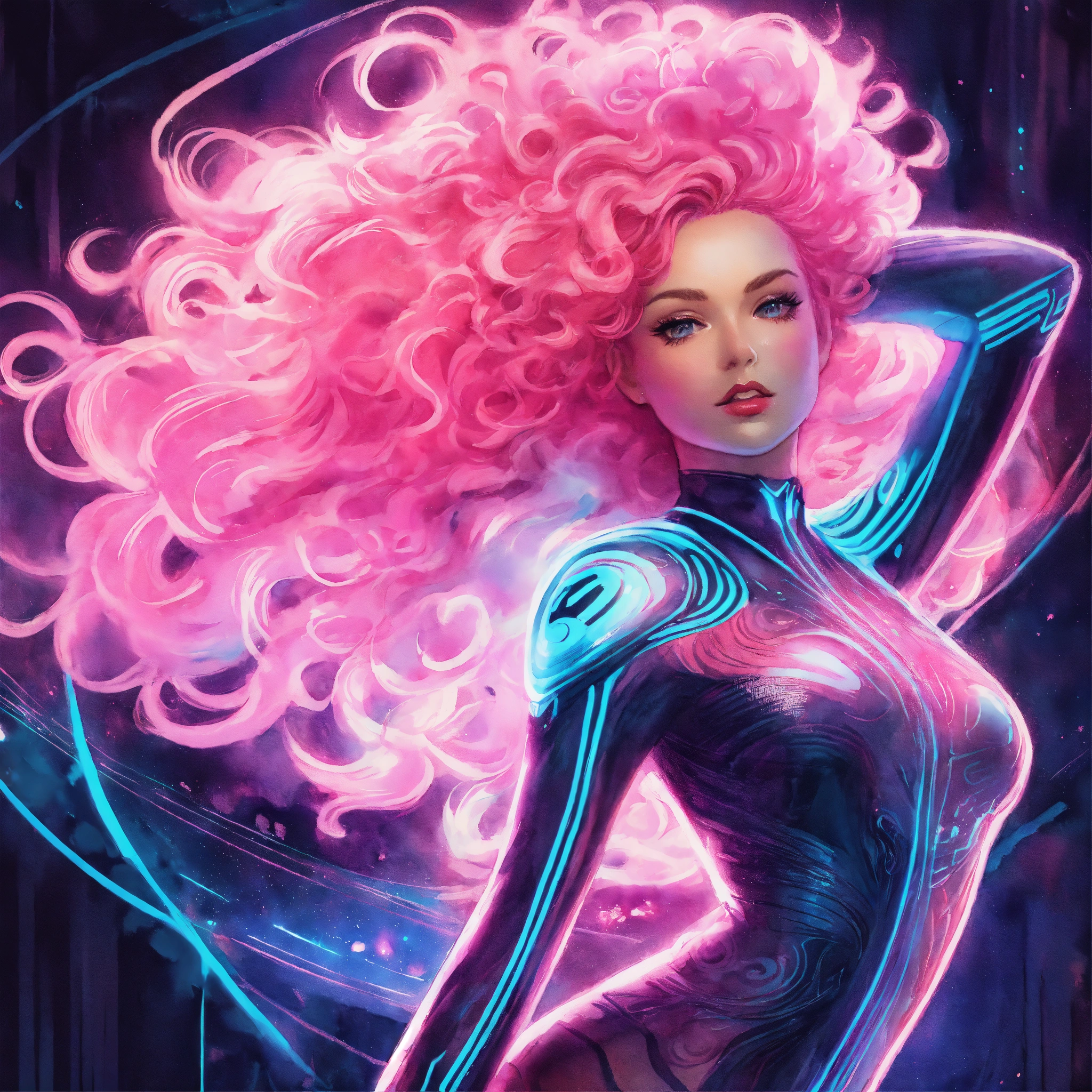 Beautiful tron siren, huge curly glowing pink retro hair, glowing tron bodysuit, neon, fantasy art, concept art, watercolor