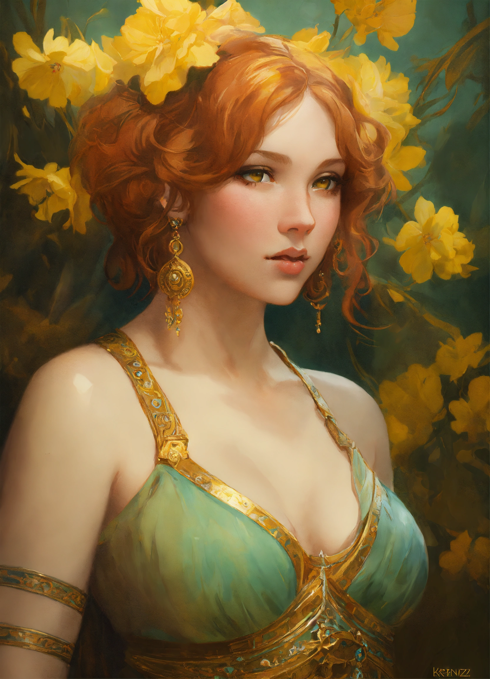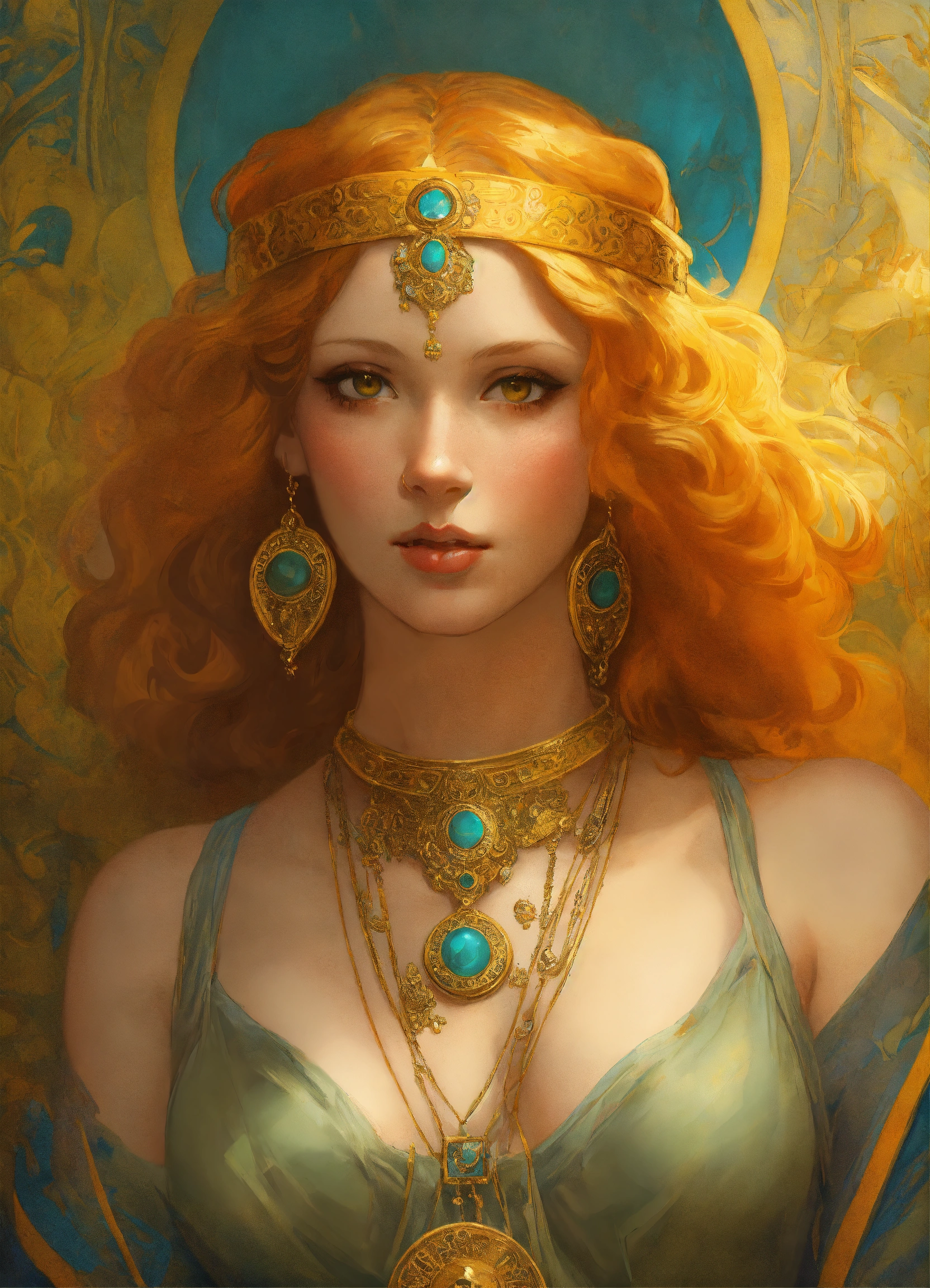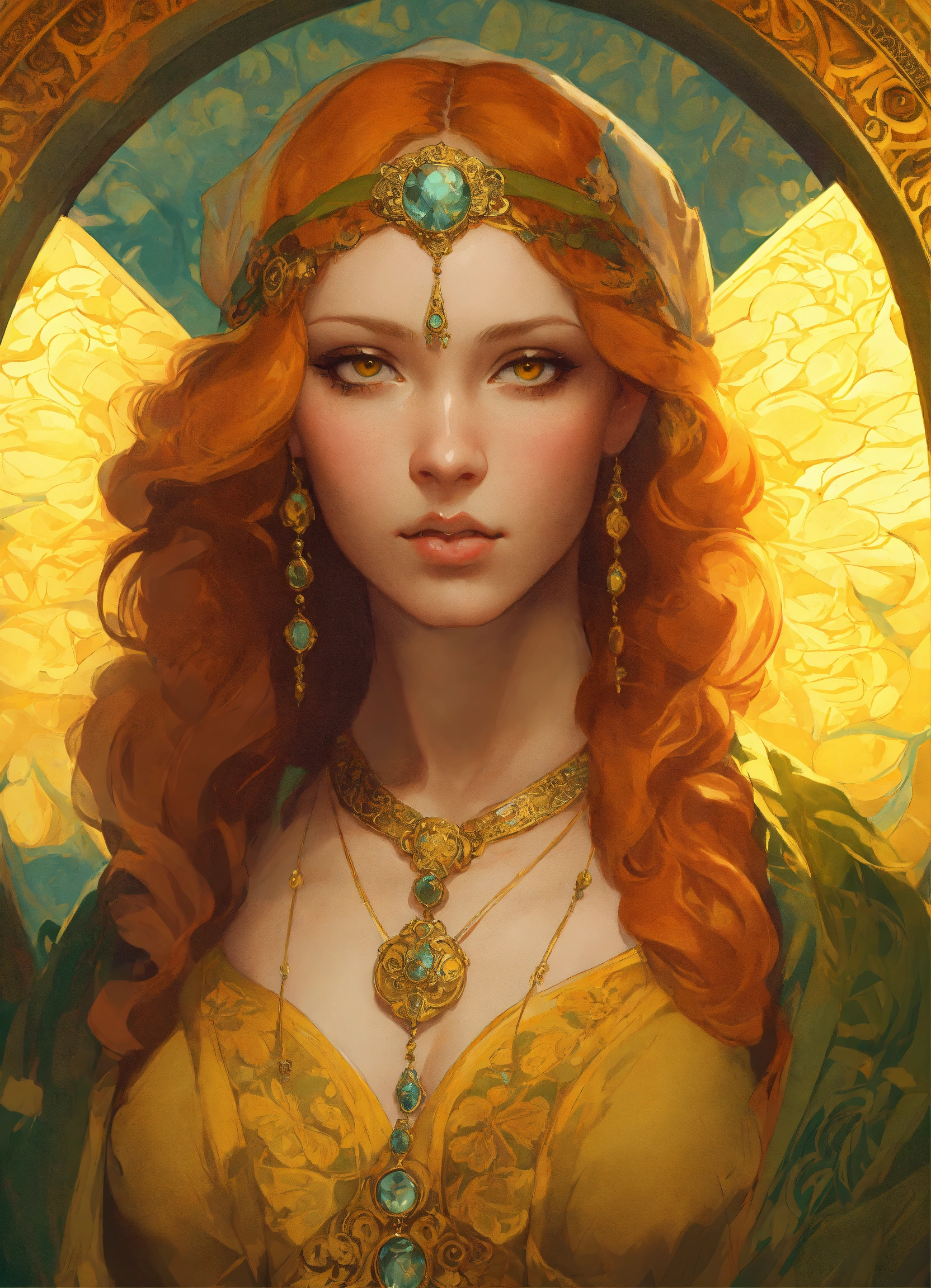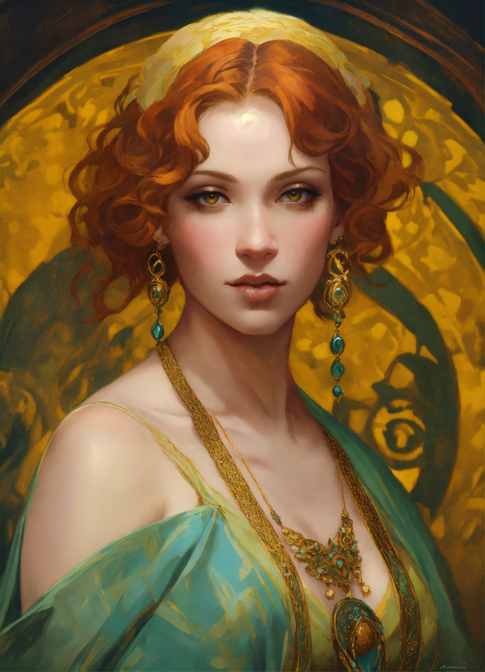 Portrait of a young christina hendricks, ultra detailed piercing yellow eyes, 20 years old, olive skin, short blonde hair, beautiful face, genie, belly dancer, highly detailed portrait, scifi, digital painting, artstation, concept art, smooth, sharp foccus ilustration, artstation hq, art by krenz cushart and donato giancola and william adolph bouguereau and alphonse mucha