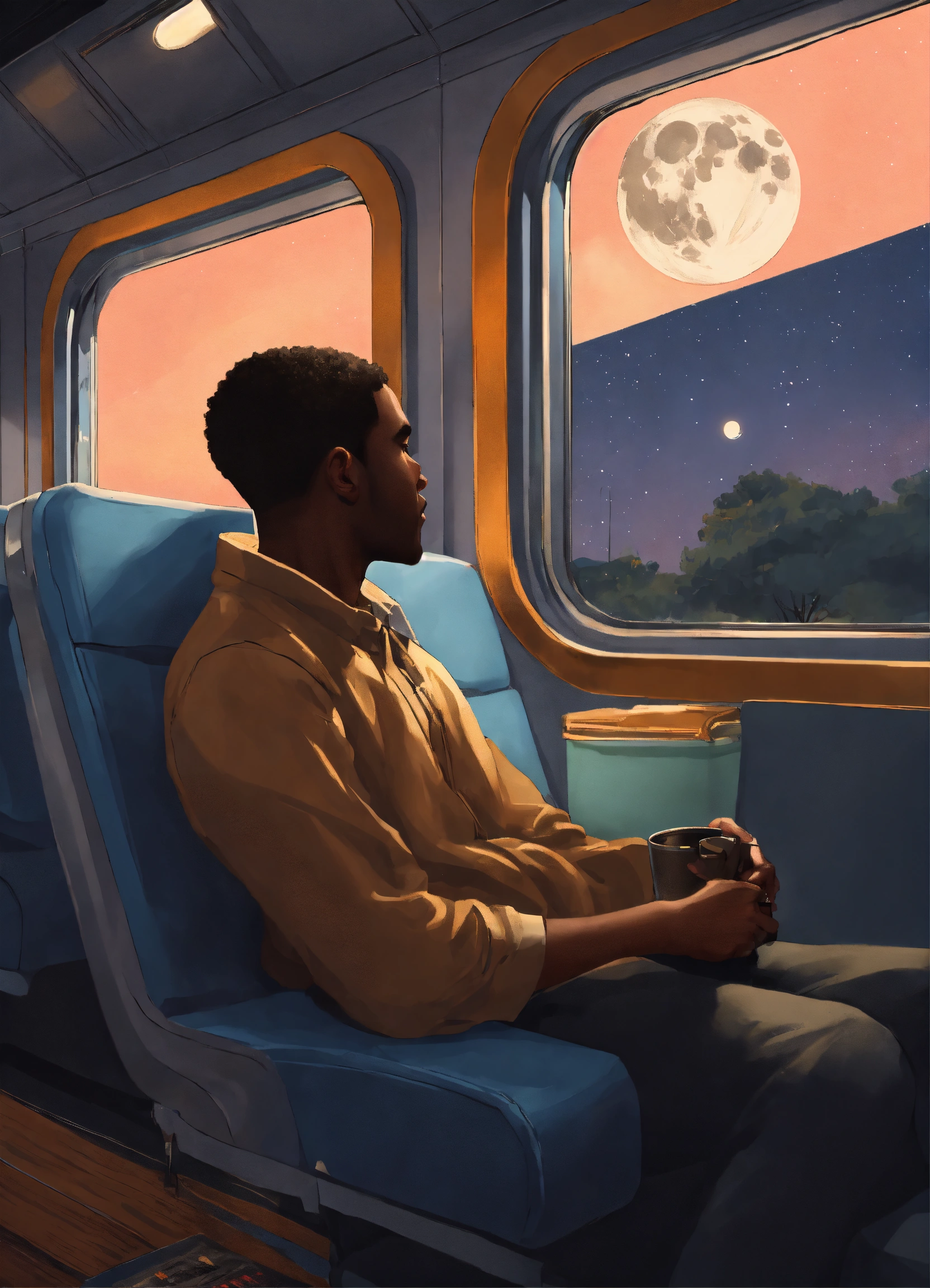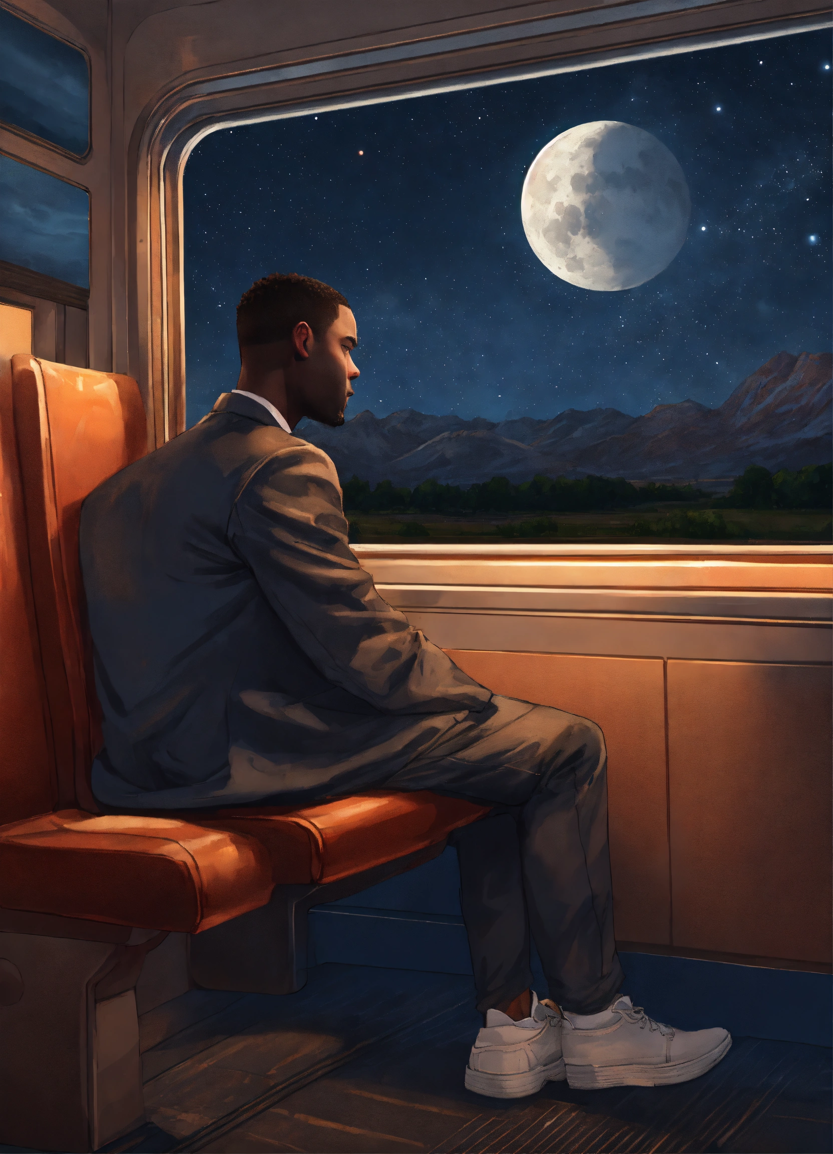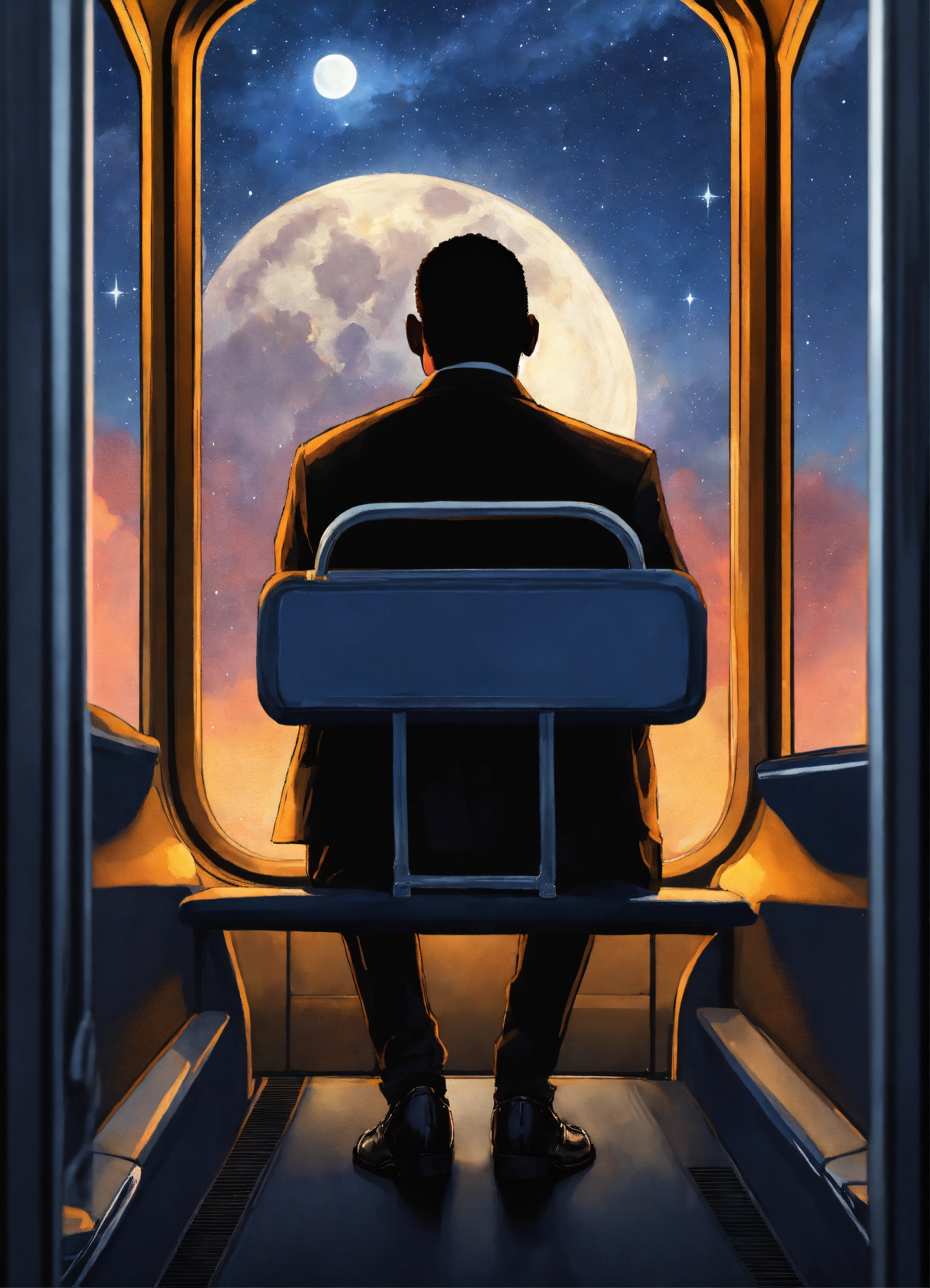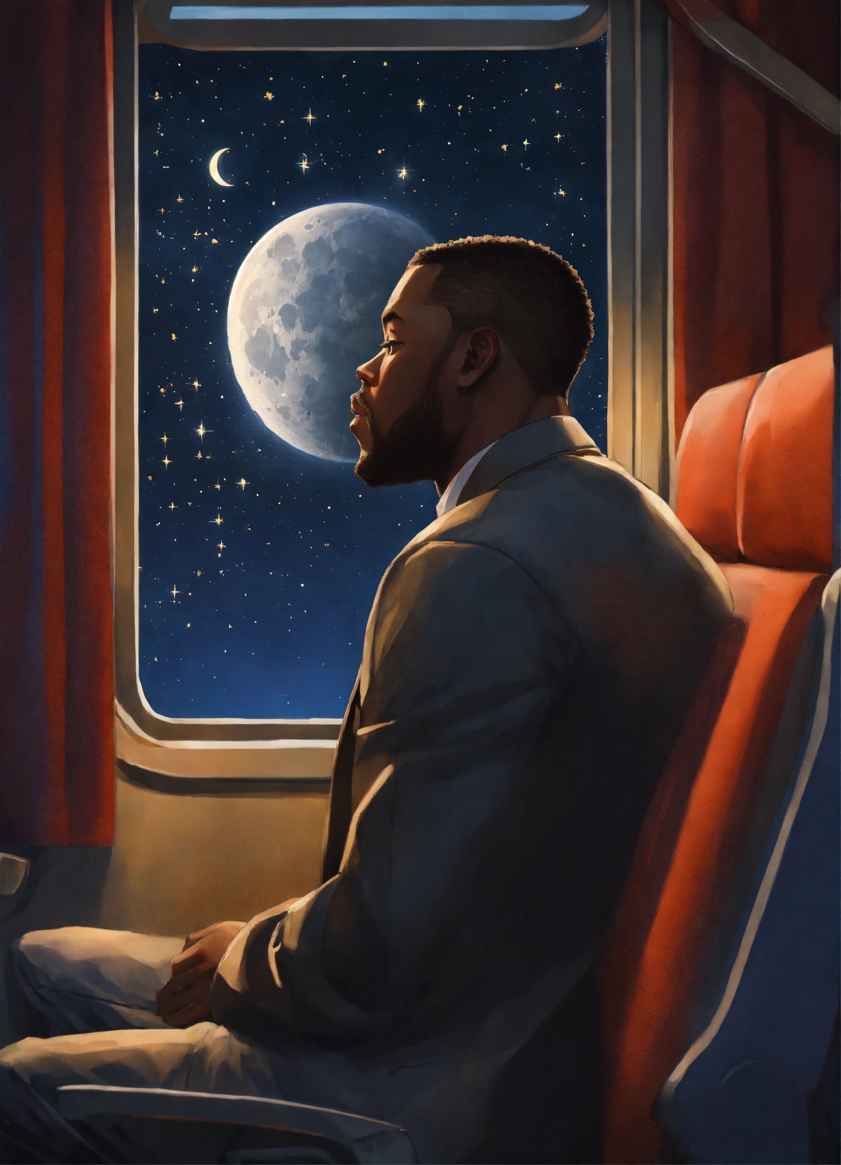 Realistic style. on a train we see from behind a black man sitting on a seat. the back of the chair hides his back and we see his head lowered, from behind. on the side 2 large windows overlooking a starry sky from which we see a discreet crescent moon