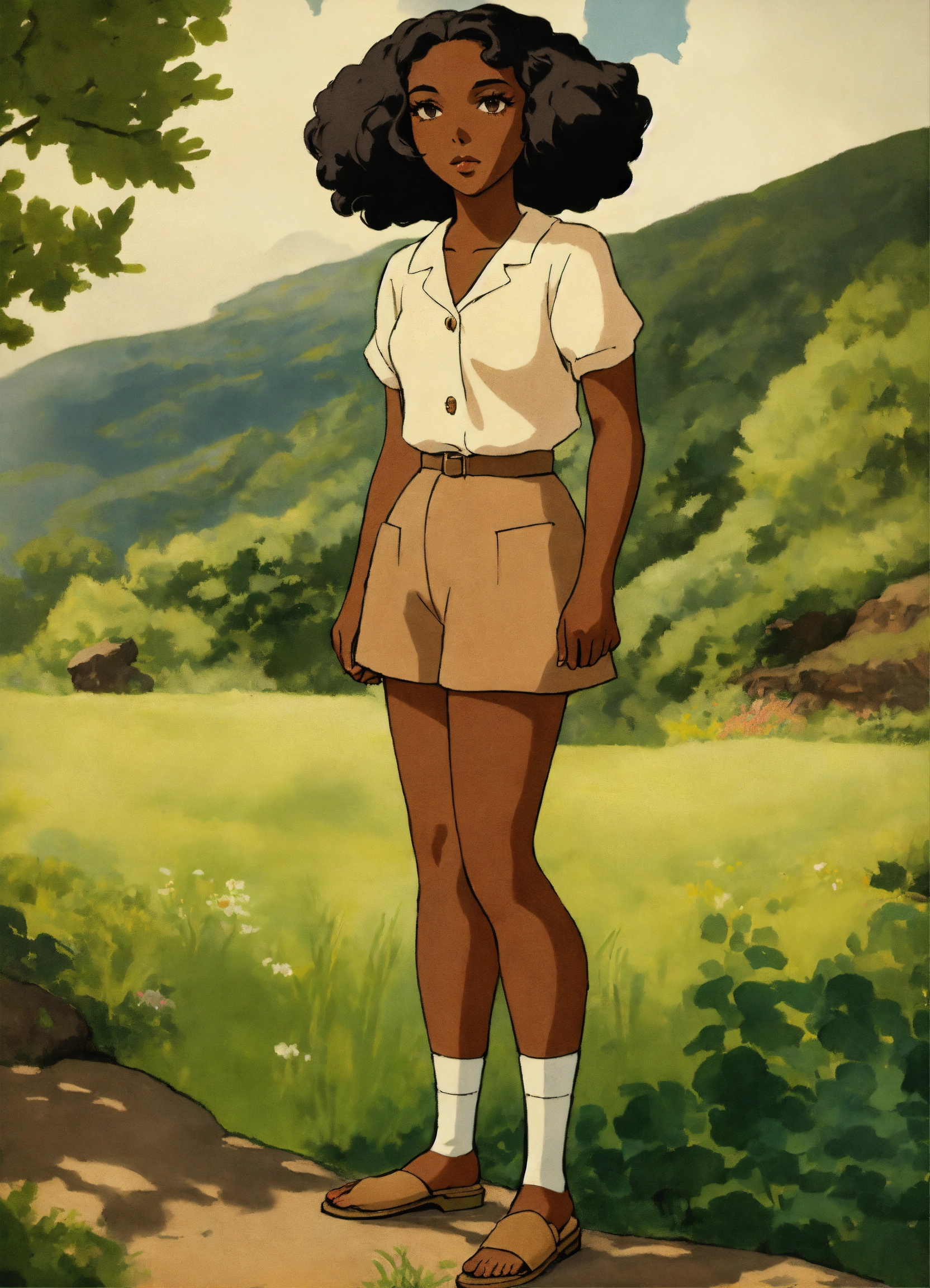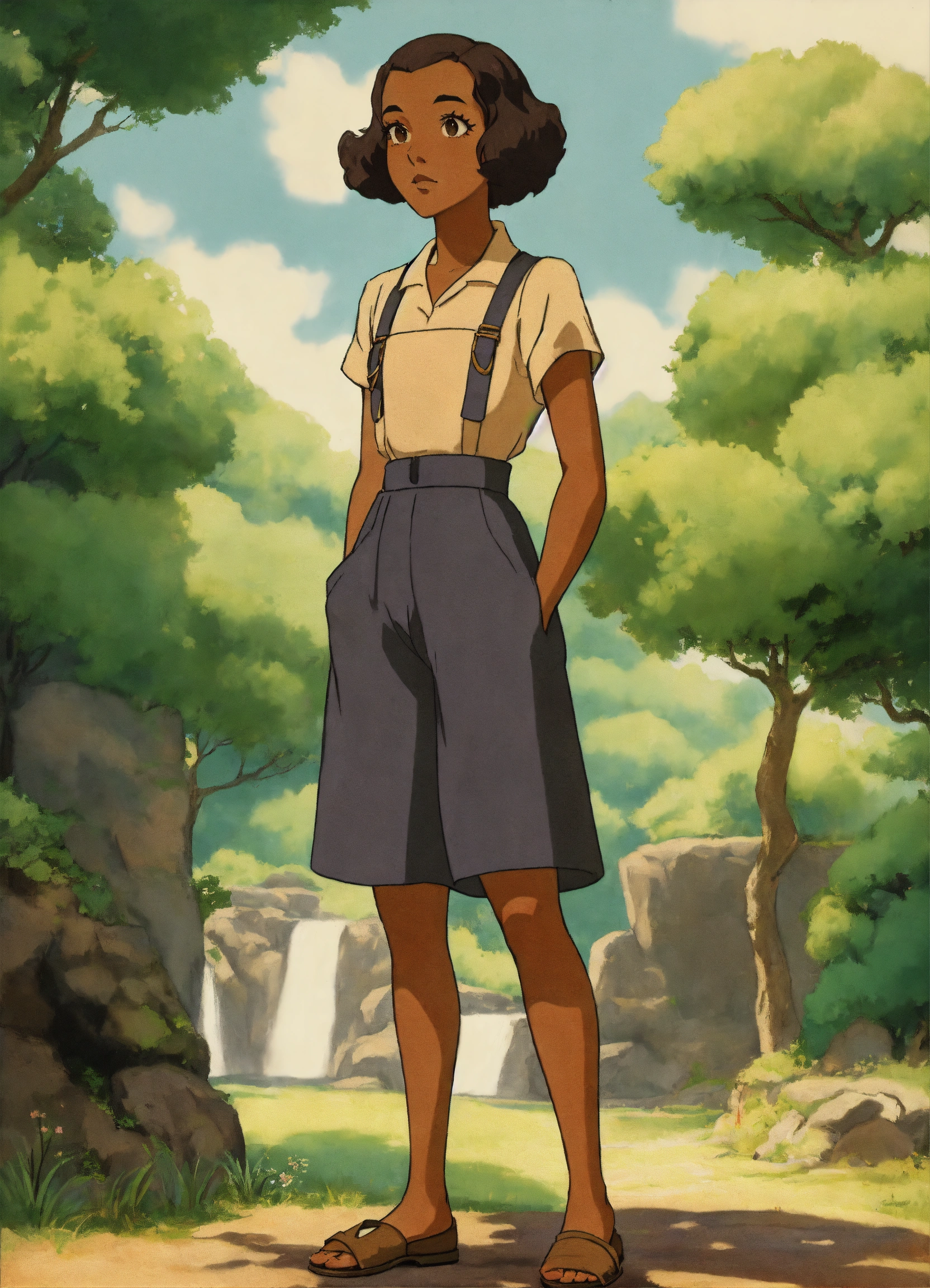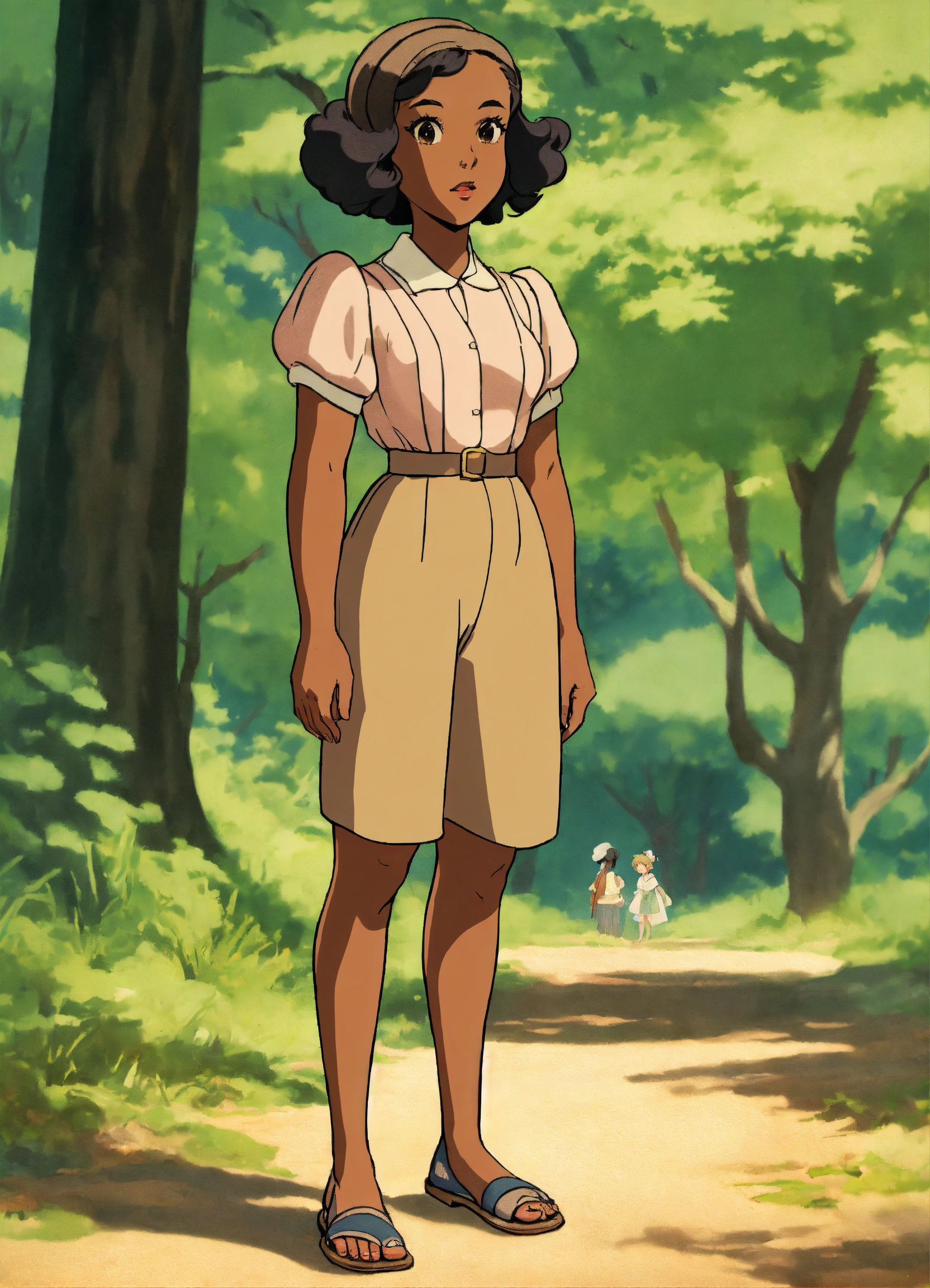 A 1930s head to toe picture of a light brown-skinned black woman with shorrt 1930s hairstyle, very wide-nose, standing in a glen with bare feet by studio ghibli.