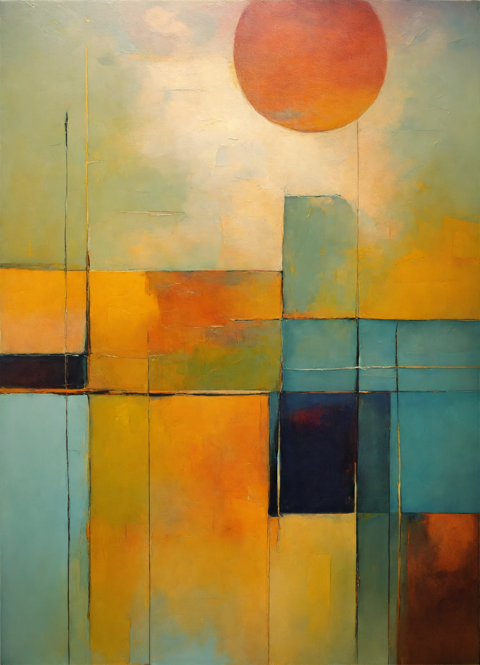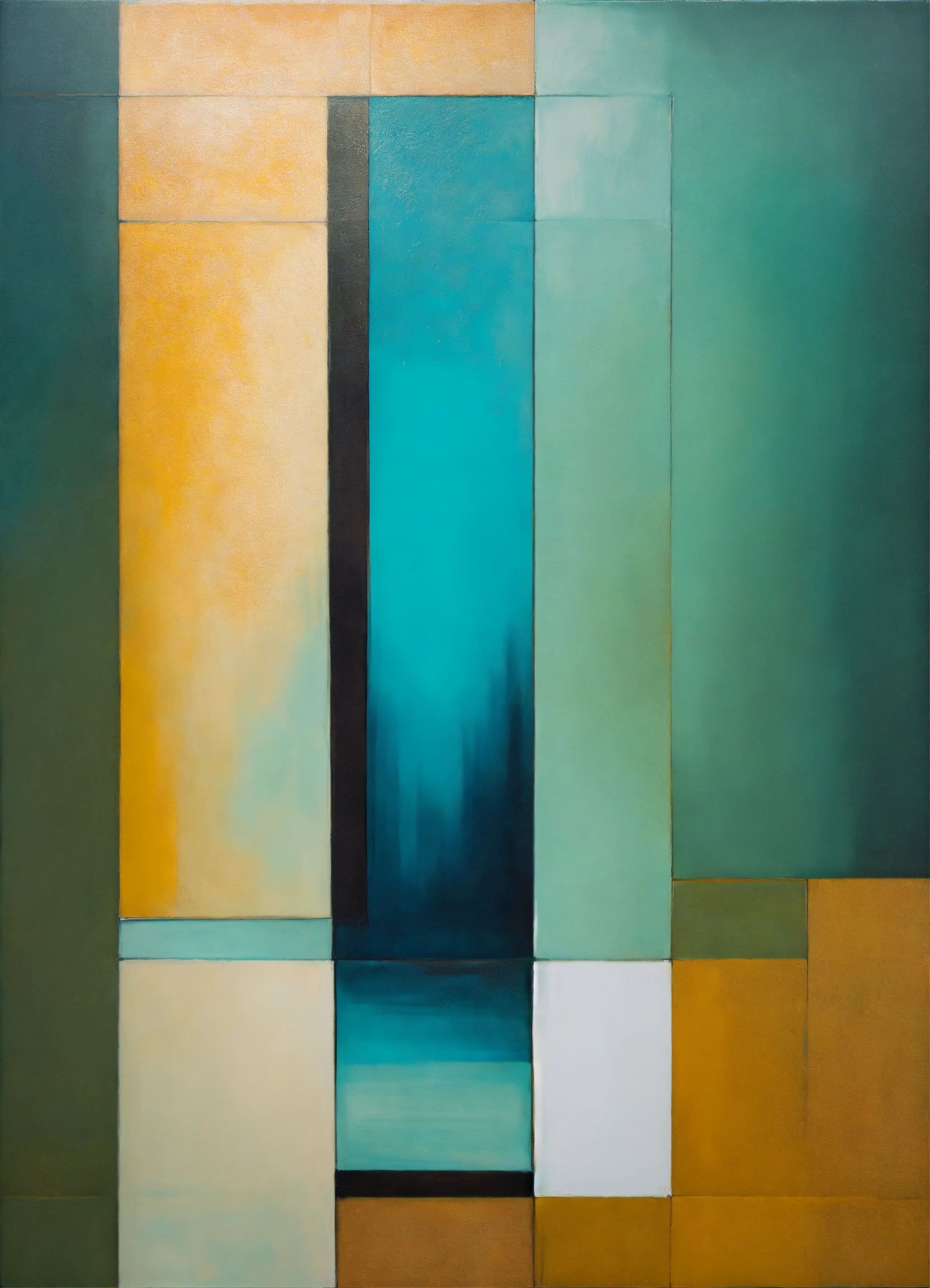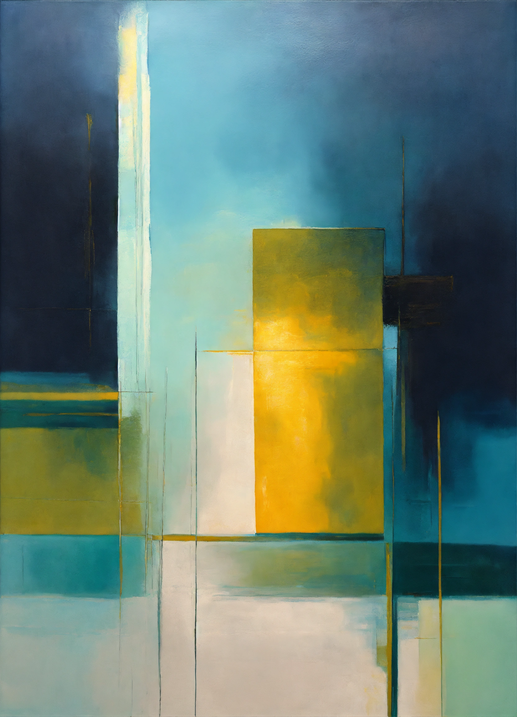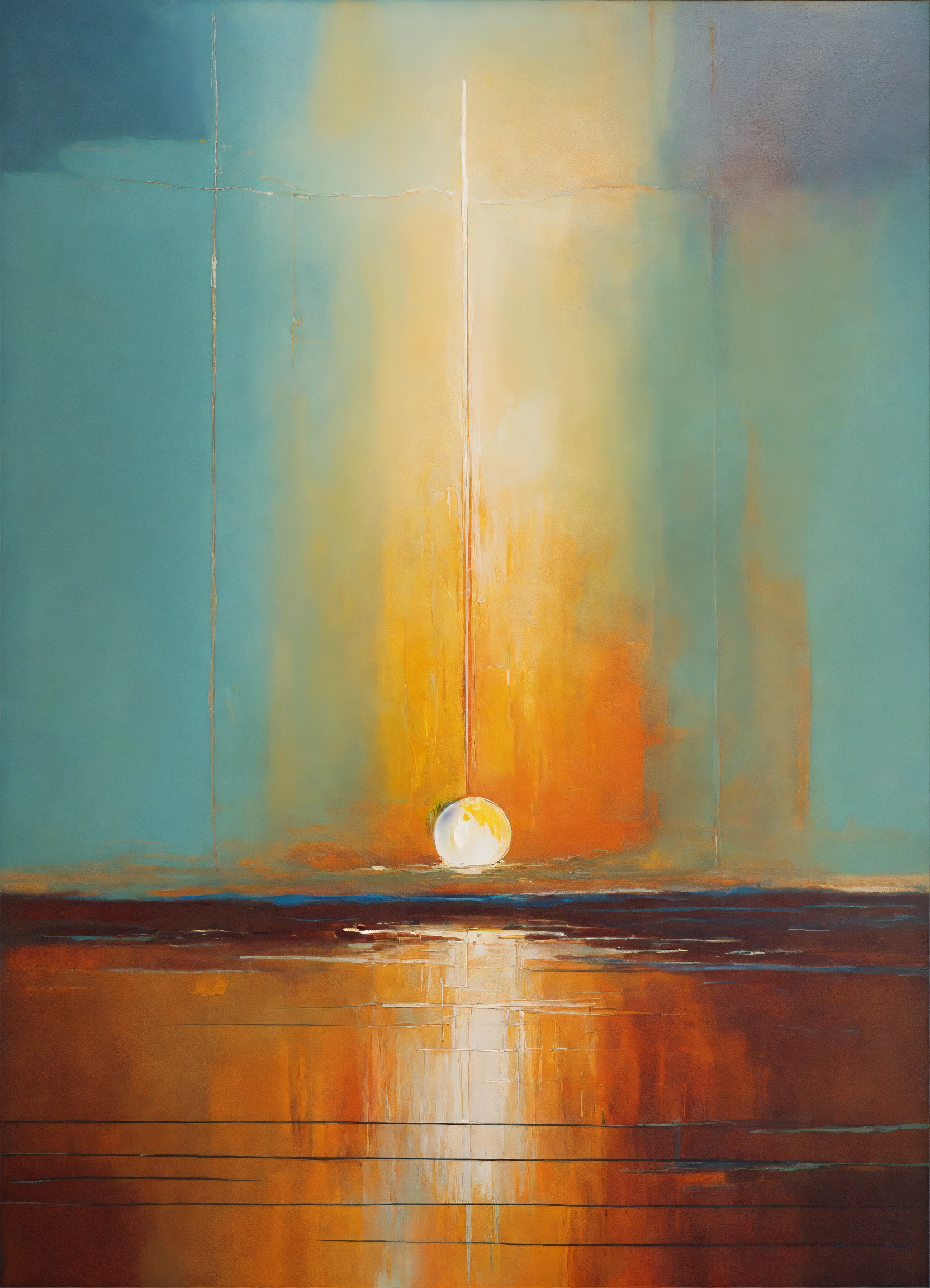 Abstract and minimalist oil painting of spiritual transformation with cool tones