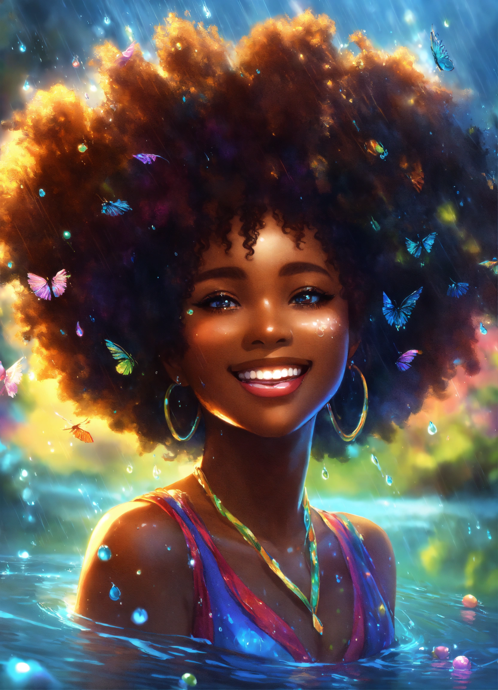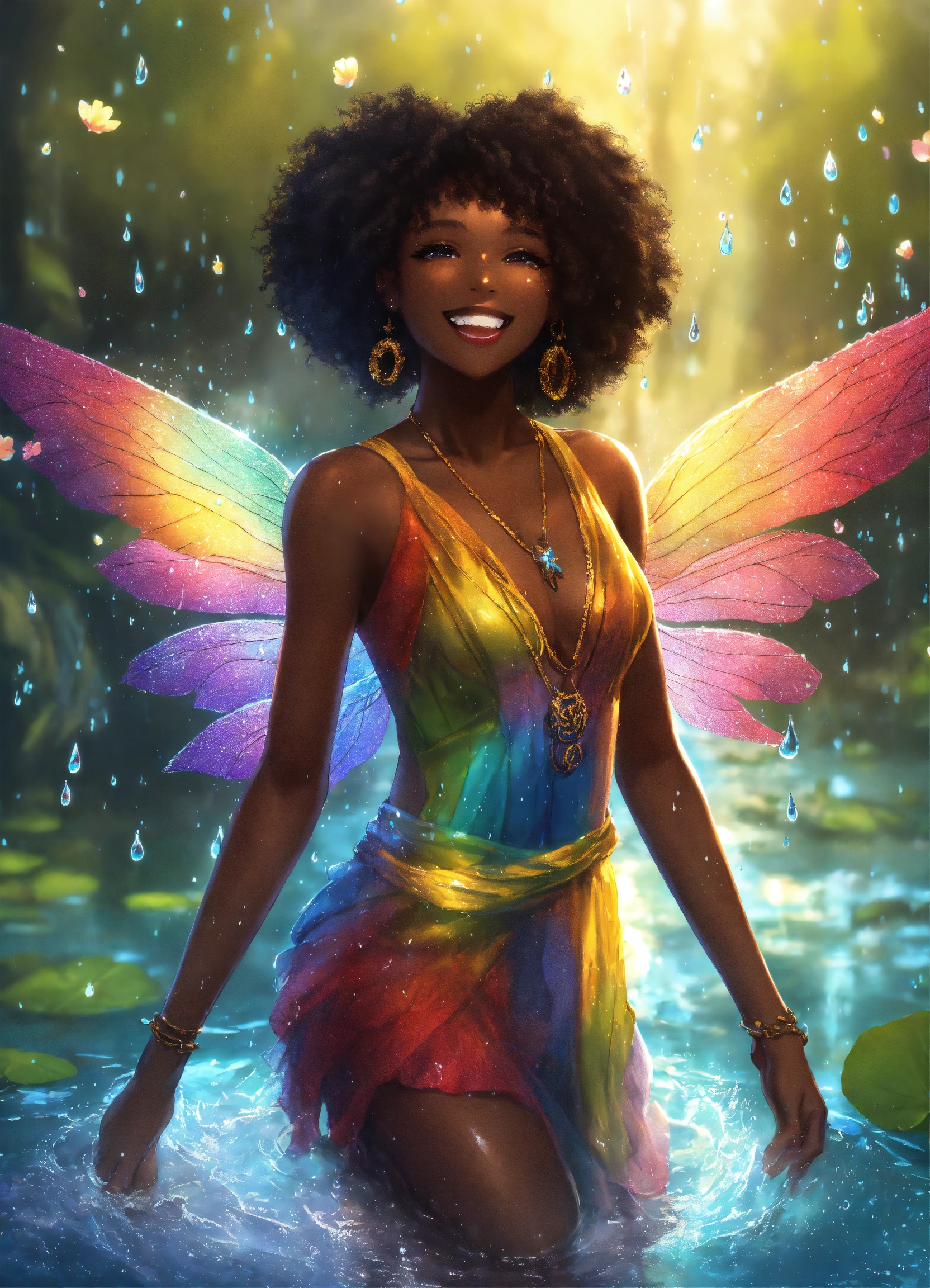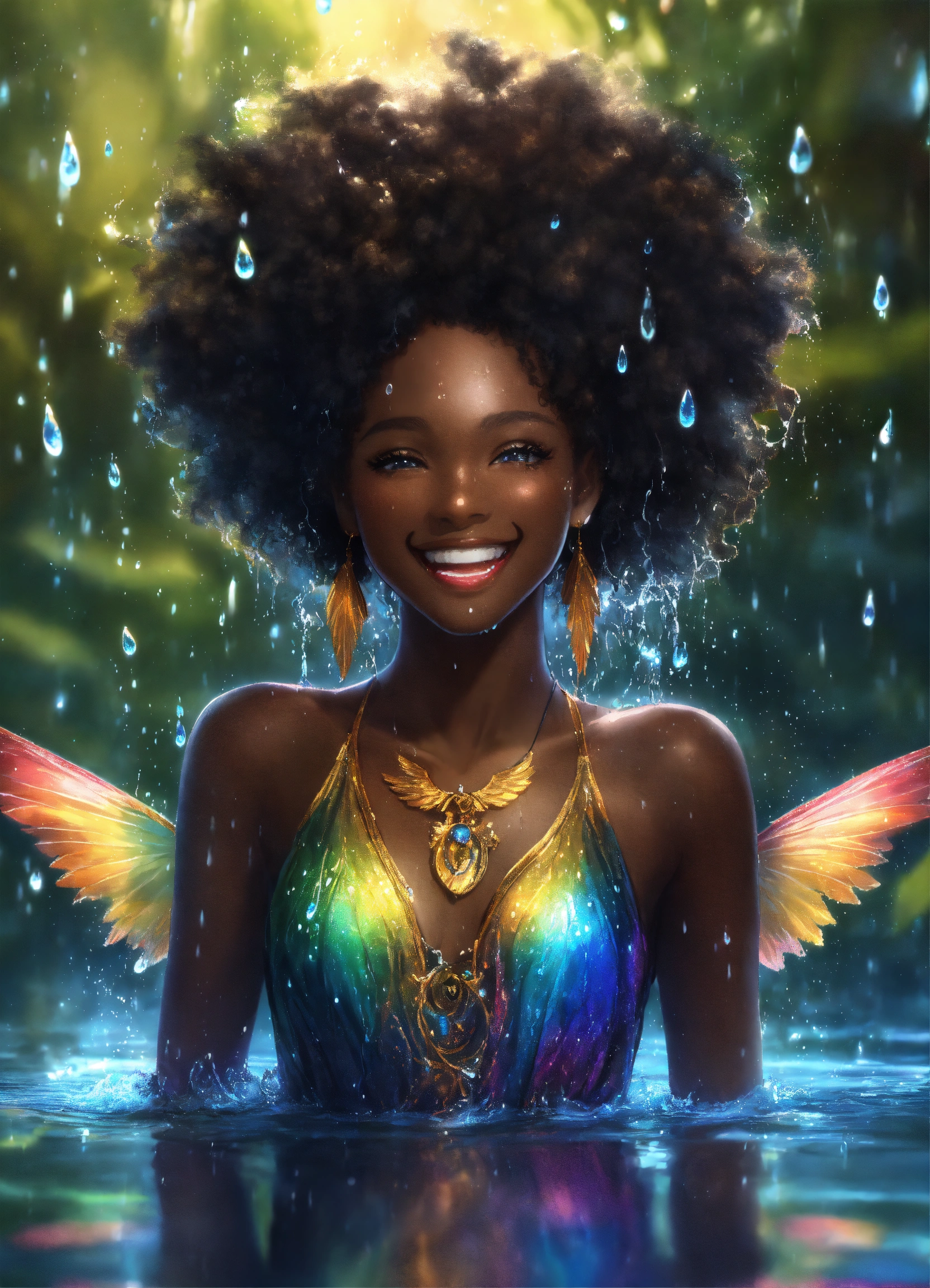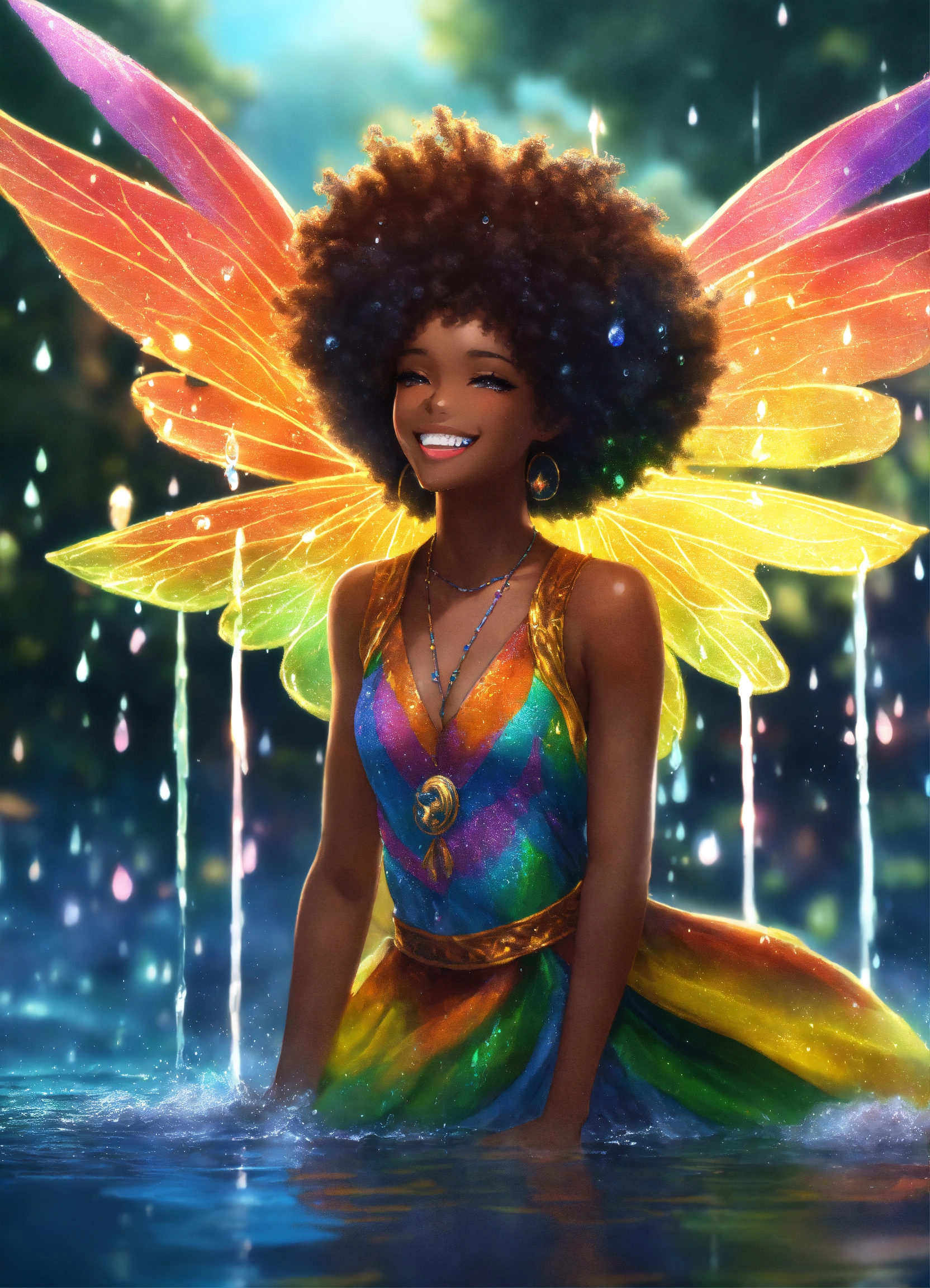 Smiling african american afro fairy in water dress, rainbows, rain drops, ((wings made of splash water)), joyful ebony grinning dark-skinned sprite happiness-filled black fairy beaming melanin pixie cheerful afro ethereal being surrounded by water particles above a serene pond, magic, trending on artstation, deviantart, anime key visual, official media, professional art, 8 k uhd