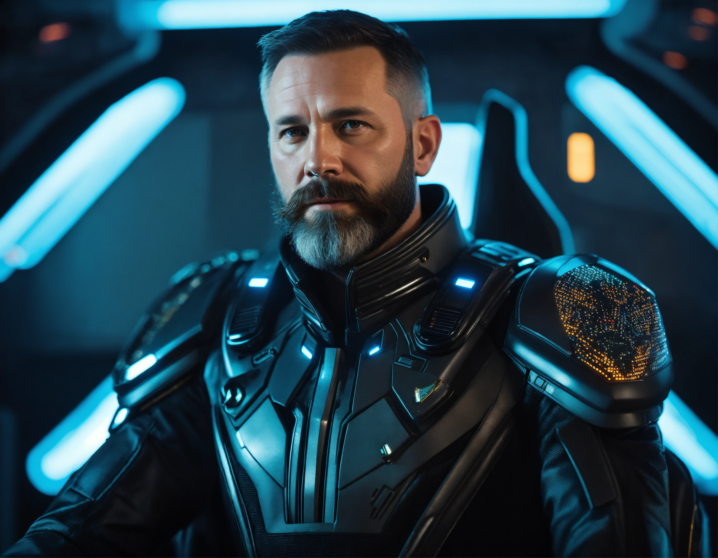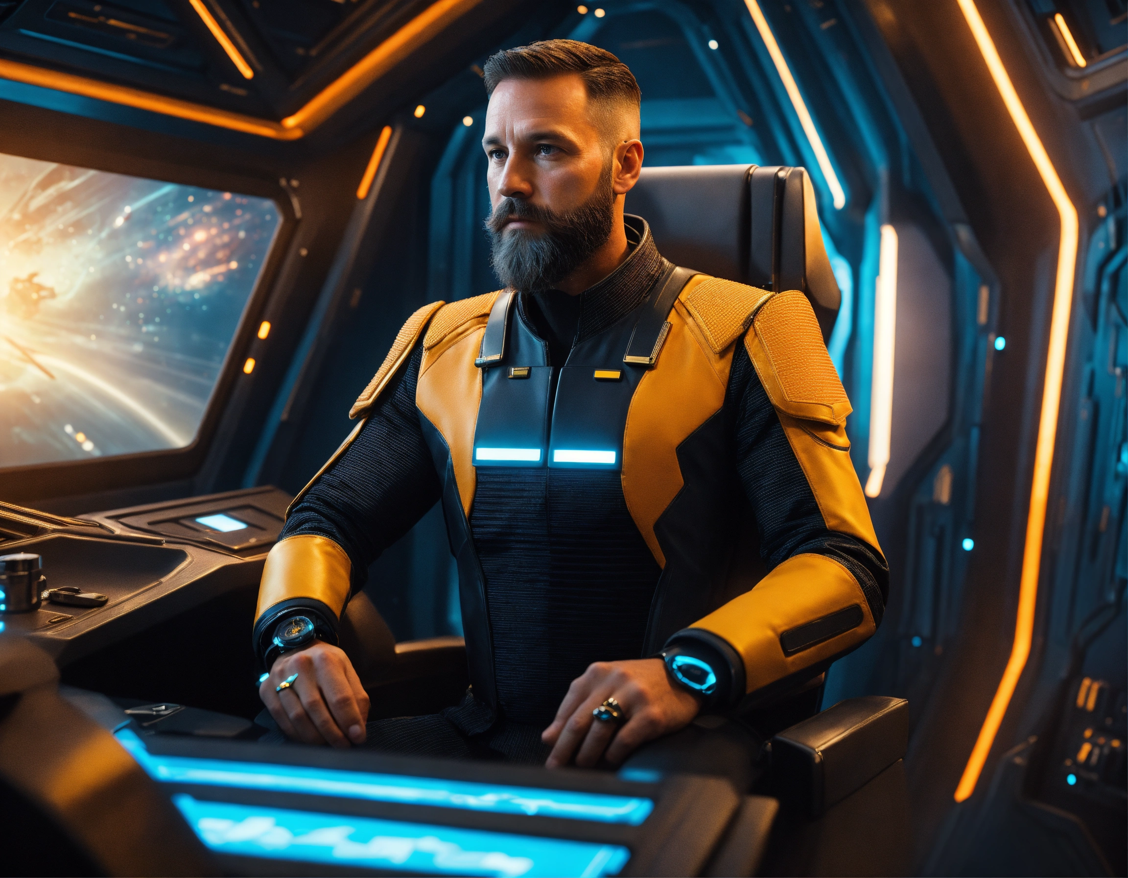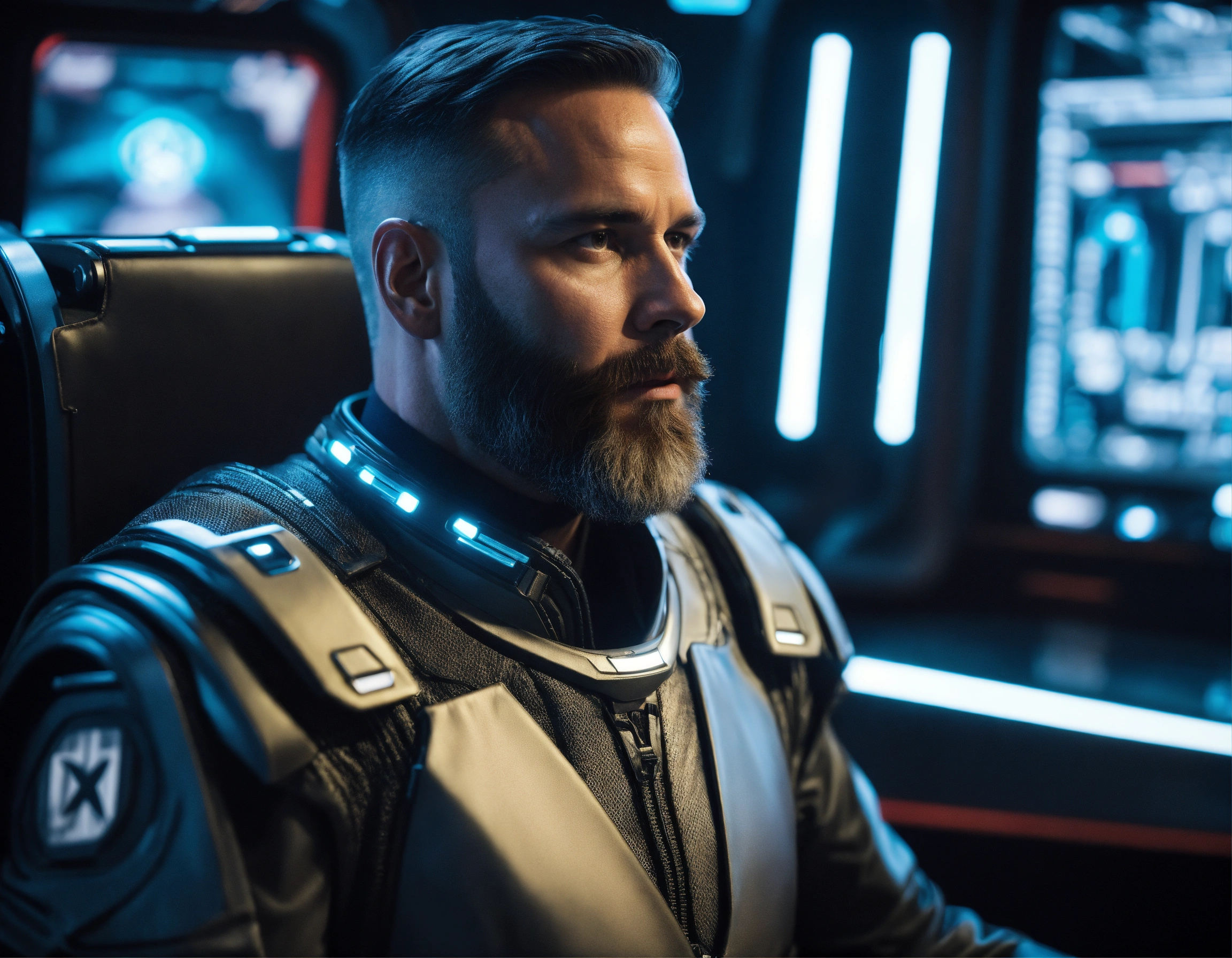 40 year old masculine star commander general with trim beard is wearing a sleek futuristic uniform sitting in a hi tech on an alien starship, 8k, tron, realistic