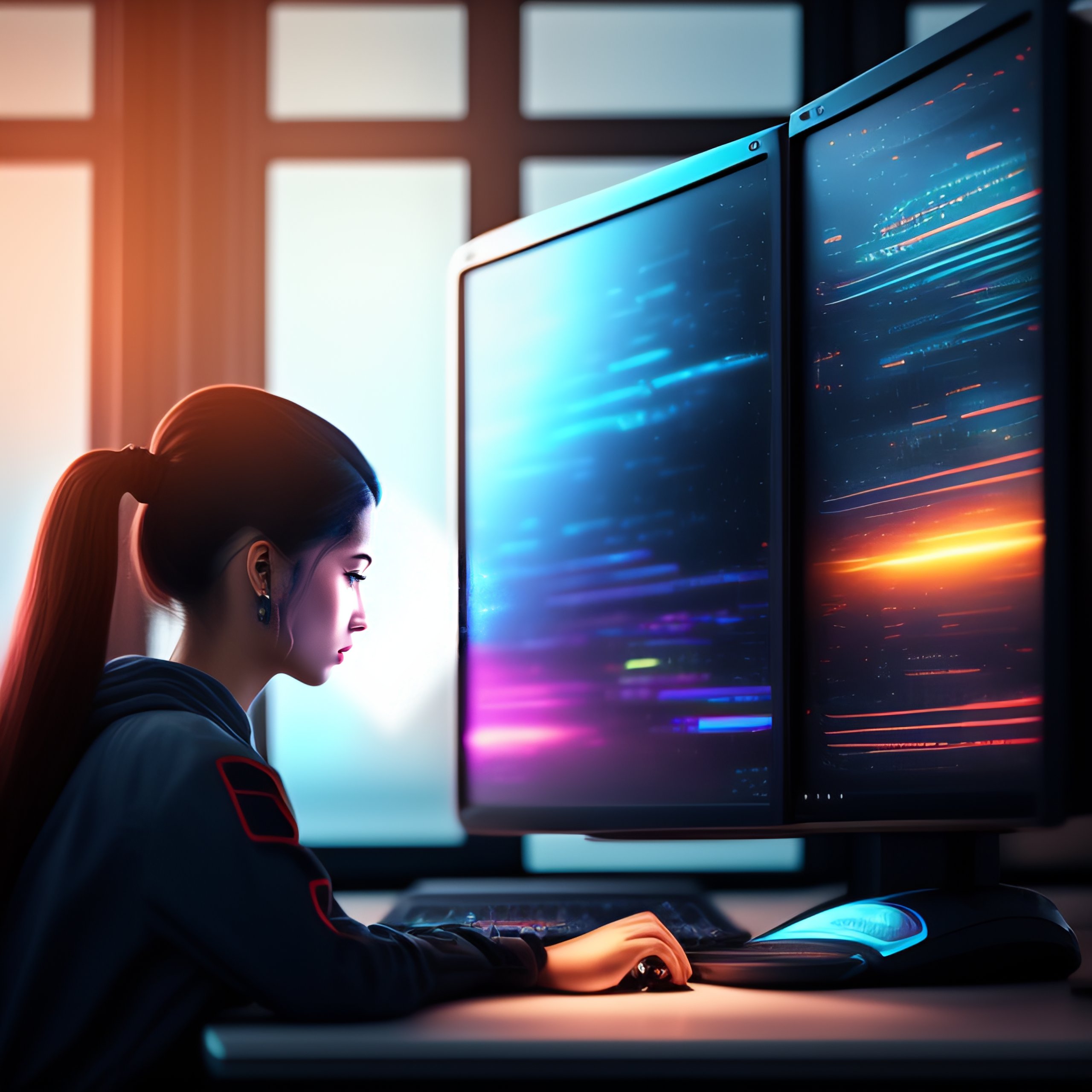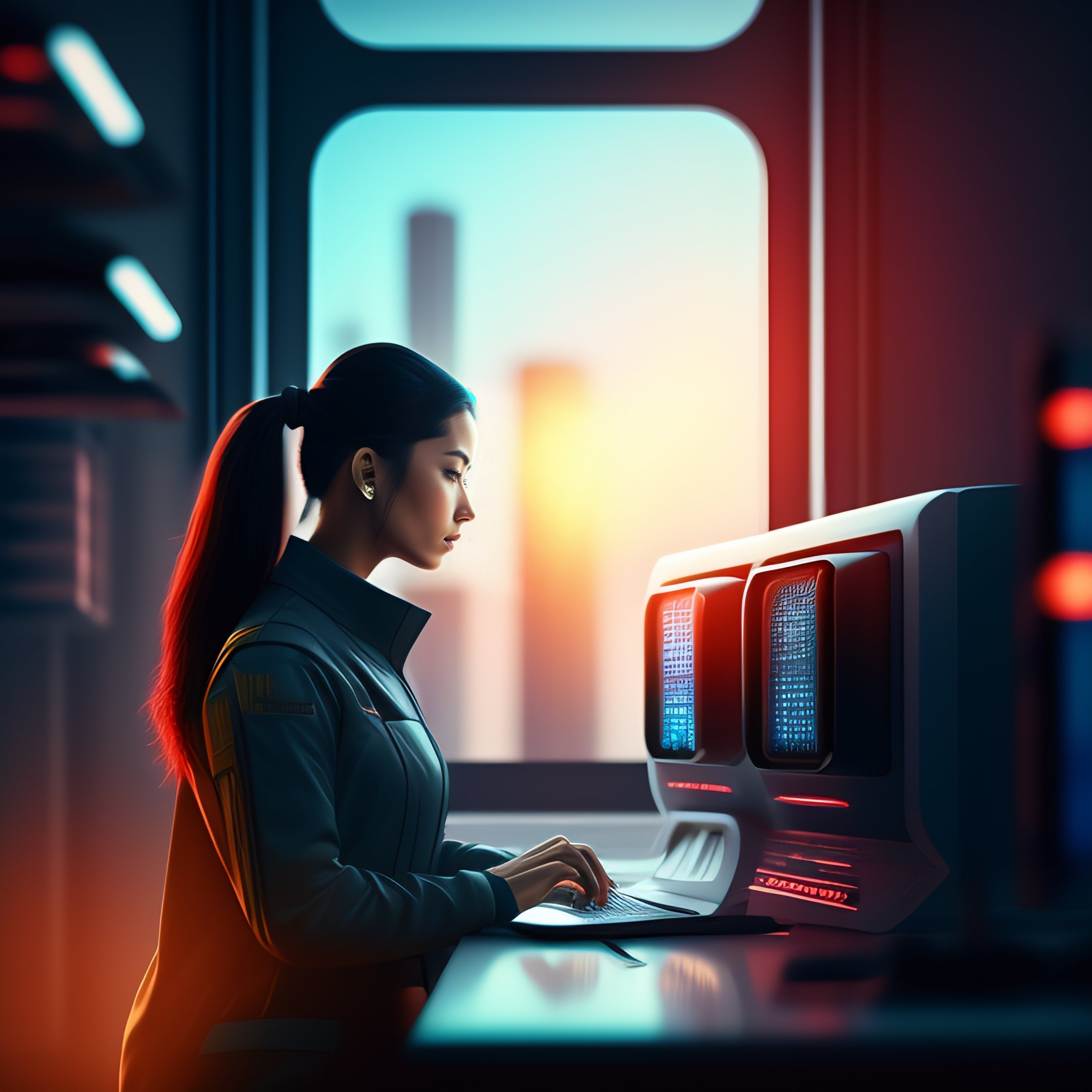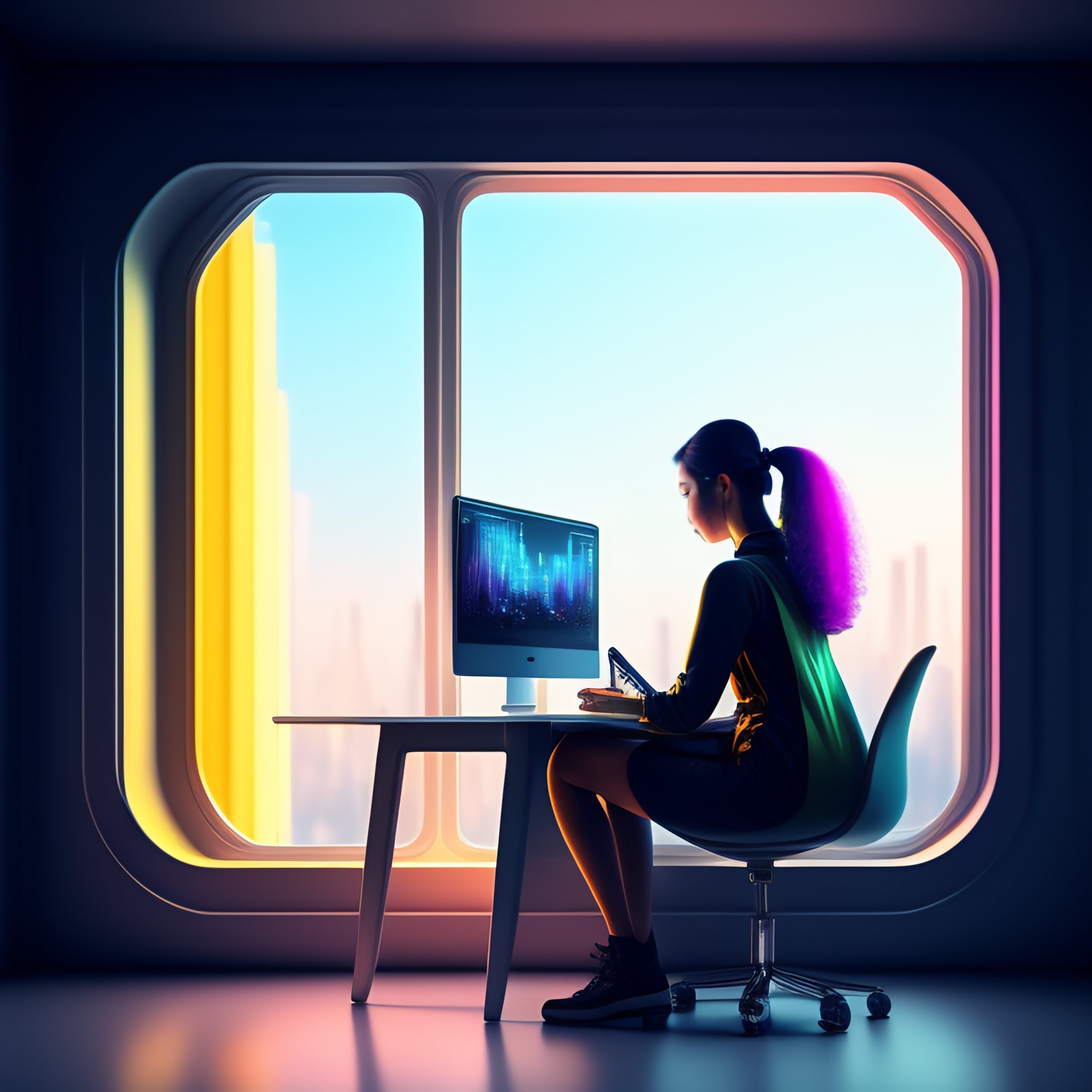 A girl working on a computer in a small room with a big window, futuristic outside, cyberpunk style, 8k, sharp focus, digital art, sci fi concept art