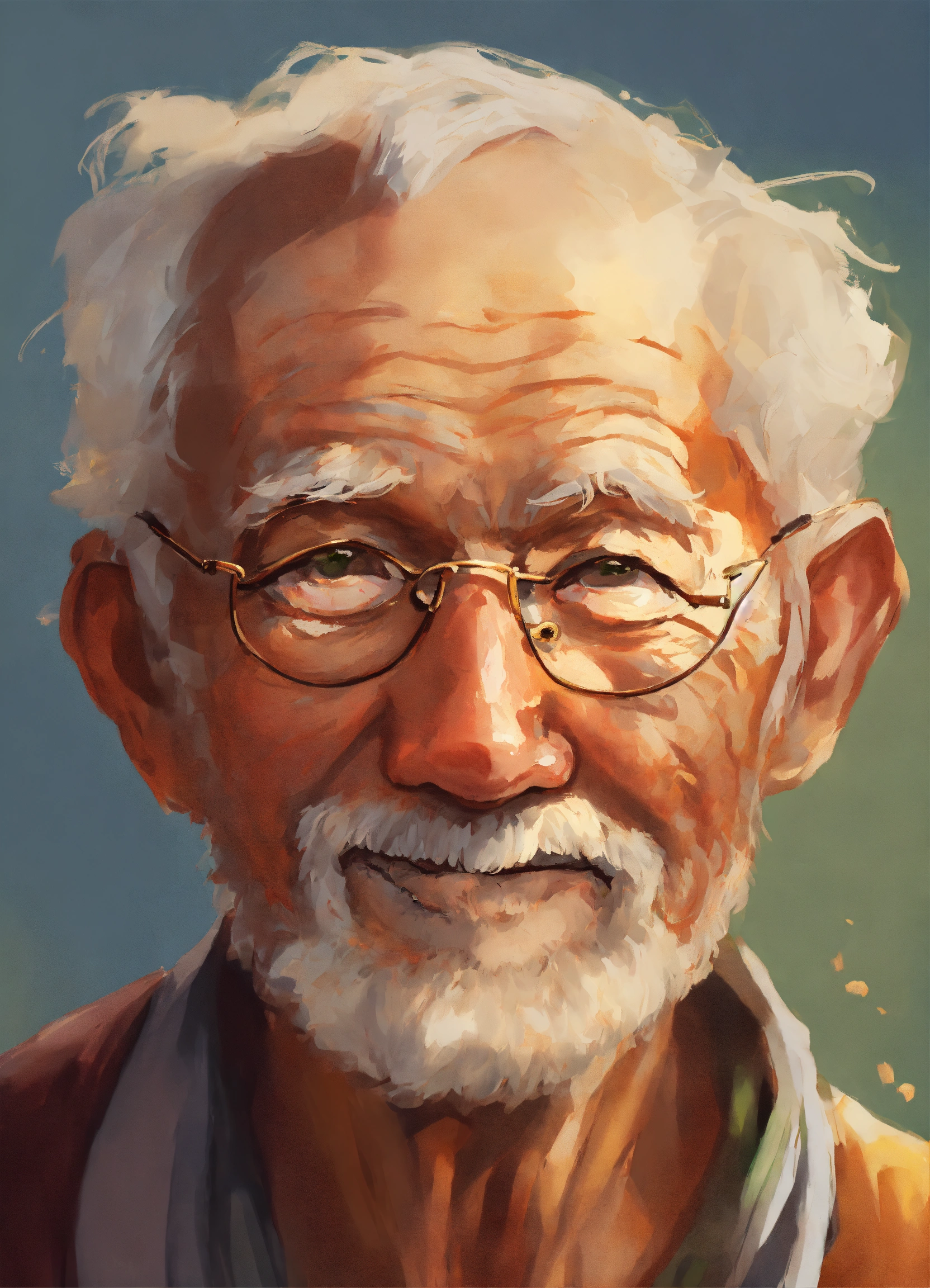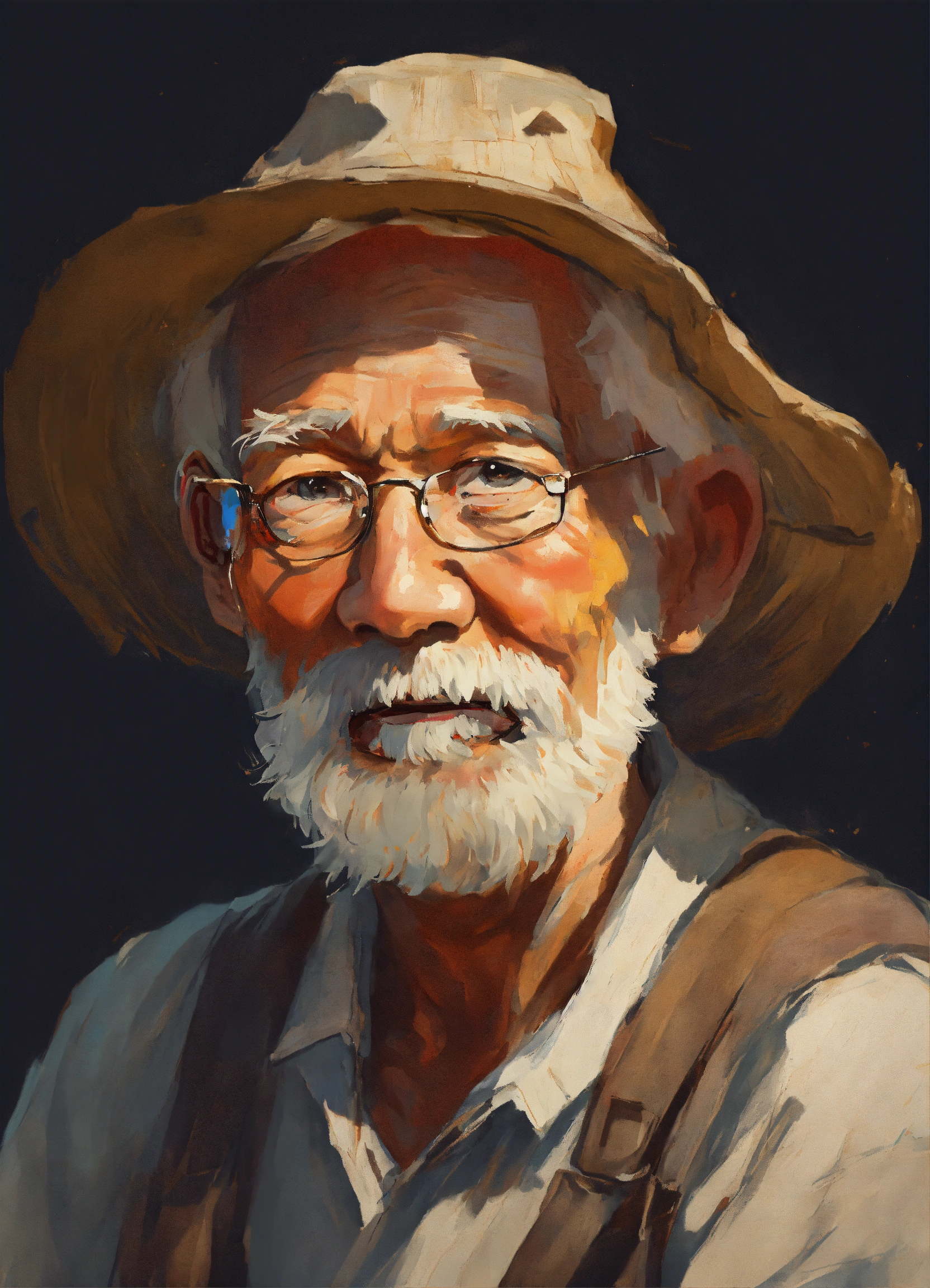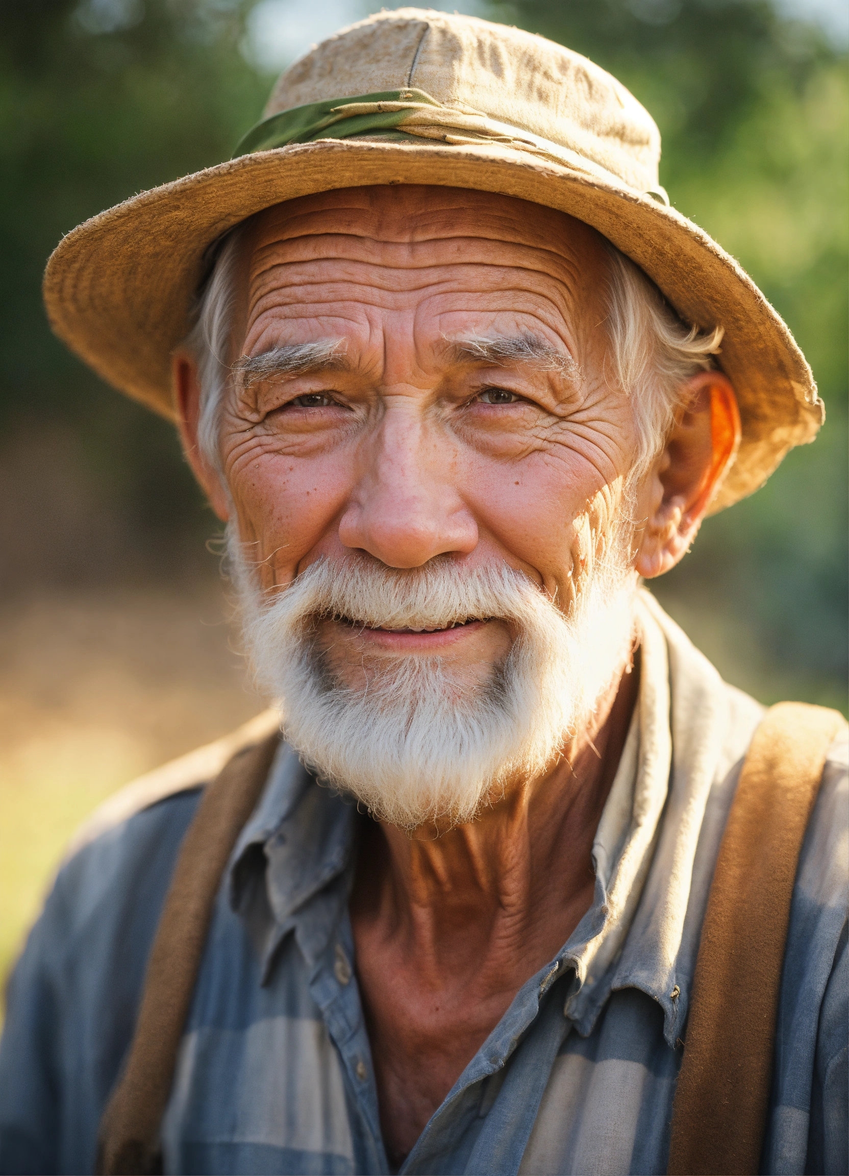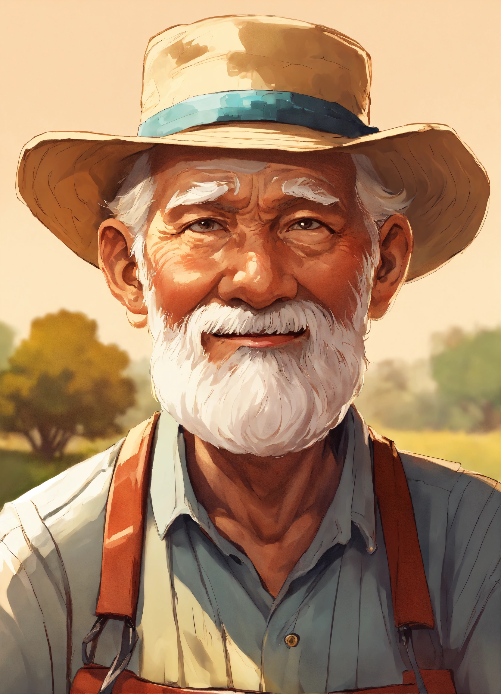 Please draw a half-length portrait of an old farmer. he is white, has a sloppy style, and has a bright and cheerful face.