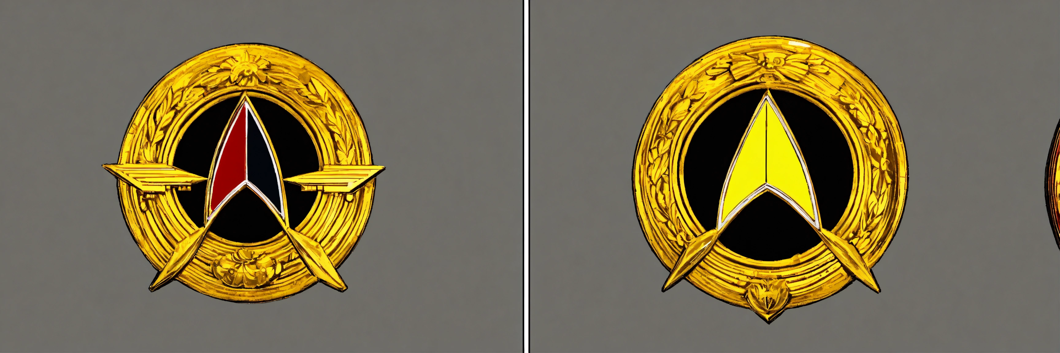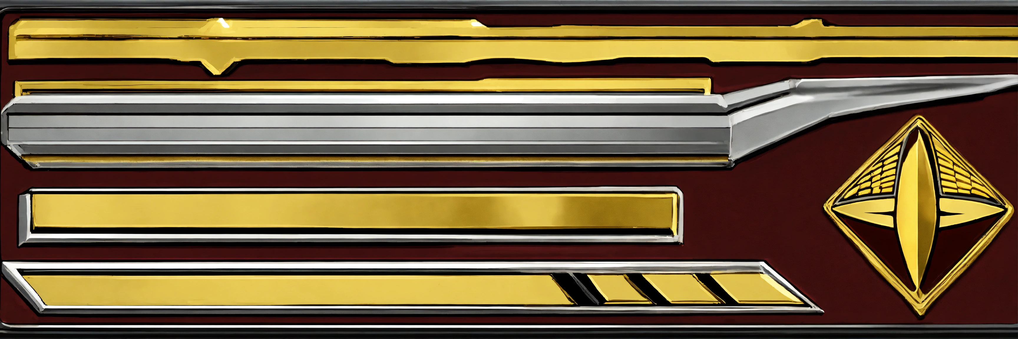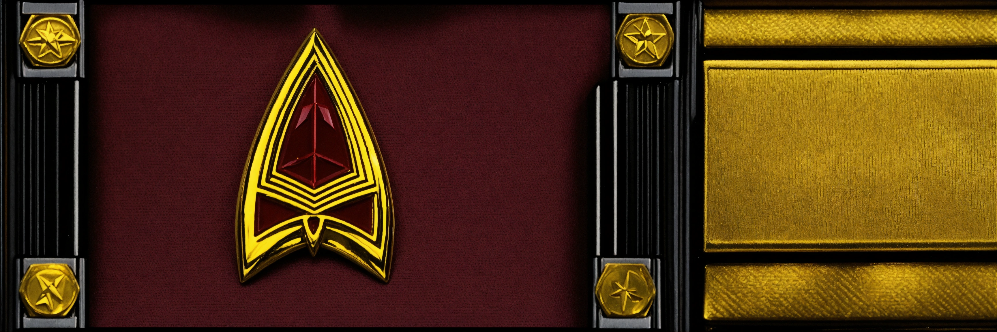 Create an image depicting the crew of a starfleet ship. the crew should consist of men and women wearing 'monster maroon' style uniforms from the movie era. the uniforms should be burgundy (dark red) in color and feature a double-breasted jacket with a black stripe along a sealing mechanism. officers should have a stylized gold rank pin behind the starfleet emblem (the arrowhead) on the left chest, while enlisted personnel should not. all crew members should wear a colored strap over the right shoulder to close the tunic, to which a rank pin is attached. additionally, there must be an andorian among the crew members. all crew members should wear a black belt with a buckle shaped like the starfleet arrowhead enclosed in a circle, all in gold, complete with the original series (tos) starfleet emblem on the buckle.