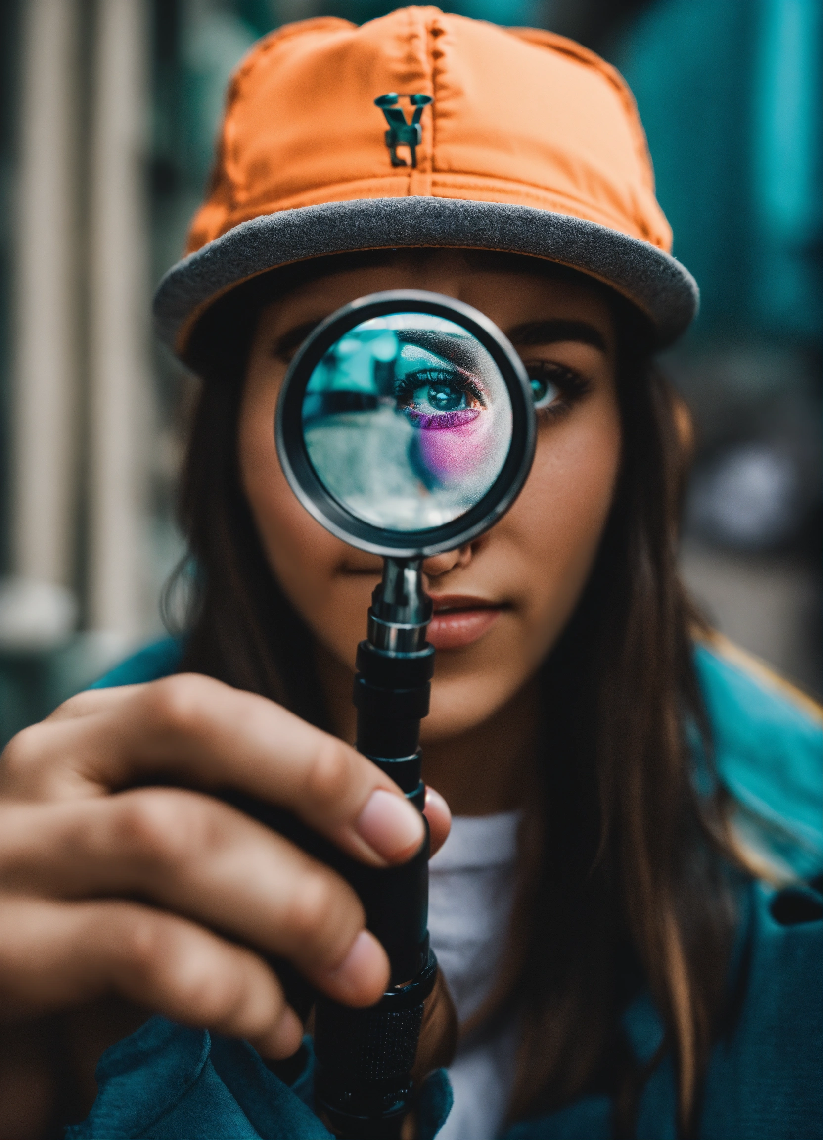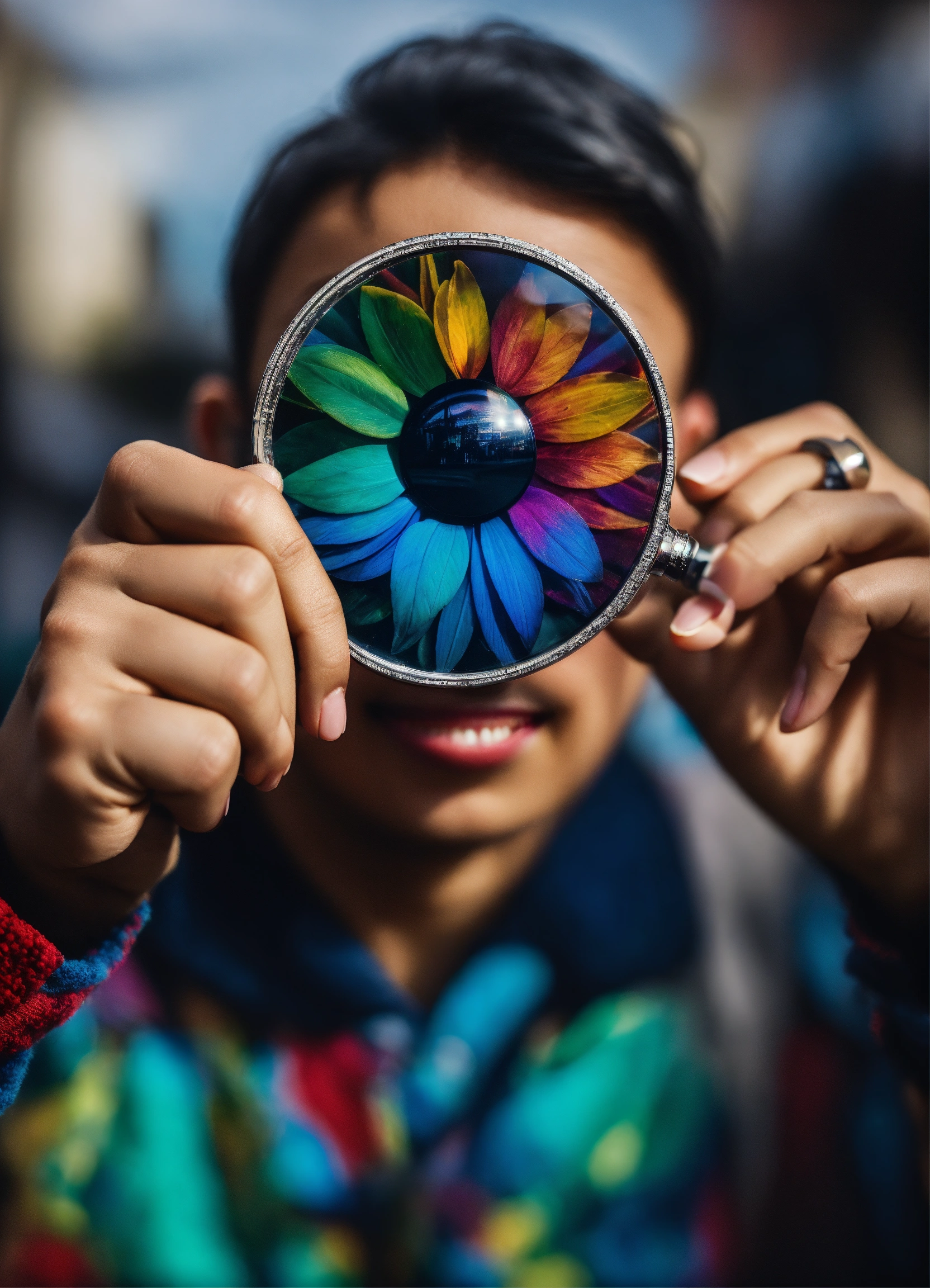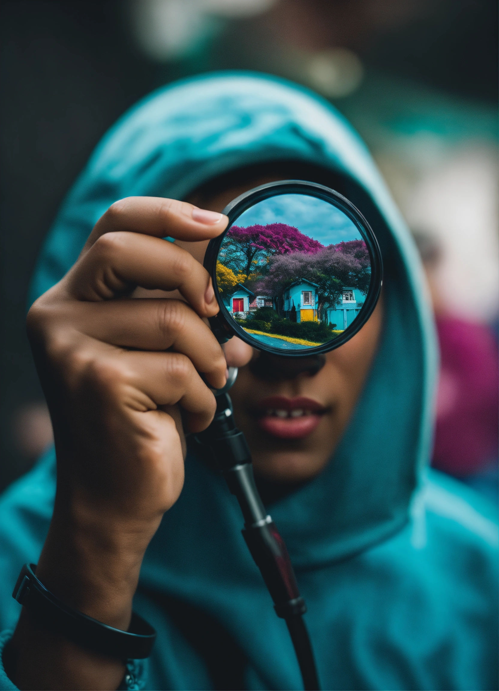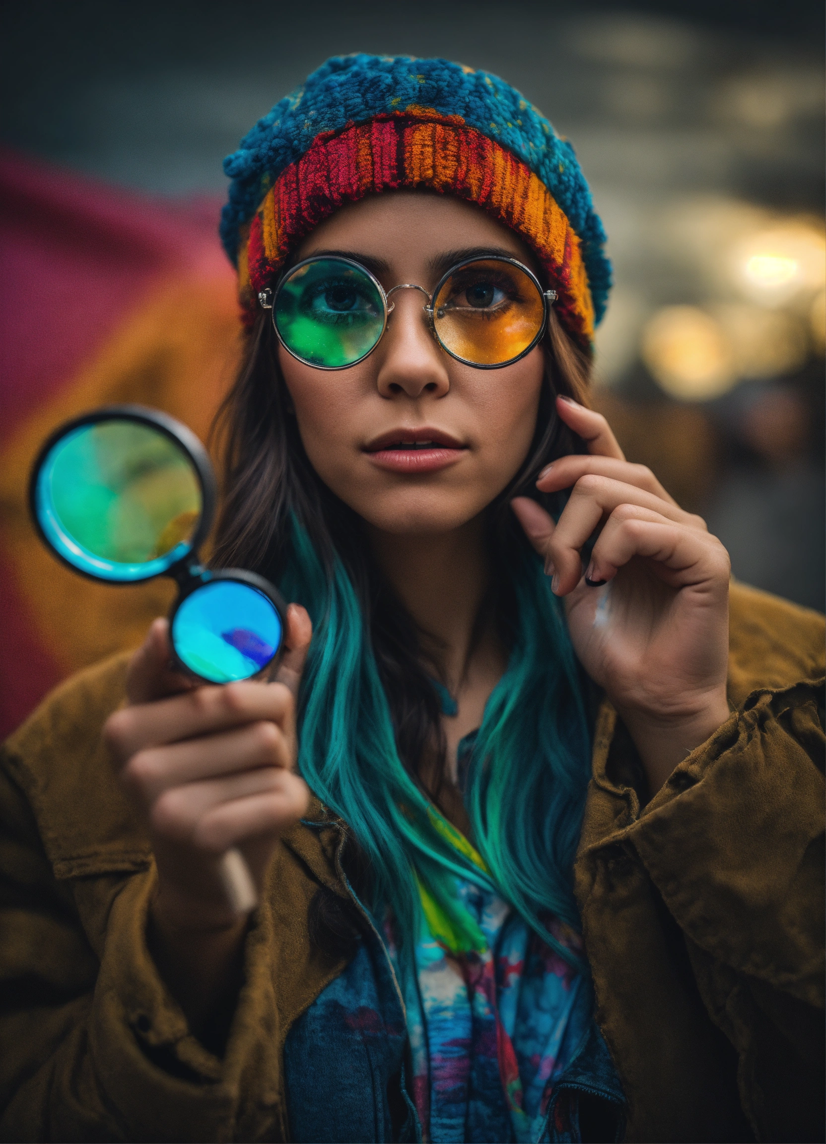 ""individual holding a magnifying glass to their eyes, vibrant and lively world revealed within the loupe's focus, contrasted against the surrounding dull, monochrome setting, canon eos r5, play of vibrant colors versus grayscale, photorealistic style."