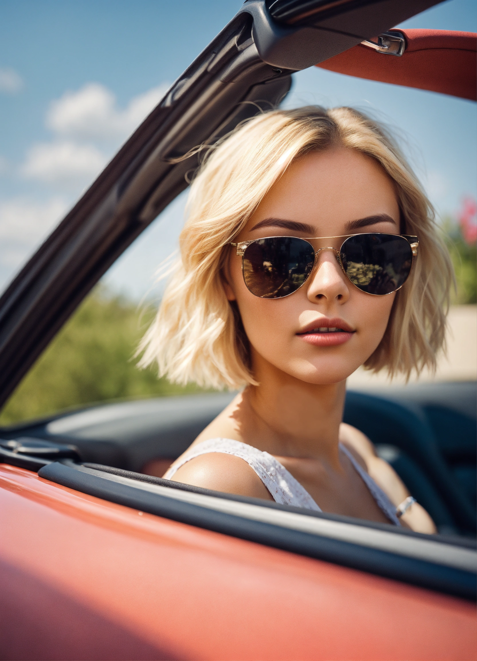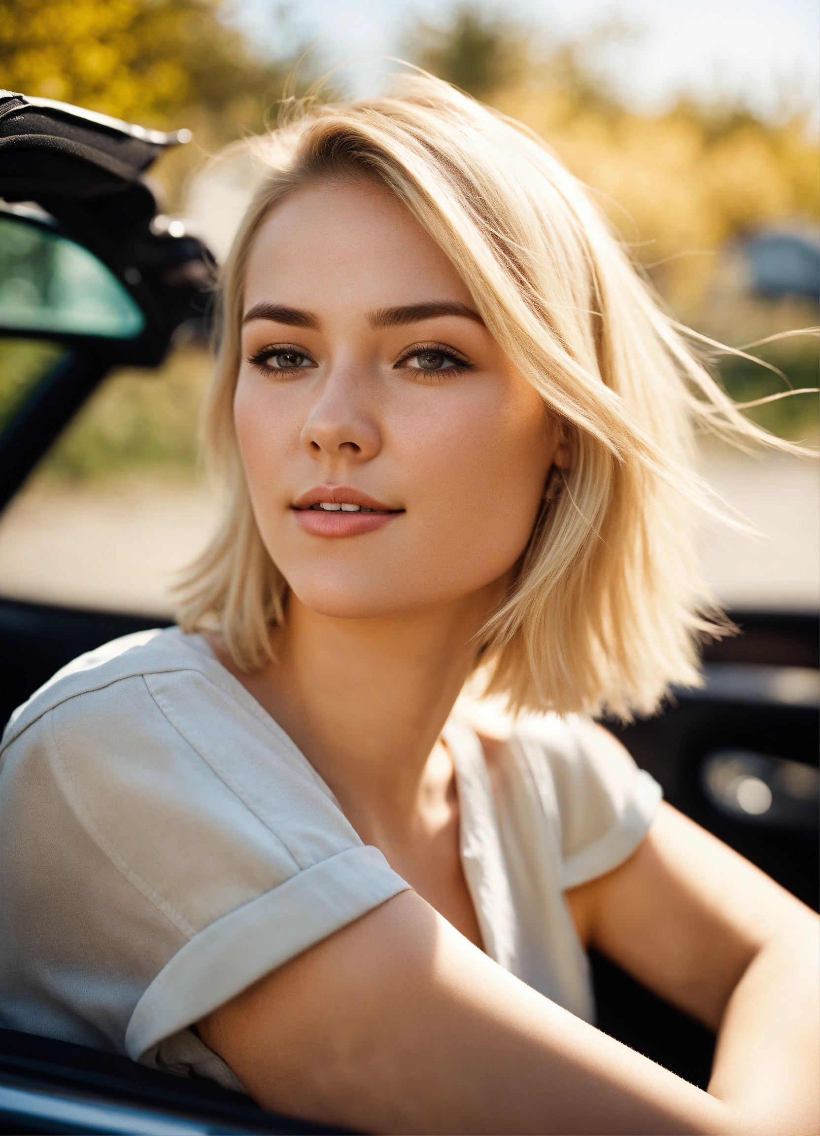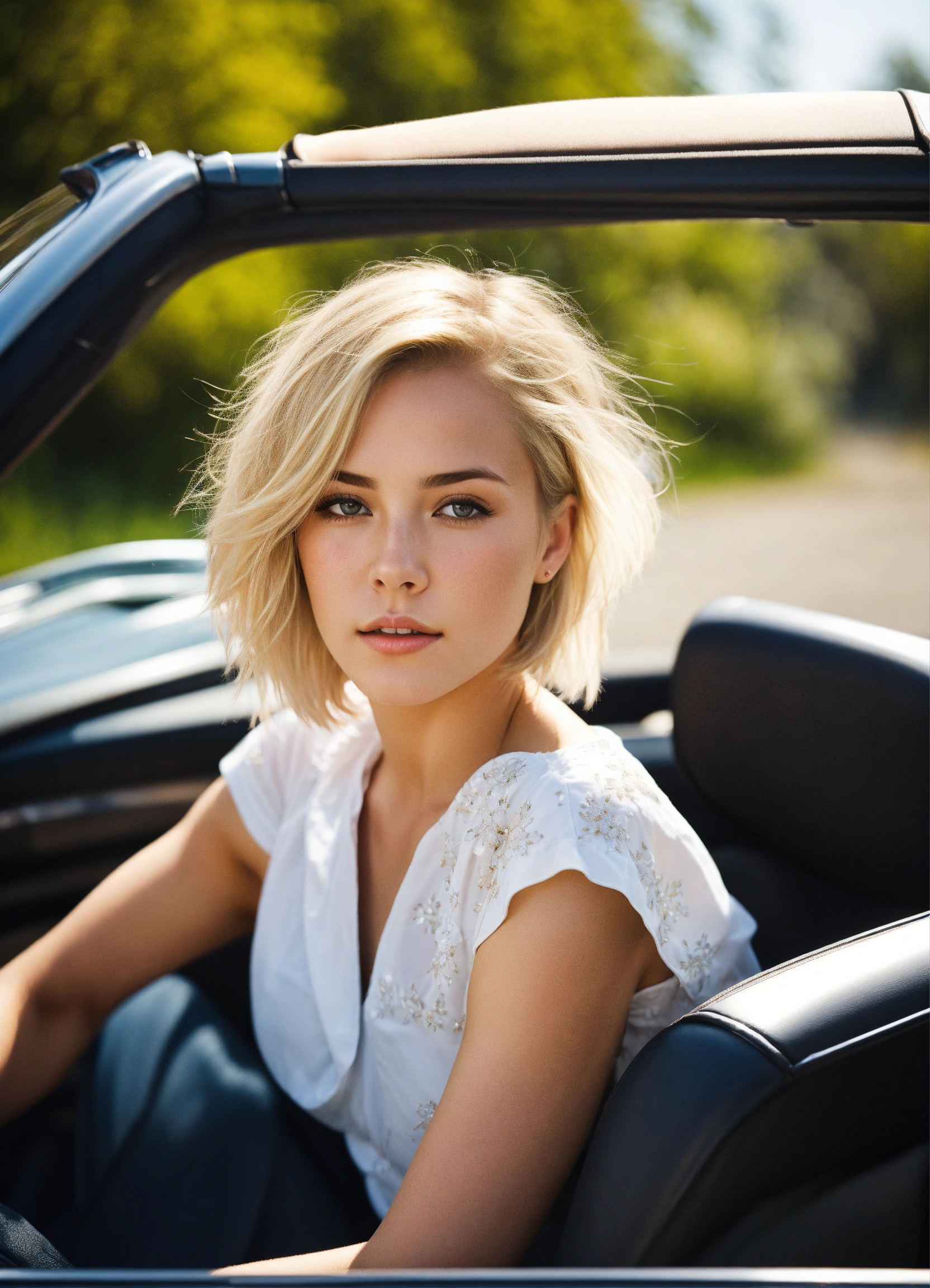 Beautiful girl with short blond shoulder-length hair in a convertible on a sunny day realistic photo